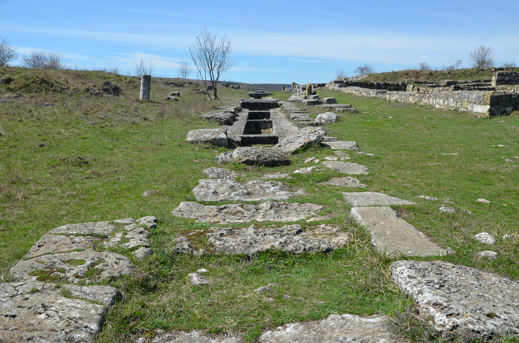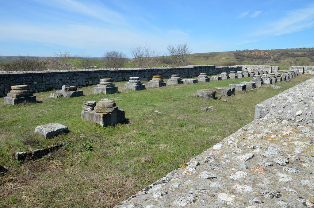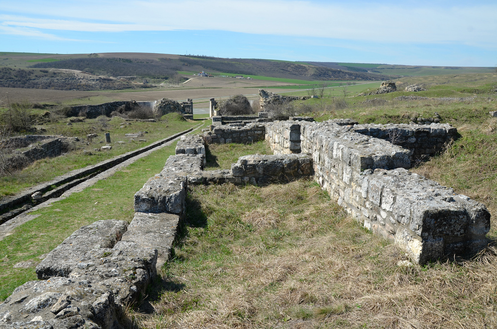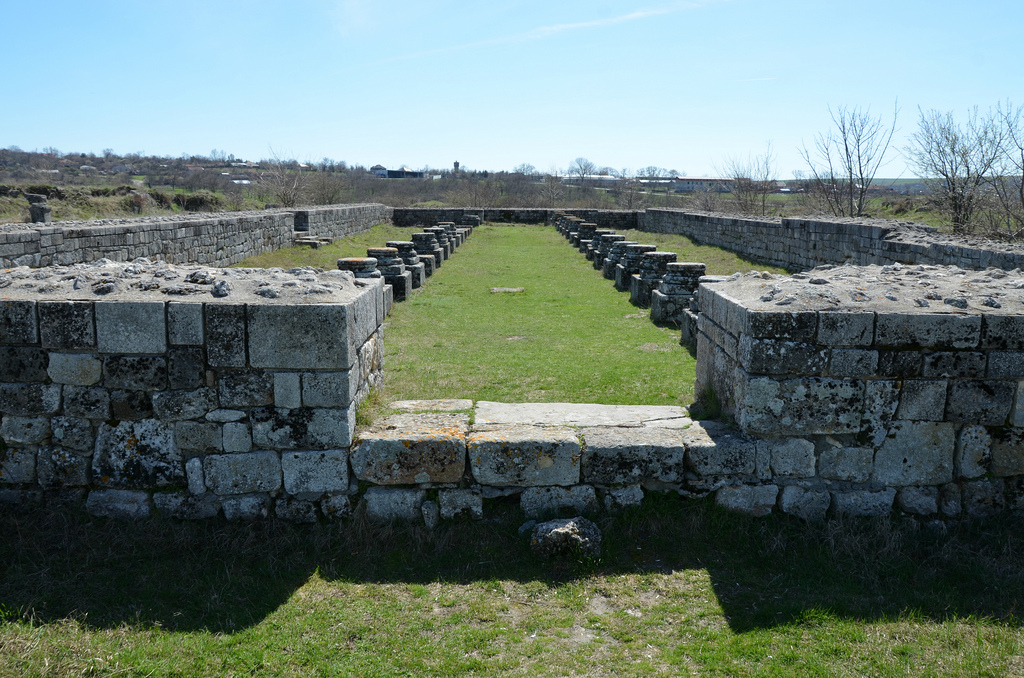 The visible ruins belong to the 4th-6th centuries. The defensive walls were provided with horseshoe-shaped defensive towers (a single one was rectangular). Three gates were unearthed: two on the east and west sides and a smaller one on the south side. The via principalis (ca. 300 m long), lined on both sides with porticoes, linked the east and west gates. A large basilica forensis dated to the 4th century stood in the centre of the fortress, south of the main street. On both sides of the same street, excavations have brought to light the ruins of four Christian basilicas, three of them with crypts, and one with an elegant baptistery. A cemetery basilica stood on the hill north of the fortress.