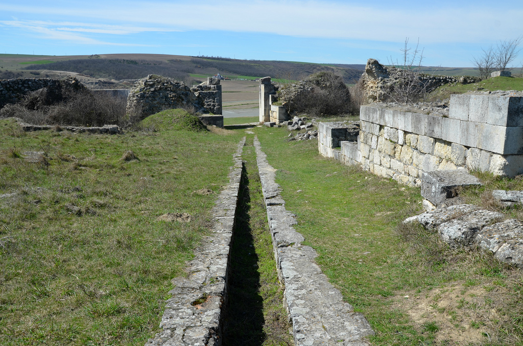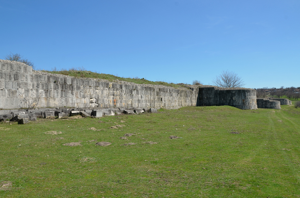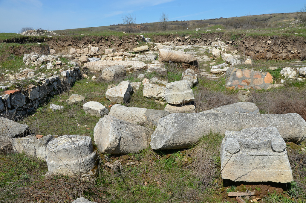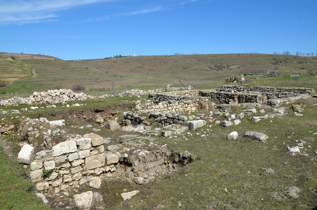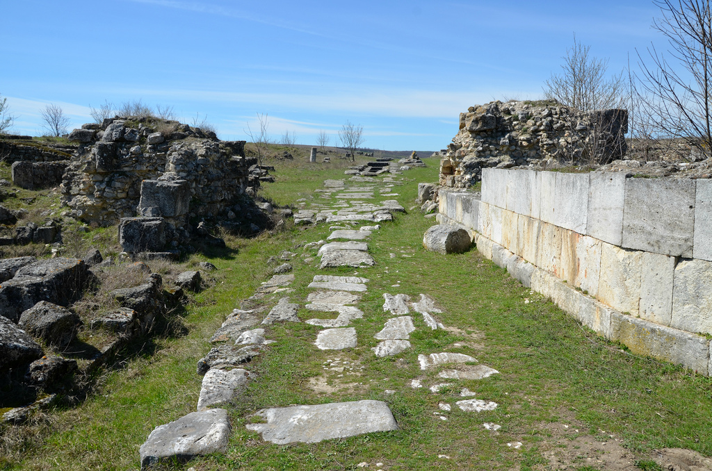 The visible ruins belong to the 4th-6th centuries. The defensive walls were provided with horseshoe-shaped defensive towers (a single one was rectangular). Three gates were unearthed: two on the east and west sides and a smaller one on the south side. The via principalis (ca. 300 m long), lined on both sides with porticoes, linked the east and west gates. A large basilica forensis dated to the 4th century stood in the centre of the fortress, south of the main street. On both sides of the same street, excavations have brought to light the ruins of four Christian basilicas, three of them with crypts, and one with an elegant baptistery. A cemetery basilica stood on the hill north of the fortress.