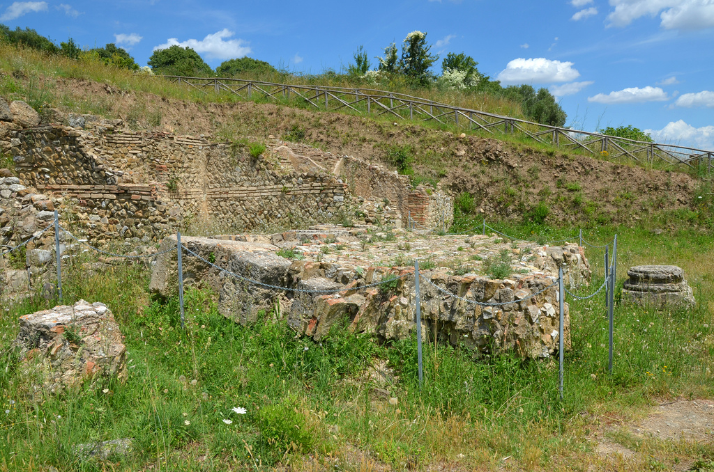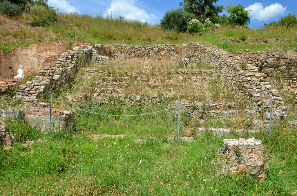 The elliptical amphitheatre is located on Russellae’s northern hill and was built in the 1st century AD. The arena stretches for almost 40 meters and is 25 meters wide; the cavea is 7 meters deep and it had eight rows of steps and a seating capacity of 1,200 people.