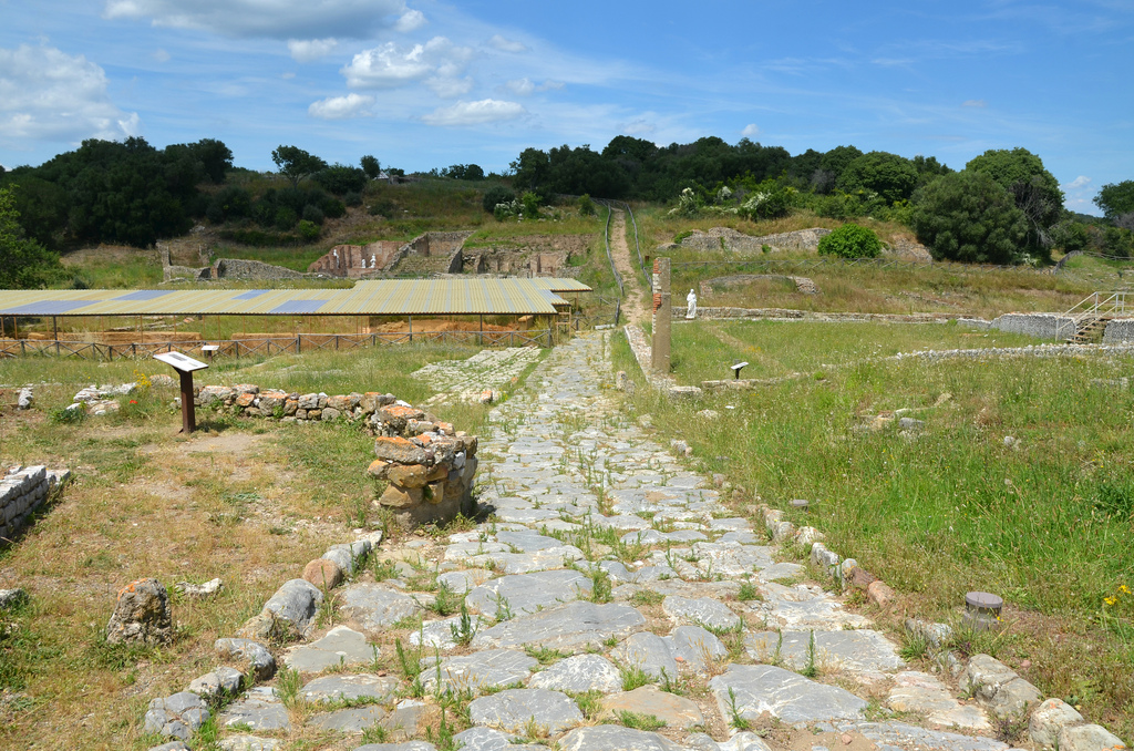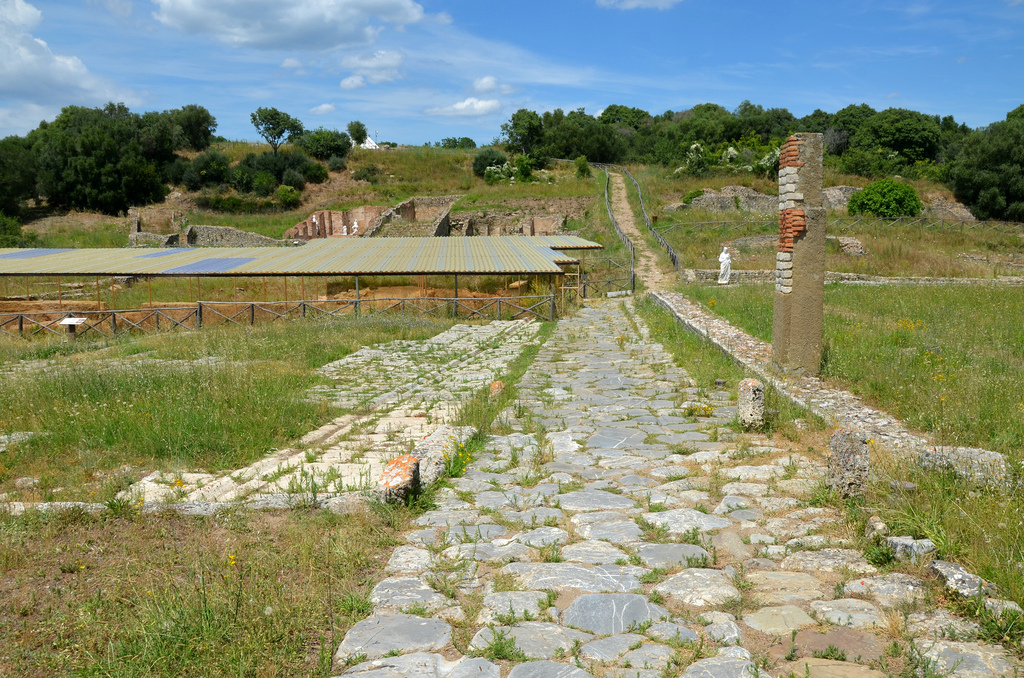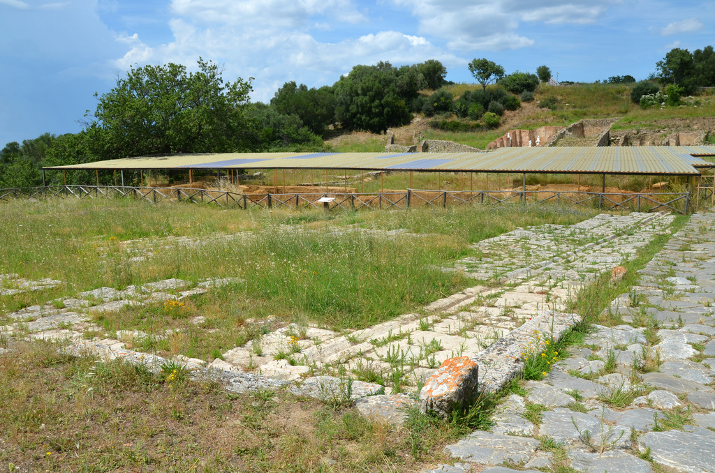 The cardo maximus (1st century BC). The eastern side of the Forum is delimited by a road paved with basalt flagstones: the cardo maximus, which is the other main road in the town, running north to south. On its surface the marks left by cart wheels are visible.