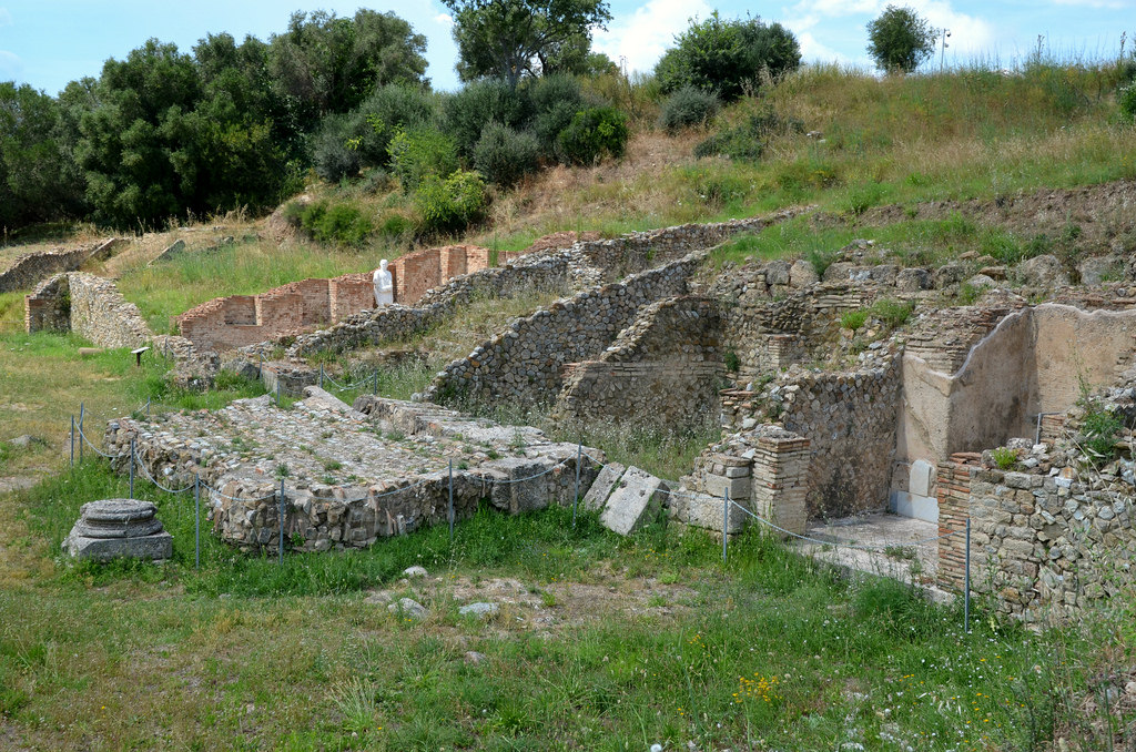 Overview of the Domus of the Mosaics. The first traces of the house date back to the late Republican period. After an extensive destruction in 90-80 BC, it was enlarged and restored, as well as enriched with three statues of Tiberius, Livia and Drusus Minor (now in the Archeological Museum of Grosseto).