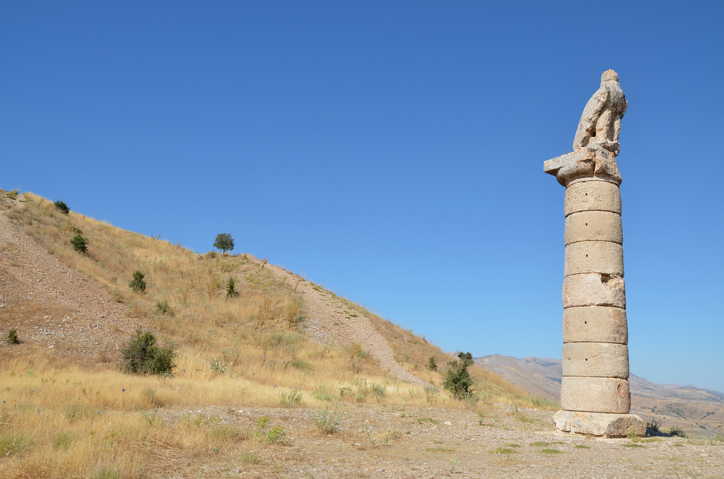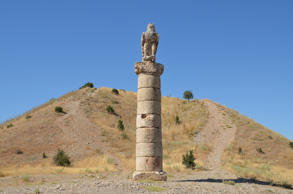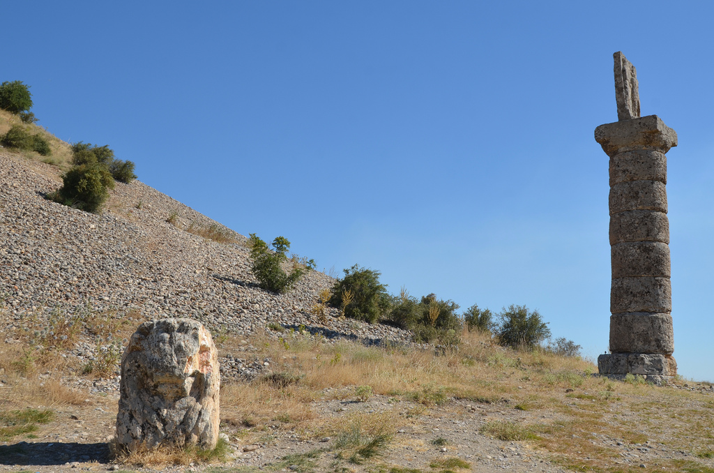 Only one column survived from the group on the south side of the tumulus. It consists of 7 drums and is topped with a 2.54 m high statue of an eagle which gave its name to the place (in Turkish, “karakuş” means “blackbird”). Two of the three columns stand upright from the group on the northeast side. On top, one bears traces of a relief, and the other has a bull whose head is missing. The central column is slightly higher than the left-hand one. It bears an inscription in Greek saying that King Mithridates II erected this hierothesion for his mother Isias, his sister Antiochis and her daughter Aka. Skipping a couple of phrases where restoration has been doubtful, the inscription reads: