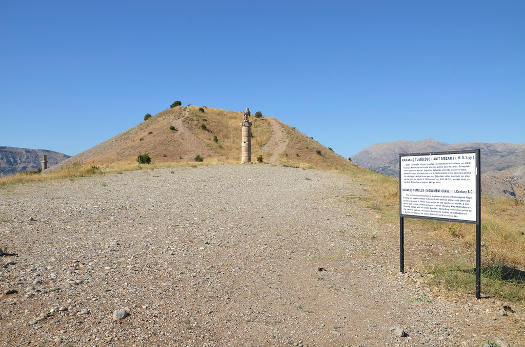 From the last group on the northwest of the tumulus, only one column is still standing with a dexiosis relief of King Mithradates II and his sister Laodice shaking hands in a farewell gesture. Laodice is wearing a Greek chiton, and her head is veiled with part of her mantle. Mithradates is dressed in oriental style, with trousers, a long mantle, and a tiara. Next to the column, the head of a lion lies on the floor. The grave chamber, located inside the tumulus, was later plundered. The stone blocks were believed to be reused in the construction of the first Cendere Bridge.