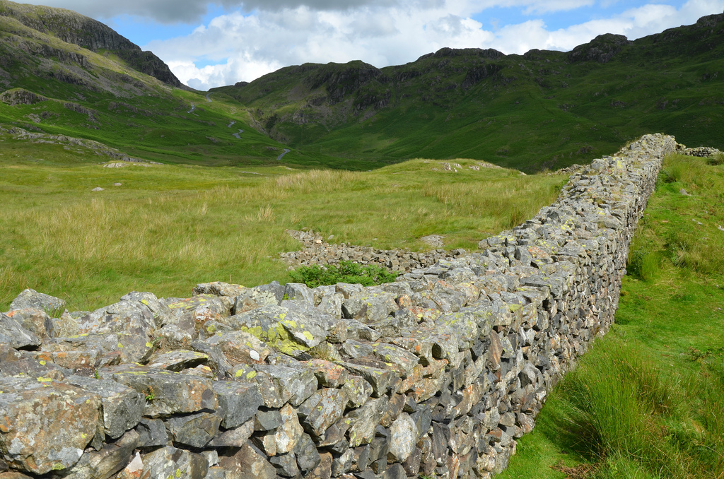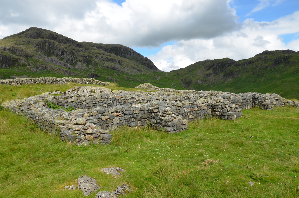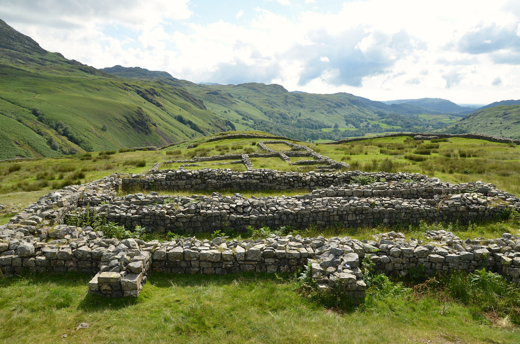 Hardknott Roman Fort is situated on the western side of the Hardknott Pass in the middle of the Lake District National Park in Cumbria. The fort was built during the reign of Hadrian high upon a rocky spur overlooking the River Esk at an altitude of 245 m above sea level. It guarded the Roman road between Ambleside and Ravenglass from invasion by the Picts and the Brigantes. The remains include the fort’s defences and gateways, the headquarters building (principia), the commandant’s house (praetorium), two granaries (horrea), and a bathhouse outside the fort’s southern defences. The fort is owned by the National Trust, part of the Trust’s Wasdale, Eskdale and Duddon property, and maintained by English Heritage.