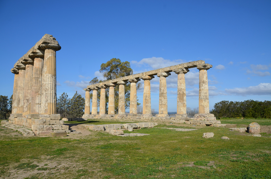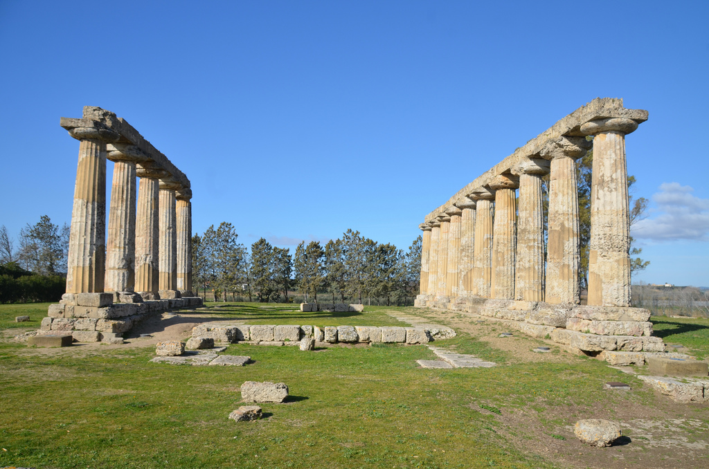 The finest surviving temple, however, lies outside the city limits. Known today as the Palatine Tables (Tavole Palatine), this is an elegant Doric temple erected in the late 6th century BC and dedicated to Hera (as indicated by the votive deposits). Fithteen columns of the colonnade (6 x 12 columns) are still standing.