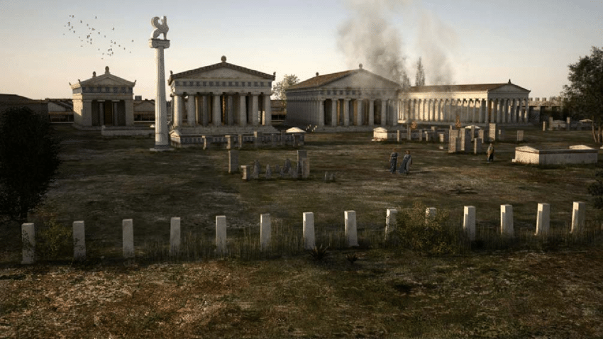 In is prime, Metapontum had at least 20,000 inhabitants as well as 10,000 neighbouring farmers. It covered an area of about 150 hectares and was protected by an encircling fortification wall. The city had a rectangular plan and consisted of the sanctuary and the Agora, situated beside each other at the southern extremity of the urban space. The sacred area had some of the city’s most important buildings, including five Archaic temples dedicated to Hera, Artemis, Apollo and Athena, and an ekklesiasterion (assembly place) located in the north-east of the agora. The ekklesiasterion was later transformed into a theatre with a cavea, a semi-circular orchestra, and a free-standing stage building that could seat ca. 7500-8000 people.