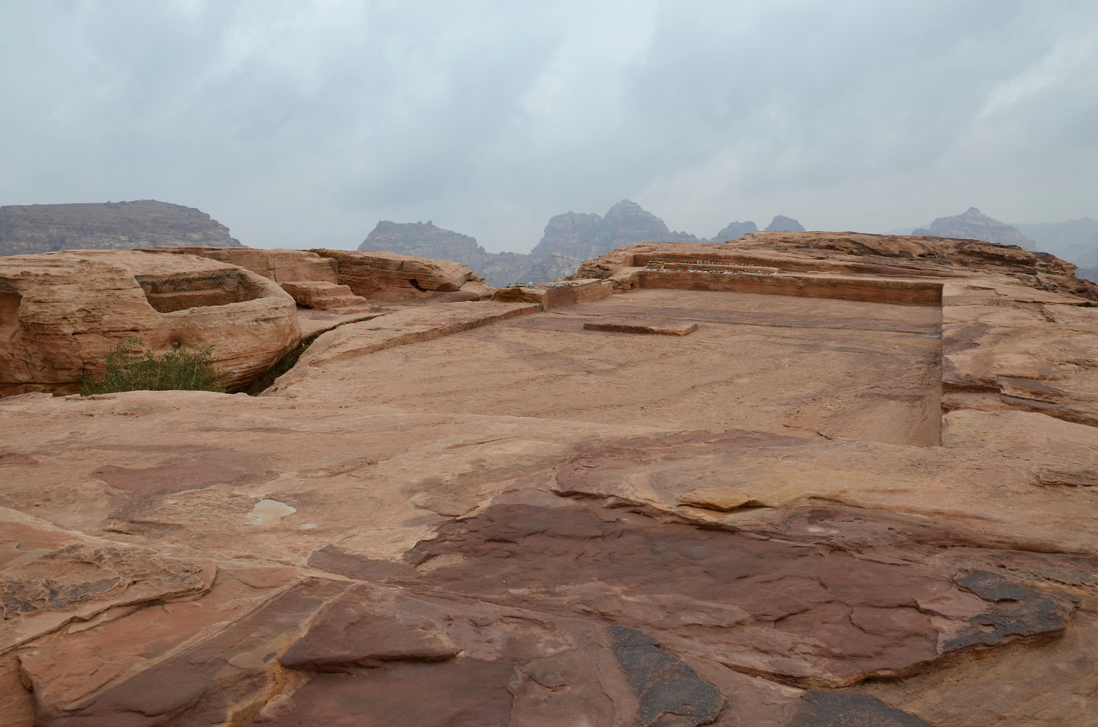 The ceremonial platform on the High Place of Sacrifice. The High Place is located at the very top of a mountain. The ceremonial platform has remains of a triclinium (benches for festive meals), a circular altar where animals were sacrificed as well as a stone block as the repository of the god statue.