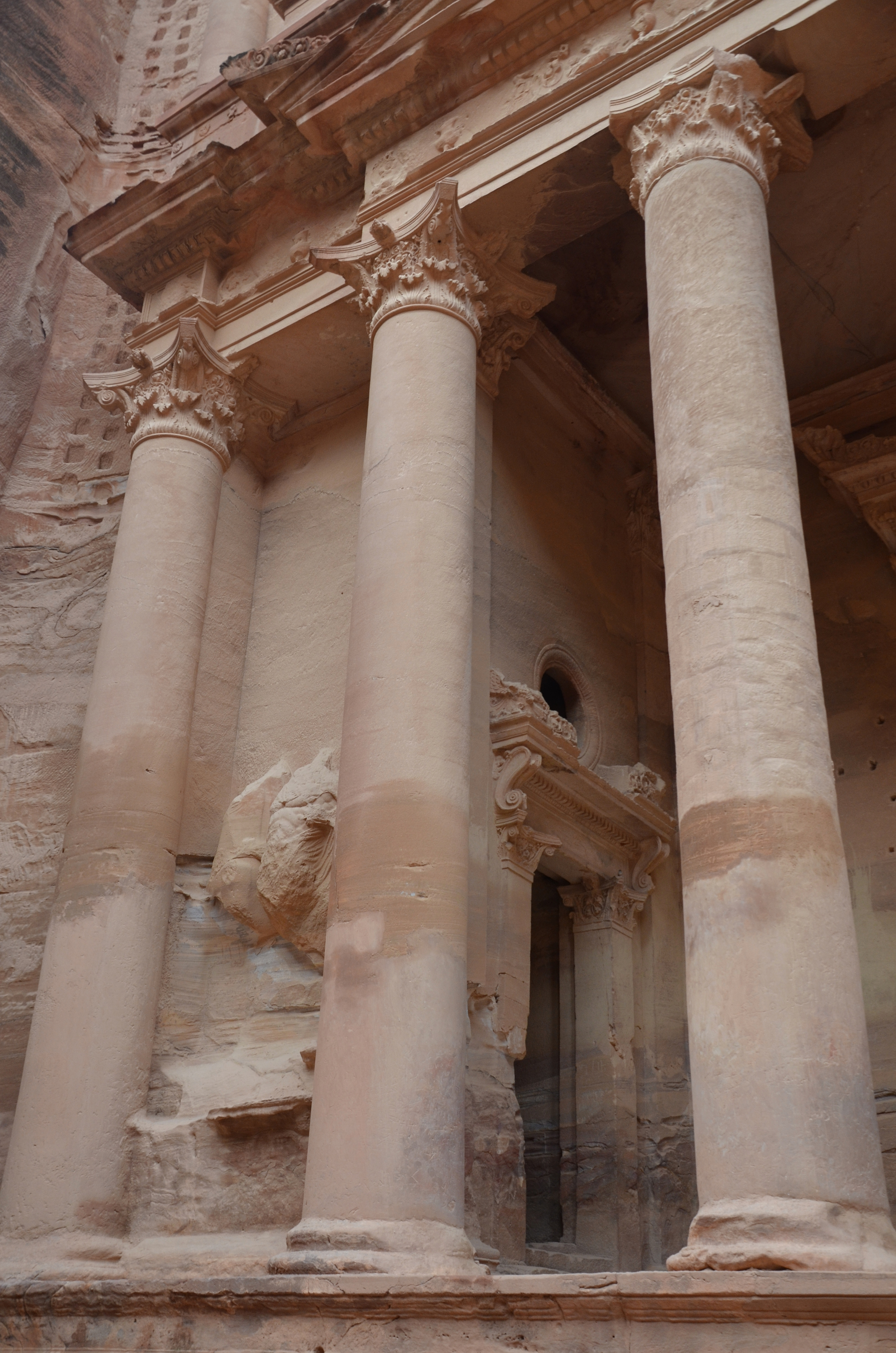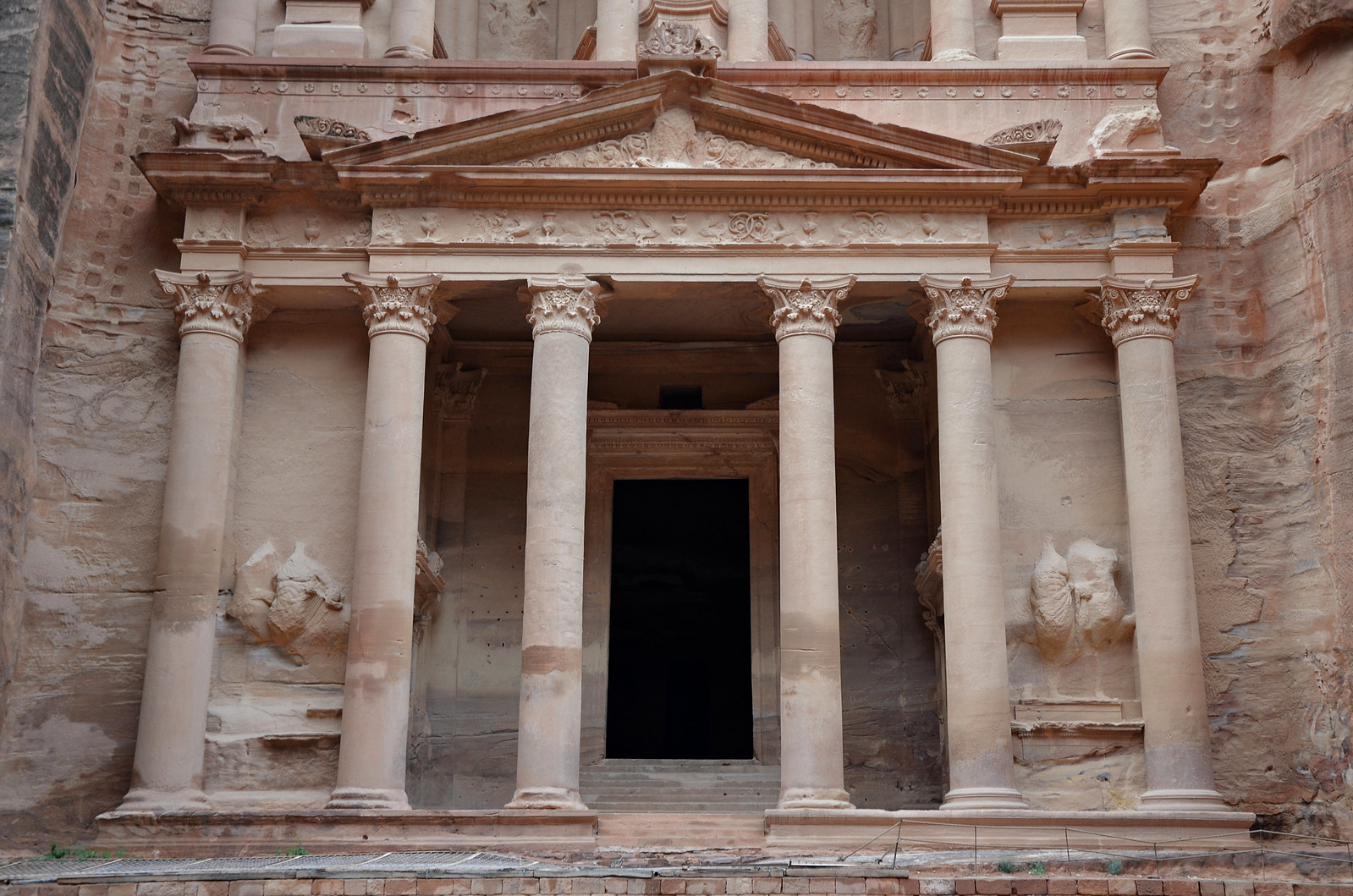 The lower level of the Treasury (Al-Khazneh). Four steps lead up to the vestibule, and another seven steps lead to the elevated entrance of the main portal. Of the six columns of the 25 m wide facade, only the middle two are free-standing. The other four remain connected to the background.