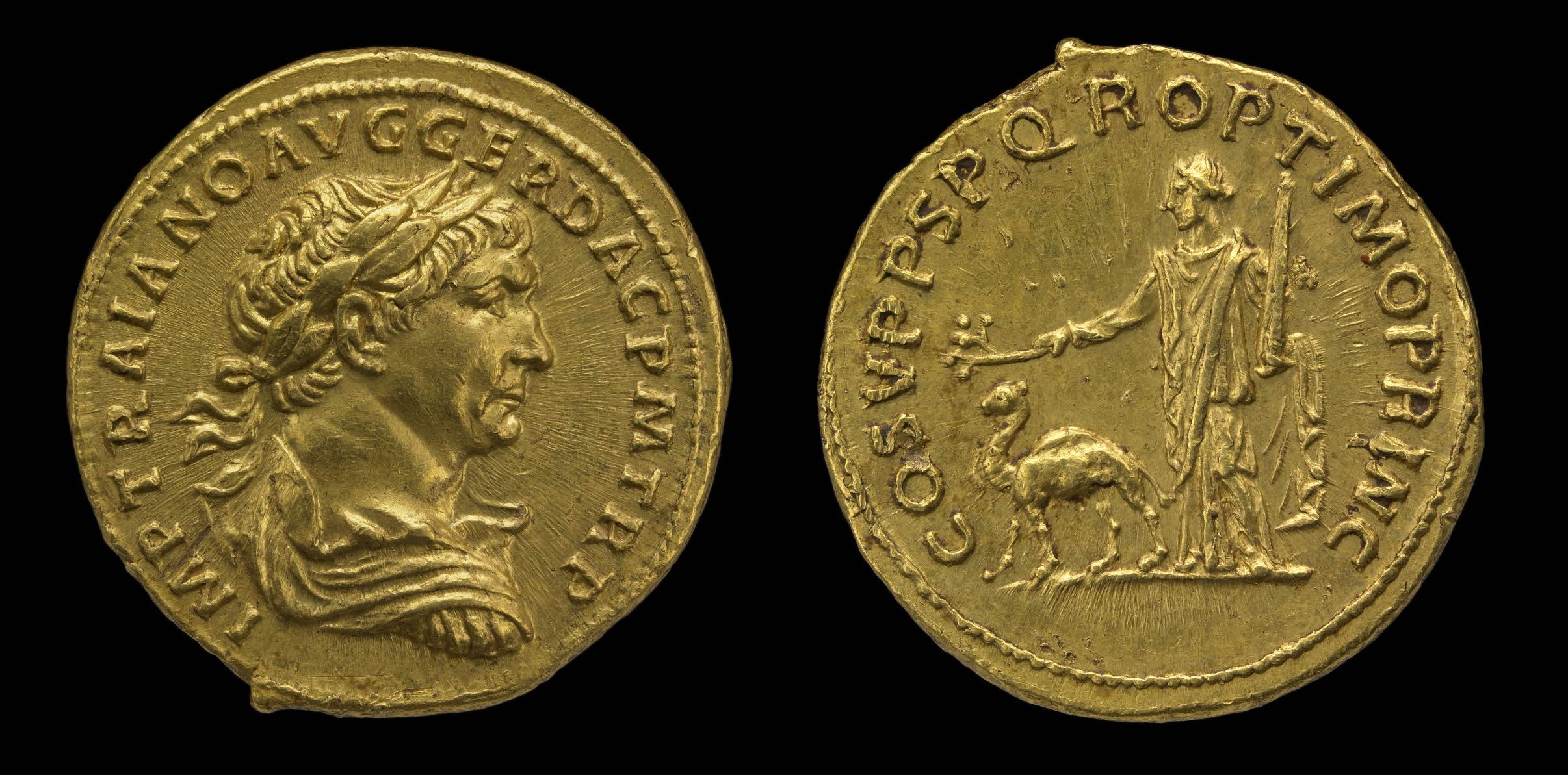Aureus of Trajan and the personification of Arabia. She holds an incense branch and a bundle of spices, and a camel, the symbol of the province, stands behind her to the left.