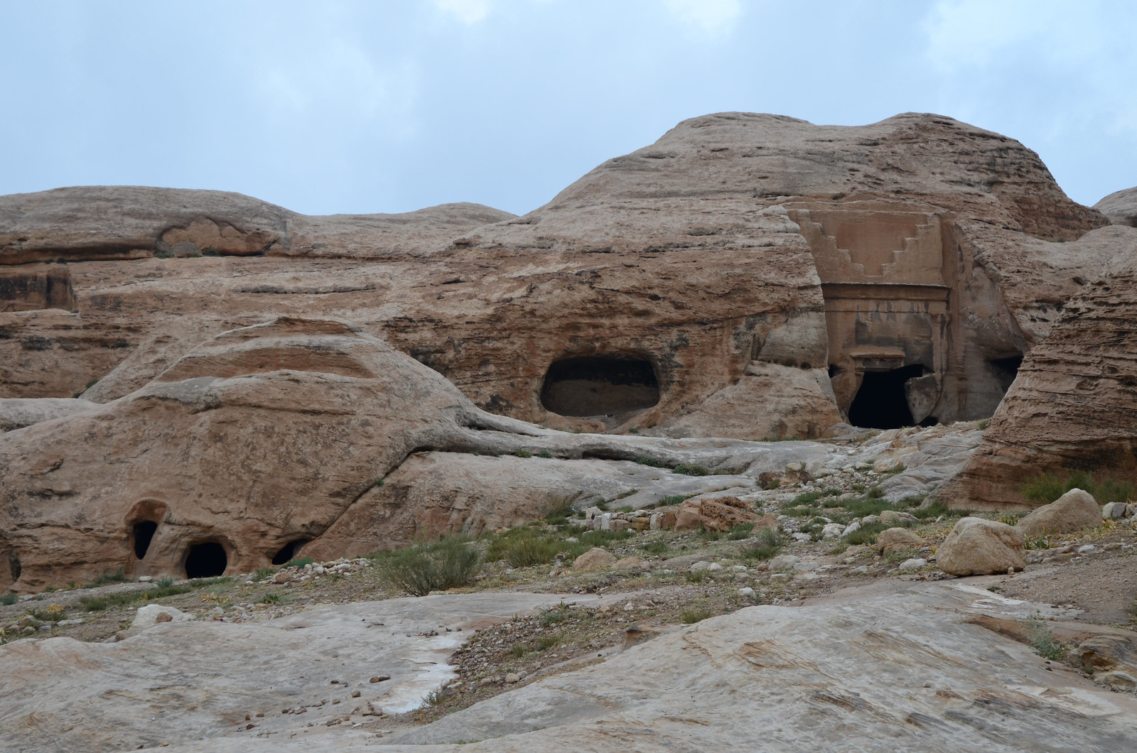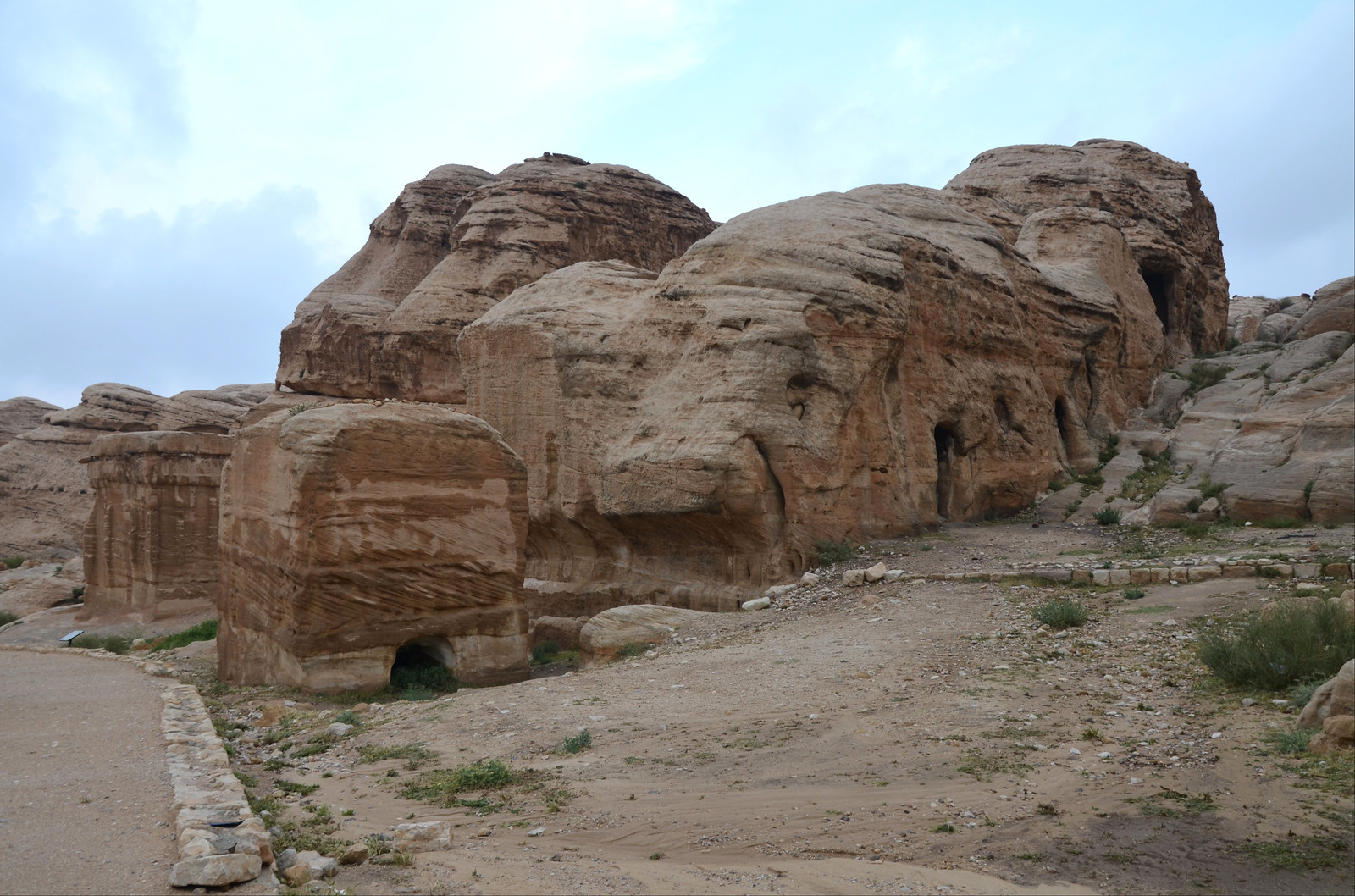 Rock façade tombs along the hiking trail to the Monastery with the Lion Triclinium on the right.
