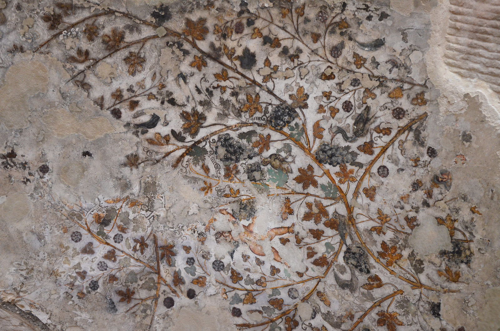 Ceiling painting inside the Biclinium depicting a web of intertwined grape and ivy vines and a Cupid.