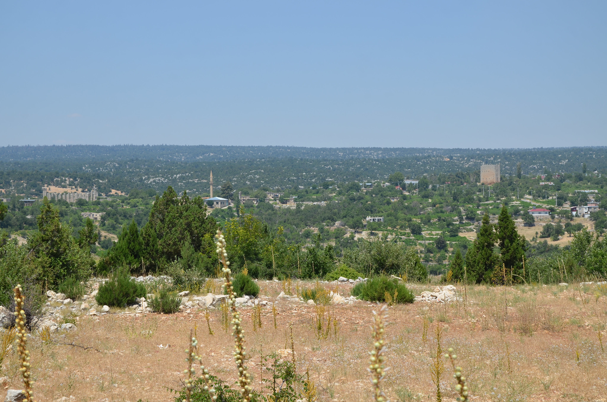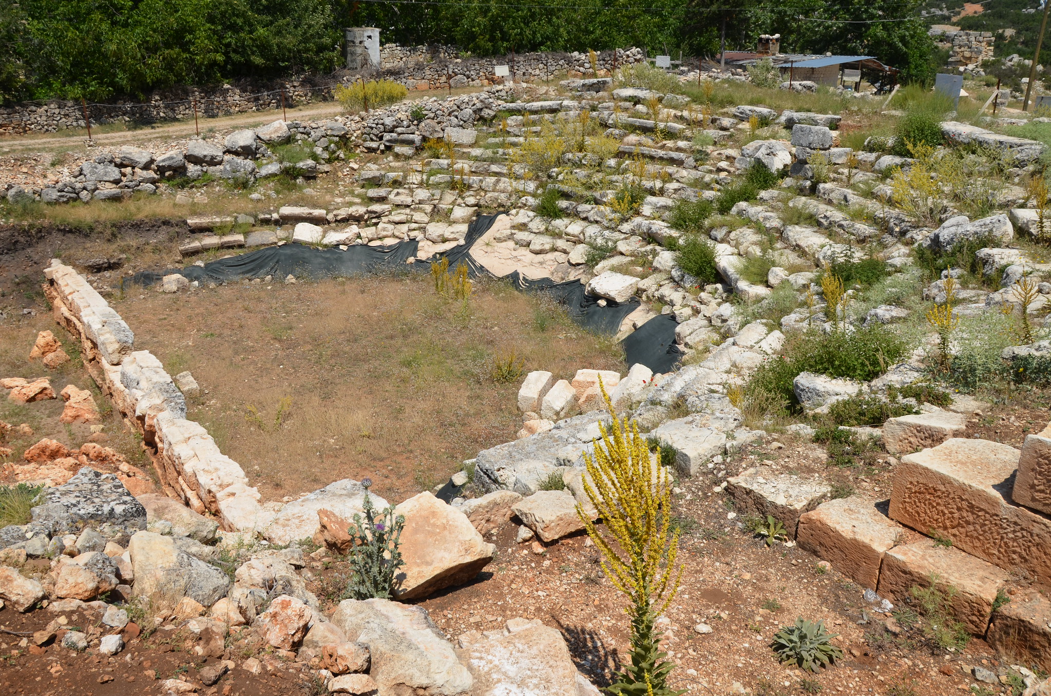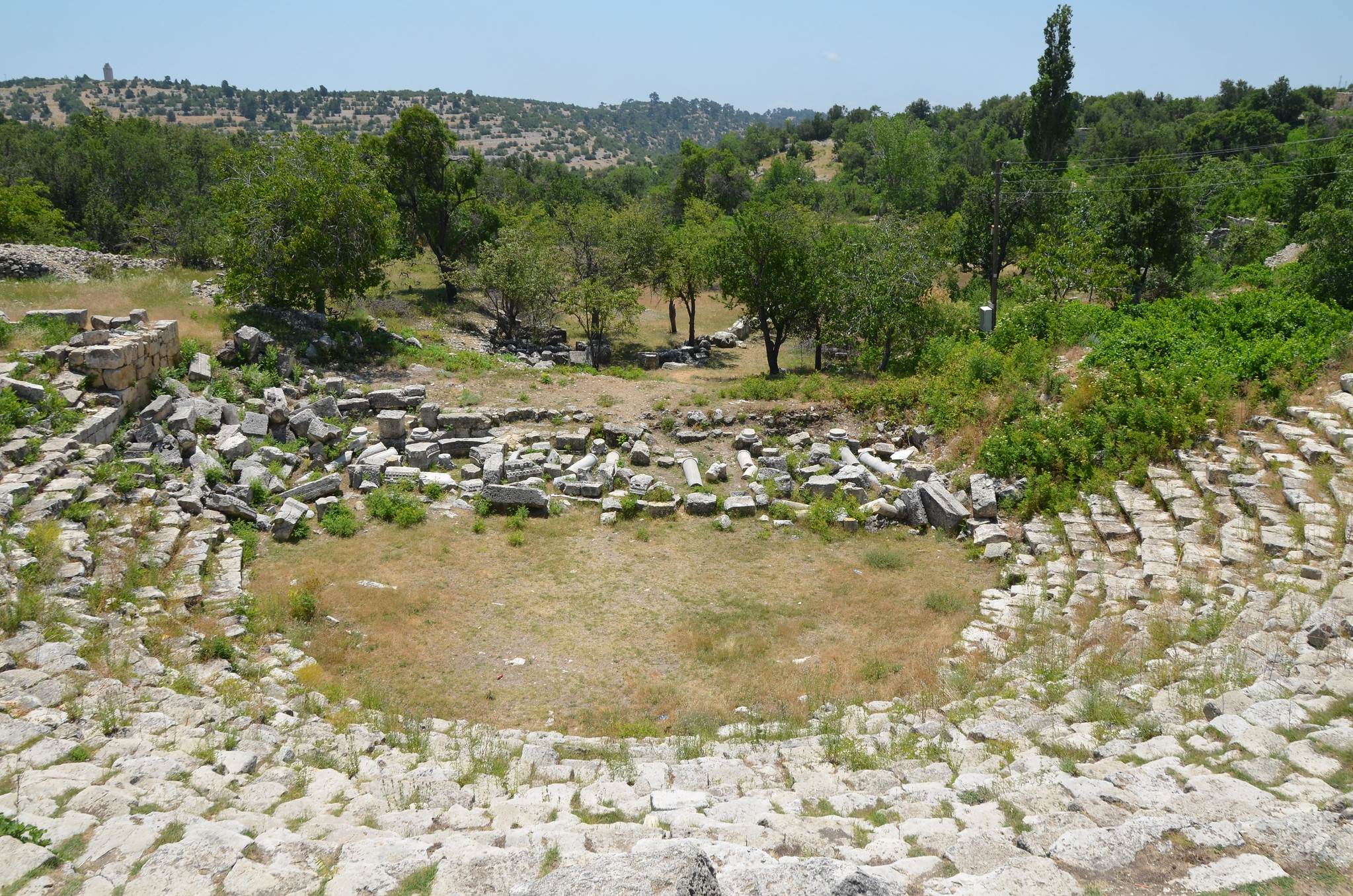 View of Diocaesarea from the Hellenistic mausoleum. The temple of Zeus Olbios is on the left, in the middle is the Roman theatre and on the right stands the 22m-high Hellenistic tower.