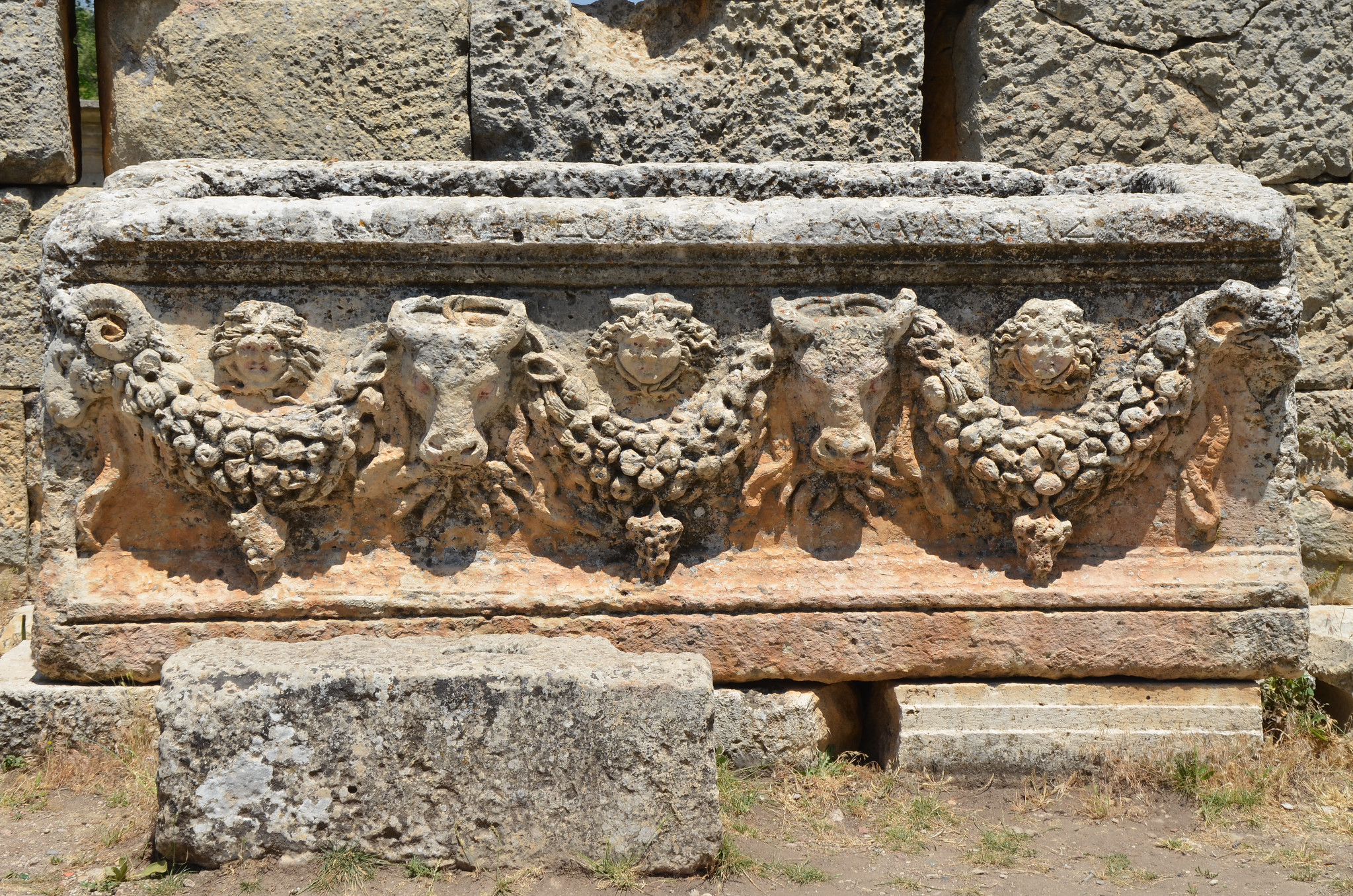 A limestone sarcophagus beautifully decorated with vine tendrils and flowers suspended from two ox heads in the middle and two-horned ram heads on each side; over the garlands are three sculpted heads of Medusa.