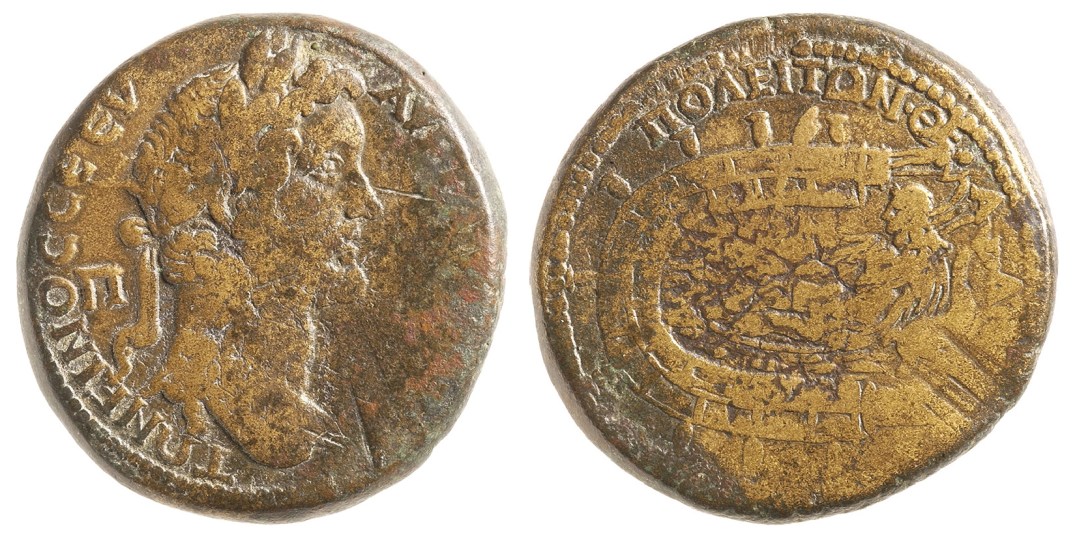 In AD 129/30, the province of Cilicia was visited by Hadrian, who donated funds for the expansion of the port in Pompeiopolis, but the work was completed only in the reign of Antoninus Pius, his adopted son. The completion of the harbour renovations was celebrated on the coinage. The coin’s reverse depicts a two-storey harbour and a divine figure lying down within it, probably representing a local river god. A lighthouse is visible at the end of the western breakwater. On the roof of the harbour, jar-like objects are perched at regular intervals, and a torch is seen between the first two. These torches are thought to have been used to illuminate the harbour. In AD 525, Pompeiopolis was completely destroyed by a powerful earthquake and never regained its former importance.