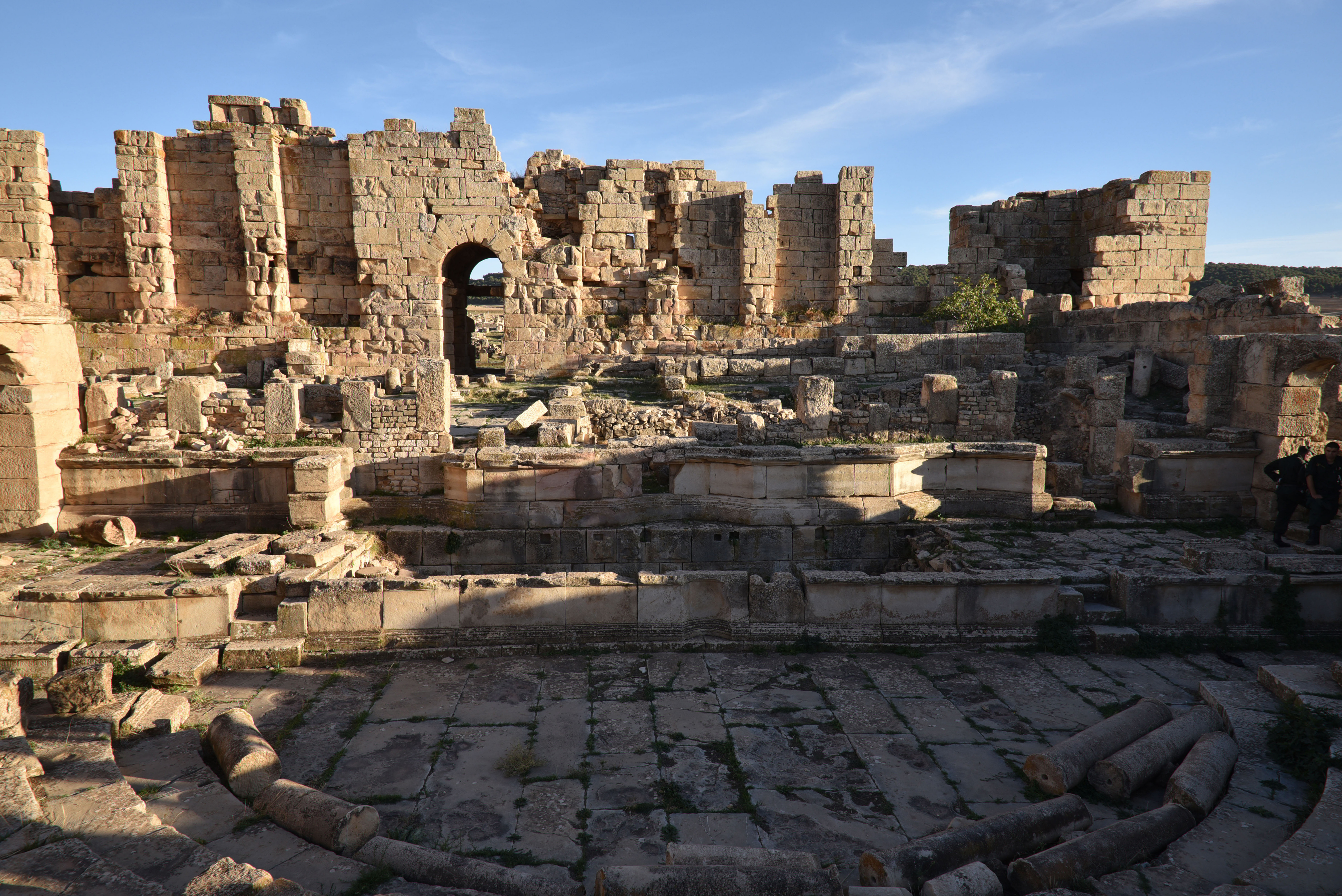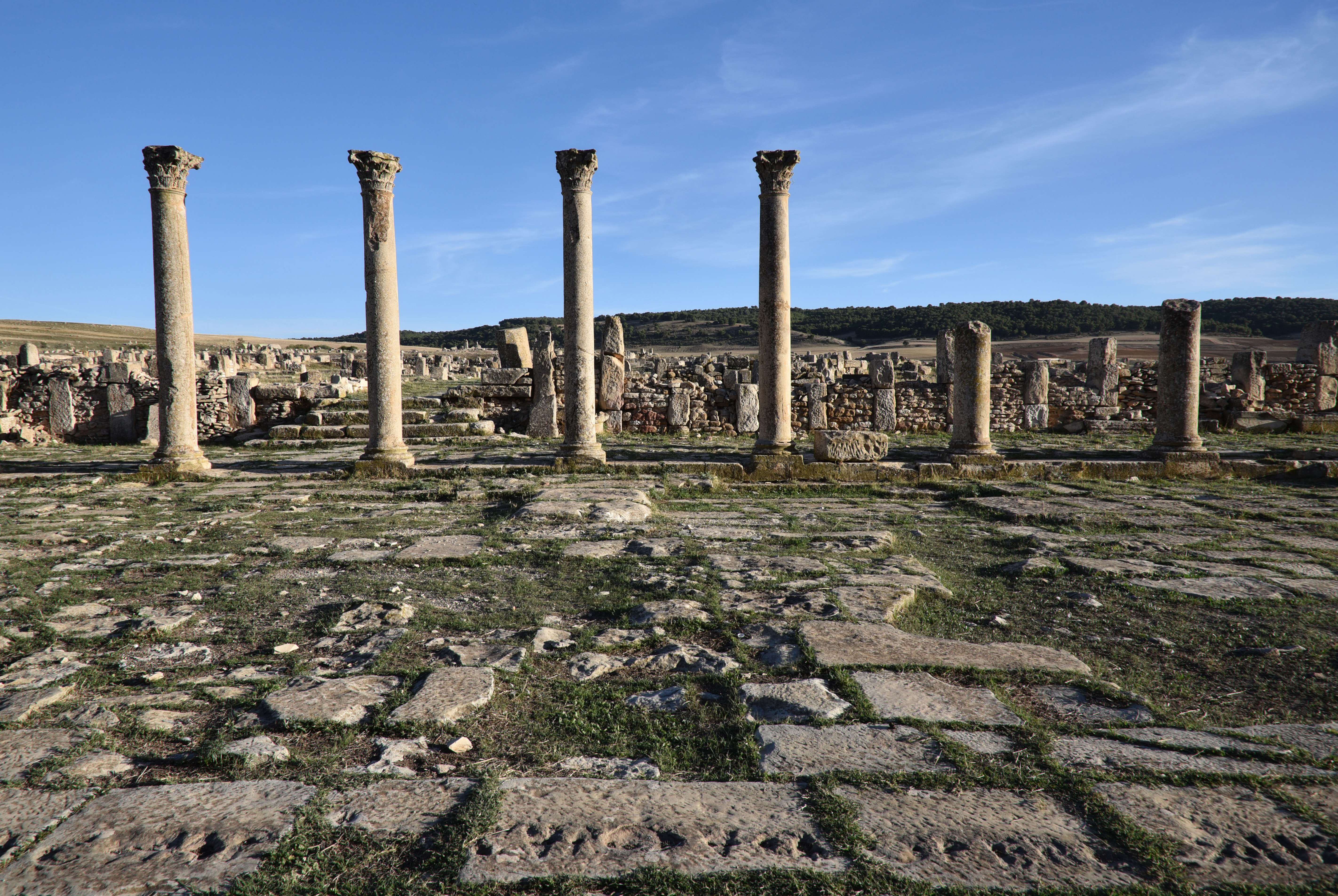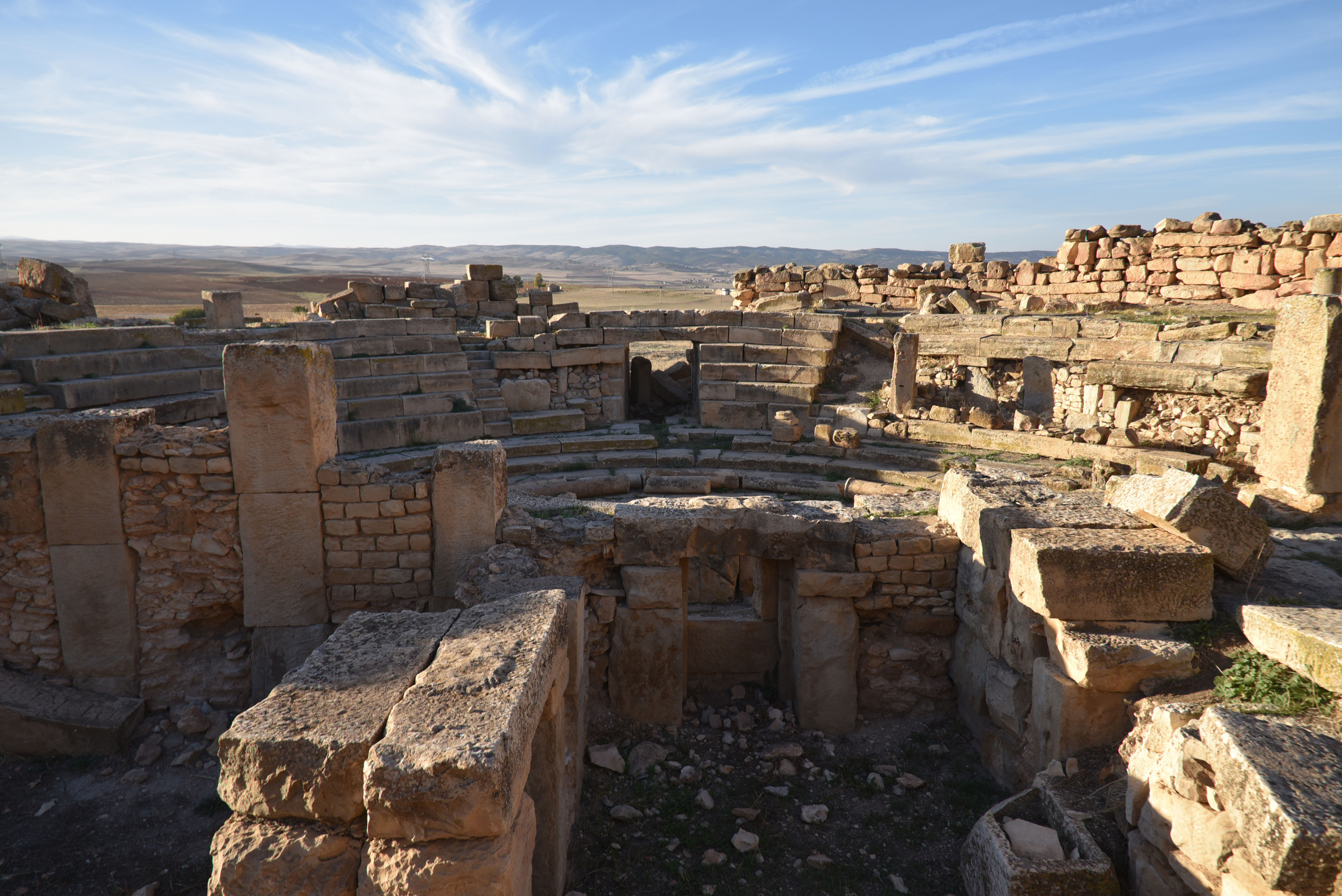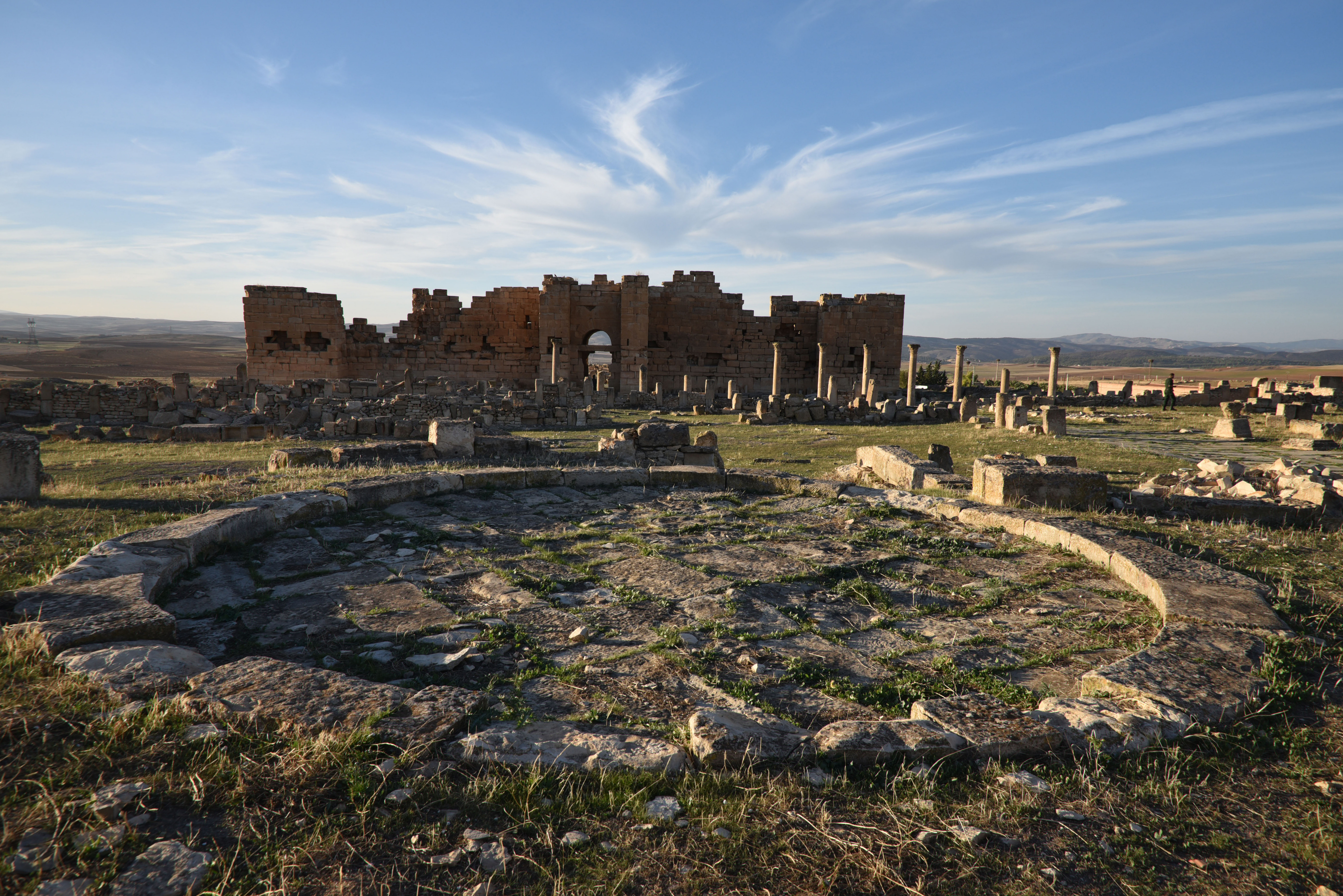 A paved street running north-south through the city.Architectural fragments lining the paved street leading from the baths.Architectural fragments lining the paved street leading from the baths.The Winter Baths of the 3rd century AD located at the north edge of the site.The larger Summer Baths (39 x 41 m) are set only 20 metres from the Winter Baths. They possess the usual sequence of cold and heated rooms, as well as a large, semi-circular latrine.A church dating to the second half of the 5th century AD, adapted from an earlier building.An oilery among the houses, featuring pressing stones and receiving tanks.Receiving tank for oil in one of the oileries.The southern section of the street leading from the baths.Overview of the ruins of Madauros in the southern part of the site.The paved Forum, built on a terrace and surrounded by porticoes. The forum is rectangular, almost square (32.4 x 27 and 28.5 m).A refurbishment of the Forum’s paved surface was marked by an inscription that ran across its width in bronze letters. These letters have since been removed, leaving corresponding hollows in the paving slabs. The work, which cost 200,000 sesterces, was funded by a certain M. Aurelius (not the emperor).The bases of statues found in the Forum remind us of those mentioned by Saint Augustine. One appears to have supported a statue of the writer Apuleius: “To the Platonic philosopher, their ornament, the citizens of Madauros set this up by decree of the decurions at public expense.”The walls of the Byzantine Fortress, constructed over the Forum in AD 535 as a rectangular building with square corner-towers and a central gate-tower.The small theatre was built during the Severan period, thanks to the generosity of the flamen M. Gabinius Sabinus, at a cost of 375,000 sesterces.The theatre was built in the immediate vicinity of the forum, against its west portico, and had a seating capacity of 1,000.View towards the Forum and the Byzantine Fortress.The Macellum (market), with the Forum and the Byzantine fortress in the background. This market had a circular, paved central space, surrounded by a portico sheltering radial market stalls.
