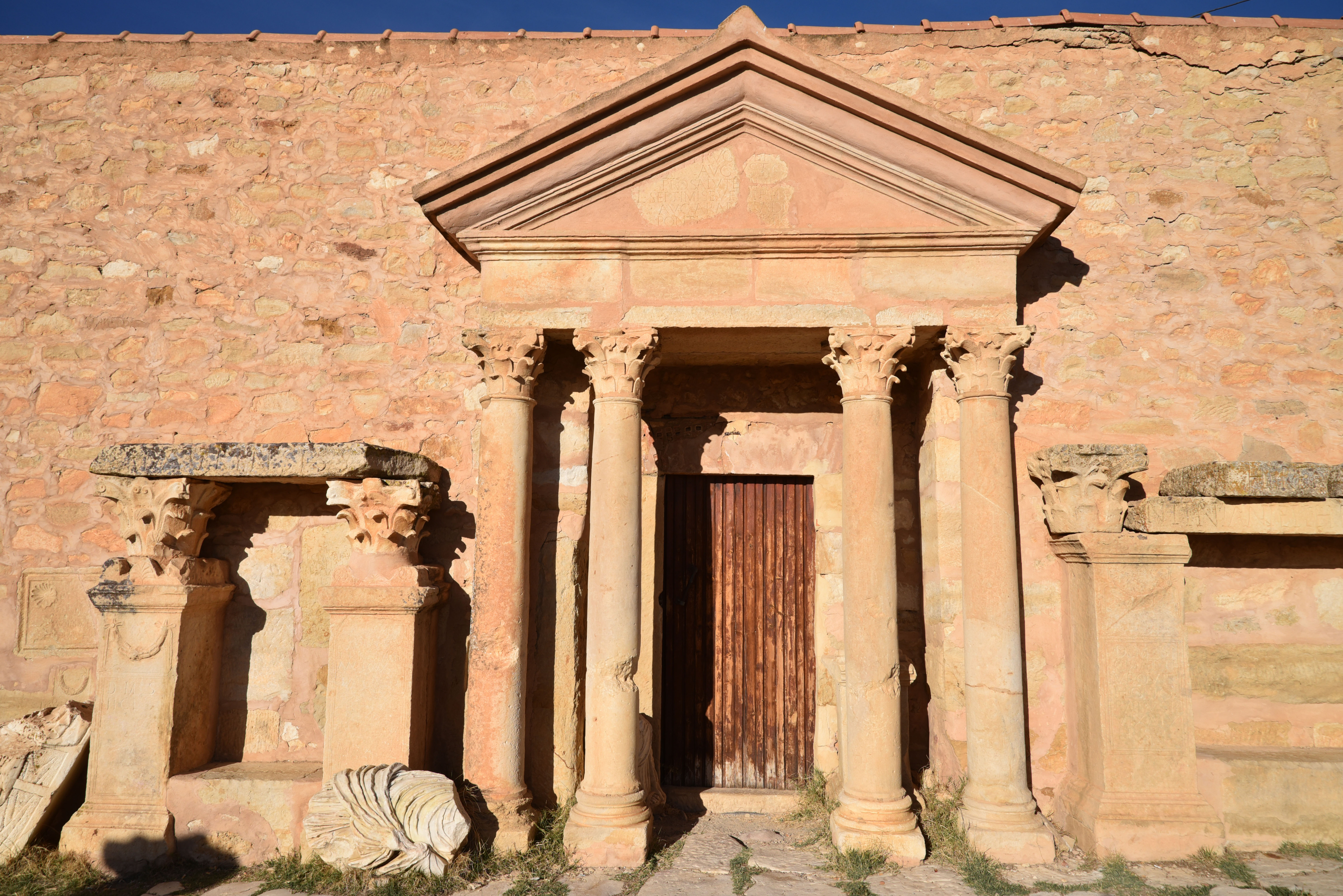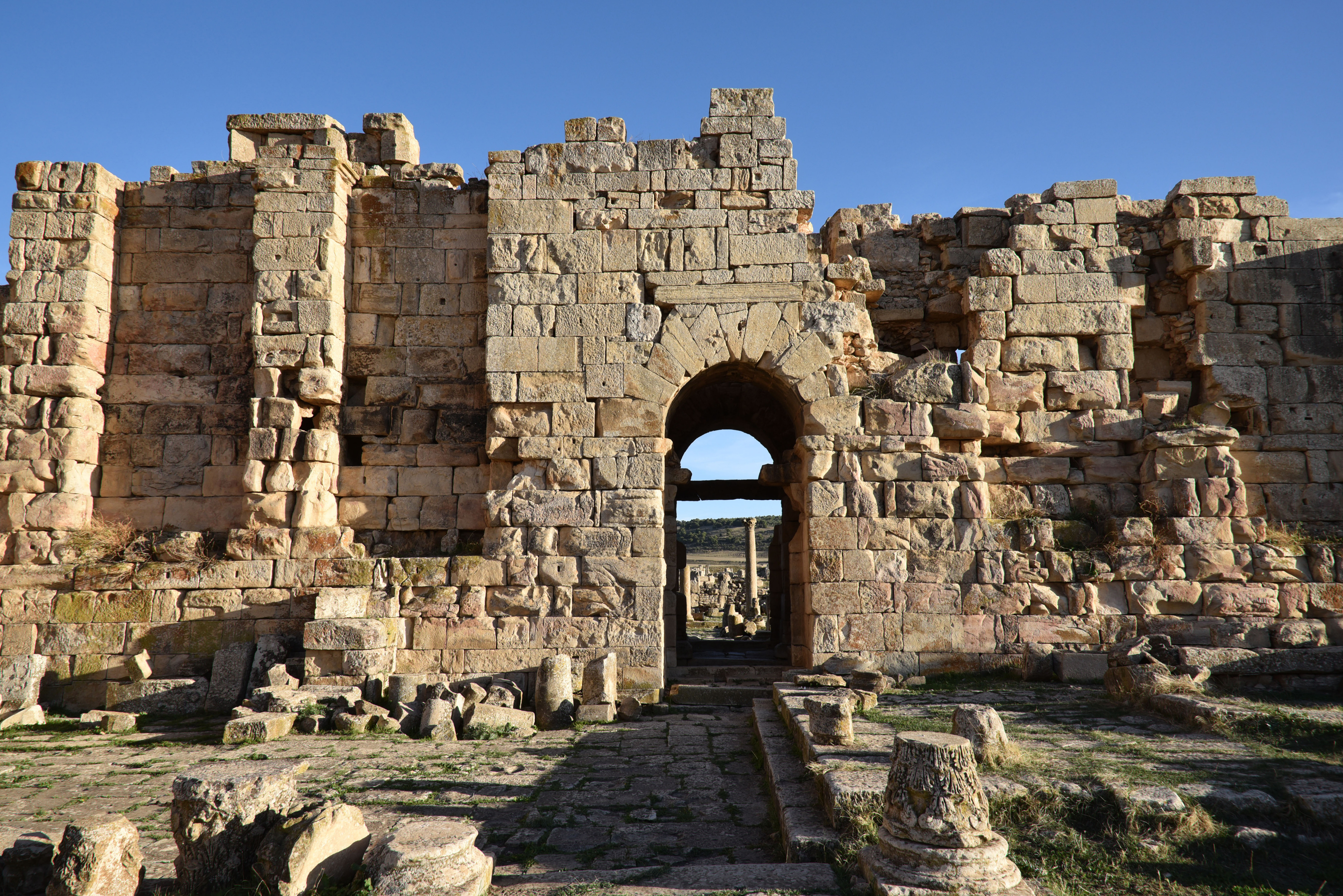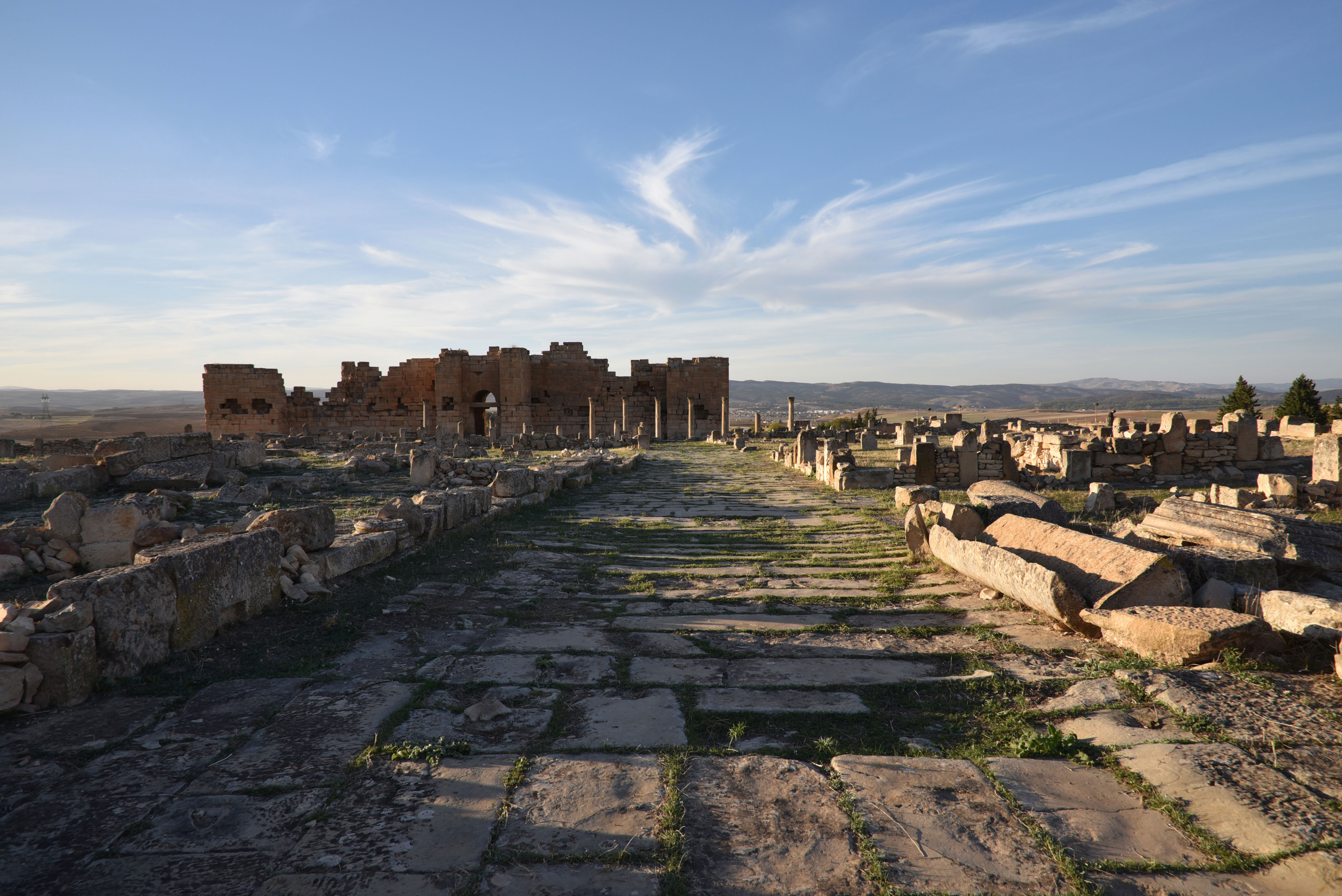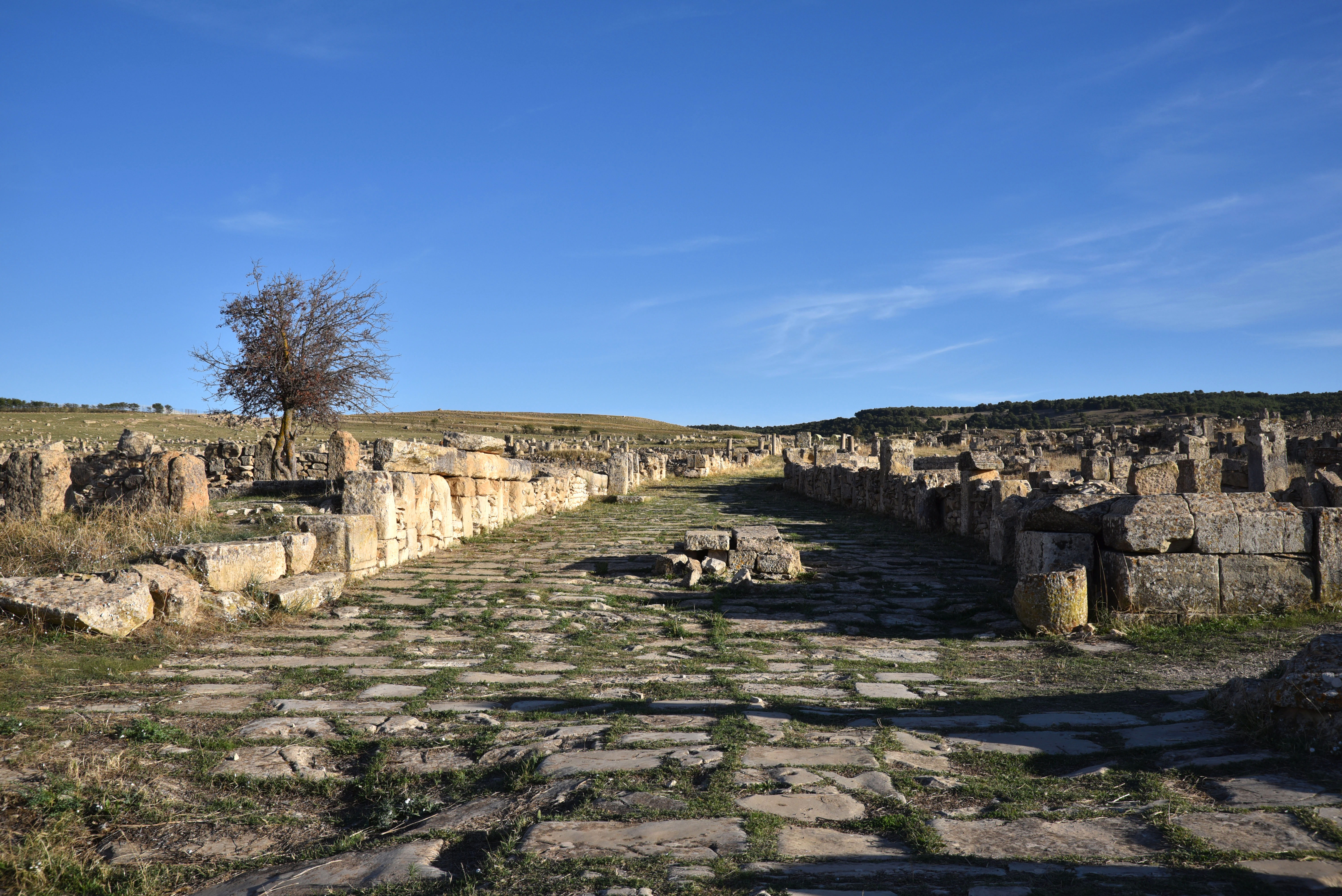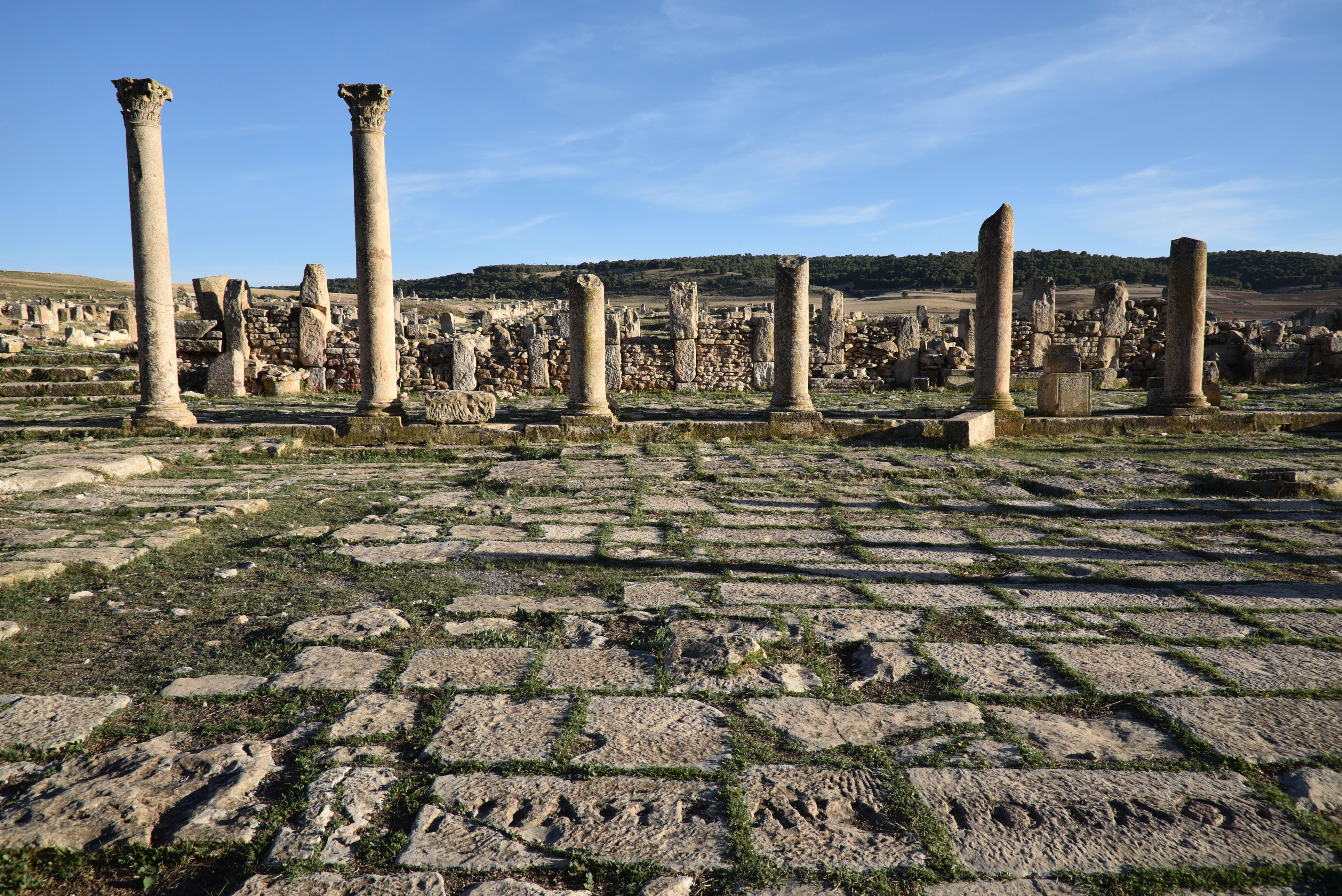 A paved street running north-south through the city.Architectural fragments lining the paved street leading from the baths.Architectural fragments lining the paved street leading from the baths.The Winter Baths of the 3rd century AD located at the north edge of the site.The larger Summer Baths (39 x 41 m) are set only 20 metres from the Winter Baths. They possess the usual sequence of cold and heated rooms, as well as a large, semi-circular latrine.A church dating to the second half of the 5th century AD, adapted from an earlier building.An oilery among the houses, featuring pressing stones and receiving tanks.Receiving tank for oil in one of the oileries.The southern section of the street leading from the baths.Overview of the ruins of Madauros in the southern part of the site.The paved Forum, built on a terrace and surrounded by porticoes. The forum is rectangular, almost square (32.4 x 27 and 28.5 m).A refurbishment of the Forum’s paved surface was marked by an inscription that ran across its width in bronze letters. These letters have since been removed, leaving corresponding hollows in the paving slabs. The work, which cost 200,000 sesterces, was funded by a certain M. Aurelius (not the emperor).The bases of statues found in the Forum remind us of those mentioned by Saint Augustine. One appears to have supported a statue of the writer Apuleius: “To the Platonic philosopher, their ornament, the citizens of Madauros set this up by decree of the decurions at public expense.”The walls of the Byzantine Fortress, constructed over the Forum in AD 535 as a rectangular building with square corner-towers and a central gate-tower.The small theatre was built during the Severan period, thanks to the generosity of the flamen M. Gabinius Sabinus, at a cost of 375,000 sesterces.The theatre was built in the immediate vicinity of the forum, against its west portico, and had a seating capacity of 1,000.View towards the Forum and the Byzantine Fortress.The Macellum (market), with the Forum and the Byzantine fortress in the background. This market had a circular, paved central space, surrounded by a portico sheltering radial market stalls.