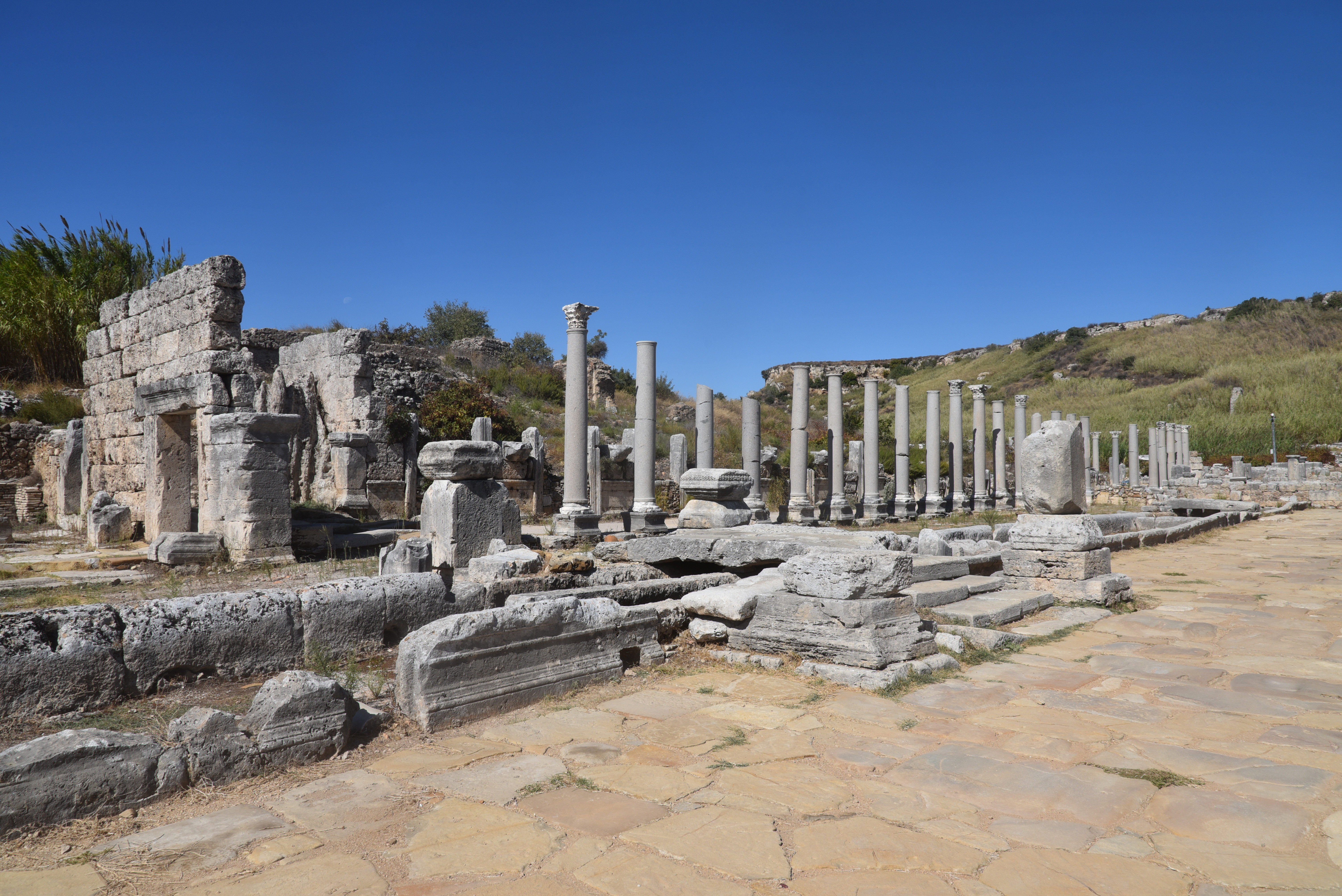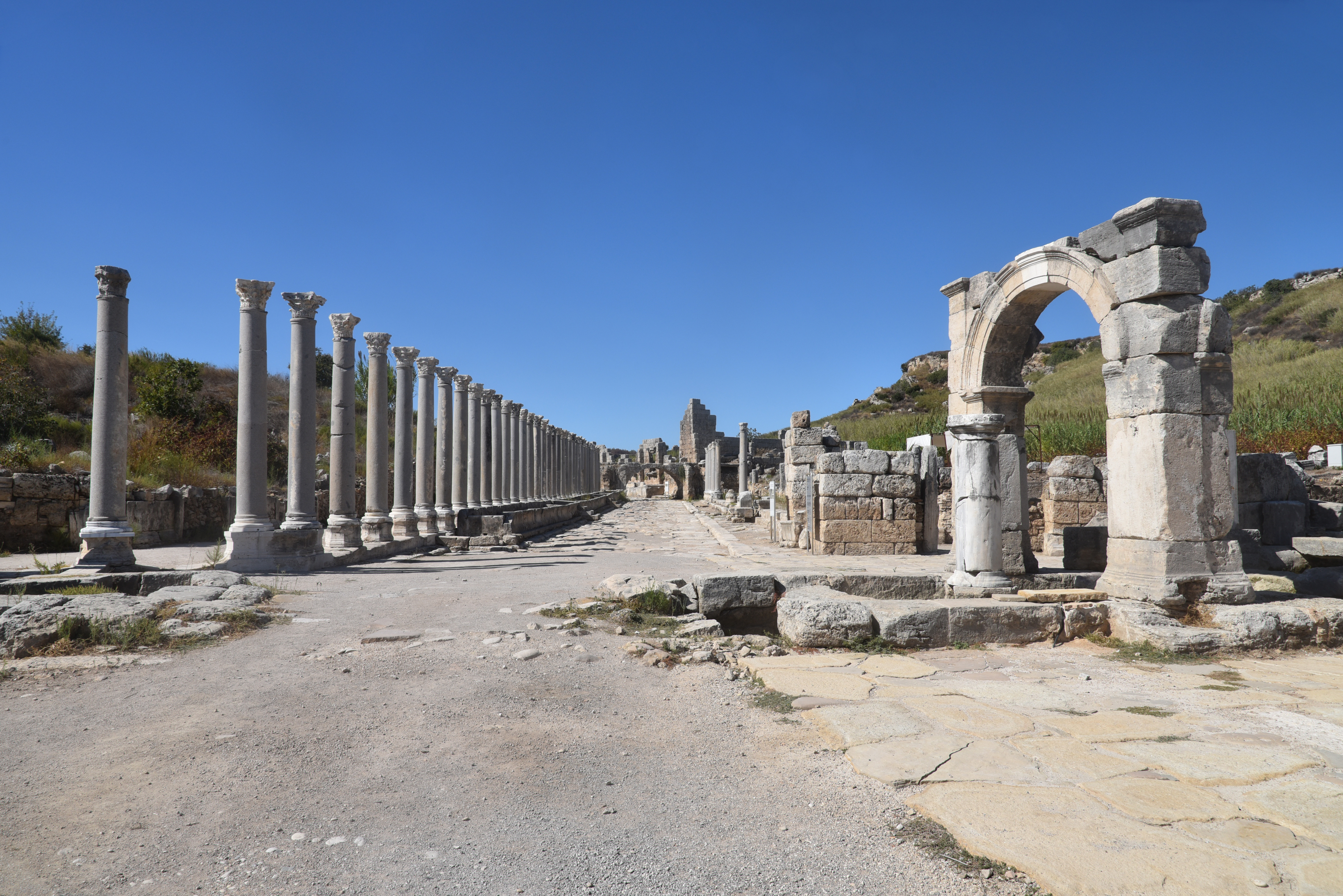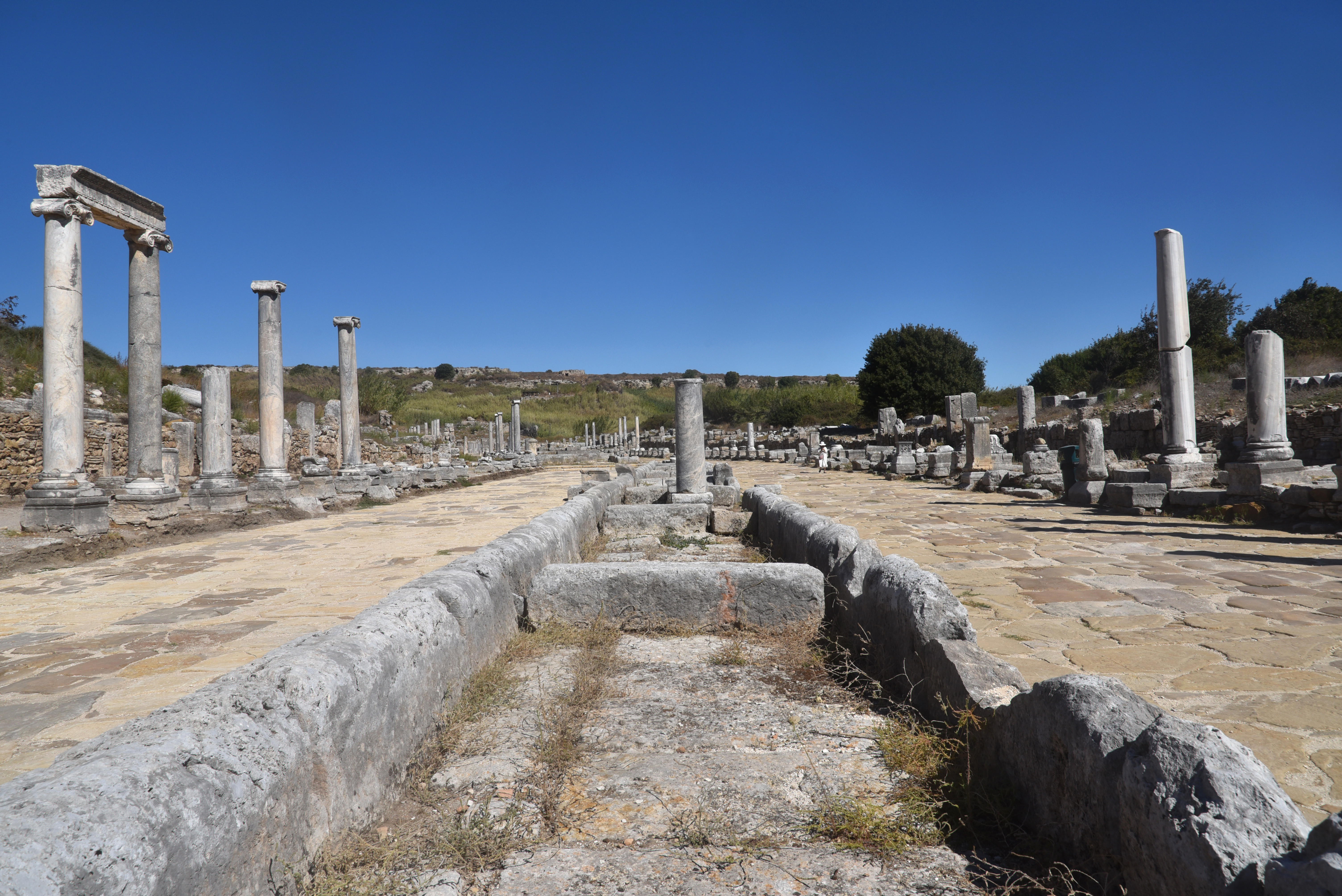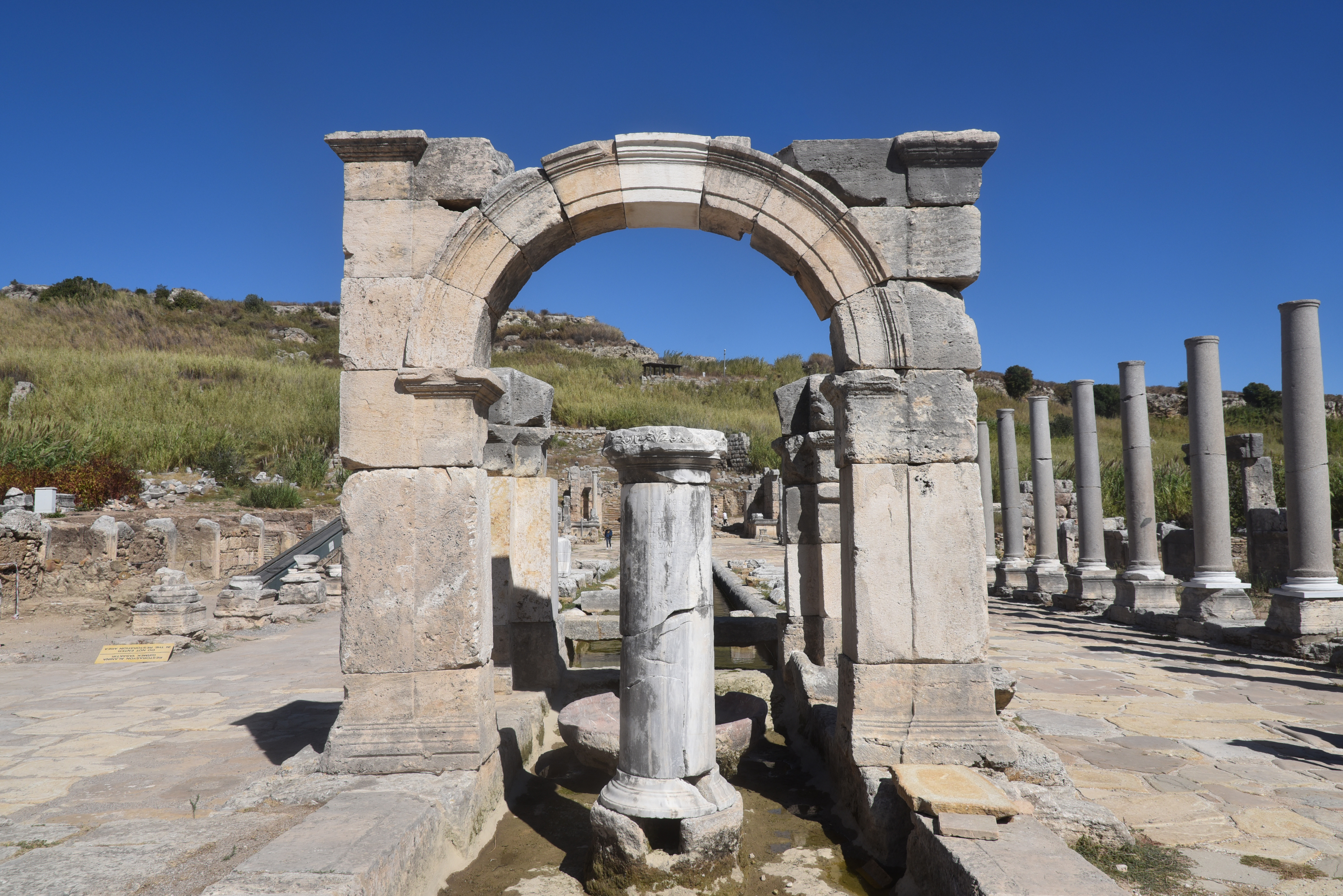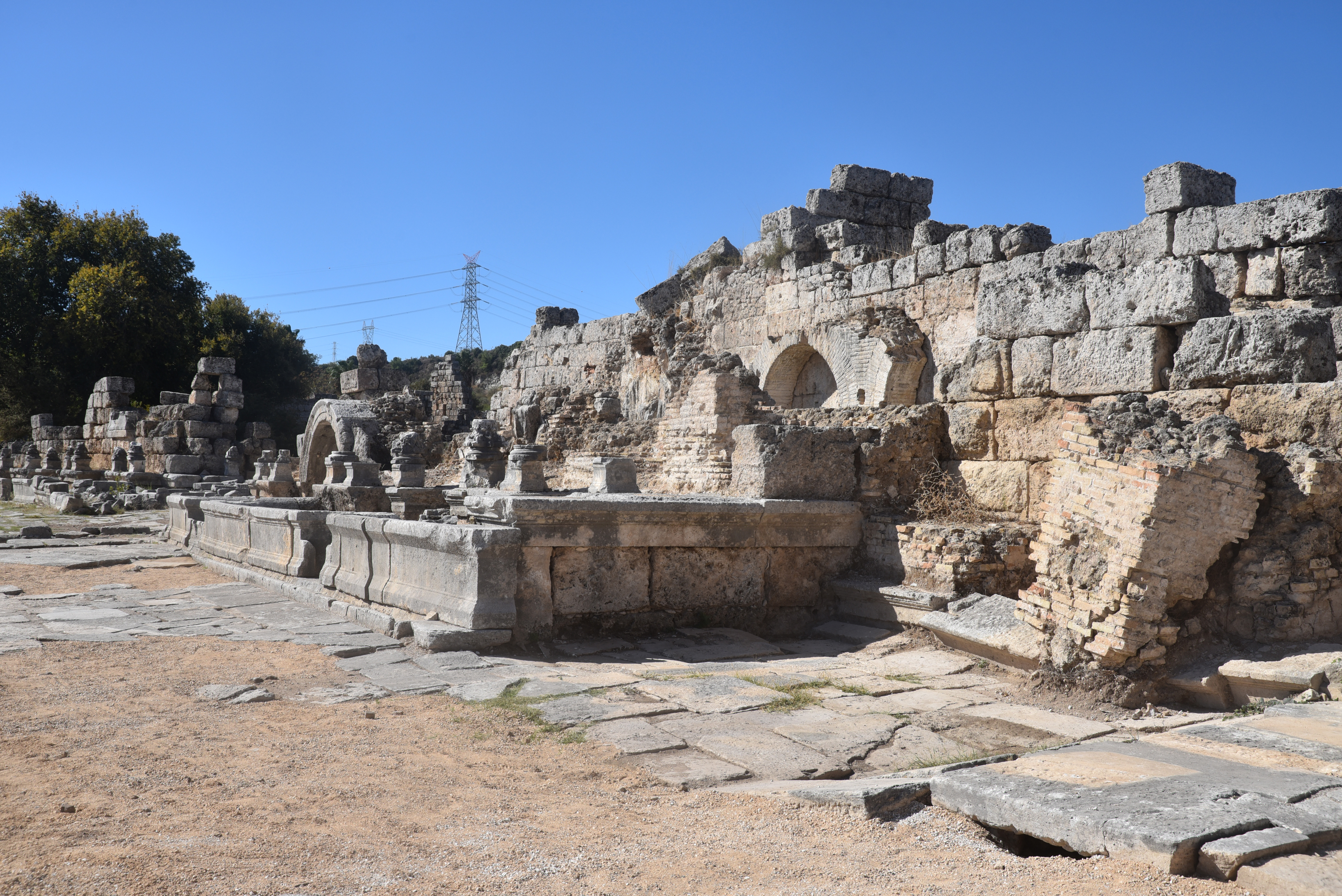 The North Nymphaeum, located at the northern end of the Cardo Maximus. It is dated to the Hadrianic period.Artist reconstruction of North Nymphaeum. It was a double-storied pi-shaped nymphaeum, with two projecting side wings fronted by columnar façades. Balage Balogh / archaeologyillustrated.comThe statuary display of the North Nymphaeum included two life-sized portraits of Hadrian, one cuirassed and the other heroically nude (see here).The Western Colonnaded Street (Decumanus Maximus), one of the city’s two main arteries.The Western Colonnaded Street, one of the city’s two main arteries, is a roughly 460-meter-long, 8-meter-wide thoroughfare that runs from the main street intersection toward the Palaestra and Northern Baths.Lined with Corinthian or Ionic columns, the porticoes of the Western Colonnaded Street provided pedestrians with shaded walkways and served as a location for shops.The Western Colonnaded Street (Decumanus Maximus) with the gymnasium-palaestra complex donated by C. Iulius Cornutus Bryoninus, Iulia Tertulla and Iulia Severa and dedicated to the Emperor Claudius. The building was erected of travertine on a square plan, with sides measuring 76 meters.The facade of the gymnasium-palaestra complex.Inscriptions along the Western Colonnaded Street (Decumanus Maximus).North West City Gate, Perge, the monumental entrance gate at the western end of the Decumanus Maximus.The Caracalla Nymphaeum, a semi-circular monumental fountain located at the end of the Decuman Maximus. It was constructed on a raised podium and embellished with statues of gods and goddesses, as well as of Emperor Caracalla.The Agora/Macellum, a square-shaped (51m x 51m) surrounded by colonnades and shops built in the 4th century AD.The northern side of the Agora/Macellum.The circular structure in the centre of the Agora/Macellum served as a fountain.