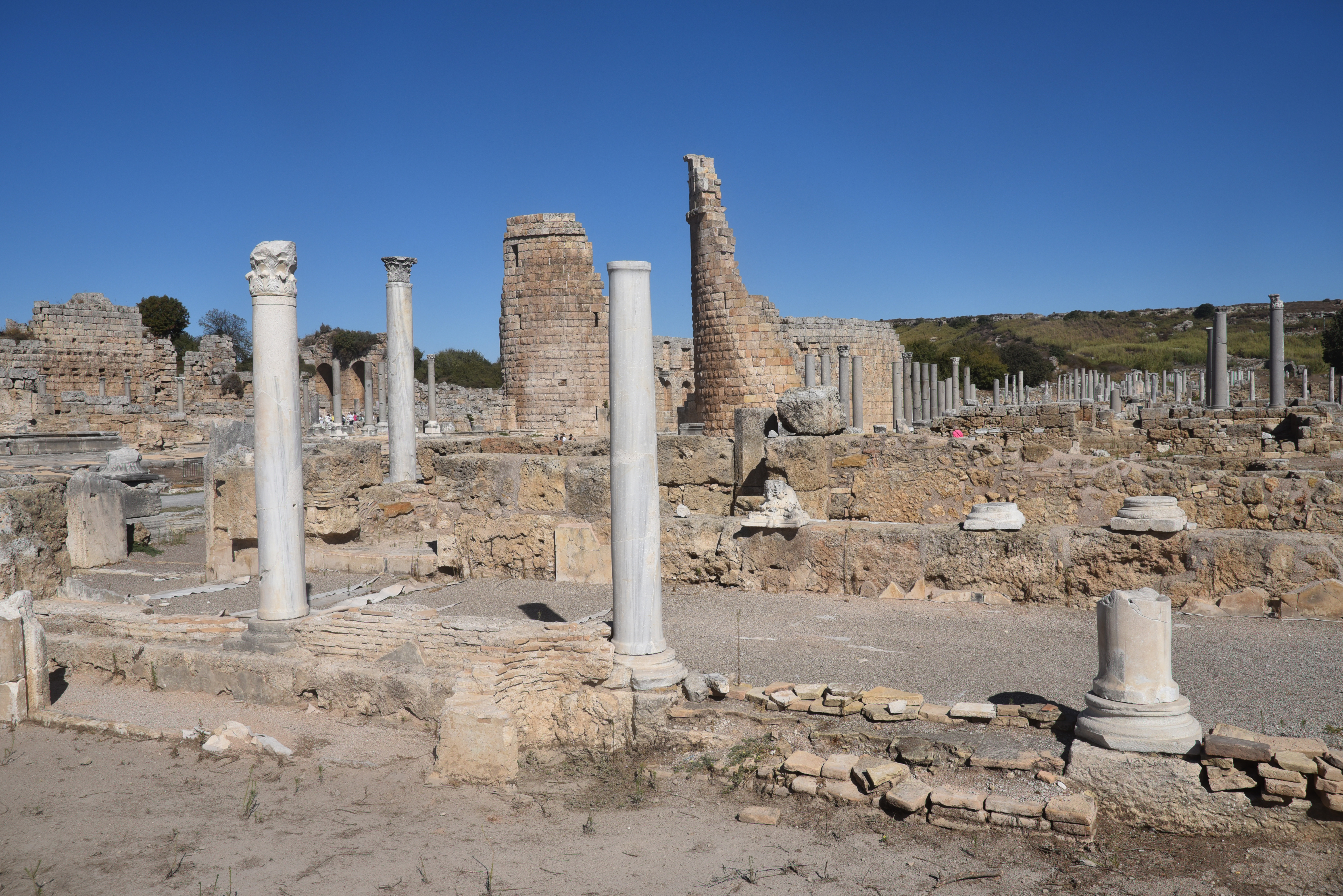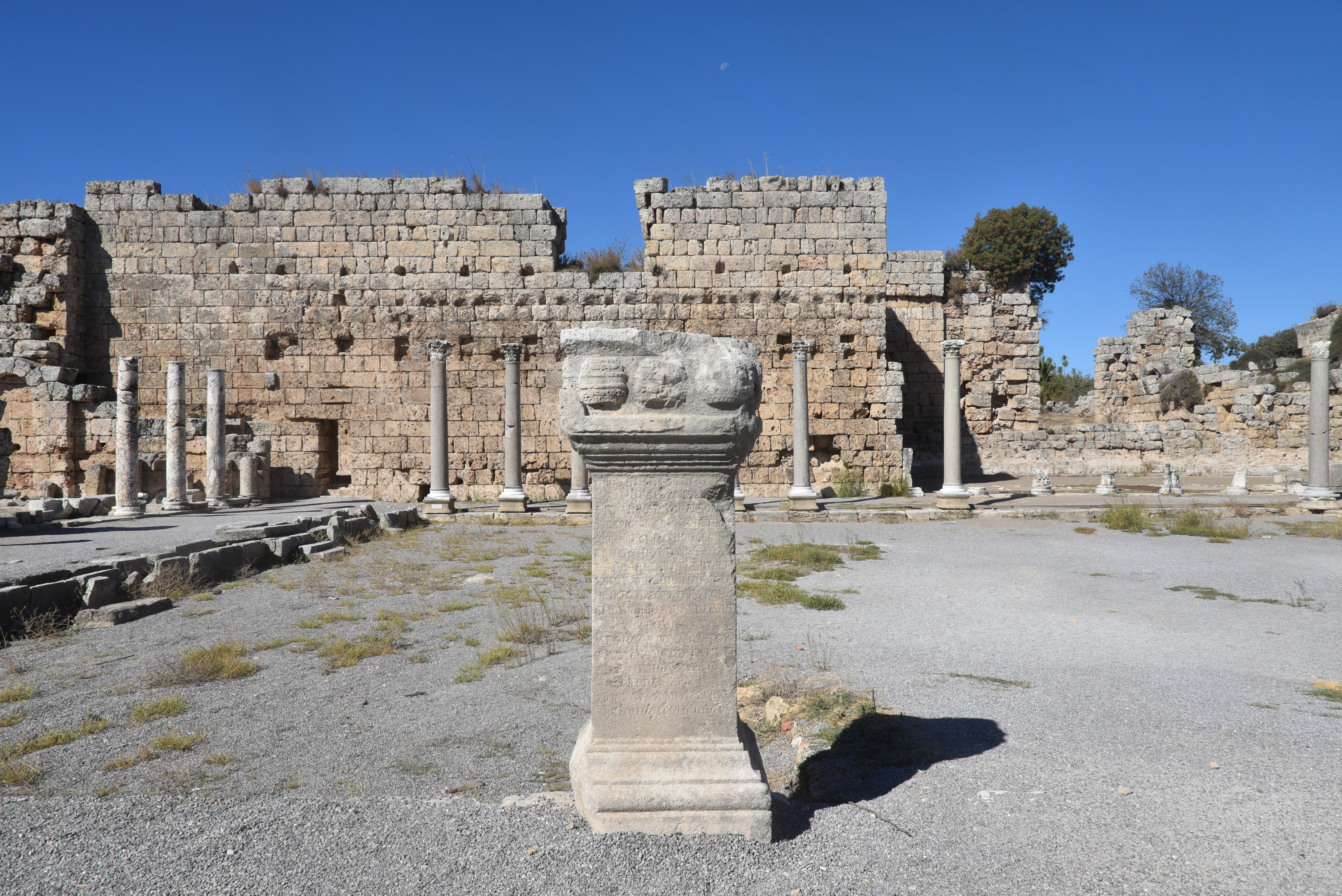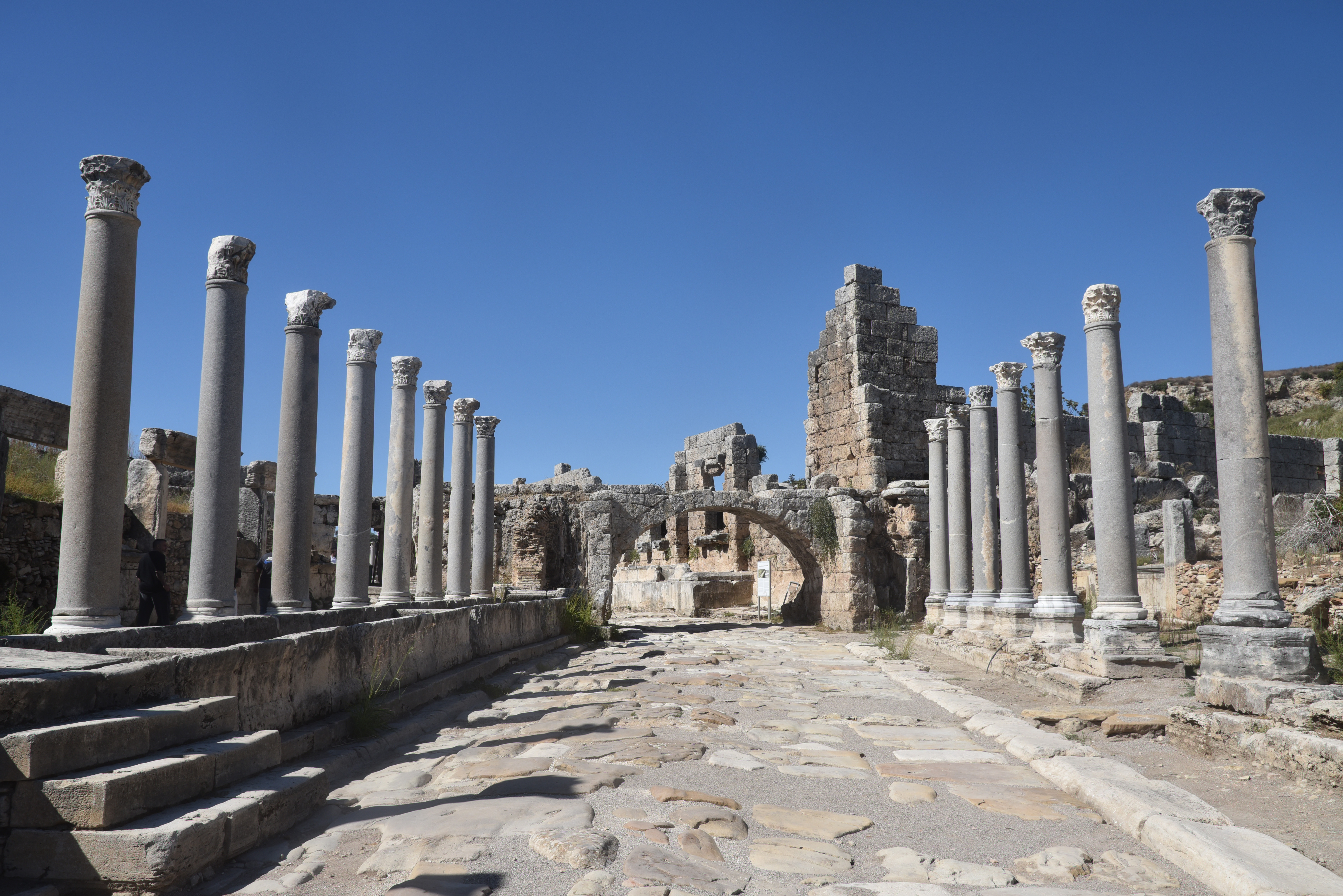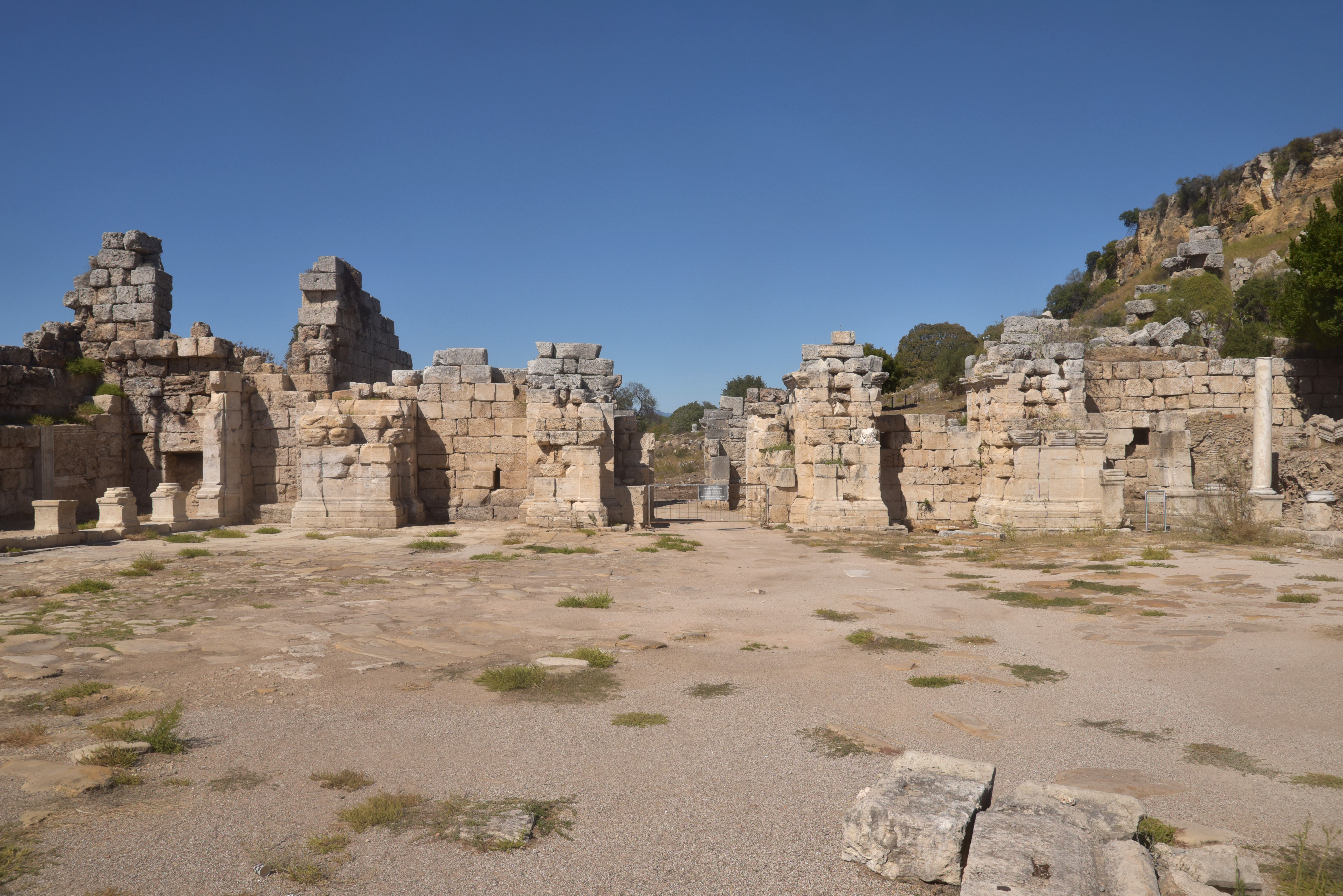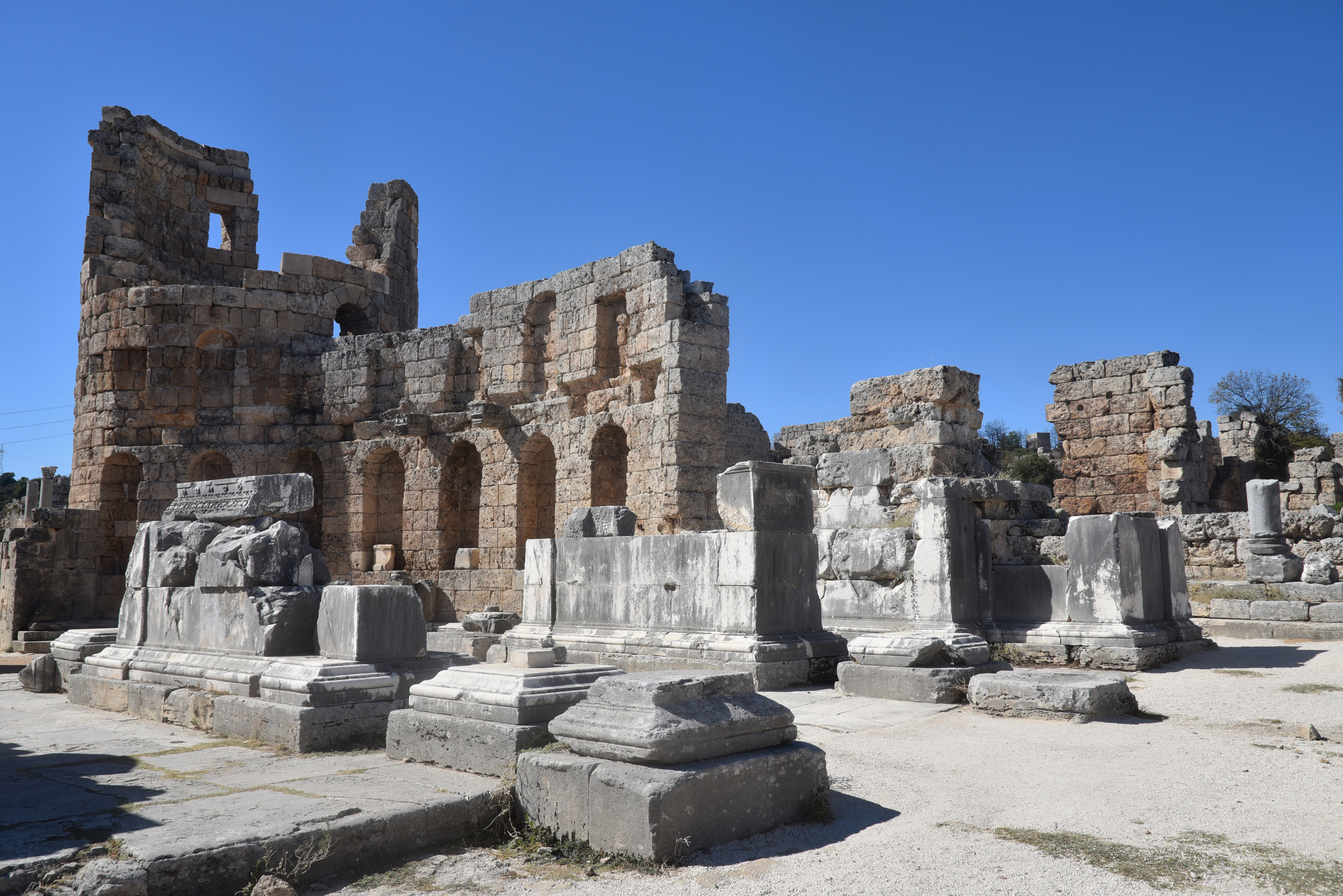 The North Nymphaeum, located at the northern end of the Cardo Maximus. It is dated to the Hadrianic period.Artist reconstruction of North Nymphaeum. It was a double-storied pi-shaped nymphaeum, with two projecting side wings fronted by columnar façades. Balage Balogh / archaeologyillustrated.comThe statuary display of the North Nymphaeum included two life-sized portraits of Hadrian, one cuirassed and the other heroically nude (see here).The Western Colonnaded Street (Decumanus Maximus), one of the city’s two main arteries.The Western Colonnaded Street, one of the city’s two main arteries, is a roughly 460-meter-long, 8-meter-wide thoroughfare that runs from the main street intersection toward the Palaestra and Northern Baths.Lined with Corinthian or Ionic columns, the porticoes of the Western Colonnaded Street provided pedestrians with shaded walkways and served as a location for shops.The Western Colonnaded Street (Decumanus Maximus) with the gymnasium-palaestra complex donated by C. Iulius Cornutus Bryoninus, Iulia Tertulla and Iulia Severa and dedicated to the Emperor Claudius. The building was erected of travertine on a square plan, with sides measuring 76 meters.The facade of the gymnasium-palaestra complex.Inscriptions along the Western Colonnaded Street (Decumanus Maximus).North West City Gate, Perge, the monumental entrance gate at the western end of the Decumanus Maximus.The Caracalla Nymphaeum, a semi-circular monumental fountain located at the end of the Decuman Maximus. It was constructed on a raised podium and embellished with statues of gods and goddesses, as well as of Emperor Caracalla.The Agora/Macellum, a square-shaped (51m x 51m) surrounded by colonnades and shops built in the 4th century AD.The northern side of the Agora/Macellum.The circular structure in the centre of the Agora/Macellum served as a fountain.