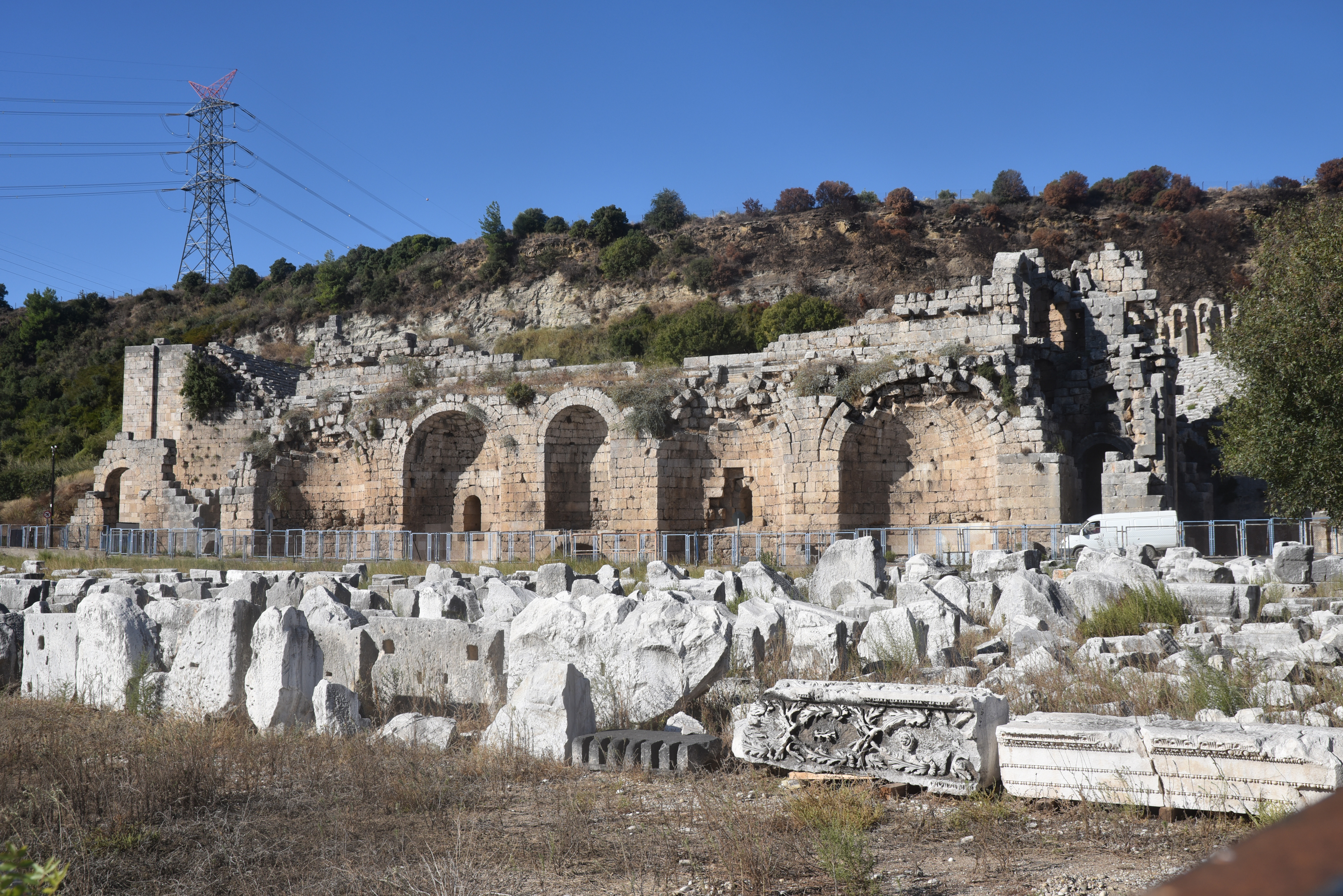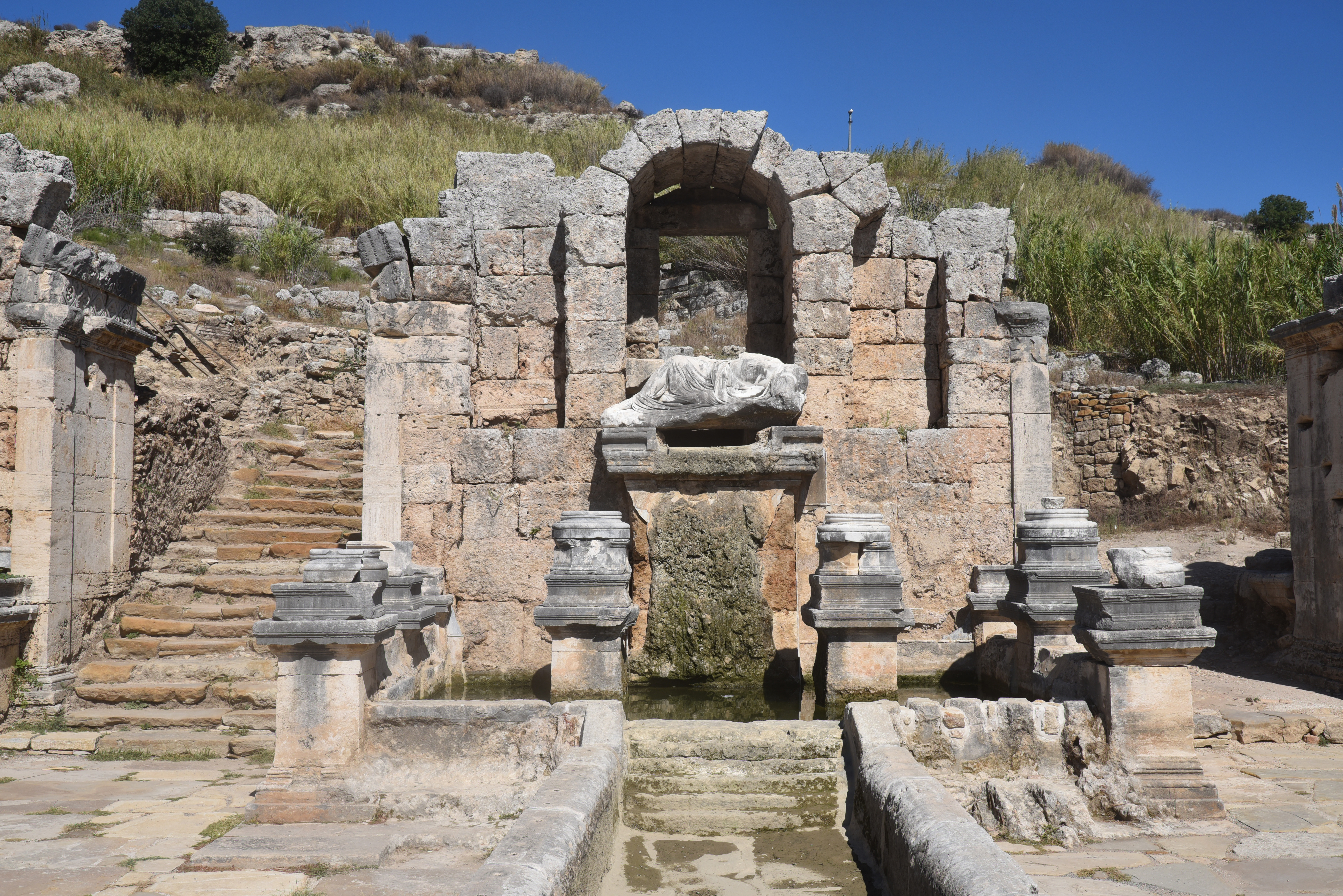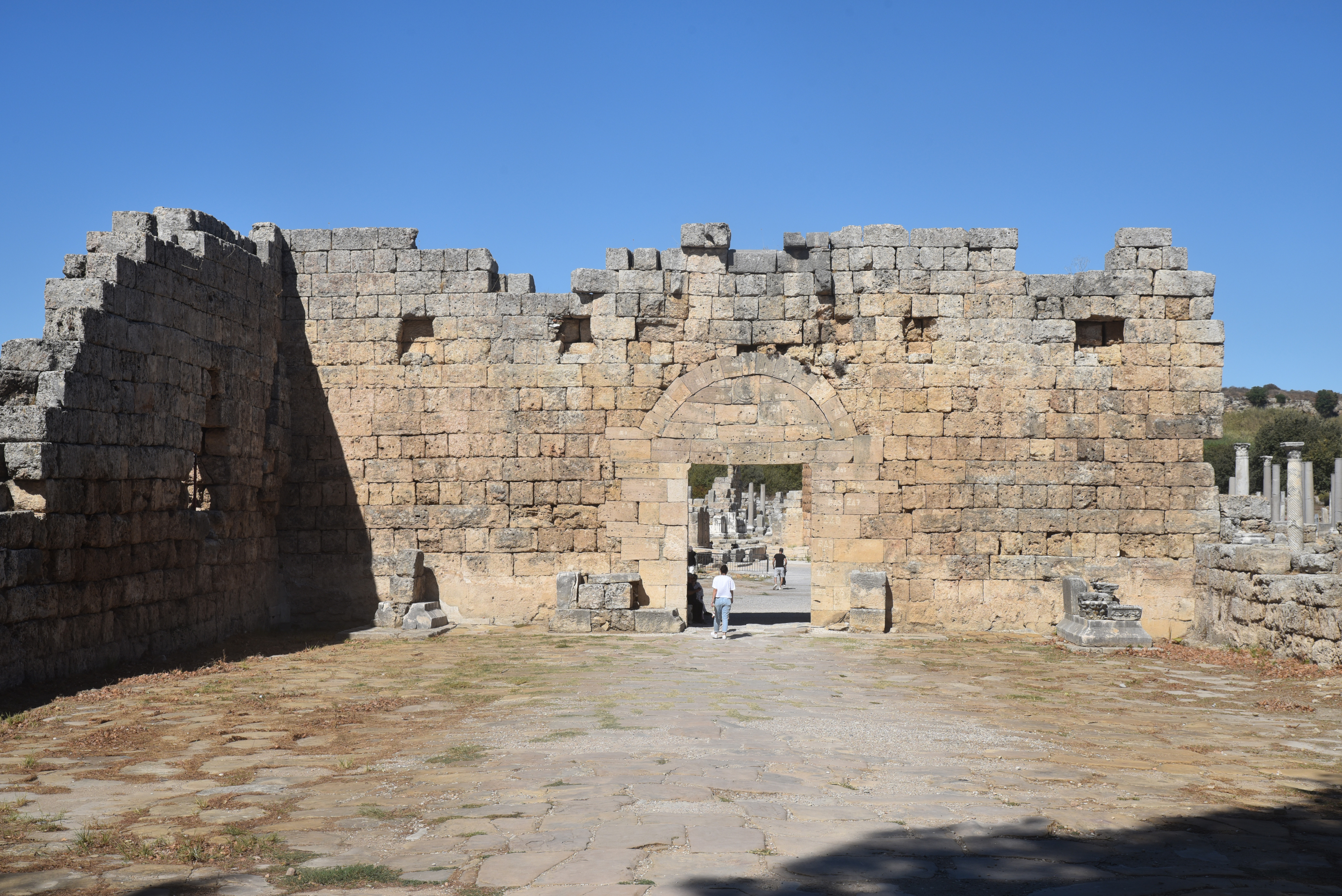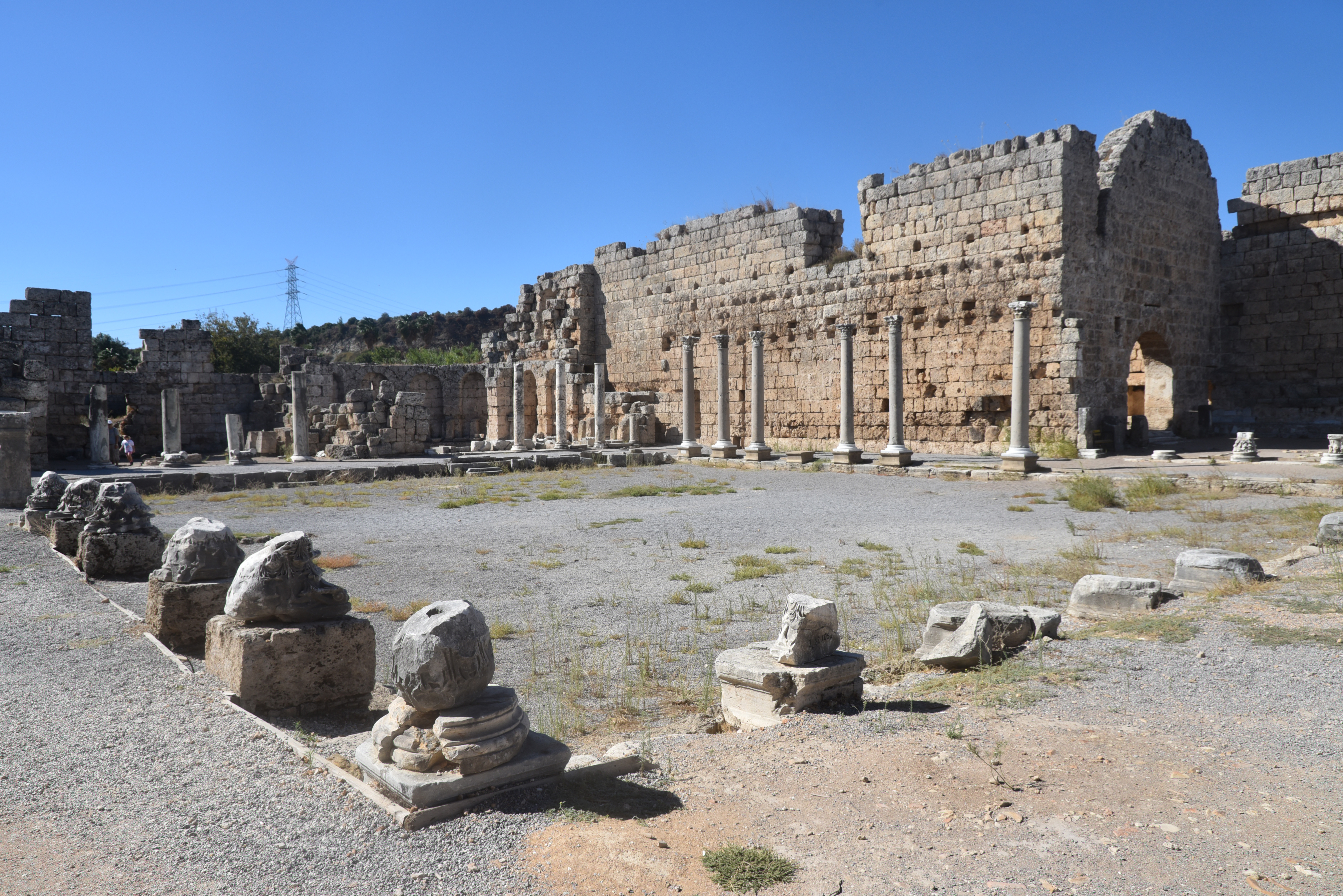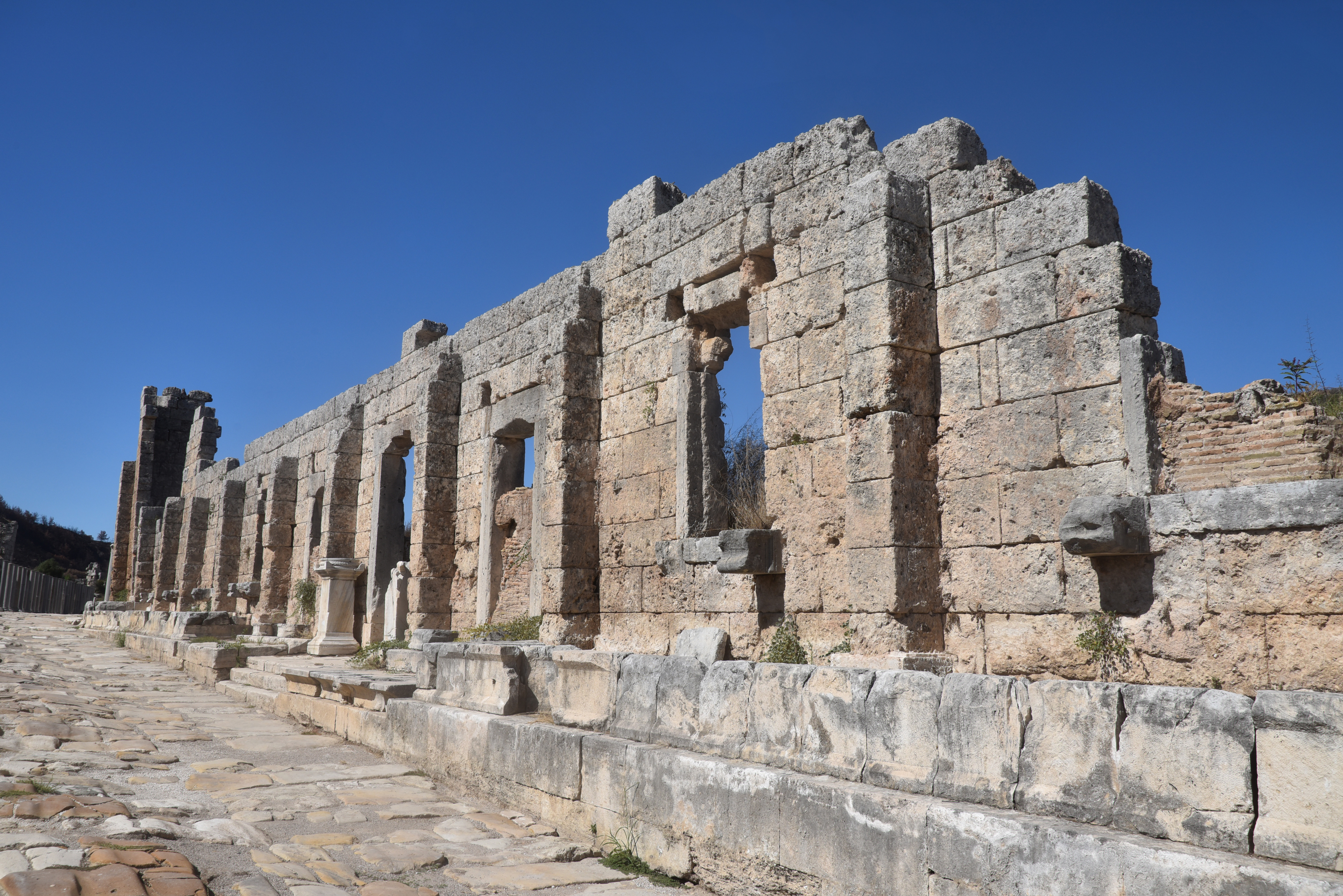 The North Nymphaeum, located at the northern end of the Cardo Maximus. It is dated to the Hadrianic period.Artist reconstruction of North Nymphaeum. It was a double-storied pi-shaped nymphaeum, with two projecting side wings fronted by columnar façades. Balage Balogh / archaeologyillustrated.comThe statuary display of the North Nymphaeum included two life-sized portraits of Hadrian, one cuirassed and the other heroically nude (see here).The Western Colonnaded Street (Decumanus Maximus), one of the city’s two main arteries.The Western Colonnaded Street, one of the city’s two main arteries, is a roughly 460-meter-long, 8-meter-wide thoroughfare that runs from the main street intersection toward the Palaestra and Northern Baths.Lined with Corinthian or Ionic columns, the porticoes of the Western Colonnaded Street provided pedestrians with shaded walkways and served as a location for shops.The Western Colonnaded Street (Decumanus Maximus) with the gymnasium-palaestra complex donated by C. Iulius Cornutus Bryoninus, Iulia Tertulla and Iulia Severa and dedicated to the Emperor Claudius. The building was erected of travertine on a square plan, with sides measuring 76 meters.The facade of the gymnasium-palaestra complex.Inscriptions along the Western Colonnaded Street (Decumanus Maximus).North West City Gate, Perge, the monumental entrance gate at the western end of the Decumanus Maximus.The Caracalla Nymphaeum, a semi-circular monumental fountain located at the end of the Decuman Maximus. It was constructed on a raised podium and embellished with statues of gods and goddesses, as well as of Emperor Caracalla.The Agora/Macellum, a square-shaped (51m x 51m) surrounded by colonnades and shops built in the 4th century AD.The northern side of the Agora/Macellum.The circular structure in the centre of the Agora/Macellum served as a fountain.