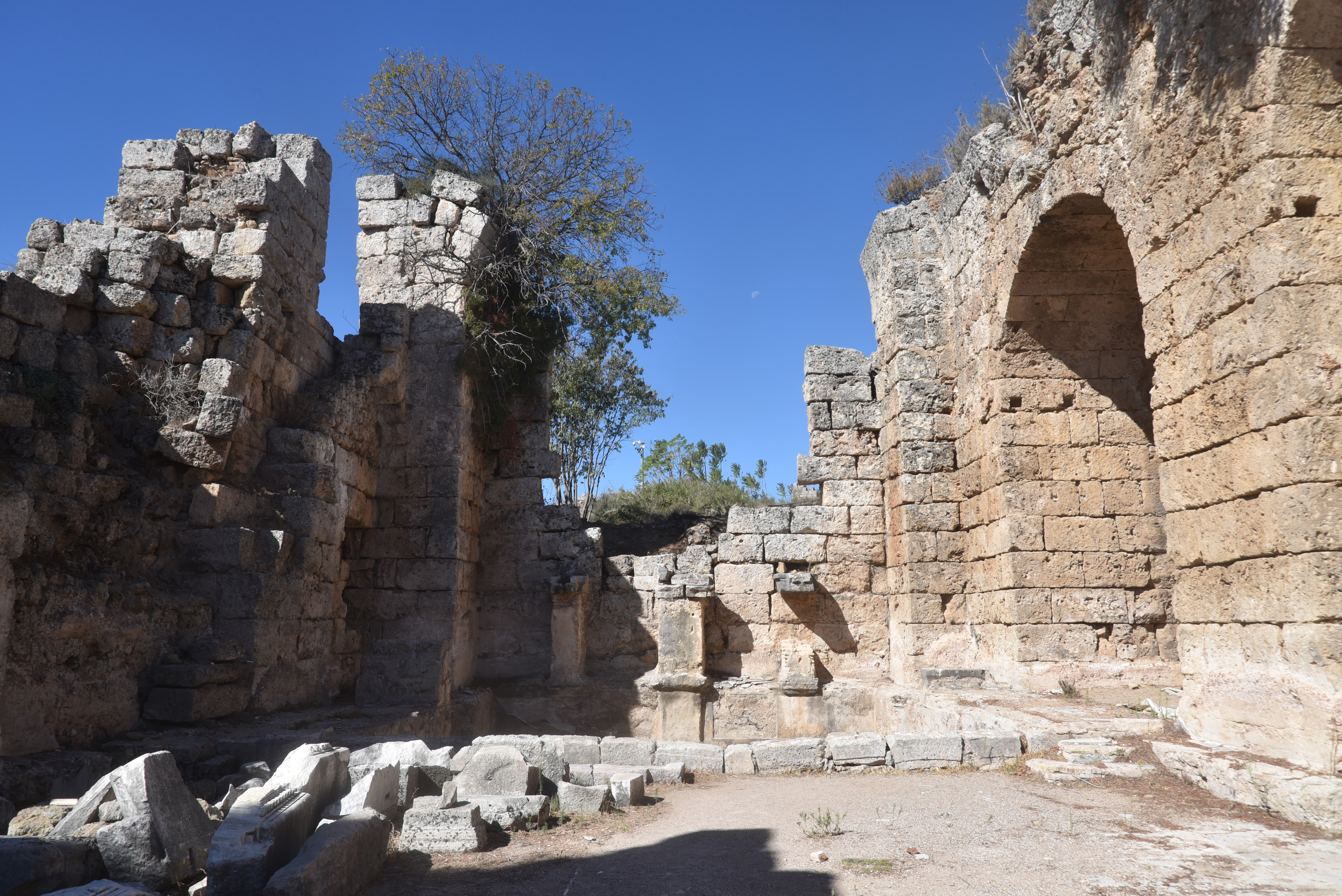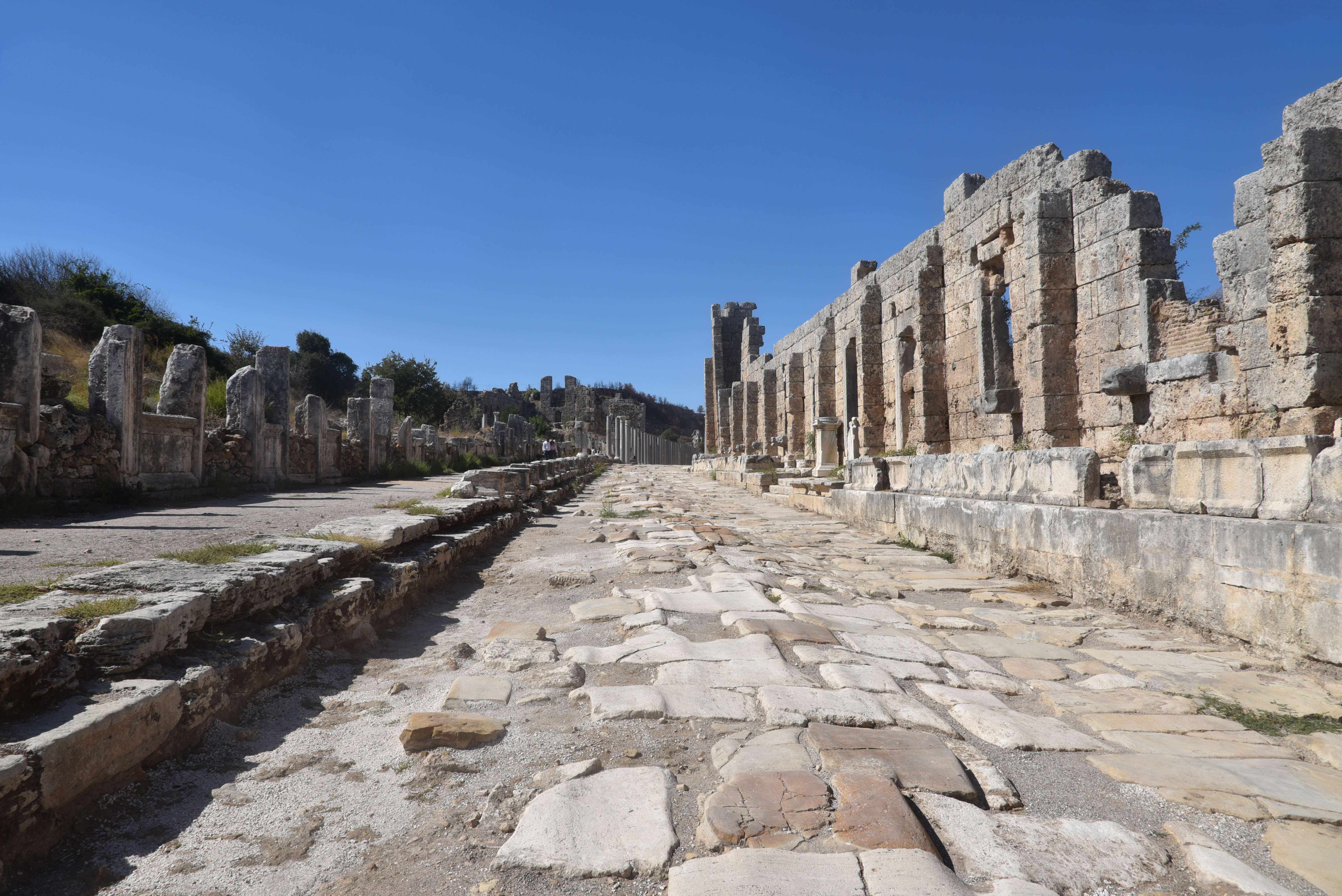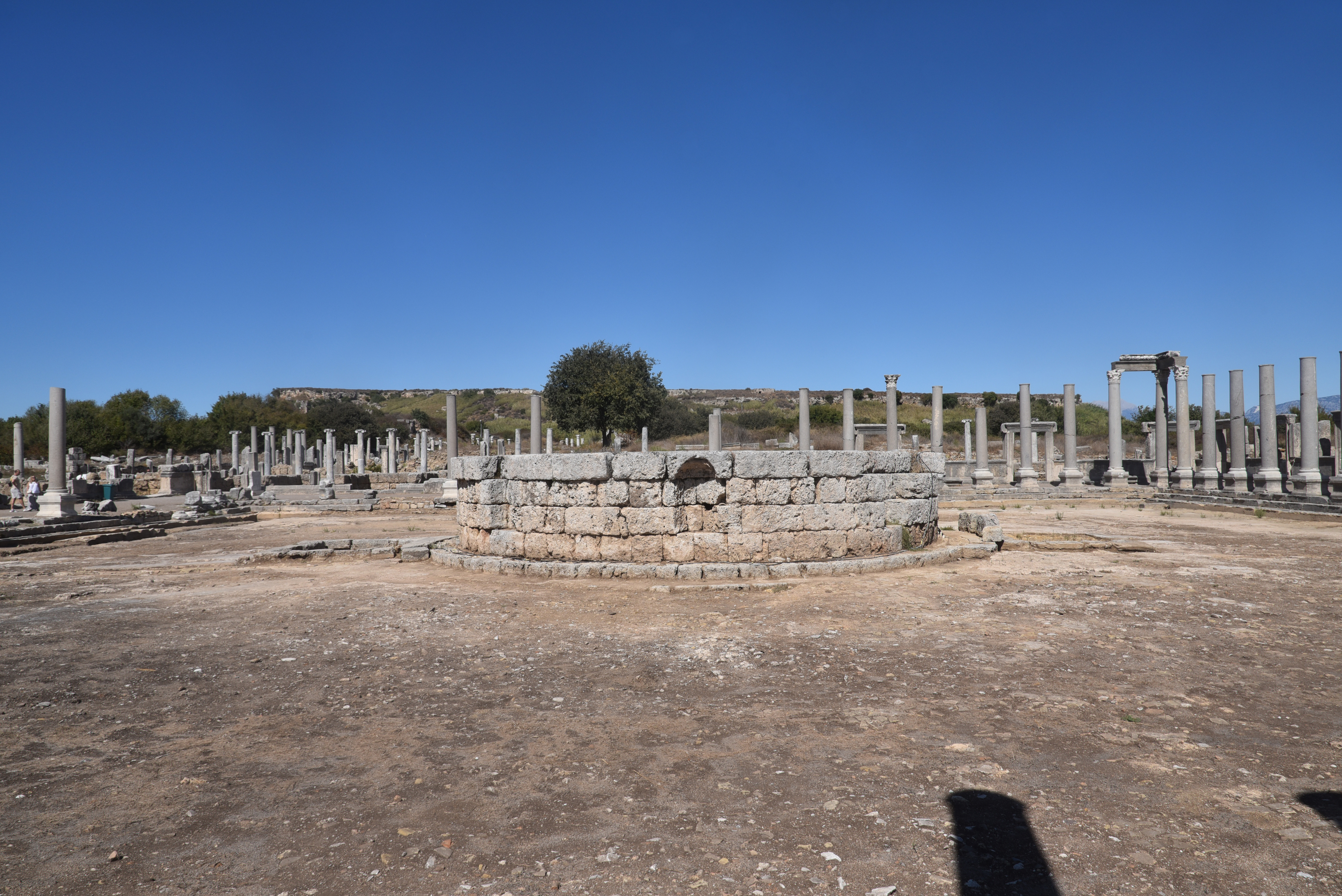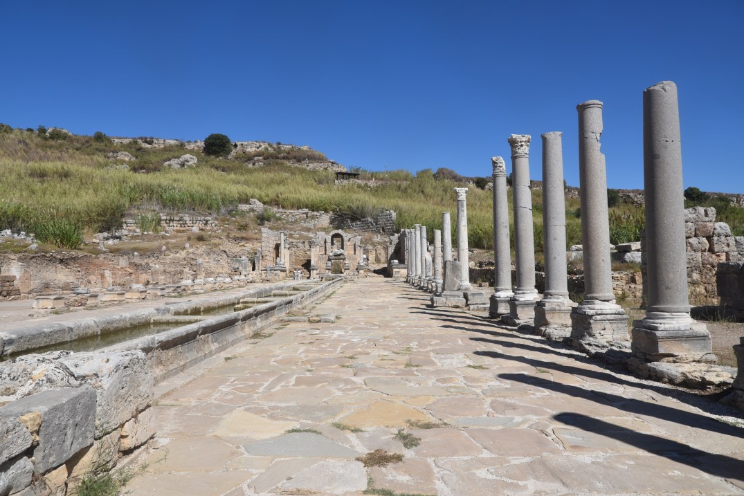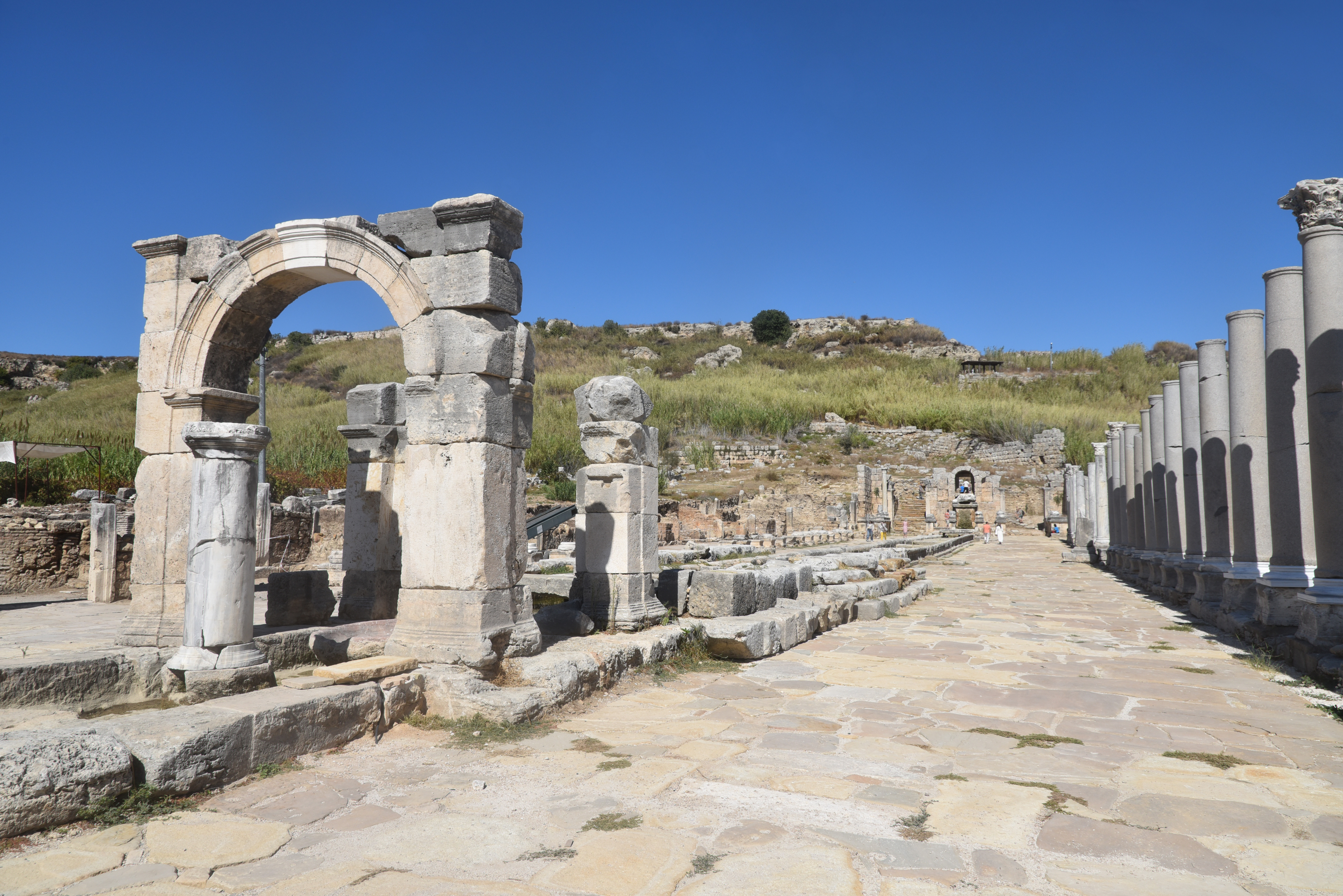 The North Nymphaeum, located at the northern end of the Cardo Maximus. It is dated to the Hadrianic period.Artist reconstruction of North Nymphaeum. It was a double-storied pi-shaped nymphaeum, with two projecting side wings fronted by columnar façades. Balage Balogh / archaeologyillustrated.comThe statuary display of the North Nymphaeum included two life-sized portraits of Hadrian, one cuirassed and the other heroically nude (see here).The Western Colonnaded Street (Decumanus Maximus), one of the city’s two main arteries.The Western Colonnaded Street, one of the city’s two main arteries, is a roughly 460-meter-long, 8-meter-wide thoroughfare that runs from the main street intersection toward the Palaestra and Northern Baths.Lined with Corinthian or Ionic columns, the porticoes of the Western Colonnaded Street provided pedestrians with shaded walkways and served as a location for shops.The Western Colonnaded Street (Decumanus Maximus) with the gymnasium-palaestra complex donated by C. Iulius Cornutus Bryoninus, Iulia Tertulla and Iulia Severa and dedicated to the Emperor Claudius. The building was erected of travertine on a square plan, with sides measuring 76 meters.The facade of the gymnasium-palaestra complex.Inscriptions along the Western Colonnaded Street (Decumanus Maximus).North West City Gate, Perge, the monumental entrance gate at the western end of the Decumanus Maximus.The Caracalla Nymphaeum, a semi-circular monumental fountain located at the end of the Decuman Maximus. It was constructed on a raised podium and embellished with statues of gods and goddesses, as well as of Emperor Caracalla.The Agora/Macellum, a square-shaped (51m x 51m) surrounded by colonnades and shops built in the 4th century AD.The northern side of the Agora/Macellum.The circular structure in the centre of the Agora/Macellum served as a fountain.