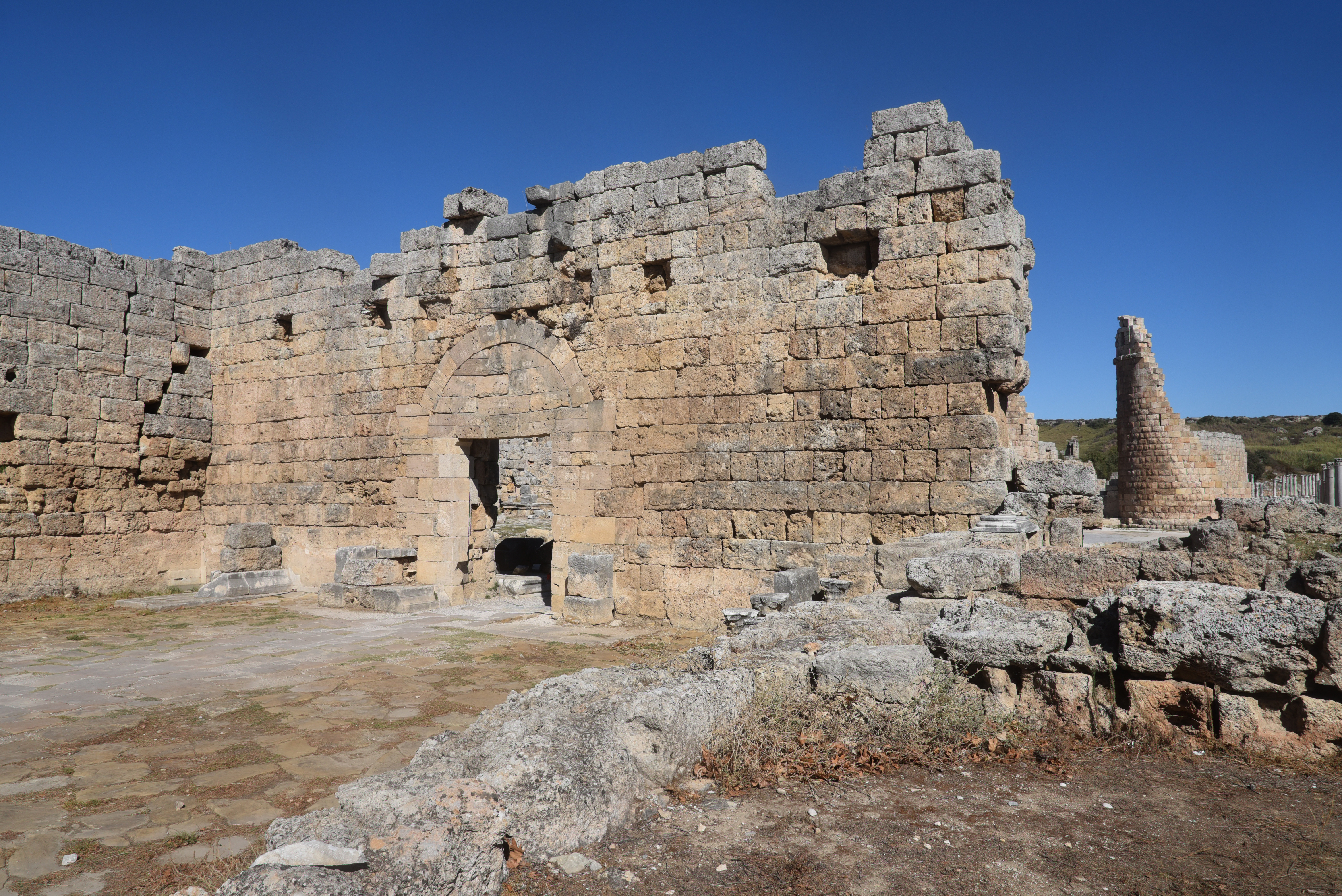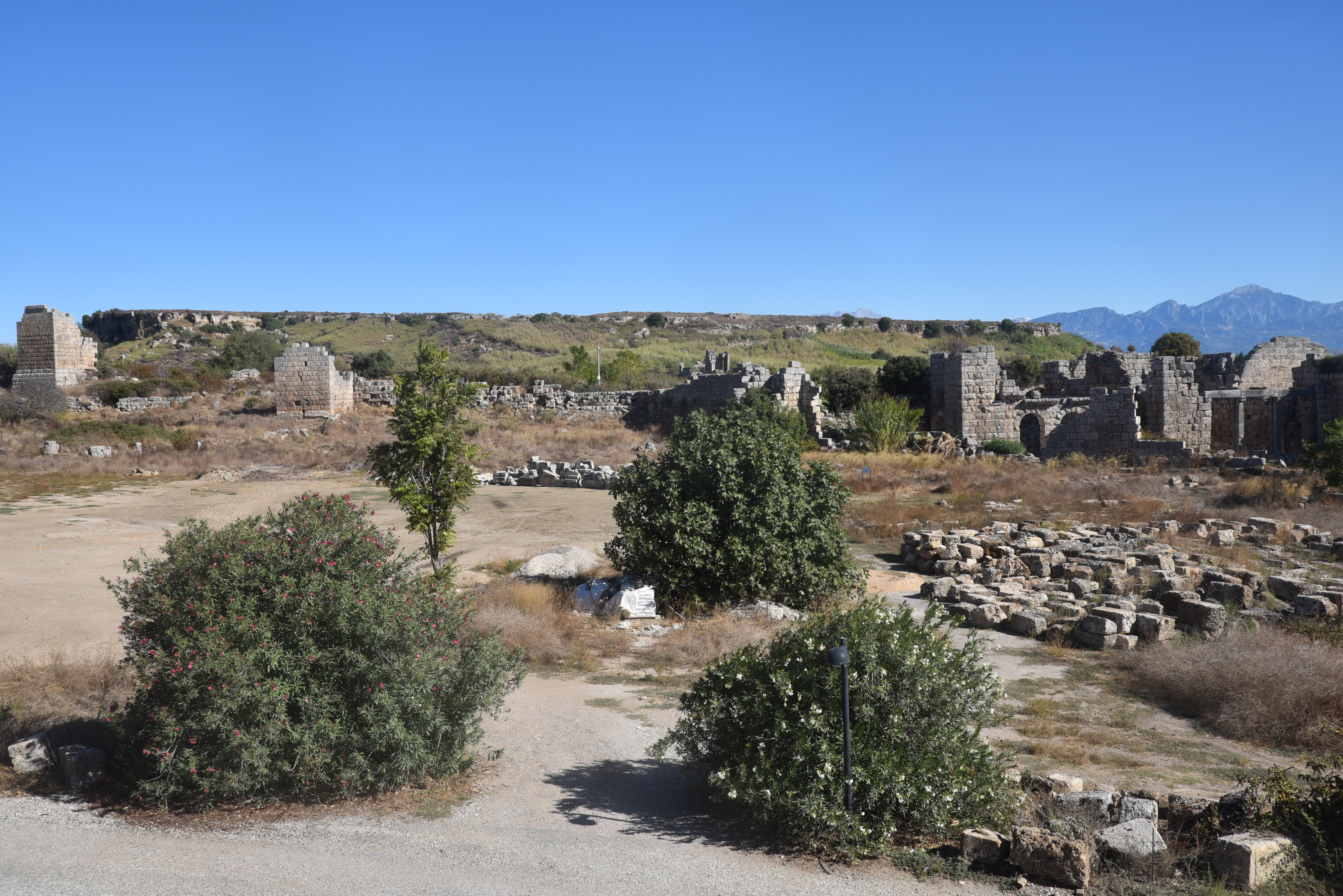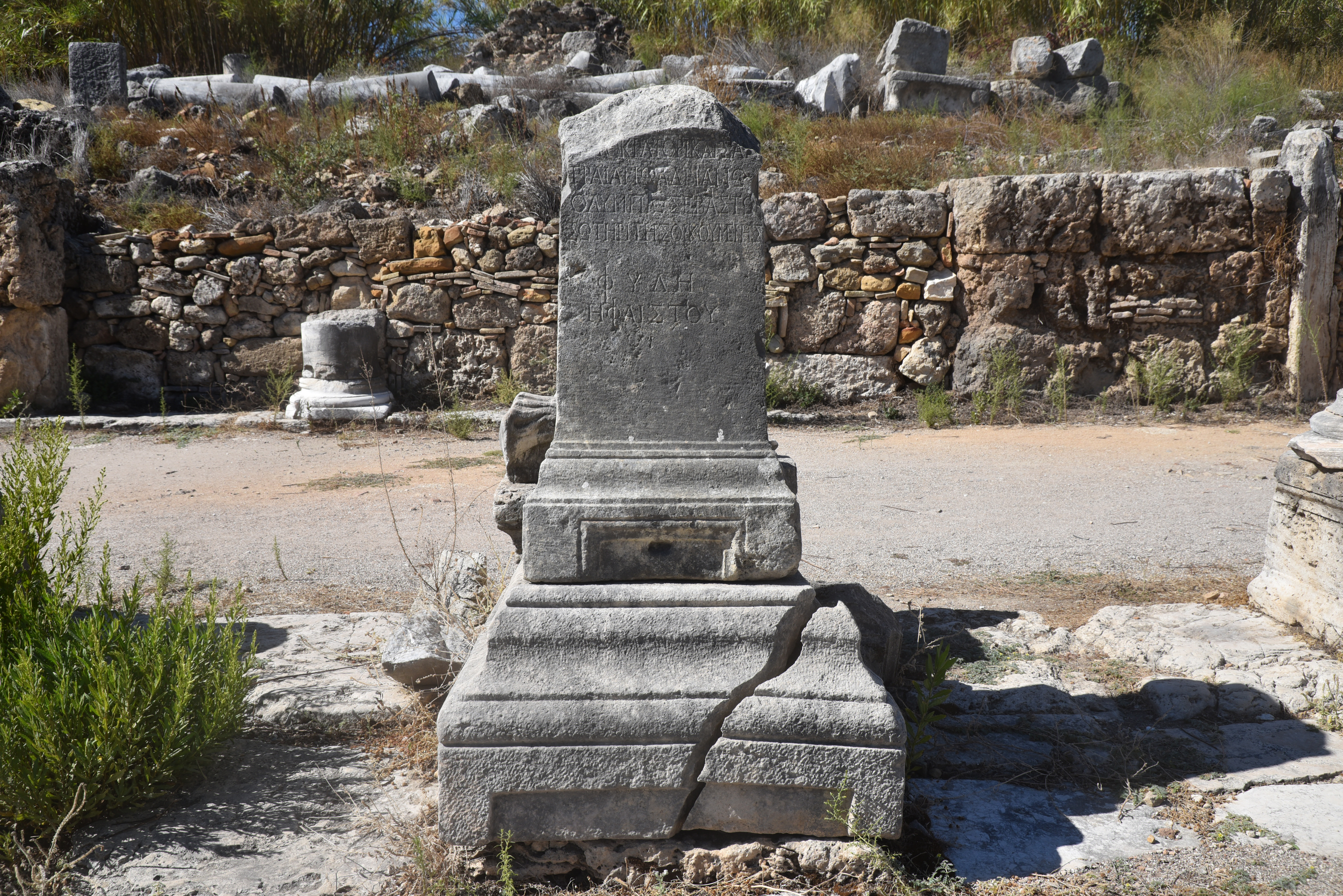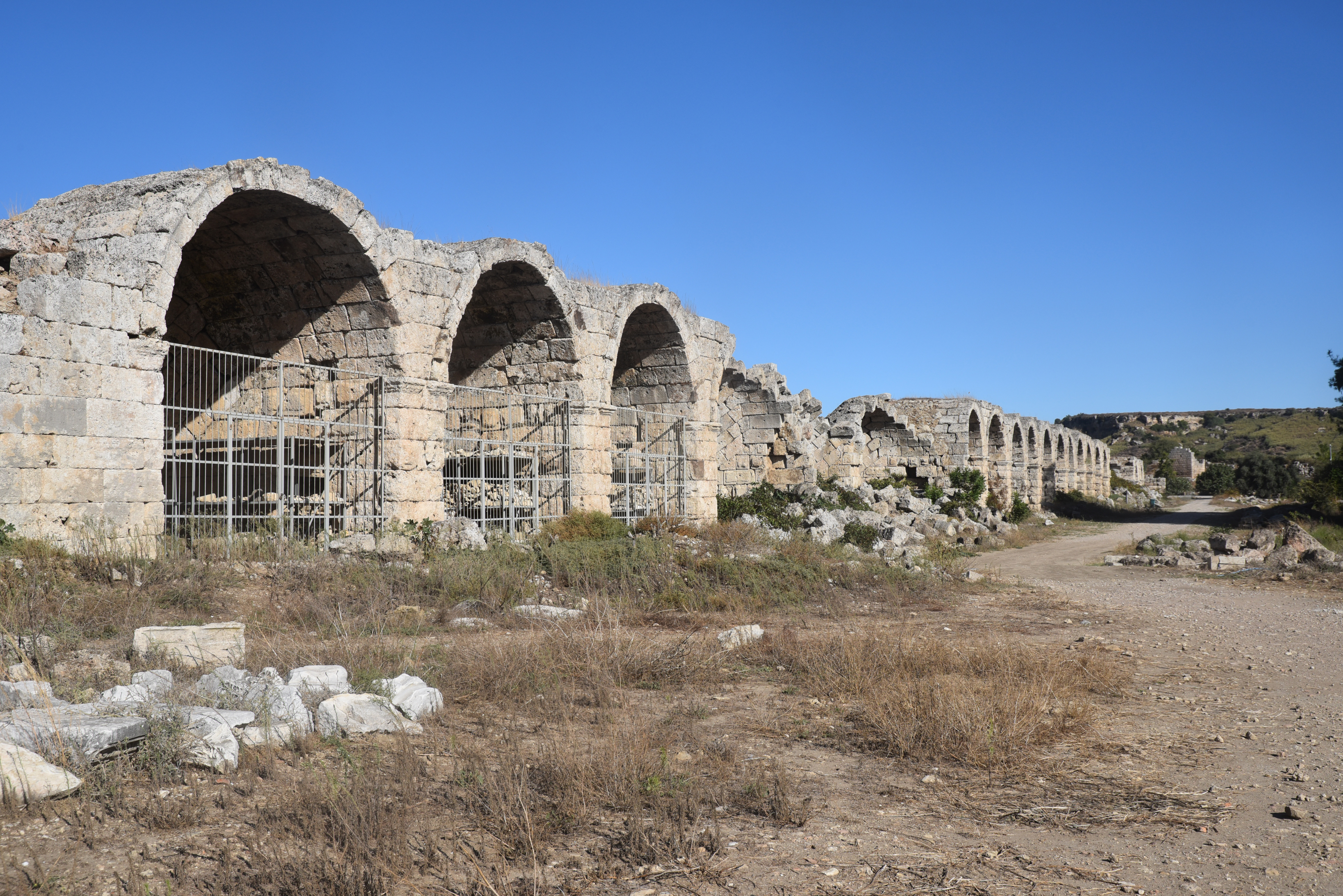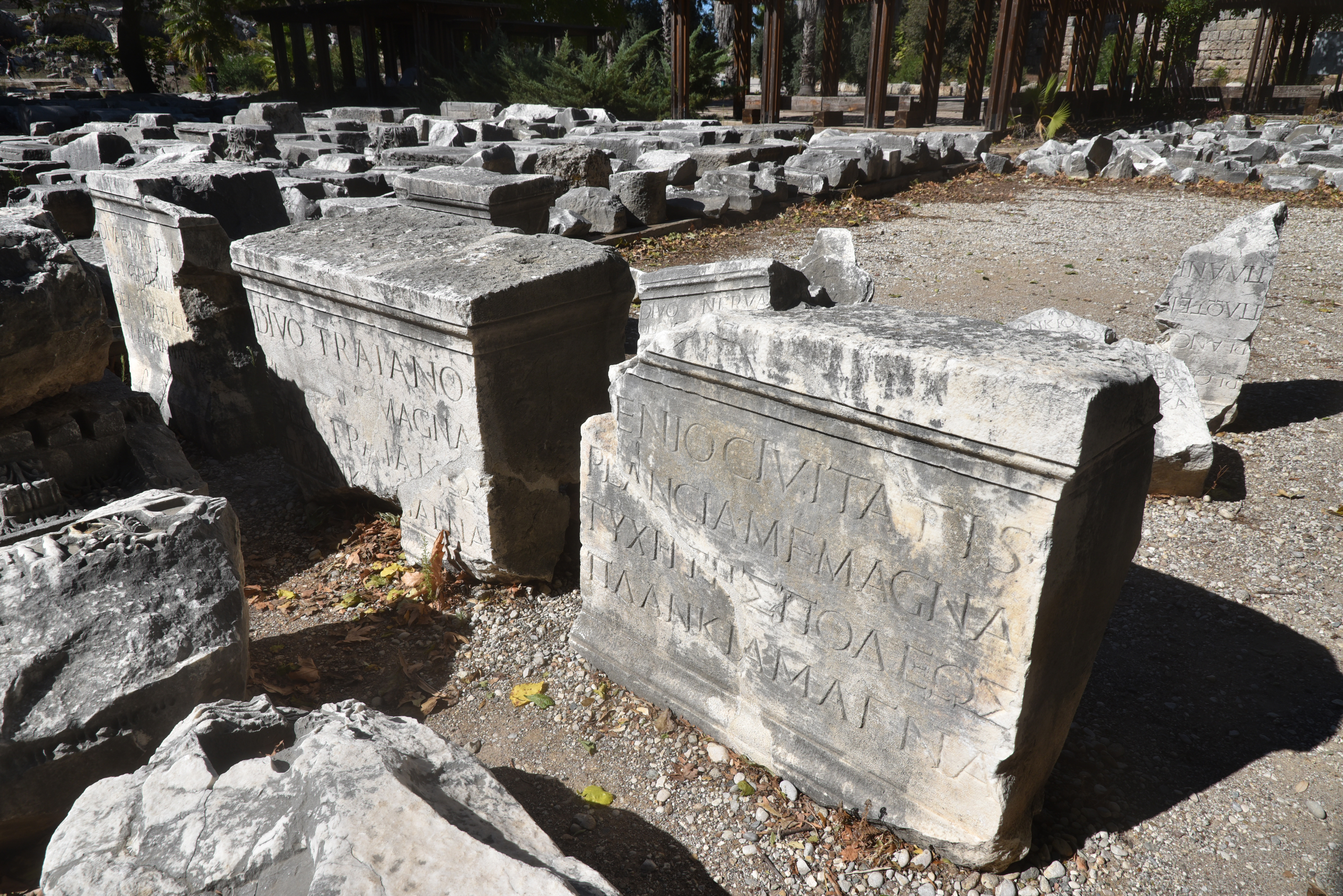 The North Nymphaeum, located at the northern end of the Cardo Maximus. It is dated to the Hadrianic period.Artist reconstruction of North Nymphaeum. It was a double-storied pi-shaped nymphaeum, with two projecting side wings fronted by columnar façades. Balage Balogh / archaeologyillustrated.comThe statuary display of the North Nymphaeum included two life-sized portraits of Hadrian, one cuirassed and the other heroically nude (see here).The Western Colonnaded Street (Decumanus Maximus), one of the city’s two main arteries.The Western Colonnaded Street, one of the city’s two main arteries, is a roughly 460-meter-long, 8-meter-wide thoroughfare that runs from the main street intersection toward the Palaestra and Northern Baths.Lined with Corinthian or Ionic columns, the porticoes of the Western Colonnaded Street provided pedestrians with shaded walkways and served as a location for shops.The Western Colonnaded Street (Decumanus Maximus) with the gymnasium-palaestra complex donated by C. Iulius Cornutus Bryoninus, Iulia Tertulla and Iulia Severa and dedicated to the Emperor Claudius. The building was erected of travertine on a square plan, with sides measuring 76 meters.The facade of the gymnasium-palaestra complex.Inscriptions along the Western Colonnaded Street (Decumanus Maximus).North West City Gate, Perge, the monumental entrance gate at the western end of the Decumanus Maximus.The Caracalla Nymphaeum, a semi-circular monumental fountain located at the end of the Decuman Maximus. It was constructed on a raised podium and embellished with statues of gods and goddesses, as well as of Emperor Caracalla.The Agora/Macellum, a square-shaped (51m x 51m) surrounded by colonnades and shops built in the 4th century AD.The northern side of the Agora/Macellum.The circular structure in the centre of the Agora/Macellum served as a fountain.