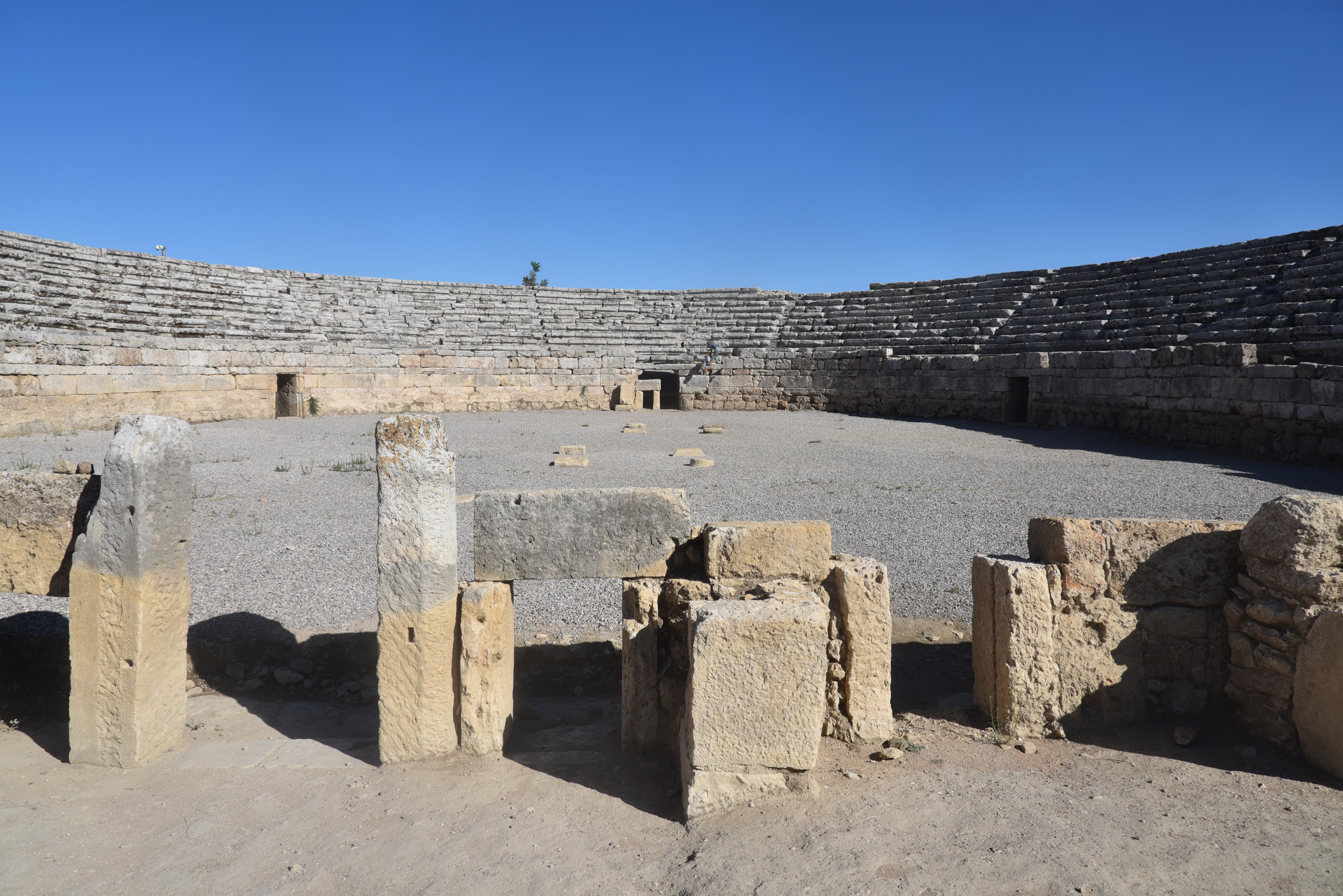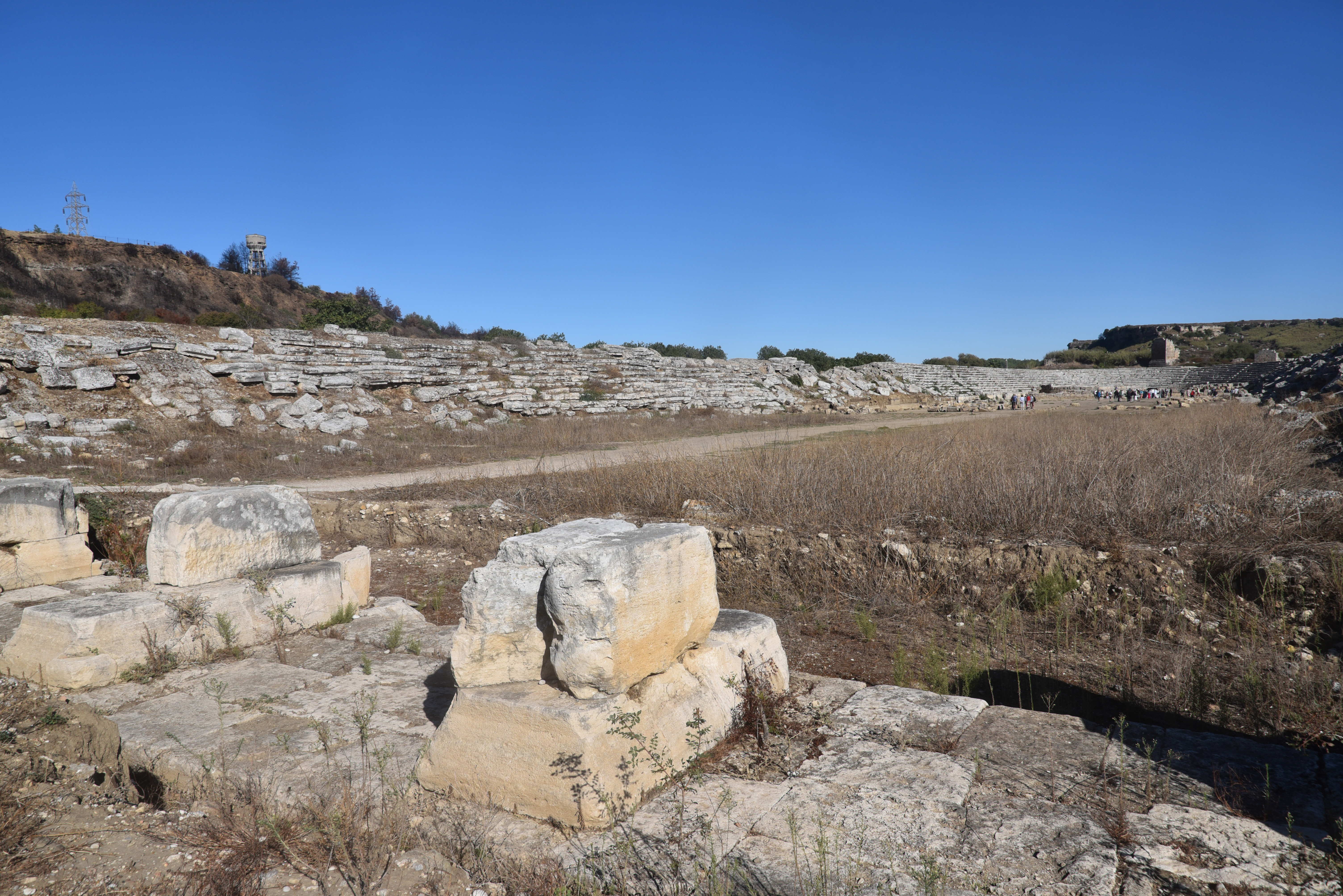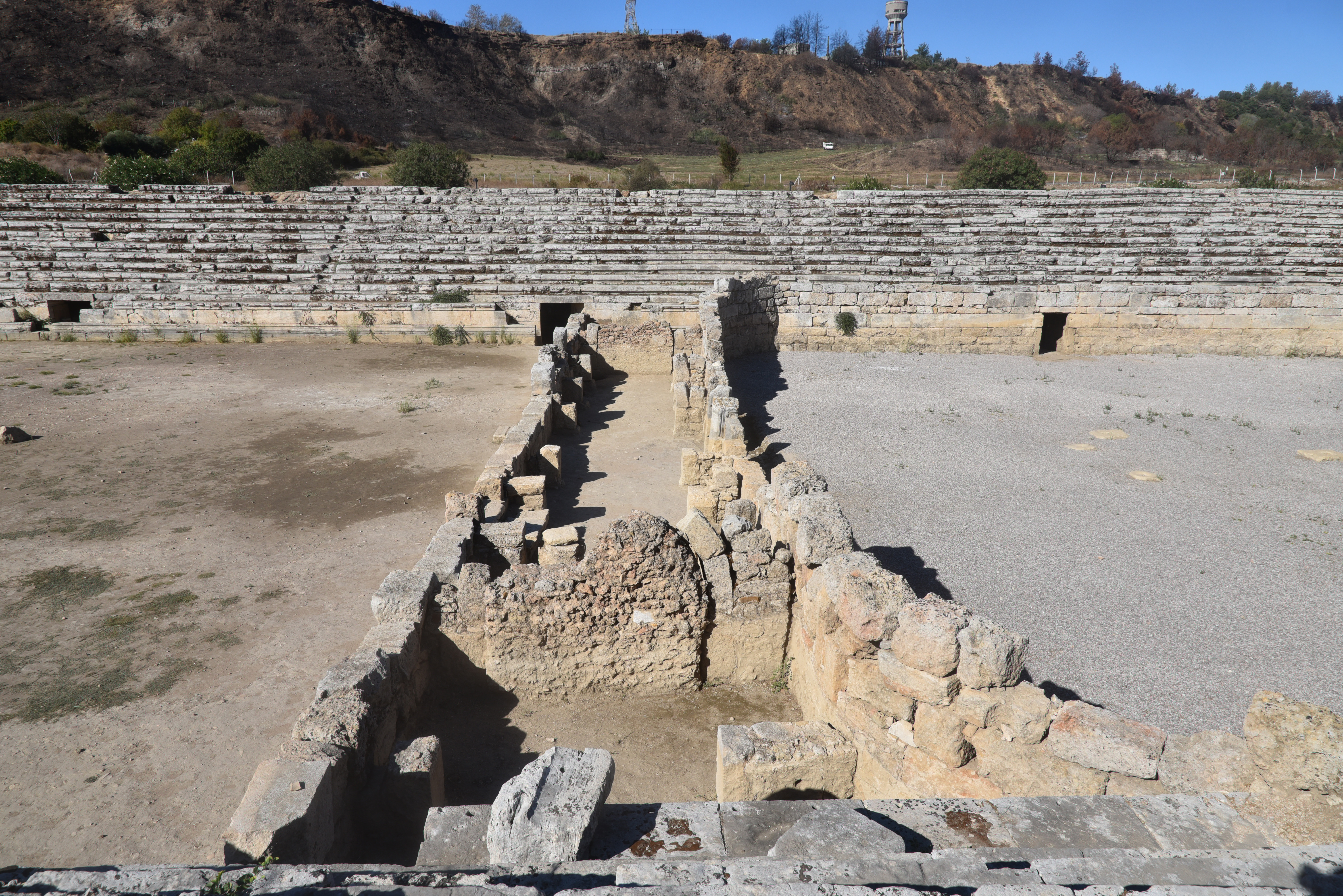 View of the Theatre, located outside the city walls on the western side, was closed to the public in October 2025. Probably built around 120 AD, could accommodate approximately 15,000 spectators.The Stadium. Built in the second half of the 1st century AD, it could accommodate 12,000 spectators.The stadium of Perge is one of the best-preserved ancient stadiums in Asia Minor. Constructed in the latter part of the 1st century AD, it measures 234 meters in length and contains twelve rows of seating.The northern end of the Stadium where bloody gladiator fights took place.The Stadium.The Stadium features barrel-vaulted construction with 30 vaults on the longer side and 9 on the northern end.View of the South Baths from the top of the Stadium.View of the fortification walls and towers from the top of the Stadium.View of the fortification towers and the South Baths from the top of the Stadium.The Southern Basilica has three naves and a narthex, dating to the 6th century AD.
