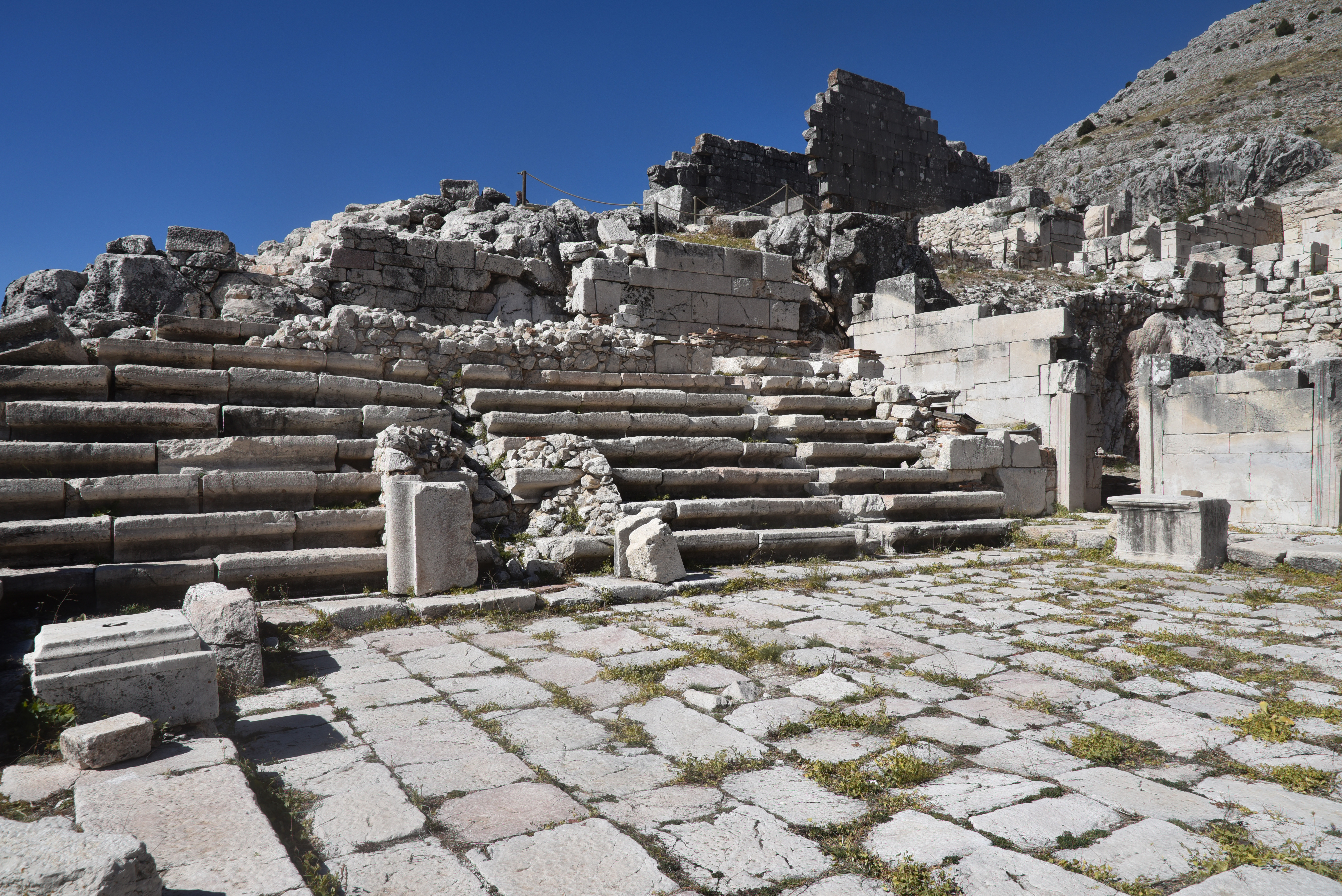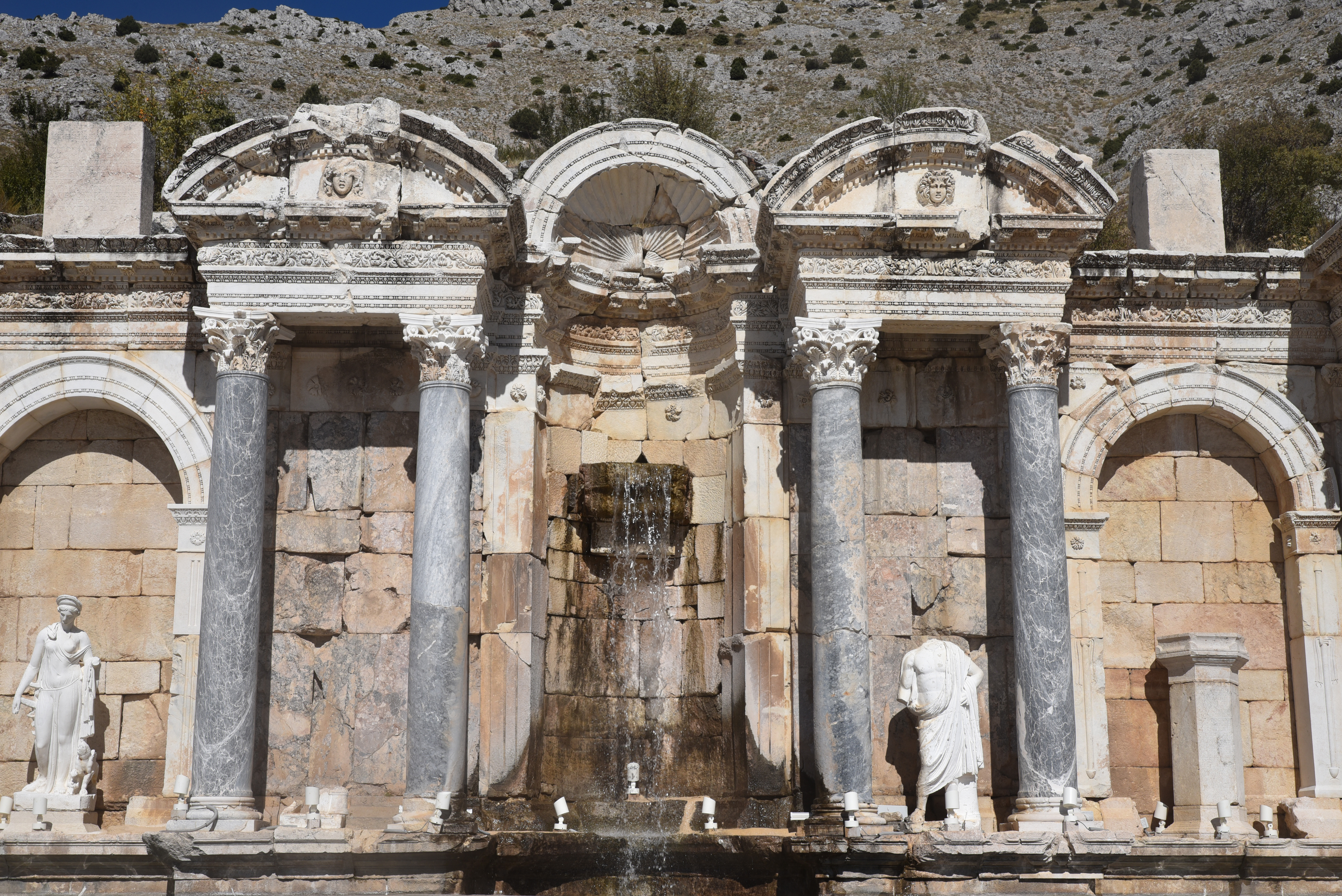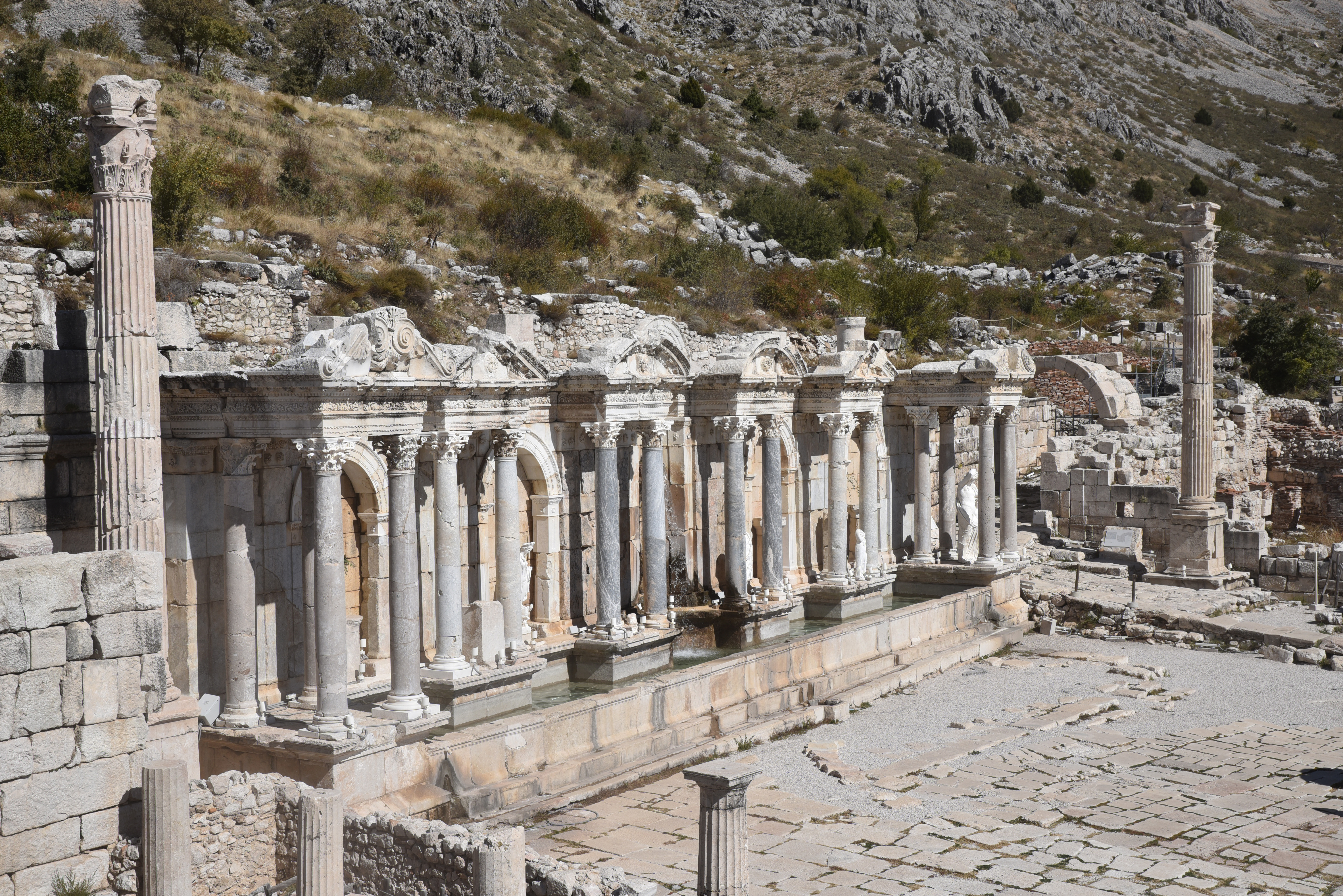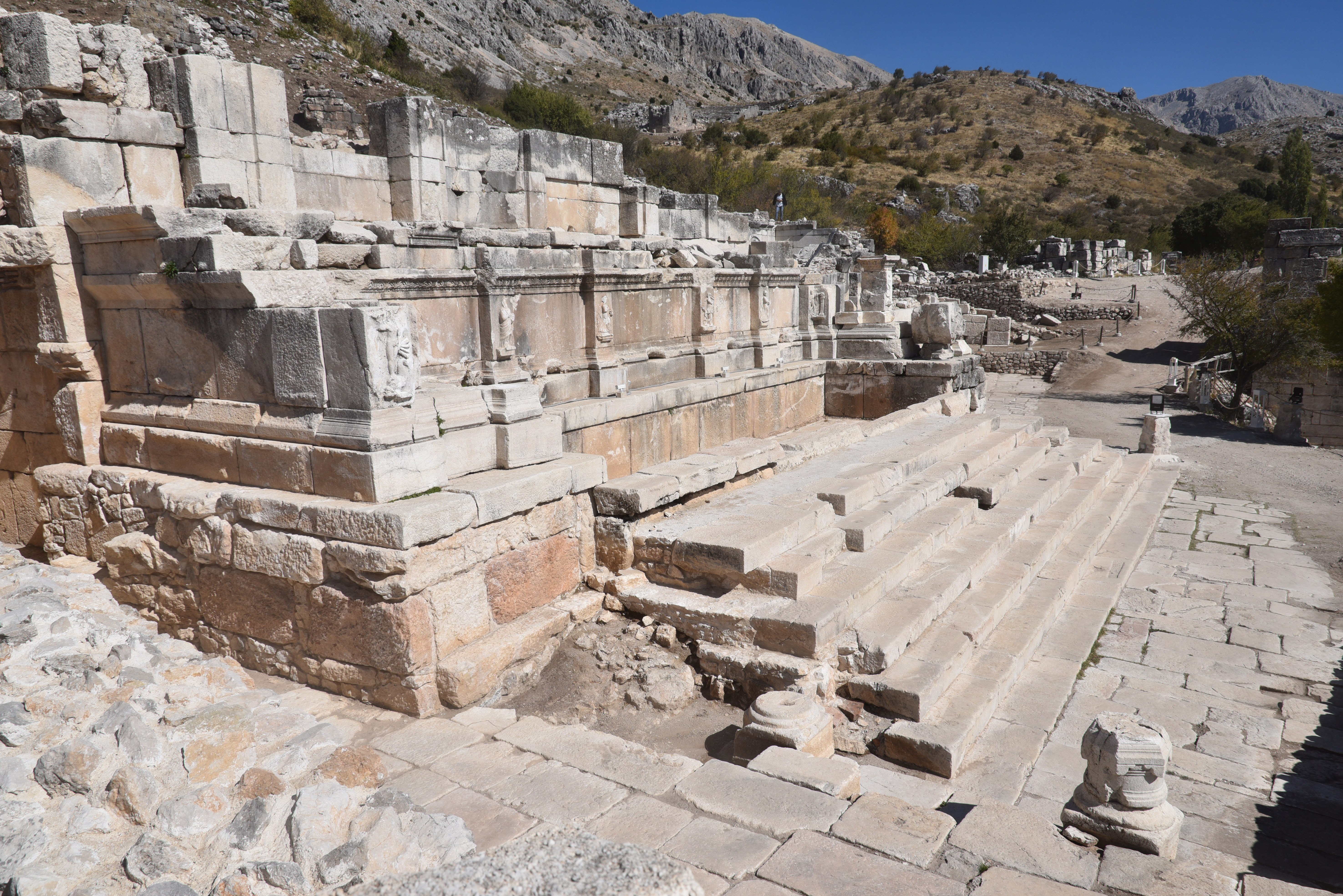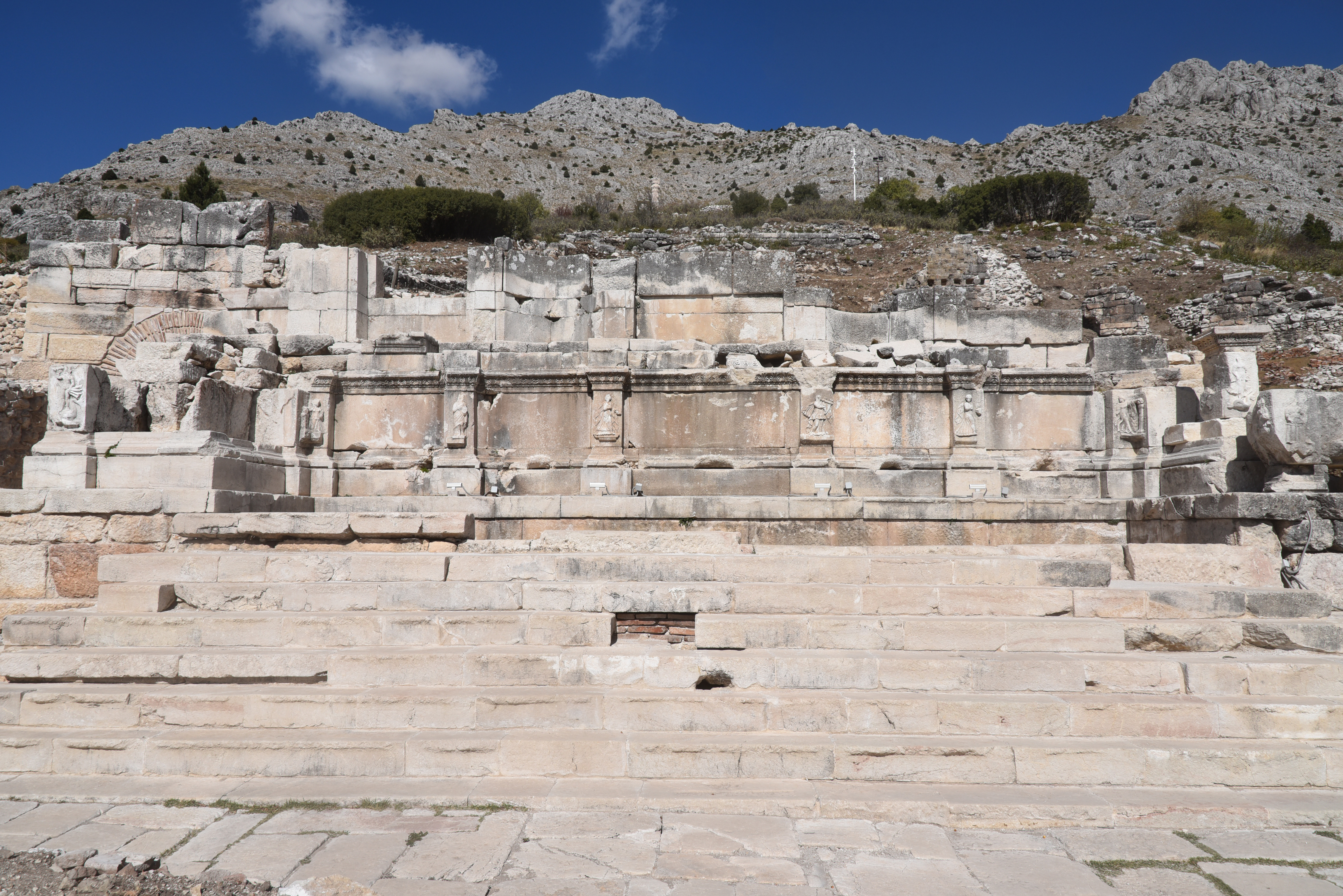 The Roman Theatre, built at an altitude of 1574 metres on a sloping plane between AD 120 and 200 over the remains of a smaller predecessor.The seating area (cavea) of the Roman theatre is divided into wedges (cunei). Above the first part of the cavea, the “belt” (diazoma) is clearly visible, and above it, a second seating area.The walkway (diazoma) that runs around the length of the cavea. The wall and its openings lead to a vaulted pedestrian passageway.The stage area (skene) of the Roman theatre was designed to be one story high, providing the audience with an exceptional view of the scenery, dominated by Alexander’s Hill.Largely built on a natural slope, the south-western part of the cavea rests on radially situated vaulted rooms, with the main entrance in one of them.The Roman theatre with the Upper Agora in the background.The Late Hellenistic fountain house, built during the 1st century BC as a U-shaped portico.View of the Upper Agora from the Roman Theatre.View of the Upper Agora from the northeast. The Upper Agora was a trapezoidal square covering approximately 2,380 m², featuring honorific columns and statue pedestals.The Upper Agora with the Antonine Nymphaeum along its northern edge.The Upper Agora, looking north.The Upper Agora looking west towards the early Imperial bouleuterion.The Antonine Nymphaeum is one of the most remarkable monuments of the city. It is an elaborately decorated and single-storied fountain of aedicula type with projecting side wings, dating to the reign of Marcus Aurelius. It replaced an Augustan Doric stoa-like fountain.The Antonine Nymphaeum was elaborately decorated with Corinthian columns and sculptures, including two large groups of Dionysos and a satyr in the lateral aediculae (side wings). The façade is articulated with niches, columns, and entablatures.At the base of the Antonine Nymphaeum, there was a broad water basin that was continuously supplied by Sagalassos’s sophisticated aqueduct system.The nymphaeum was significantly renovated in the 6th century AD after an earthquake. It was transformed into a dynastic monument for the family of its original builders, with added Christian elements in its design.The Upper Agora, looking east towards the Roman Theatre.The Prytaneion in the southwest corner of the Upper Agora, a significant public building built during the reign of Claudius (AD 41-54) that served as the office for city magistrates.The early Imperial Bouleuterion, the meeting place for the city council, where civic decisions and administrative matters were discussed and resolved.The Bouleuterion featured a U-shaped seating arrangement that accommodated approximately 220 council members.The Upper Agora with the early Imperial Bouleuterion in the foreground.The Upper Agora, looking southeast.The eastern side of the Upper Agora with a semi-circular seating bench (exedra) dated to the 1st half of the 1st century AD.The southeast access to the Upper Agora with the southeast honorific arch, dedicated to Claudius in AD 43–46, and the adjoining southeast honorific column.The southeast access to the Upper Agora with the southeast honorific arch, dedicated to Claudius in AD 43–46, the adjoining southeast honorific column and the arch erected by Kallikles for Caligula in the background.View from the north of the central courtyard and tholos-shaped water basin of the Macellum (food market), financed by the city.The Macellum featured a central courtyard paved with stone and a tholos-shaped fountain built in the middle. The surrounding porticoes were funded by a high priest of the emperor cult during the reign of Commodus (AD 182–192) to commemorate an imperial victory.The Macellum operated as a food market until the second half of the 6th century, although parts of it were later used for waste disposal and craft activities, such as antler and bone working. In the early 6th century, the north portico of the macellum was rebuilt, and the market continued to function until the early 7th century AD.The southeast access to the Upper Agora.The Northwest Heroon, built during the reign of Augustus and believed to have honoured a young aristocrat.The Northwest Heroon.Based on its decoration, the Northwest Heroon may have been associated with the introduction of the Dionysus cult or the initiation of a Dionysiac festival in the city.The Northern Necropolis with arched recesses carved into the rock (arcosolia) dated to the 1st and 2nd centuries AD.The Urban Mansion, an expansive and luxurious urban palace built around AD 400. It consisted of more than 90 spaces spread across nine different levels, divided into public and private wings.The Urban Mansion featured palatial elements such as mosaic floors, wall paintings, and statuary, showcasing the wealth and social status of its owner, likely a member of the emerging super-elite composed of “principals,” “honorati,” and bishops.The Roman Odeon, constructed during the early Imperial period. It could accommodate around 2,500 people.The two-storey late Hadrianic Nymphaeum, a monumental fountain built during the reign of Hadrian and completed by his successor, Antoninus Pius.Hadrianic Nymphaeum was located on a plaza above and behind the Lower Agora. It featured a straight rear wall with two superposed rows of nine niches each and was adorned with a two-storey columnar screen of isolated columns, creating a grand and elaborate architectural display.During the Severan dynasty, the undecorated upper structure of the nymphaeum was replaced with an elaborately decorated entablature featuring small Victories, likely commemorating the Parthian victories of the Severan emperors.The Odeon and the Hadrianic Nymphaeum.