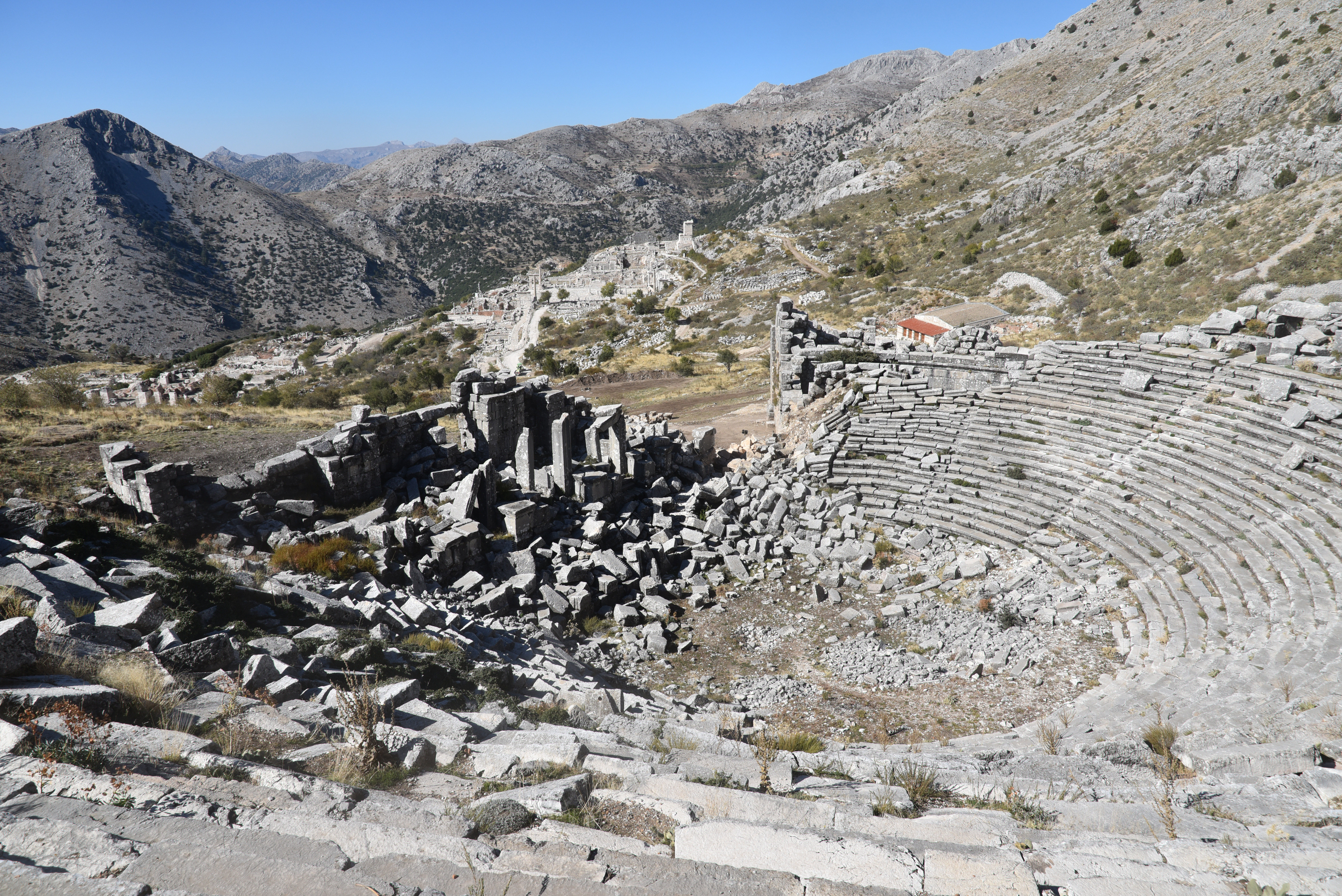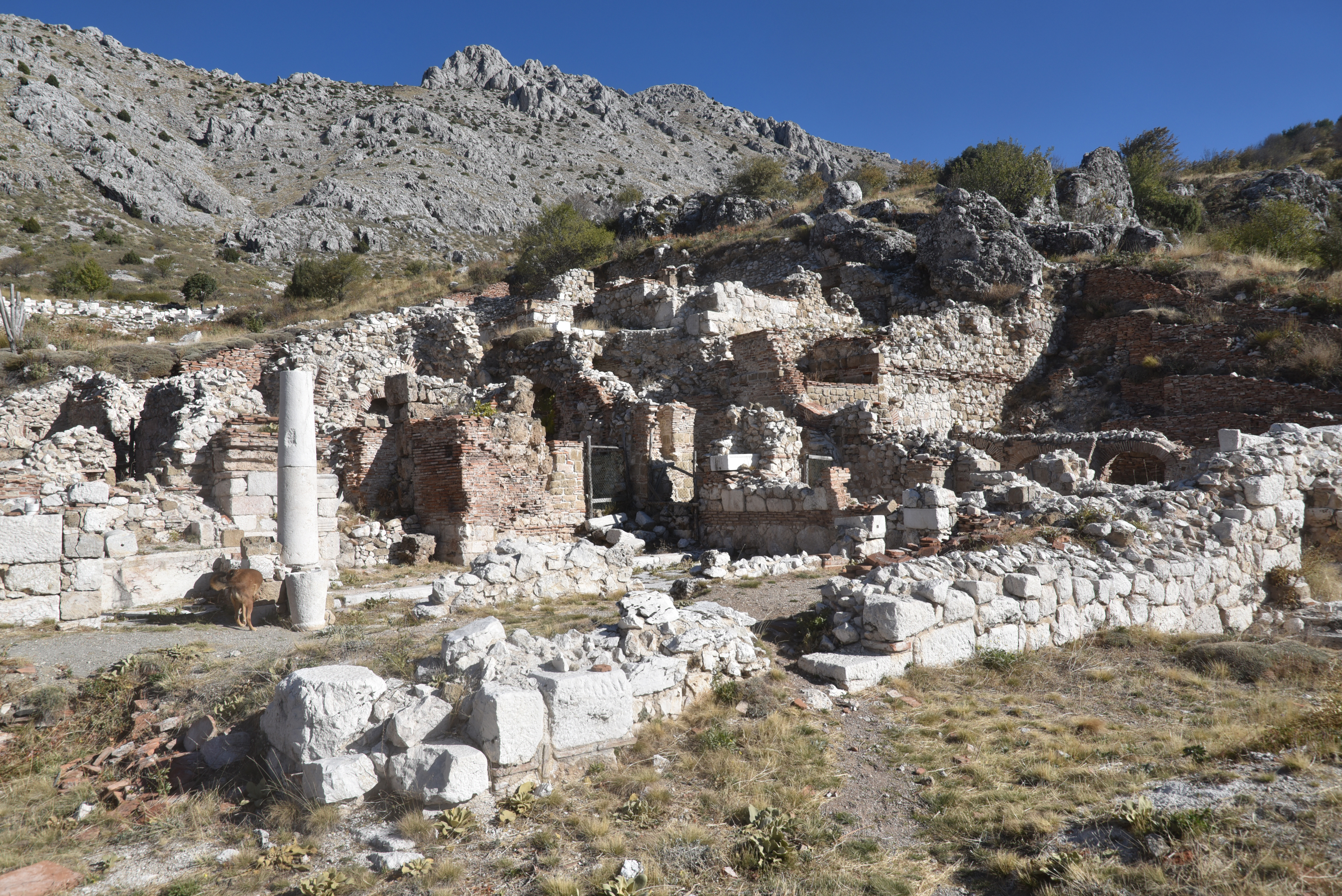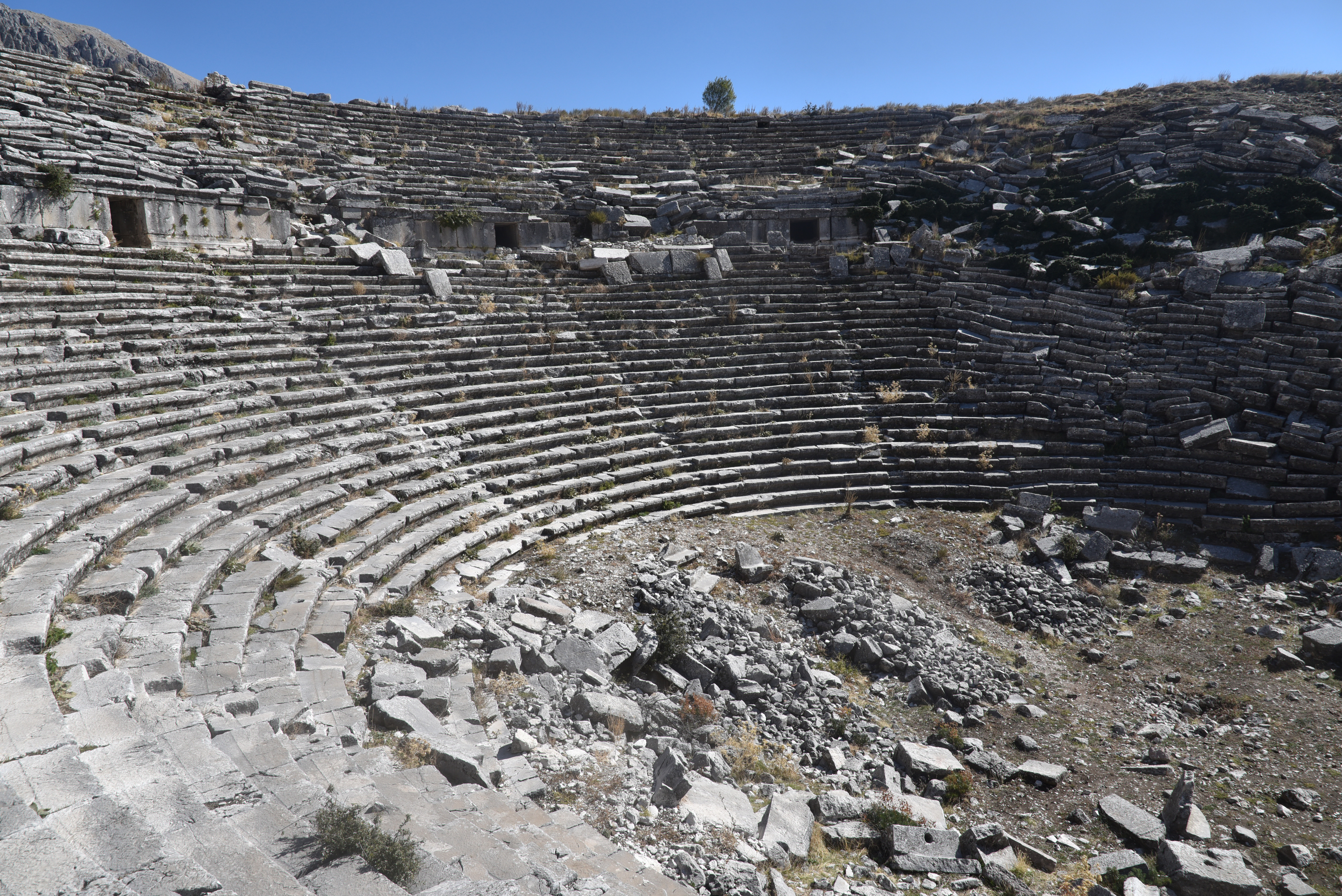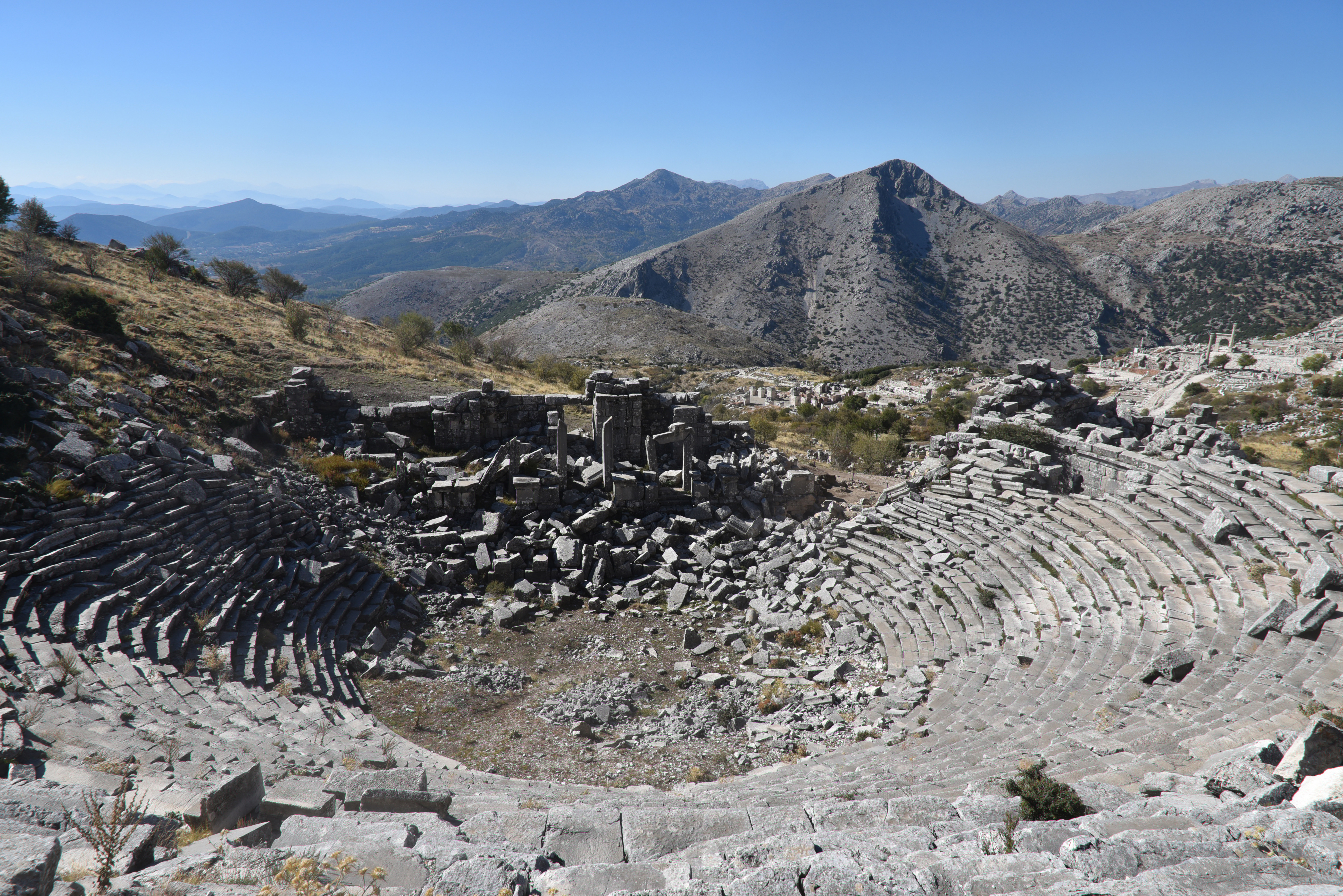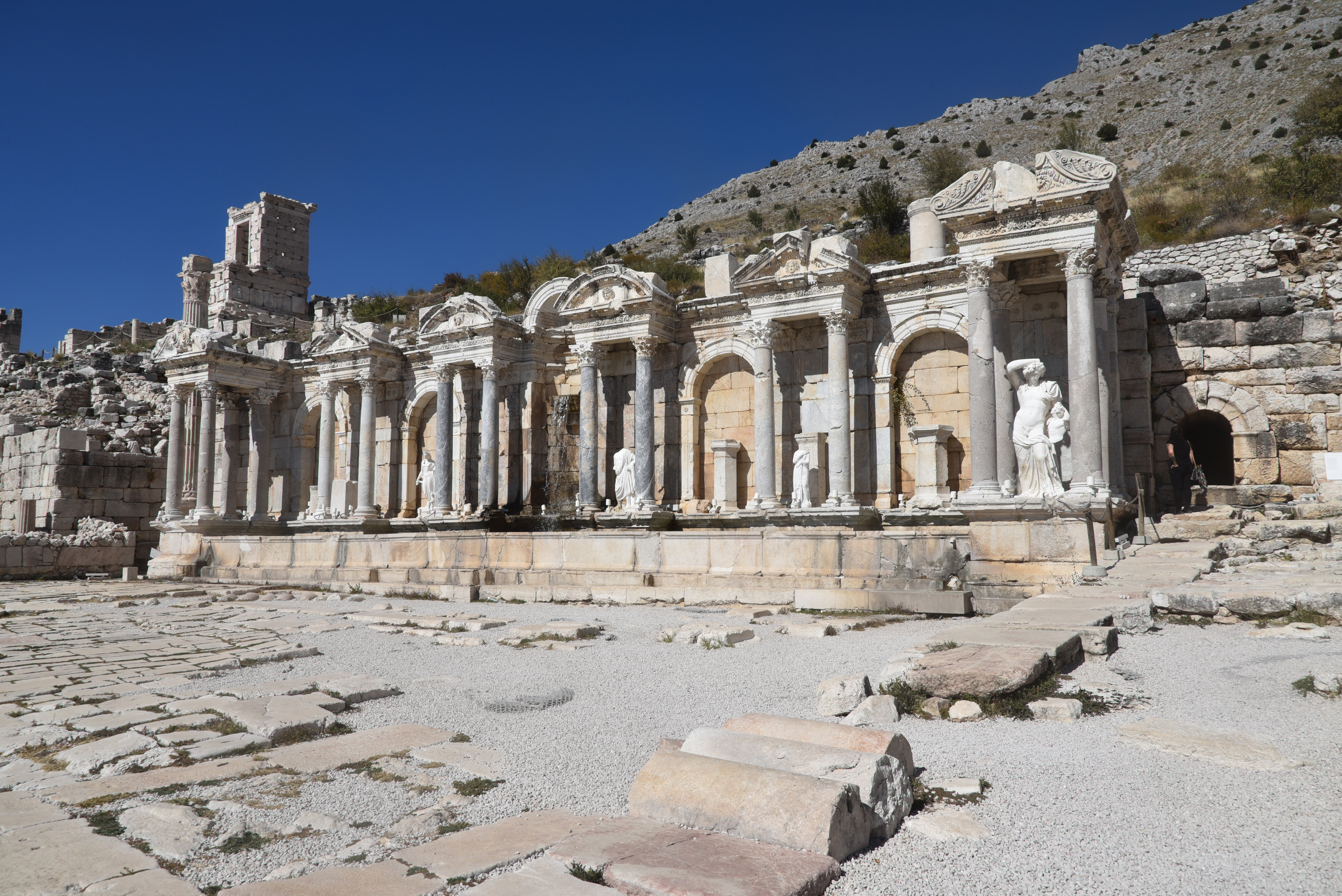 The Roman Theatre, built at an altitude of 1574 metres on a sloping plane between AD 120 and 200 over the remains of a smaller predecessor.The seating area (cavea) of the Roman theatre is divided into wedges (cunei). Above the first part of the cavea, the “belt” (diazoma) is clearly visible, and above it, a second seating area.The walkway (diazoma) that runs around the length of the cavea. The wall and its openings lead to a vaulted pedestrian passageway.The stage area (skene) of the Roman theatre was designed to be one story high, providing the audience with an exceptional view of the scenery, dominated by Alexander’s Hill.Largely built on a natural slope, the south-western part of the cavea rests on radially situated vaulted rooms, with the main entrance in one of them.The Roman theatre with the Upper Agora in the background.The Late Hellenistic fountain house, built during the 1st century BC as a U-shaped portico.View of the Upper Agora from the Roman Theatre.View of the Upper Agora from the northeast. The Upper Agora was a trapezoidal square covering approximately 2,380 m², featuring honorific columns and statue pedestals.The Upper Agora with the Antonine Nymphaeum along its northern edge.The Upper Agora, looking north.The Upper Agora looking west towards the early Imperial bouleuterion.The Antonine Nymphaeum is one of the most remarkable monuments of the city. It is an elaborately decorated and single-storied fountain of aedicula type with projecting side wings, dating to the reign of Marcus Aurelius. It replaced an Augustan Doric stoa-like fountain.The Antonine Nymphaeum was elaborately decorated with Corinthian columns and sculptures, including two large groups of Dionysos and a satyr in the lateral aediculae (side wings). The façade is articulated with niches, columns, and entablatures.At the base of the Antonine Nymphaeum, there was a broad water basin that was continuously supplied by Sagalassos’s sophisticated aqueduct system.The nymphaeum was significantly renovated in the 6th century AD after an earthquake. It was transformed into a dynastic monument for the family of its original builders, with added Christian elements in its design.The Upper Agora, looking east towards the Roman Theatre.The Prytaneion in the southwest corner of the Upper Agora, a significant public building built during the reign of Claudius (AD 41-54) that served as the office for city magistrates.The early Imperial Bouleuterion, the meeting place for the city council, where civic decisions and administrative matters were discussed and resolved.The Bouleuterion featured a U-shaped seating arrangement that accommodated approximately 220 council members.The Upper Agora with the early Imperial Bouleuterion in the foreground.The Upper Agora, looking southeast.The eastern side of the Upper Agora with a semi-circular seating bench (exedra) dated to the 1st half of the 1st century AD.The southeast access to the Upper Agora with the southeast honorific arch, dedicated to Claudius in AD 43–46, and the adjoining southeast honorific column.The southeast access to the Upper Agora with the southeast honorific arch, dedicated to Claudius in AD 43–46, the adjoining southeast honorific column and the arch erected by Kallikles for Caligula in the background.View from the north of the central courtyard and tholos-shaped water basin of the Macellum (food market), financed by the city.The Macellum featured a central courtyard paved with stone and a tholos-shaped fountain built in the middle. The surrounding porticoes were funded by a high priest of the emperor cult during the reign of Commodus (AD 182–192) to commemorate an imperial victory.The Macellum operated as a food market until the second half of the 6th century, although parts of it were later used for waste disposal and craft activities, such as antler and bone working. In the early 6th century, the north portico of the macellum was rebuilt, and the market continued to function until the early 7th century AD.The southeast access to the Upper Agora.The Northwest Heroon, built during the reign of Augustus and believed to have honoured a young aristocrat.The Northwest Heroon.Based on its decoration, the Northwest Heroon may have been associated with the introduction of the Dionysus cult or the initiation of a Dionysiac festival in the city.The Northern Necropolis with arched recesses carved into the rock (arcosolia) dated to the 1st and 2nd centuries AD.The Urban Mansion, an expansive and luxurious urban palace built around AD 400. It consisted of more than 90 spaces spread across nine different levels, divided into public and private wings.The Urban Mansion featured palatial elements such as mosaic floors, wall paintings, and statuary, showcasing the wealth and social status of its owner, likely a member of the emerging super-elite composed of “principals,” “honorati,” and bishops.The Roman Odeon, constructed during the early Imperial period. It could accommodate around 2,500 people.The two-storey late Hadrianic Nymphaeum, a monumental fountain built during the reign of Hadrian and completed by his successor, Antoninus Pius.Hadrianic Nymphaeum was located on a plaza above and behind the Lower Agora. It featured a straight rear wall with two superposed rows of nine niches each and was adorned with a two-storey columnar screen of isolated columns, creating a grand and elaborate architectural display.During the Severan dynasty, the undecorated upper structure of the nymphaeum was replaced with an elaborately decorated entablature featuring small Victories, likely commemorating the Parthian victories of the Severan emperors.The Odeon and the Hadrianic Nymphaeum.