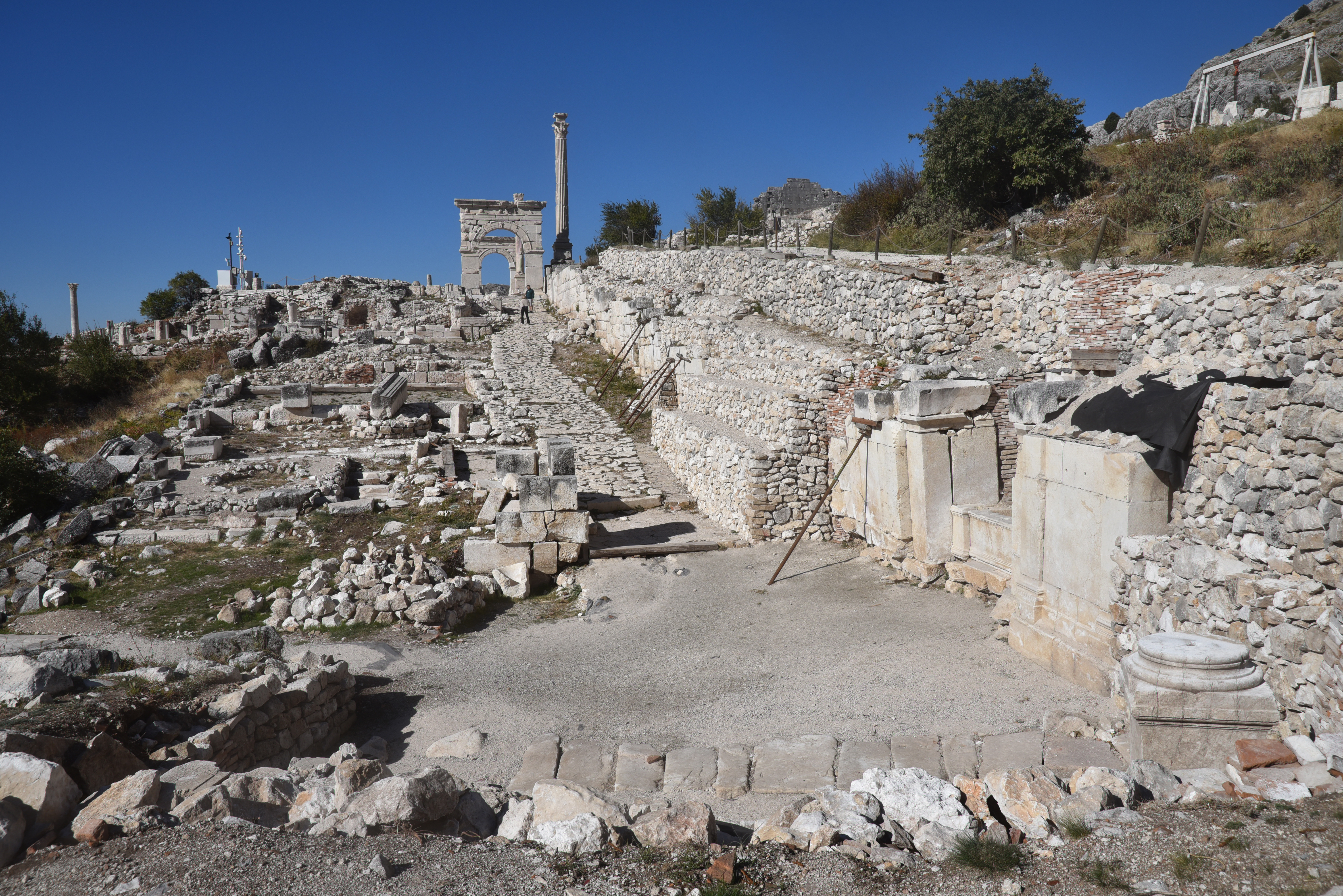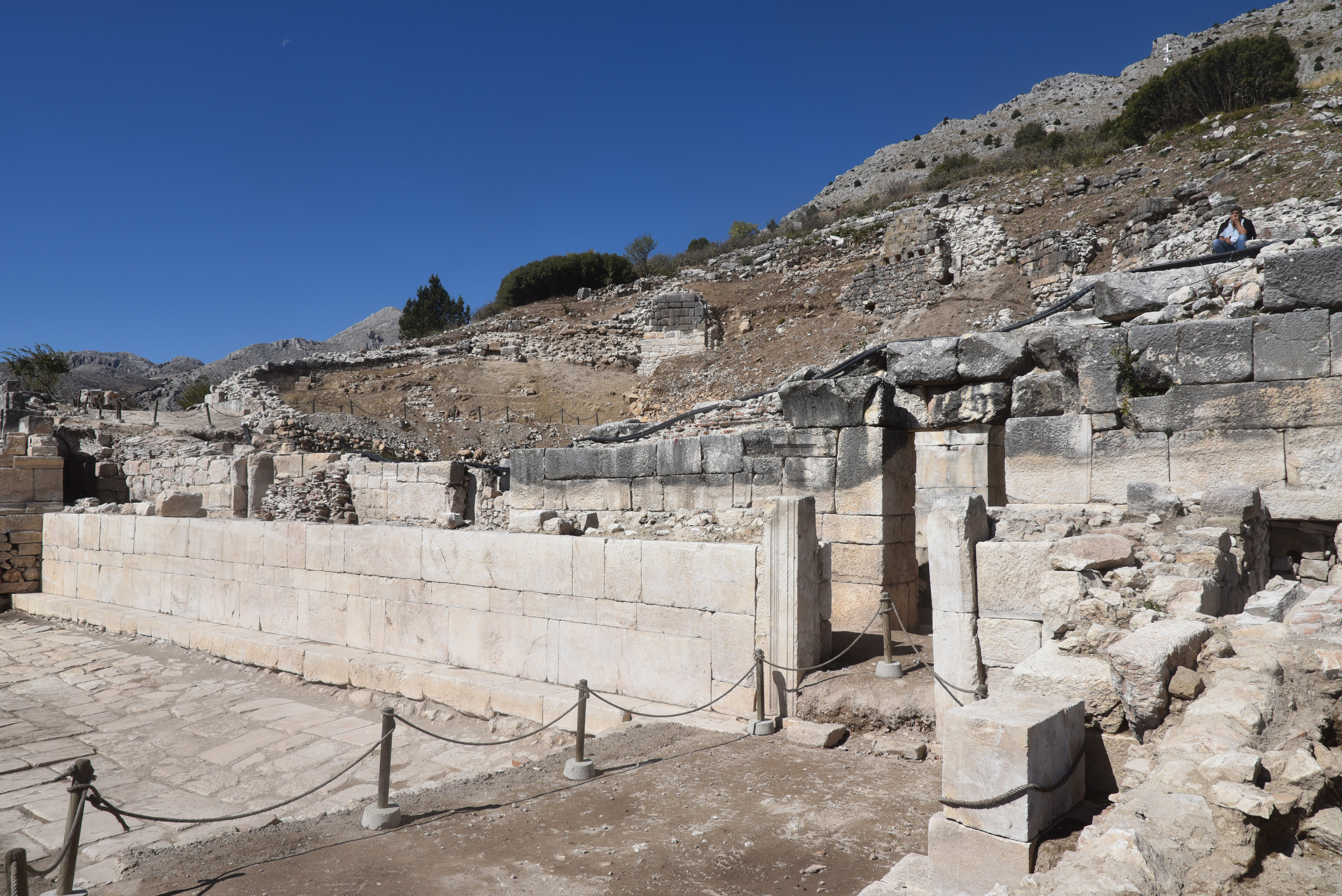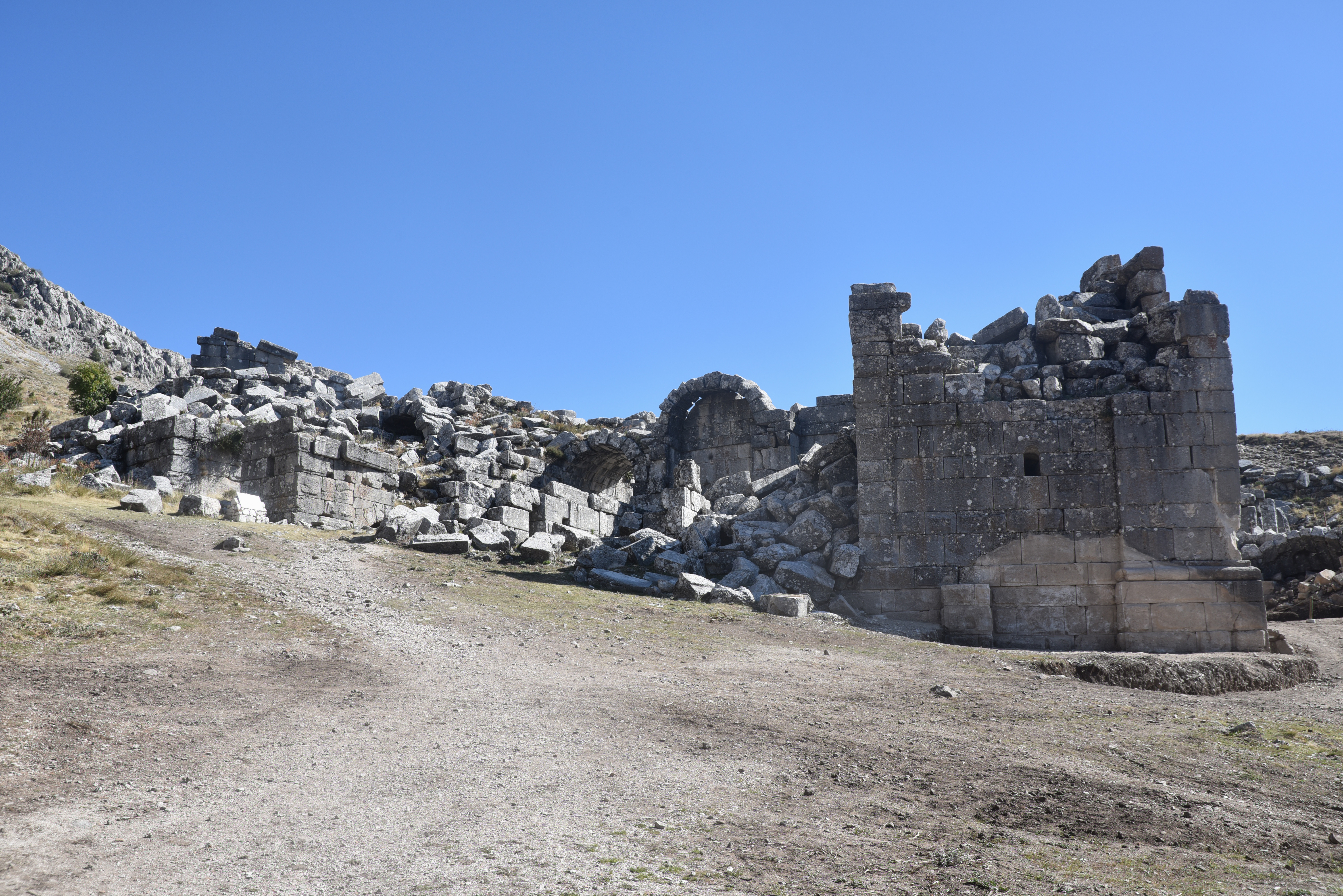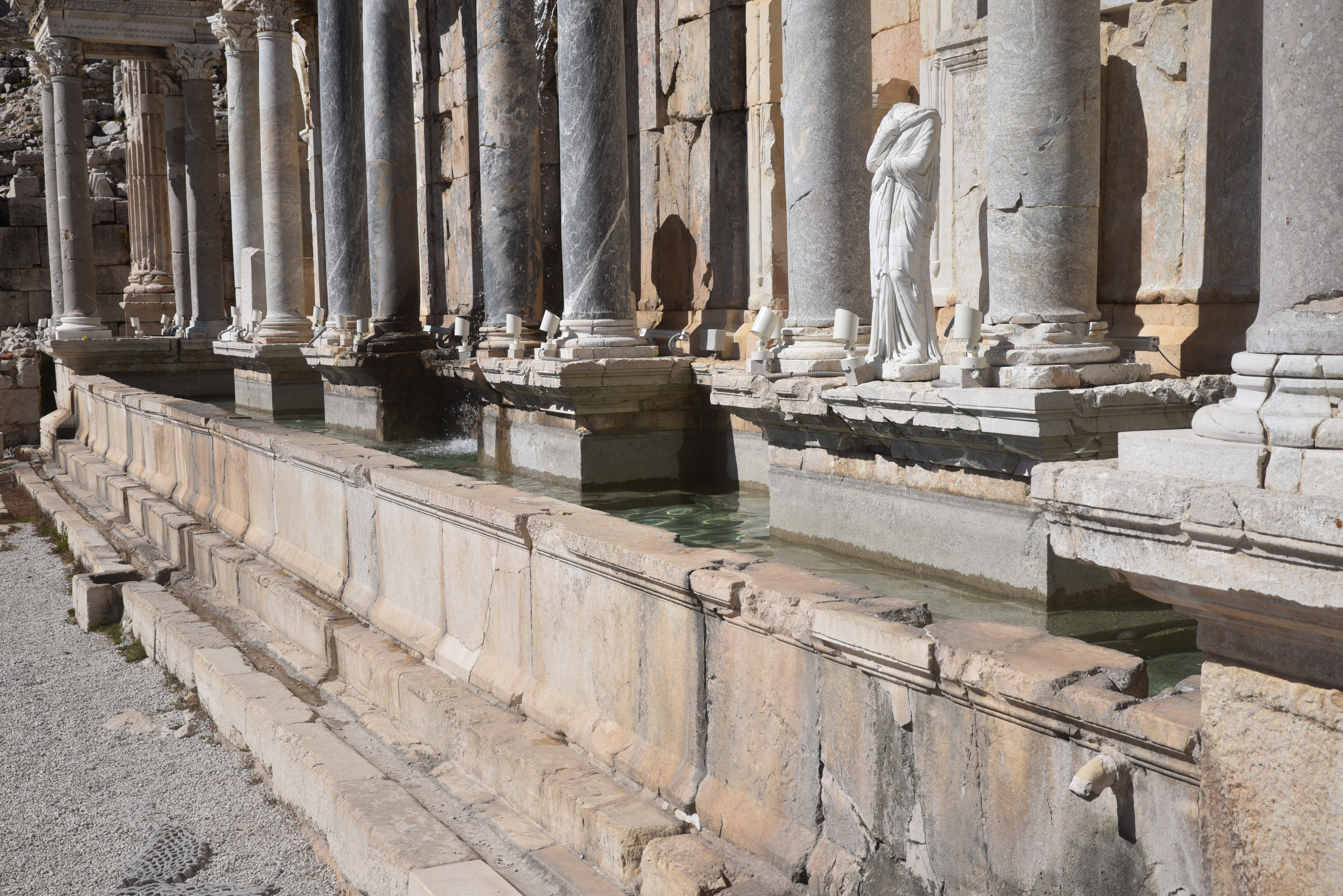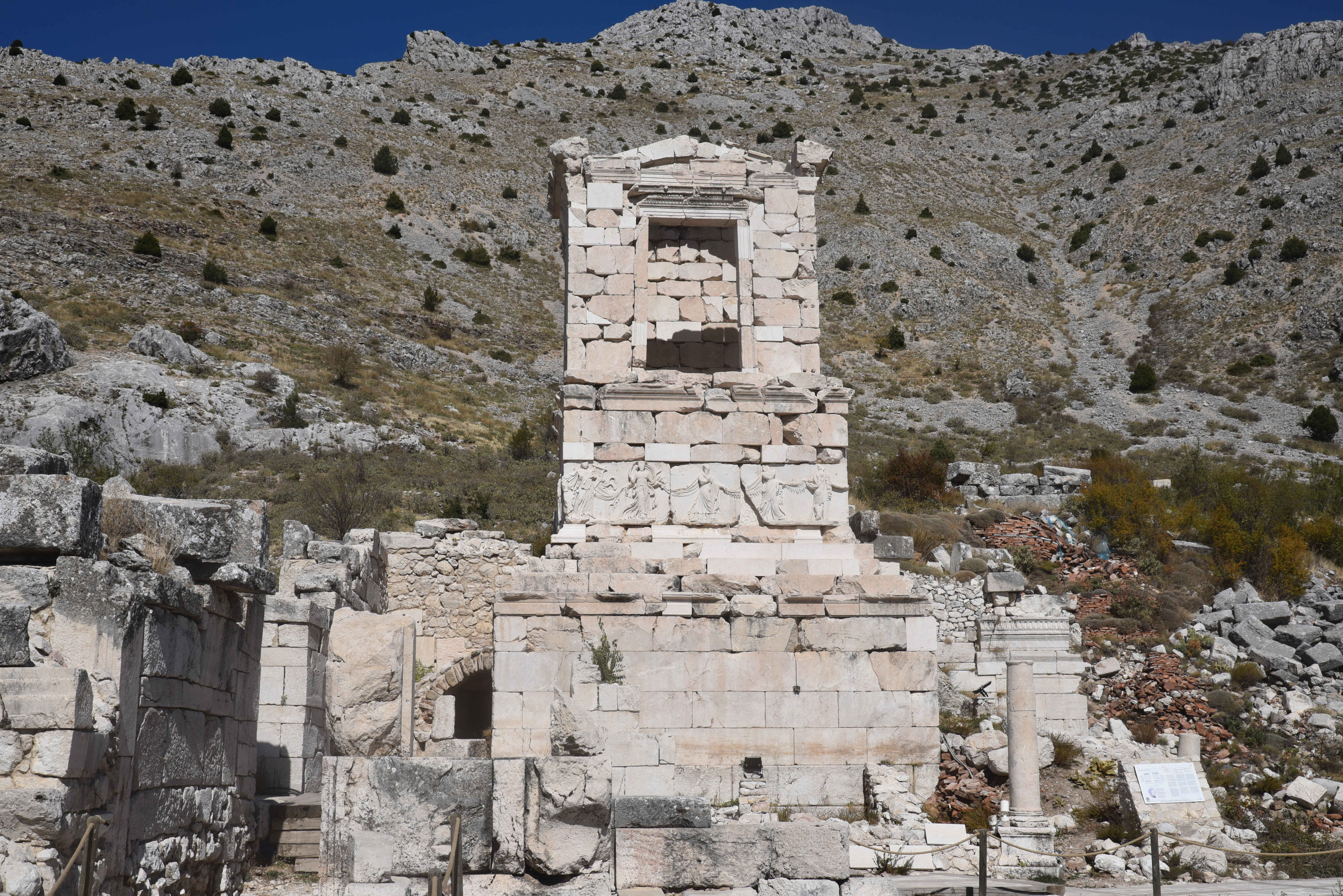 The Roman Theatre, built at an altitude of 1574 metres on a sloping plane between AD 120 and 200 over the remains of a smaller predecessor.The seating area (cavea) of the Roman theatre is divided into wedges (cunei). Above the first part of the cavea, the “belt” (diazoma) is clearly visible, and above it, a second seating area.The walkway (diazoma) that runs around the length of the cavea. The wall and its openings lead to a vaulted pedestrian passageway.The stage area (skene) of the Roman theatre was designed to be one story high, providing the audience with an exceptional view of the scenery, dominated by Alexander’s Hill.Largely built on a natural slope, the south-western part of the cavea rests on radially situated vaulted rooms, with the main entrance in one of them.The Roman theatre with the Upper Agora in the background.The Late Hellenistic fountain house, built during the 1st century BC as a U-shaped portico.View of the Upper Agora from the Roman Theatre.View of the Upper Agora from the northeast. The Upper Agora was a trapezoidal square covering approximately 2,380 m², featuring honorific columns and statue pedestals.The Upper Agora with the Antonine Nymphaeum along its northern edge.The Upper Agora, looking north.The Upper Agora looking west towards the early Imperial bouleuterion.The Antonine Nymphaeum is one of the most remarkable monuments of the city. It is an elaborately decorated and single-storied fountain of aedicula type with projecting side wings, dating to the reign of Marcus Aurelius. It replaced an Augustan Doric stoa-like fountain.The Antonine Nymphaeum was elaborately decorated with Corinthian columns and sculptures, including two large groups of Dionysos and a satyr in the lateral aediculae (side wings). The façade is articulated with niches, columns, and entablatures.At the base of the Antonine Nymphaeum, there was a broad water basin that was continuously supplied by Sagalassos’s sophisticated aqueduct system.The nymphaeum was significantly renovated in the 6th century AD after an earthquake. It was transformed into a dynastic monument for the family of its original builders, with added Christian elements in its design.The Upper Agora, looking east towards the Roman Theatre.The Prytaneion in the southwest corner of the Upper Agora, a significant public building built during the reign of Claudius (AD 41-54) that served as the office for city magistrates.The early Imperial Bouleuterion, the meeting place for the city council, where civic decisions and administrative matters were discussed and resolved.The Bouleuterion featured a U-shaped seating arrangement that accommodated approximately 220 council members.The Upper Agora with the early Imperial Bouleuterion in the foreground.The Upper Agora, looking southeast.The eastern side of the Upper Agora with a semi-circular seating bench (exedra) dated to the 1st half of the 1st century AD.The southeast access to the Upper Agora with the southeast honorific arch, dedicated to Claudius in AD 43–46, and the adjoining southeast honorific column.The southeast access to the Upper Agora with the southeast honorific arch, dedicated to Claudius in AD 43–46, the adjoining southeast honorific column and the arch erected by Kallikles for Caligula in the background.View from the north of the central courtyard and tholos-shaped water basin of the Macellum (food market), financed by the city.The Macellum featured a central courtyard paved with stone and a tholos-shaped fountain built in the middle. The surrounding porticoes were funded by a high priest of the emperor cult during the reign of Commodus (AD 182–192) to commemorate an imperial victory.The Macellum operated as a food market until the second half of the 6th century, although parts of it were later used for waste disposal and craft activities, such as antler and bone working. In the early 6th century, the north portico of the macellum was rebuilt, and the market continued to function until the early 7th century AD.The southeast access to the Upper Agora.The Northwest Heroon, built during the reign of Augustus and believed to have honoured a young aristocrat.The Northwest Heroon.Based on its decoration, the Northwest Heroon may have been associated with the introduction of the Dionysus cult or the initiation of a Dionysiac festival in the city.The Northern Necropolis with arched recesses carved into the rock (arcosolia) dated to the 1st and 2nd centuries AD.The Urban Mansion, an expansive and luxurious urban palace built around AD 400. It consisted of more than 90 spaces spread across nine different levels, divided into public and private wings.The Urban Mansion featured palatial elements such as mosaic floors, wall paintings, and statuary, showcasing the wealth and social status of its owner, likely a member of the emerging super-elite composed of “principals,” “honorati,” and bishops.The Roman Odeon, constructed during the early Imperial period. It could accommodate around 2,500 people.The two-storey late Hadrianic Nymphaeum, a monumental fountain built during the reign of Hadrian and completed by his successor, Antoninus Pius.Hadrianic Nymphaeum was located on a plaza above and behind the Lower Agora. It featured a straight rear wall with two superposed rows of nine niches each and was adorned with a two-storey columnar screen of isolated columns, creating a grand and elaborate architectural display.During the Severan dynasty, the undecorated upper structure of the nymphaeum was replaced with an elaborately decorated entablature featuring small Victories, likely commemorating the Parthian victories of the Severan emperors.The Odeon and the Hadrianic Nymphaeum.