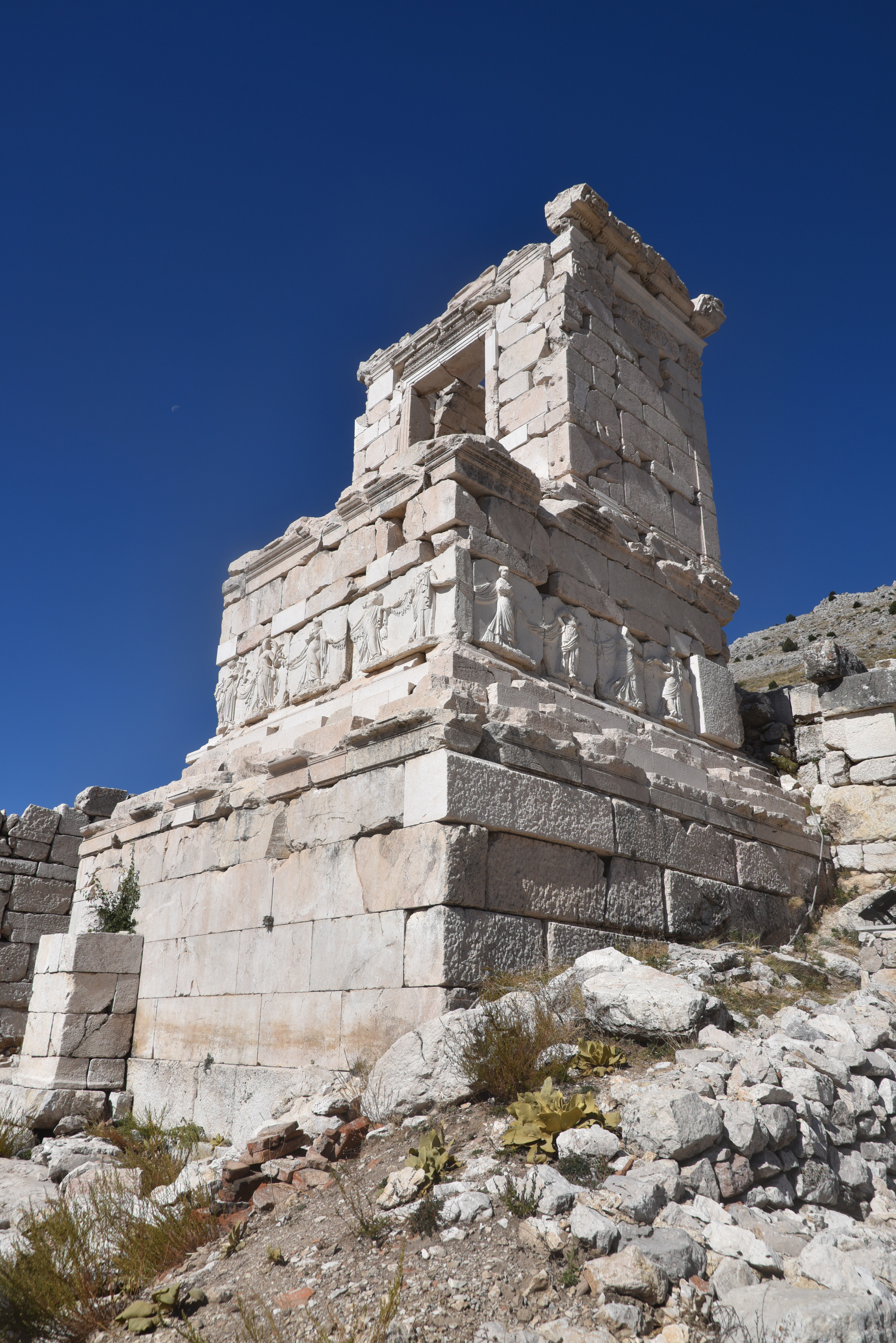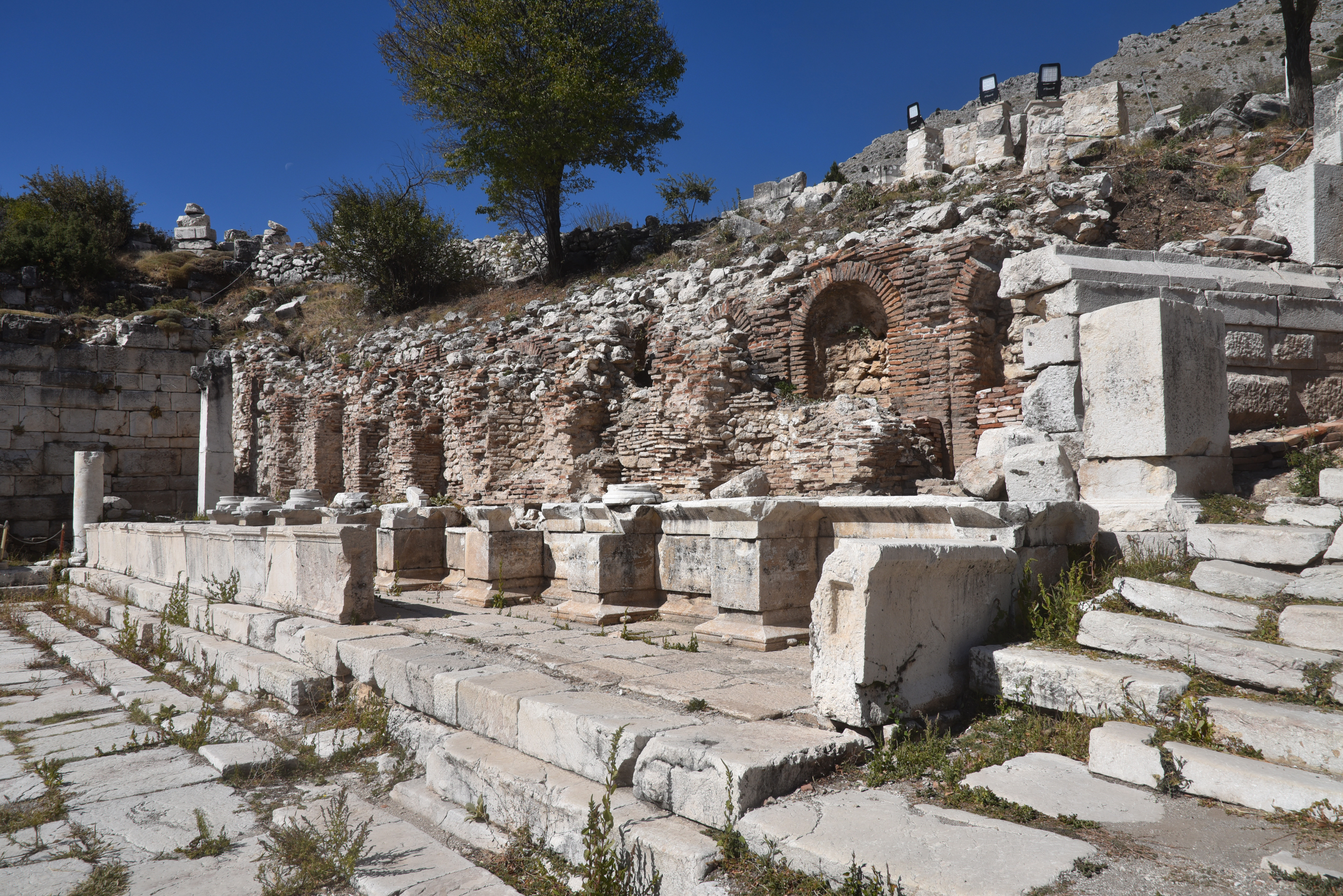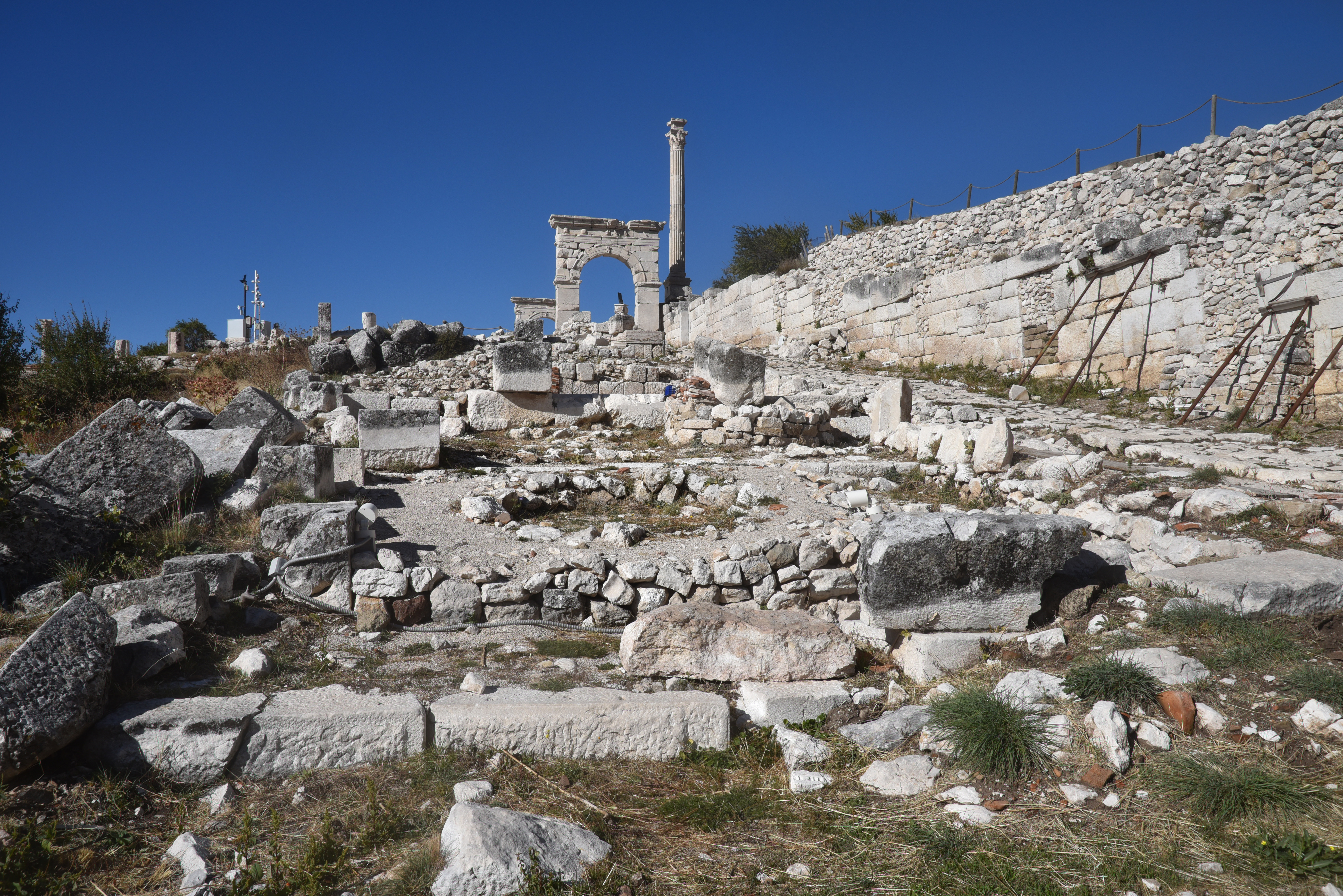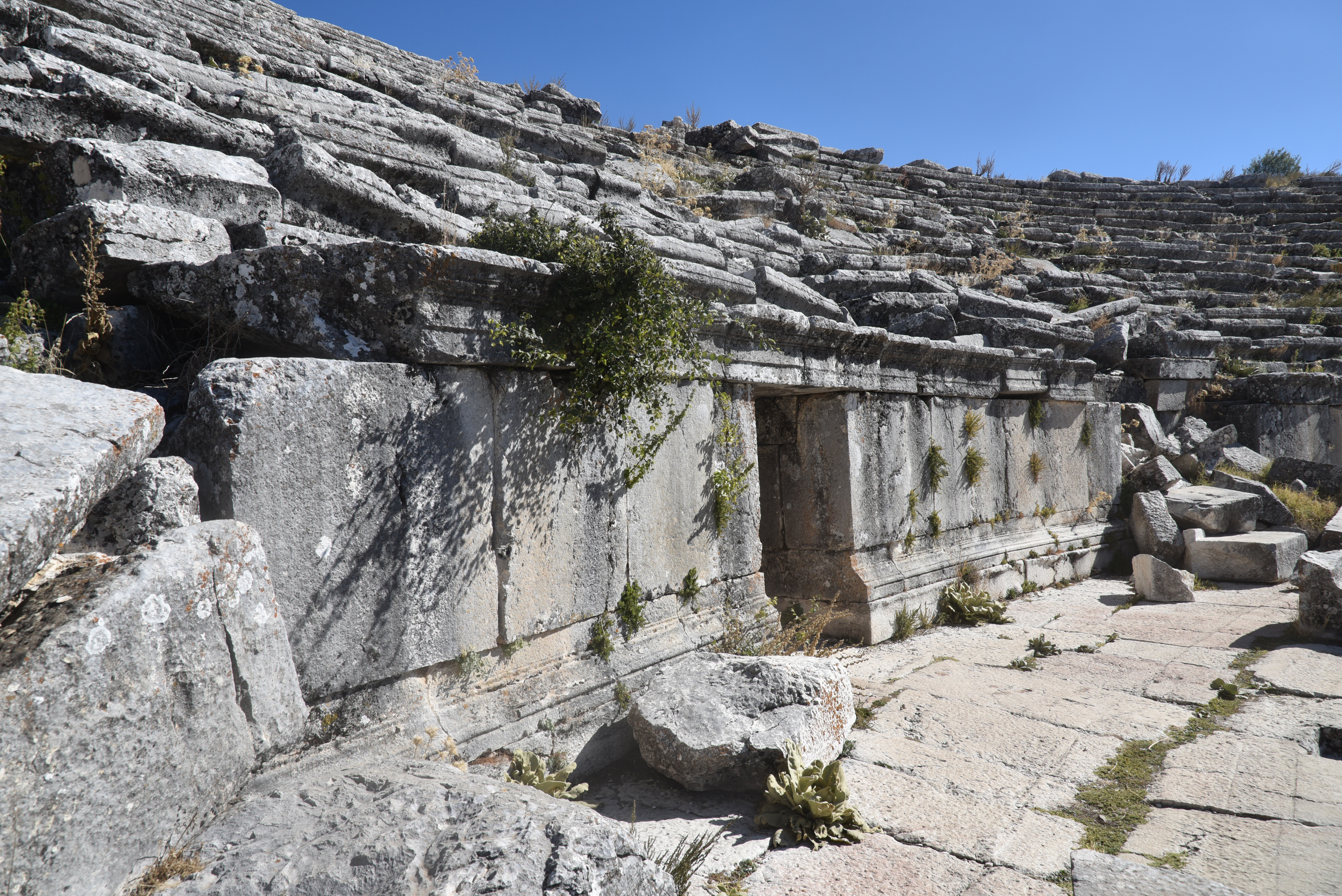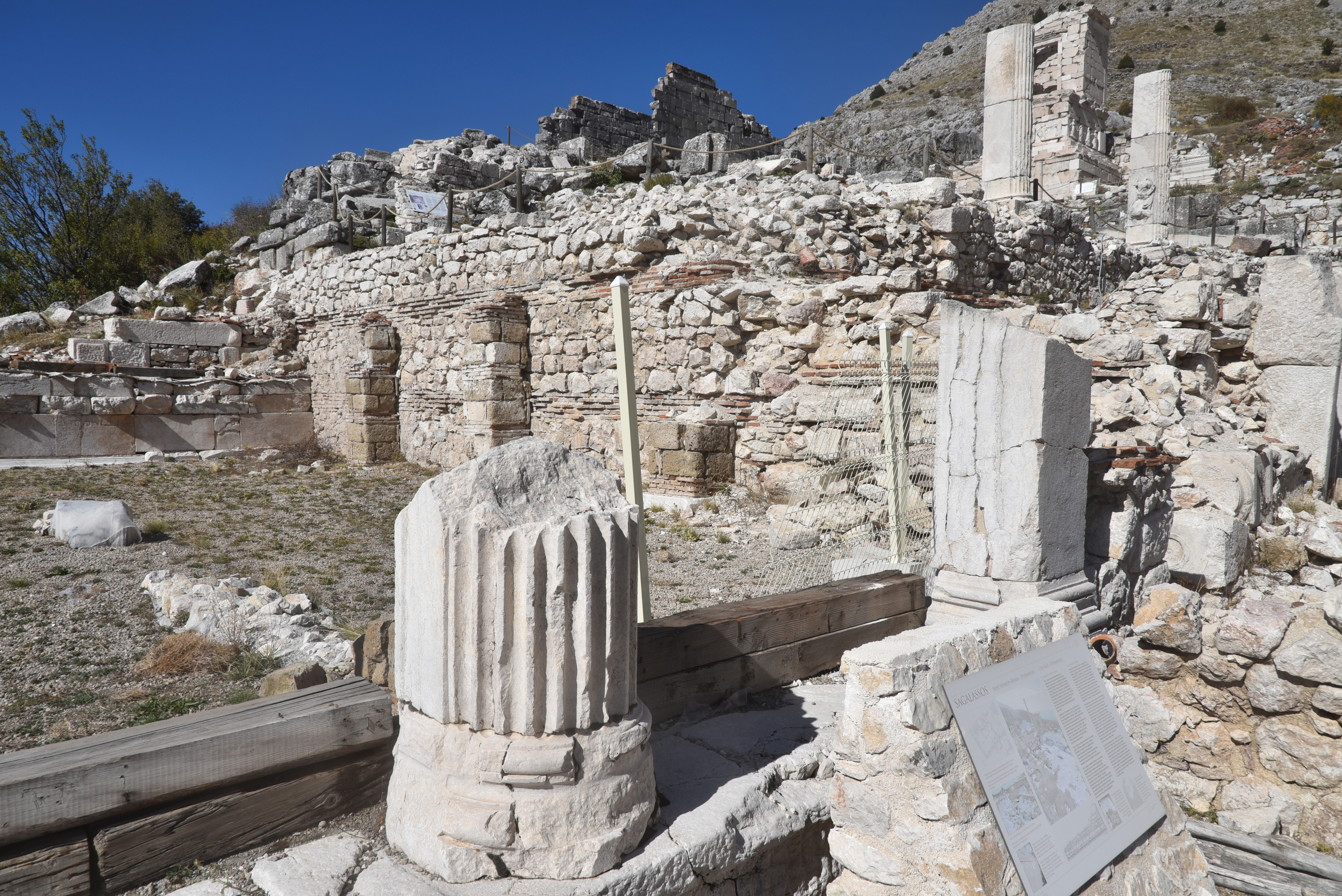 The Roman Theatre, built at an altitude of 1574 metres on a sloping plane between AD 120 and 200 over the remains of a smaller predecessor.The seating area (cavea) of the Roman theatre is divided into wedges (cunei). Above the first part of the cavea, the “belt” (diazoma) is clearly visible, and above it, a second seating area.The walkway (diazoma) that runs around the length of the cavea. The wall and its openings lead to a vaulted pedestrian passageway.The stage area (skene) of the Roman theatre was designed to be one story high, providing the audience with an exceptional view of the scenery, dominated by Alexander’s Hill.Largely built on a natural slope, the south-western part of the cavea rests on radially situated vaulted rooms, with the main entrance in one of them.The Roman theatre with the Upper Agora in the background.The Late Hellenistic fountain house, built during the 1st century BC as a U-shaped portico.View of the Upper Agora from the Roman Theatre.View of the Upper Agora from the northeast. The Upper Agora was a trapezoidal square covering approximately 2,380 m², featuring honorific columns and statue pedestals.The Upper Agora with the Antonine Nymphaeum along its northern edge.The Upper Agora, looking north.The Upper Agora looking west towards the early Imperial bouleuterion.The Antonine Nymphaeum is one of the most remarkable monuments of the city. It is an elaborately decorated and single-storied fountain of aedicula type with projecting side wings, dating to the reign of Marcus Aurelius. It replaced an Augustan Doric stoa-like fountain.The Antonine Nymphaeum was elaborately decorated with Corinthian columns and sculptures, including two large groups of Dionysos and a satyr in the lateral aediculae (side wings). The façade is articulated with niches, columns, and entablatures.At the base of the Antonine Nymphaeum, there was a broad water basin that was continuously supplied by Sagalassos’s sophisticated aqueduct system.The nymphaeum was significantly renovated in the 6th century AD after an earthquake. It was transformed into a dynastic monument for the family of its original builders, with added Christian elements in its design.The Upper Agora, looking east towards the Roman Theatre.The Prytaneion in the southwest corner of the Upper Agora, a significant public building built during the reign of Claudius (AD 41-54) that served as the office for city magistrates.The early Imperial Bouleuterion, the meeting place for the city council, where civic decisions and administrative matters were discussed and resolved.The Bouleuterion featured a U-shaped seating arrangement that accommodated approximately 220 council members.The Upper Agora with the early Imperial Bouleuterion in the foreground.The Upper Agora, looking southeast.The eastern side of the Upper Agora with a semi-circular seating bench (exedra) dated to the 1st half of the 1st century AD.The southeast access to the Upper Agora with the southeast honorific arch, dedicated to Claudius in AD 43–46, and the adjoining southeast honorific column.The southeast access to the Upper Agora with the southeast honorific arch, dedicated to Claudius in AD 43–46, the adjoining southeast honorific column and the arch erected by Kallikles for Caligula in the background.View from the north of the central courtyard and tholos-shaped water basin of the Macellum (food market), financed by the city.The Macellum featured a central courtyard paved with stone and a tholos-shaped fountain built in the middle. The surrounding porticoes were funded by a high priest of the emperor cult during the reign of Commodus (AD 182–192) to commemorate an imperial victory.The Macellum operated as a food market until the second half of the 6th century, although parts of it were later used for waste disposal and craft activities, such as antler and bone working. In the early 6th century, the north portico of the macellum was rebuilt, and the market continued to function until the early 7th century AD.The southeast access to the Upper Agora.The Northwest Heroon, built during the reign of Augustus and believed to have honoured a young aristocrat.The Northwest Heroon.Based on its decoration, the Northwest Heroon may have been associated with the introduction of the Dionysus cult or the initiation of a Dionysiac festival in the city.The Northern Necropolis with arched recesses carved into the rock (arcosolia) dated to the 1st and 2nd centuries AD.The Urban Mansion, an expansive and luxurious urban palace built around AD 400. It consisted of more than 90 spaces spread across nine different levels, divided into public and private wings.The Urban Mansion featured palatial elements such as mosaic floors, wall paintings, and statuary, showcasing the wealth and social status of its owner, likely a member of the emerging super-elite composed of “principals,” “honorati,” and bishops.The Roman Odeon, constructed during the early Imperial period. It could accommodate around 2,500 people.The two-storey late Hadrianic Nymphaeum, a monumental fountain built during the reign of Hadrian and completed by his successor, Antoninus Pius.Hadrianic Nymphaeum was located on a plaza above and behind the Lower Agora. It featured a straight rear wall with two superposed rows of nine niches each and was adorned with a two-storey columnar screen of isolated columns, creating a grand and elaborate architectural display.During the Severan dynasty, the undecorated upper structure of the nymphaeum was replaced with an elaborately decorated entablature featuring small Victories, likely commemorating the Parthian victories of the Severan emperors.The Odeon and the Hadrianic Nymphaeum.