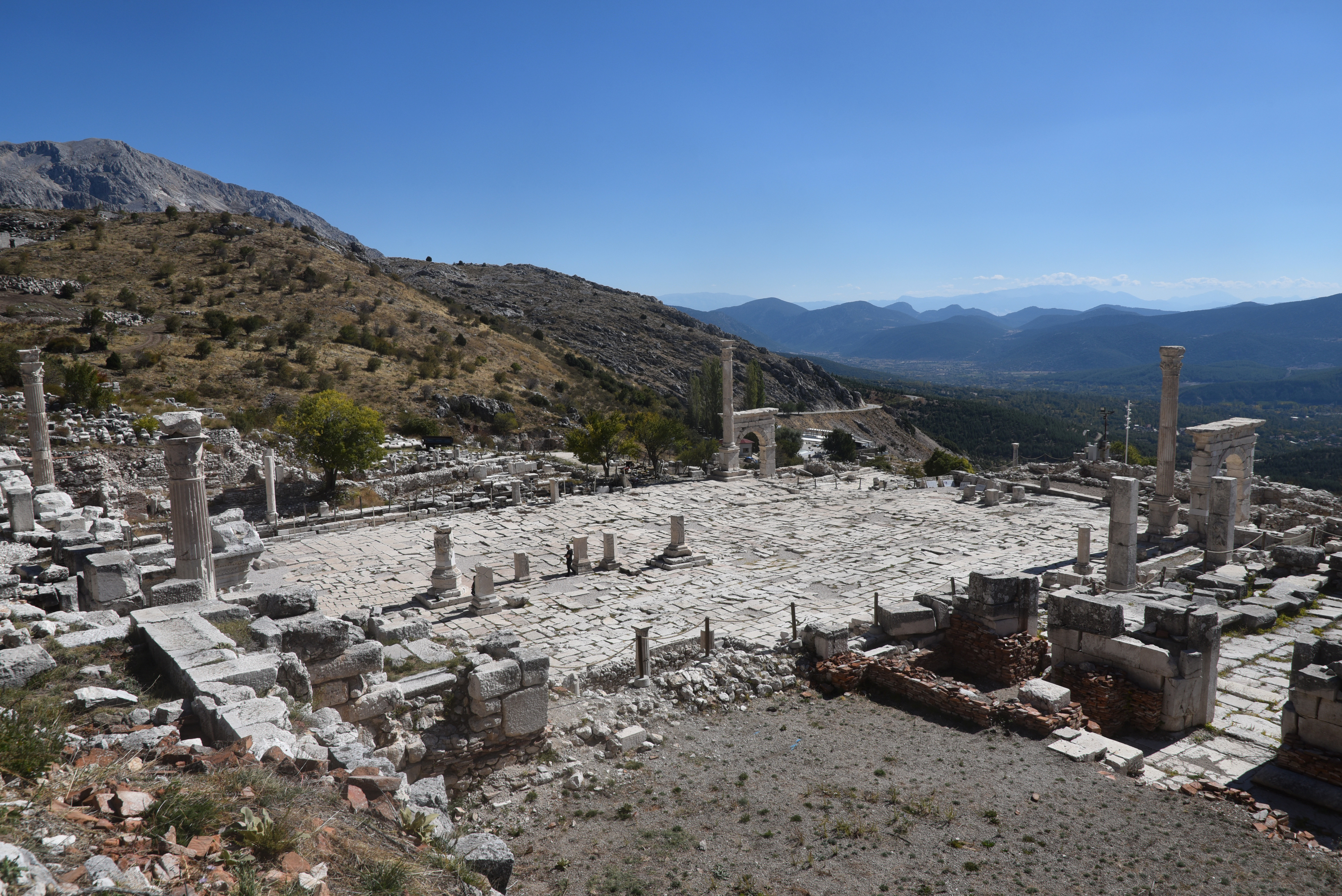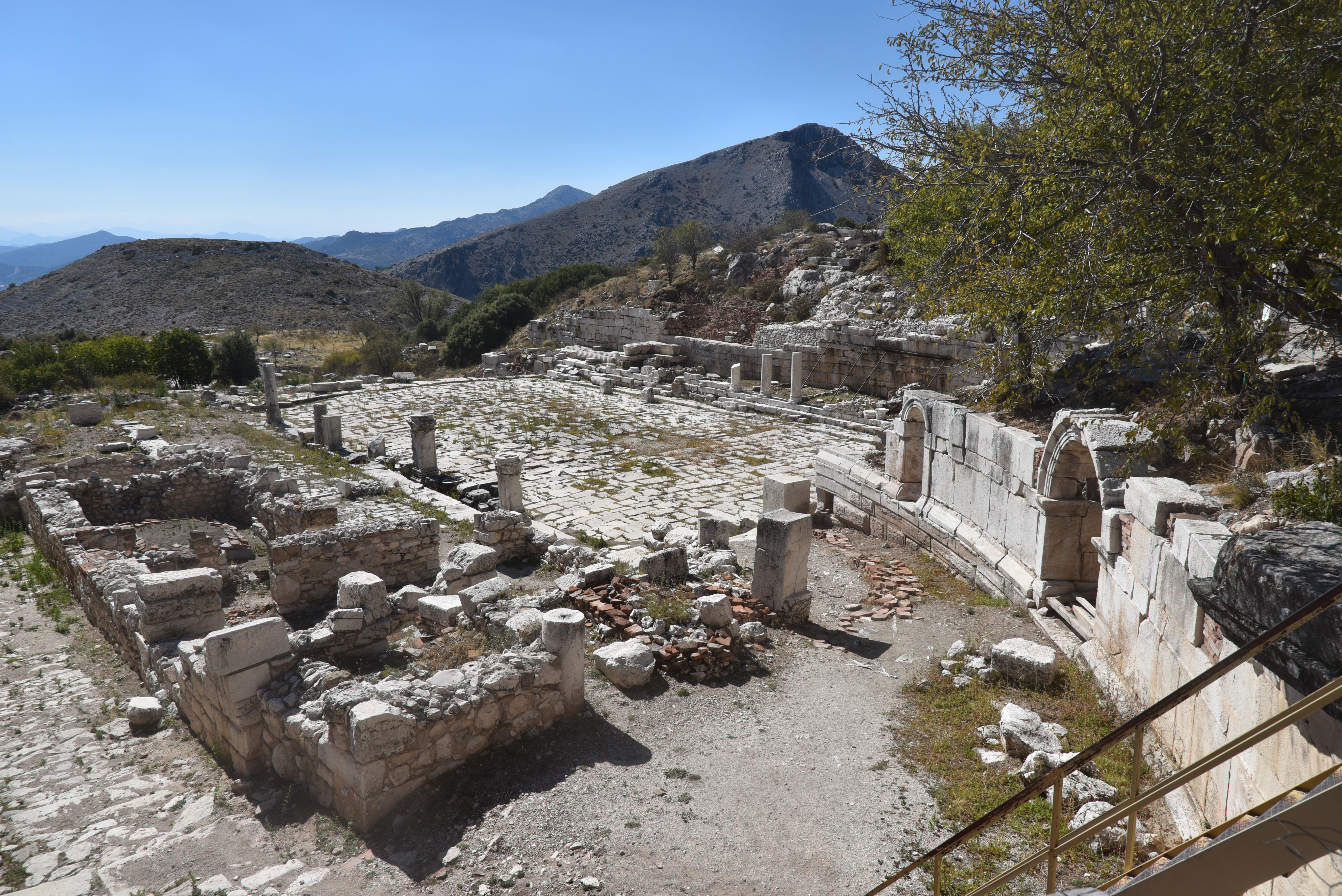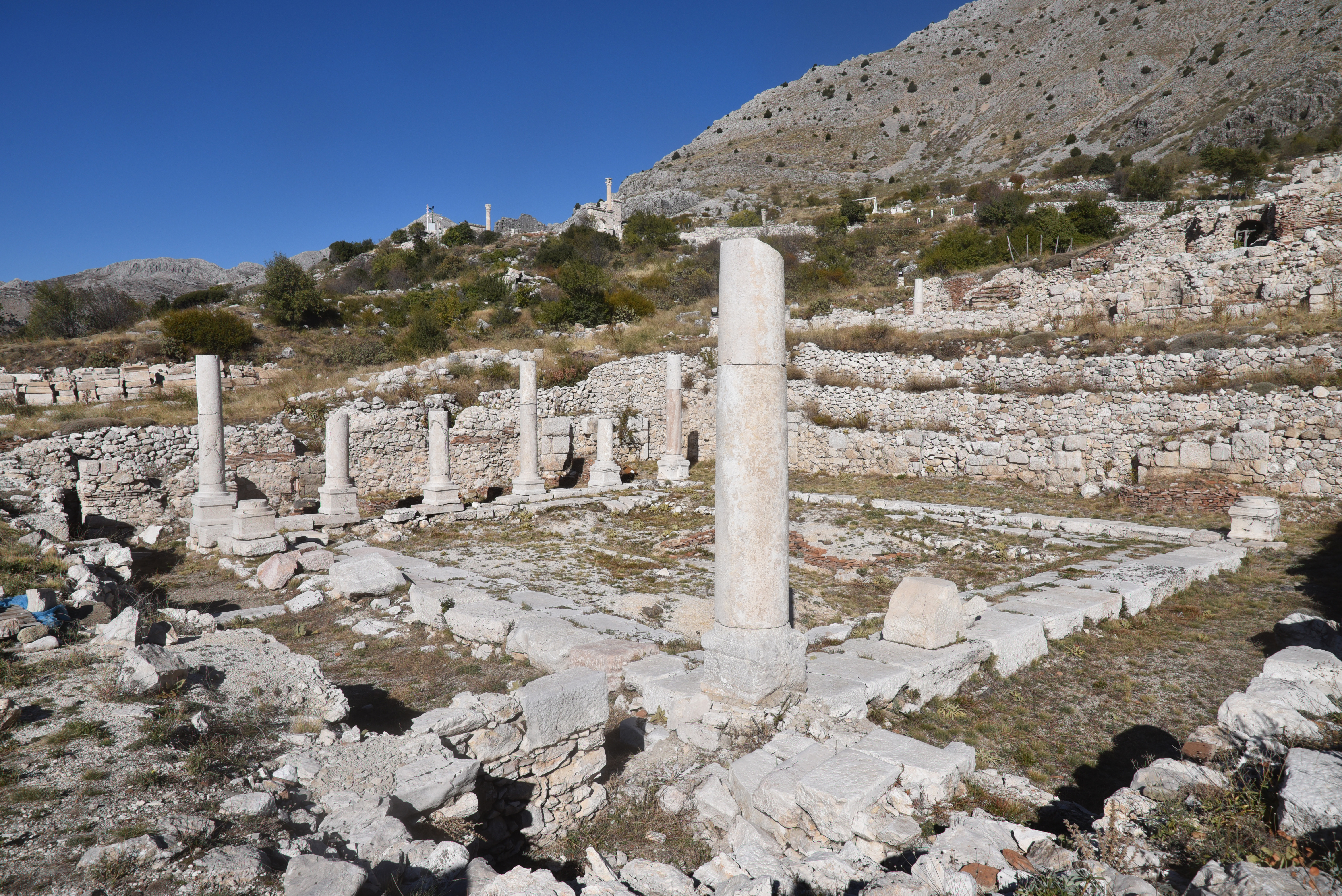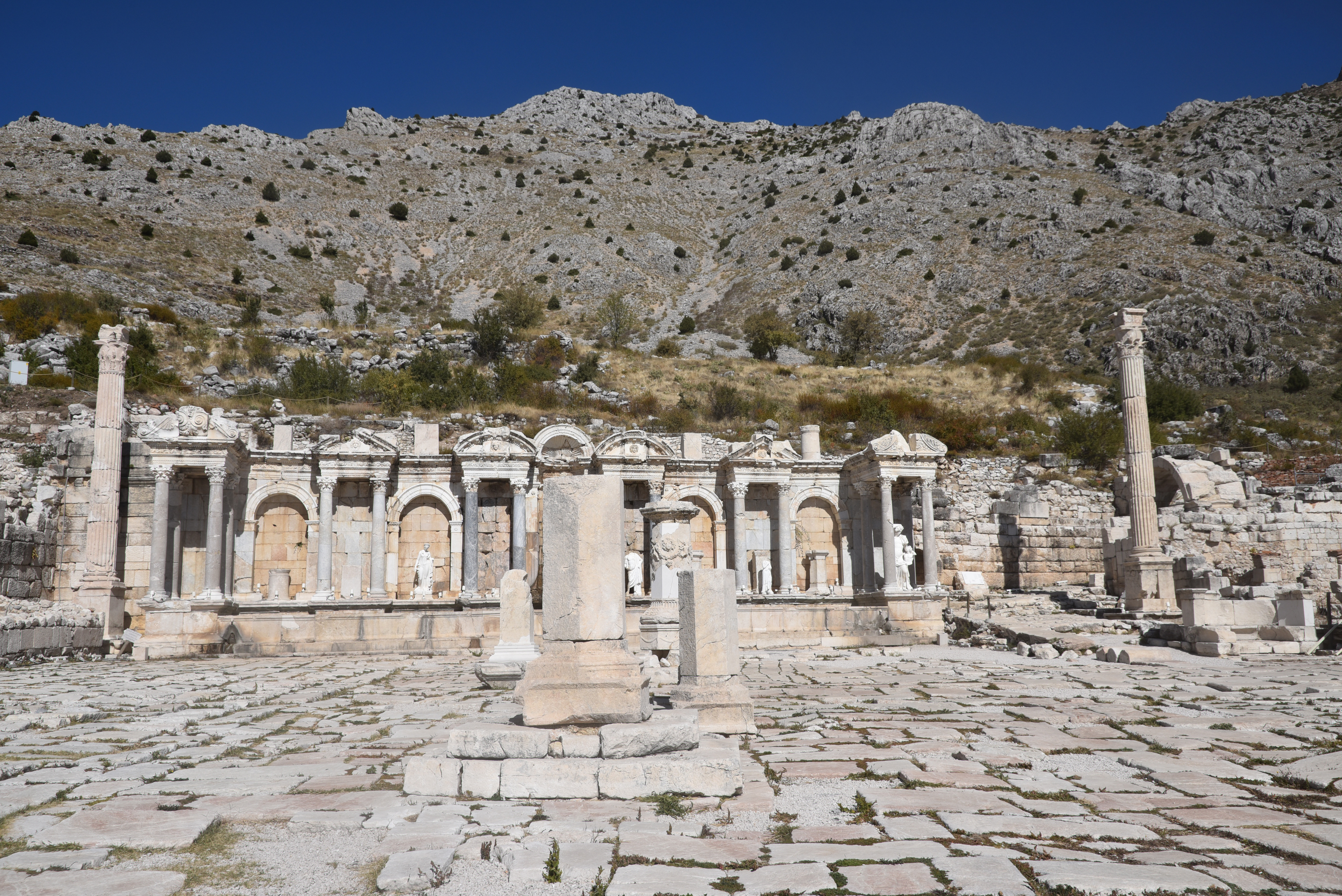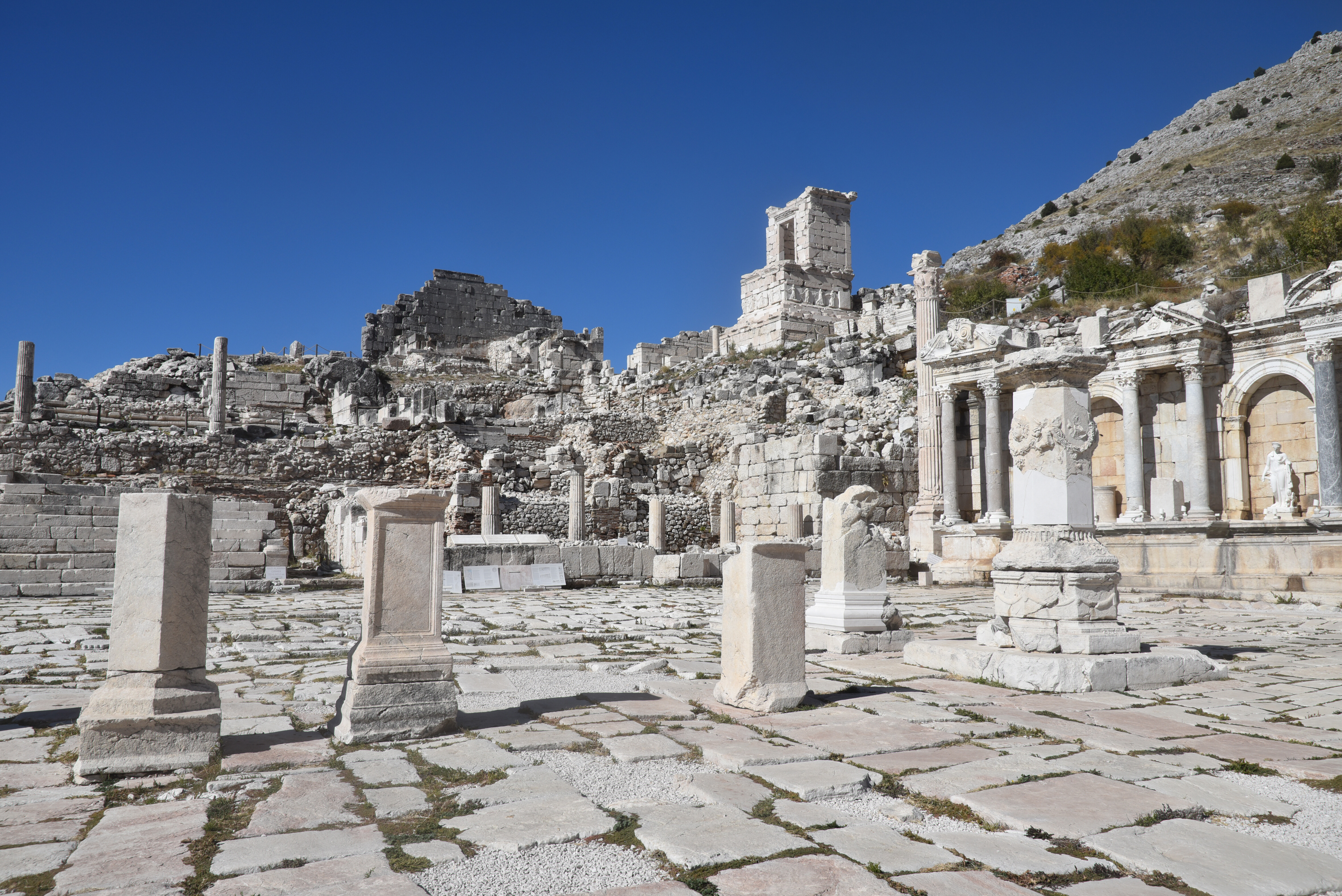 The Imperial Baths, a monumental bath complex covering c. 5,542 m² and built during the High Roman Imperial Period.The Imperial Baths included various sections, such as a large open-air palaestra, a “marble room,” and separate bathing circuits for men and women.The “marble room” of the Imperial Baths which originally displayed colossal acrolithic statues of Emperor Hadrian, his successors Antoninus Pius and Marcus Aurelius, and their spouses.The Lower Agora, constructed during the reign of Augustus and further monumentalized during late Flavian–Trajanic times.The Lower Agora covered approximately 1,550 square meters and was oriented differently from the Upper Agora, aligning with the rectangular street pattern of the new southern urban quarters.The square of the Lower Agora was adorned with a small Ionic “distyle in antis” temple dedicated to Apollo Klarios, which overlooked the agora from the west. This temple later became associated with the municipal emperor cult. A monumental fountain was added along the north side of the agora during Trajanic times, further enhancing its appearance.The Trajanic Nymphaeum, constructed during the reign of Emperor Trajan in the northern side of the Lower Agora.The Colonnaded Street connecting the Lower Agora with the South Gate of the city. It was constructed during the reign of Emperor Tiberius (AD 14–37).The Colonnaded Street was approximately 9.6–10 meters wide and 290 meters long. It was paved during the Julio-Claudian period, covering a dense water-supply network beneath it, flanked by porticoes and adorned with decorative monuments, including statues and inscriptions.The Lower City looking south towards Alexander’s Hill, the scene of the battle in 333 BC by which Alexander conquered the city. The landmark was named by the late Marc Waelkens.The ruins of the Temple of Antoninus Pius, constructed on a prominent location in the southeast part of the city, on a raised promontory. It was built to accommodate the cult of the emperor.The Temple of Antoninus Pius was of the Corinthian peripteral type, characterised by a rectangular layout surrounded by a colonnade of Corinthian columns.Alexander’s Hill. The Roman historian Arrian recorded that Alexander, in 333 BC, took Sagalassos by storm after breaking local resistance on a steep, conical hill south of the settlement (Anabasis, I.28.2).The southern necropolis.