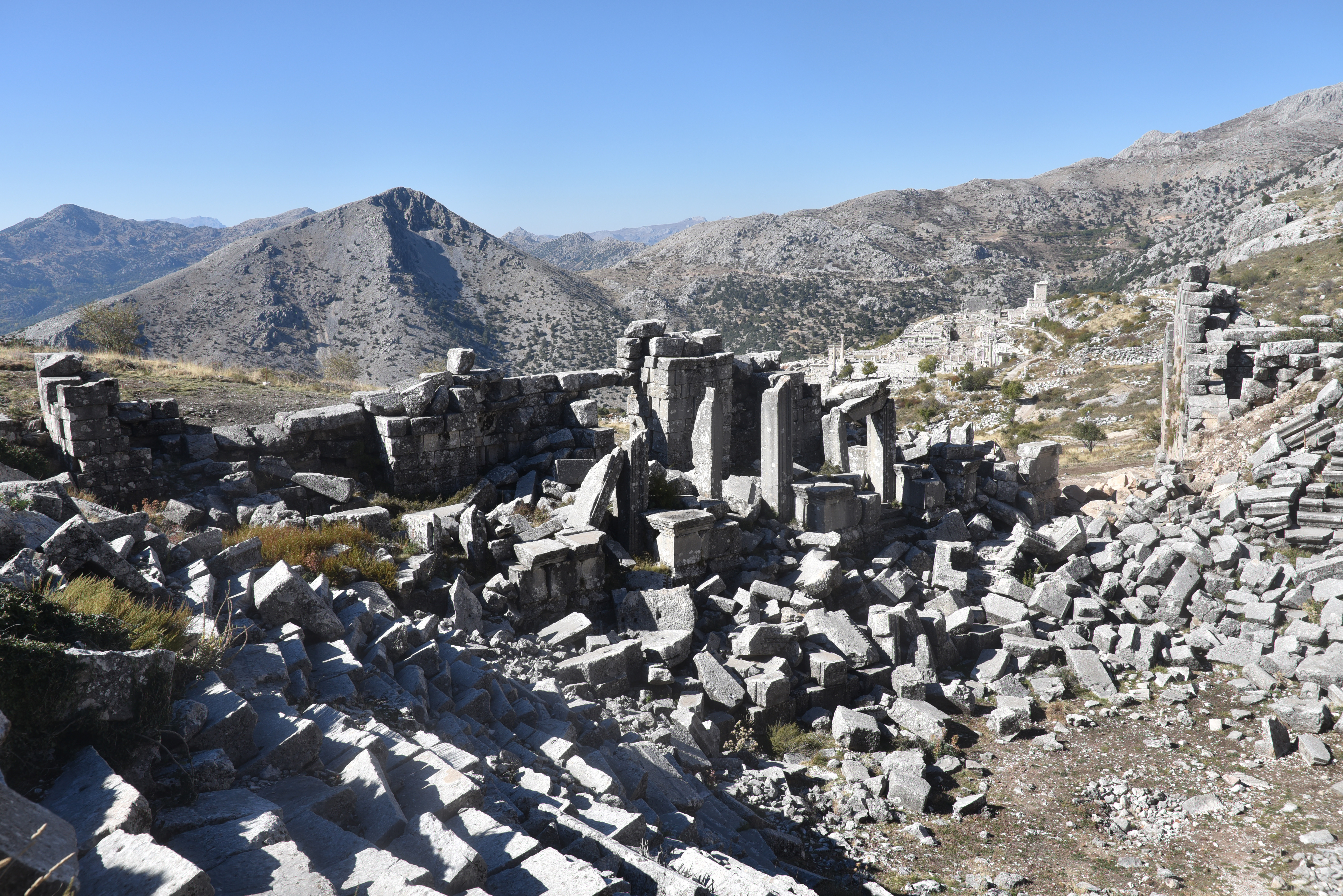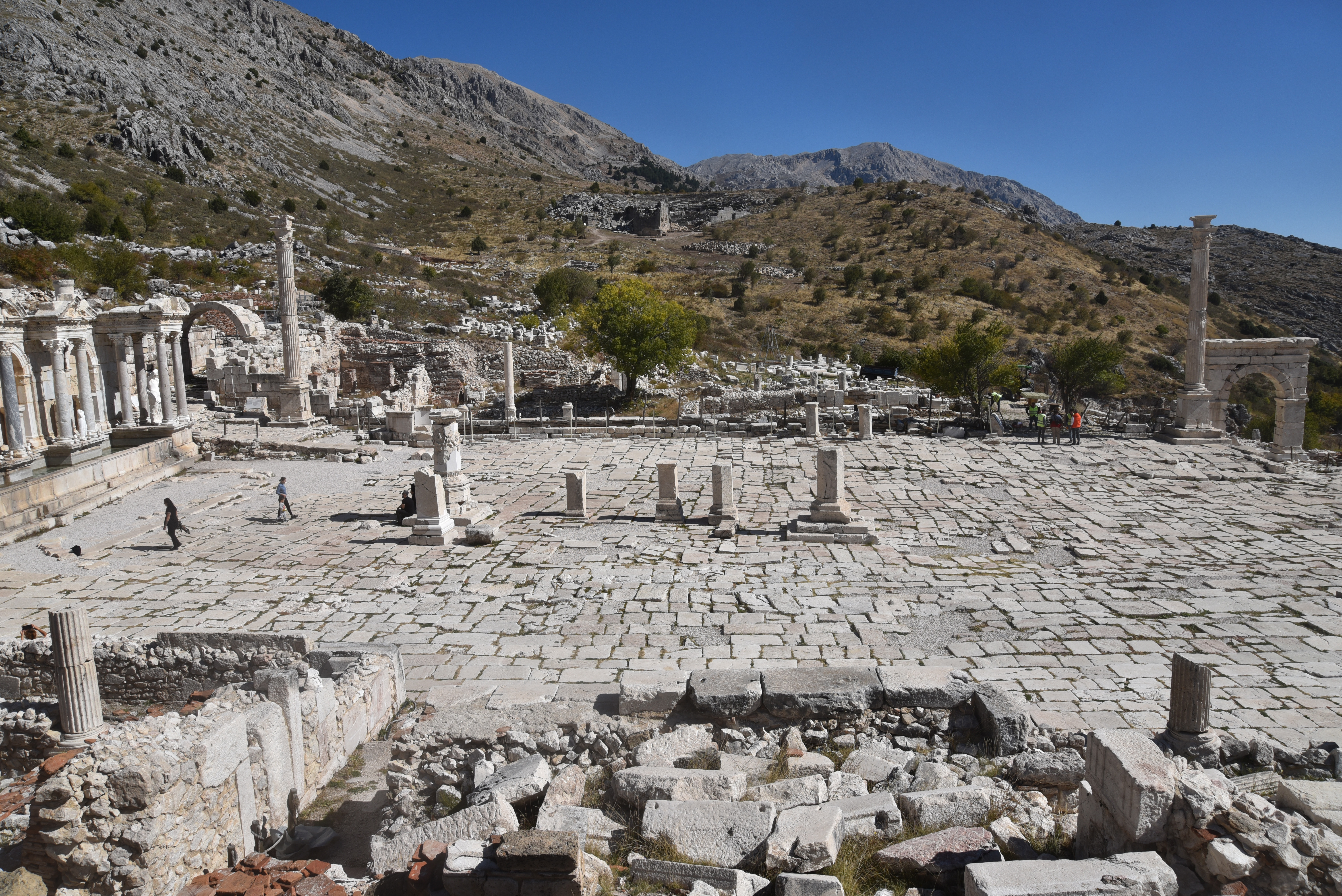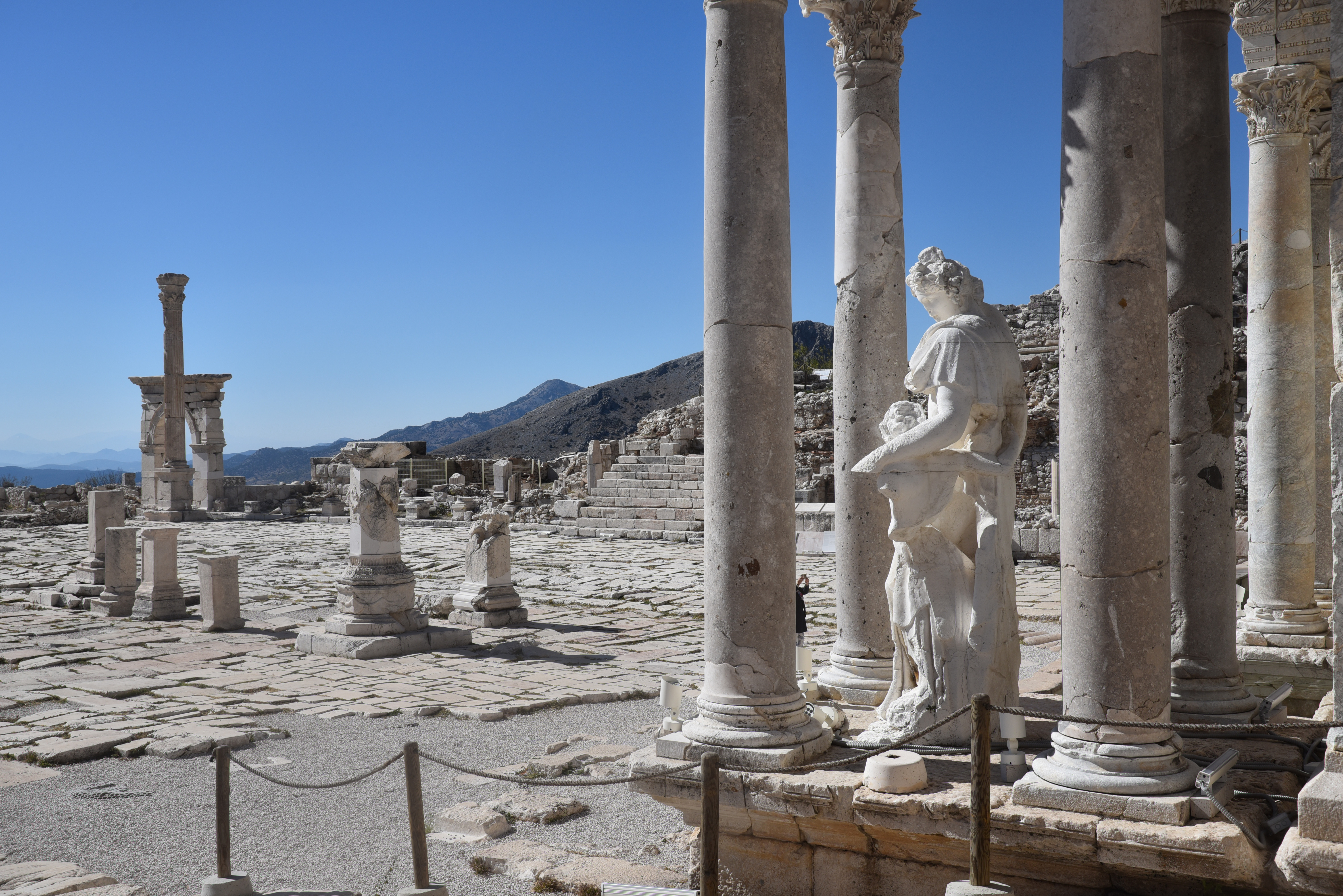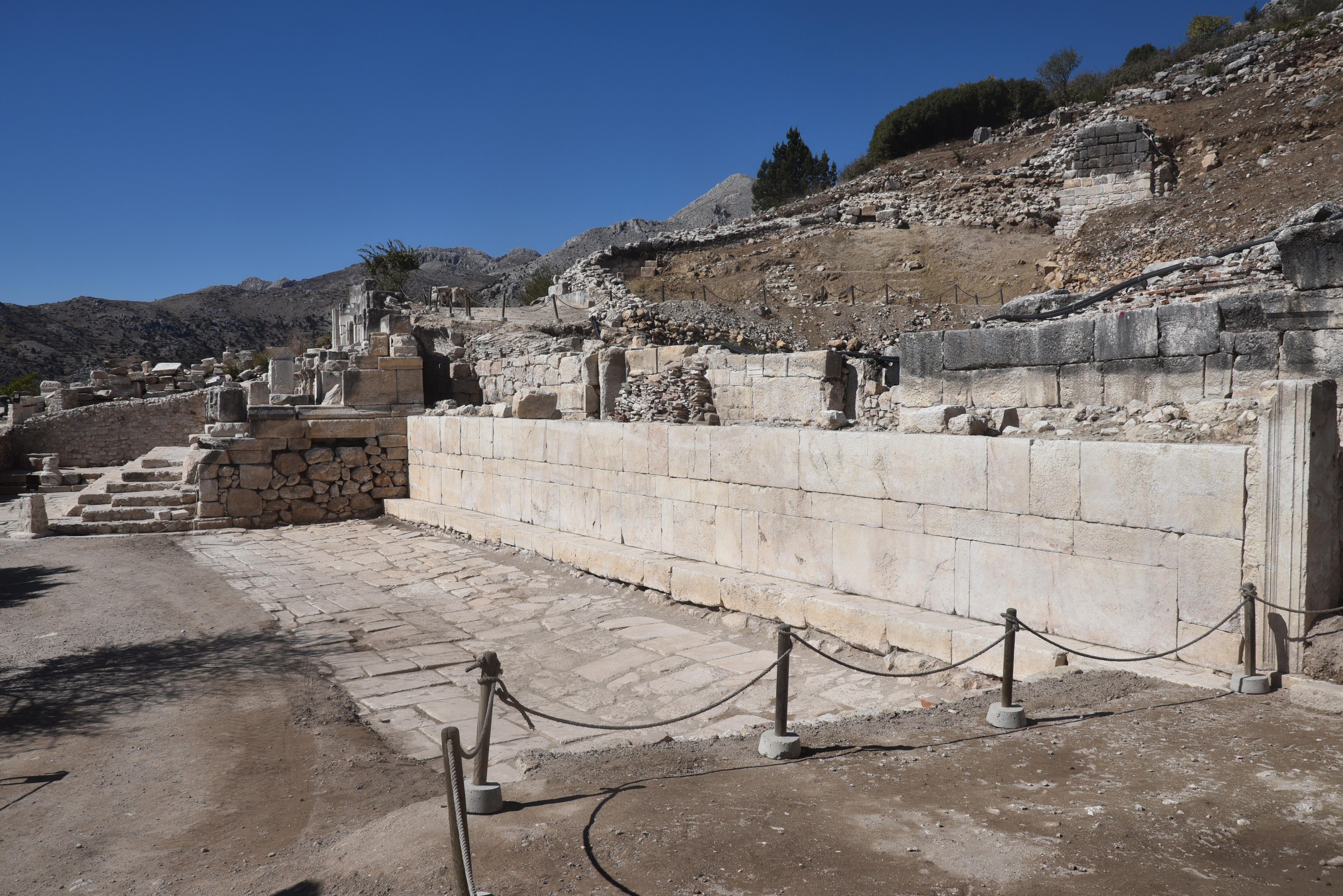 The Imperial Baths, a monumental bath complex covering c. 5,542 m² and built during the High Roman Imperial Period.The Imperial Baths included various sections, such as a large open-air palaestra, a “marble room,” and separate bathing circuits for men and women.The “marble room” of the Imperial Baths which originally displayed colossal acrolithic statues of Emperor Hadrian, his successors Antoninus Pius and Marcus Aurelius, and their spouses.The Lower Agora, constructed during the reign of Augustus and further monumentalized during late Flavian–Trajanic times.The Lower Agora covered approximately 1,550 square meters and was oriented differently from the Upper Agora, aligning with the rectangular street pattern of the new southern urban quarters.The square of the Lower Agora was adorned with a small Ionic “distyle in antis” temple dedicated to Apollo Klarios, which overlooked the agora from the west. This temple later became associated with the municipal emperor cult. A monumental fountain was added along the north side of the agora during Trajanic times, further enhancing its appearance.The Trajanic Nymphaeum, constructed during the reign of Emperor Trajan in the northern side of the Lower Agora.The Colonnaded Street connecting the Lower Agora with the South Gate of the city. It was constructed during the reign of Emperor Tiberius (AD 14–37).The Colonnaded Street was approximately 9.6–10 meters wide and 290 meters long. It was paved during the Julio-Claudian period, covering a dense water-supply network beneath it, flanked by porticoes and adorned with decorative monuments, including statues and inscriptions.The Lower City looking south towards Alexander’s Hill, the scene of the battle in 333 BC by which Alexander conquered the city. The landmark was named by the late Marc Waelkens.The ruins of the Temple of Antoninus Pius, constructed on a prominent location in the southeast part of the city, on a raised promontory. It was built to accommodate the cult of the emperor.The Temple of Antoninus Pius was of the Corinthian peripteral type, characterised by a rectangular layout surrounded by a colonnade of Corinthian columns.Alexander’s Hill. The Roman historian Arrian recorded that Alexander, in 333 BC, took Sagalassos by storm after breaking local resistance on a steep, conical hill south of the settlement (Anabasis, I.28.2).The southern necropolis.