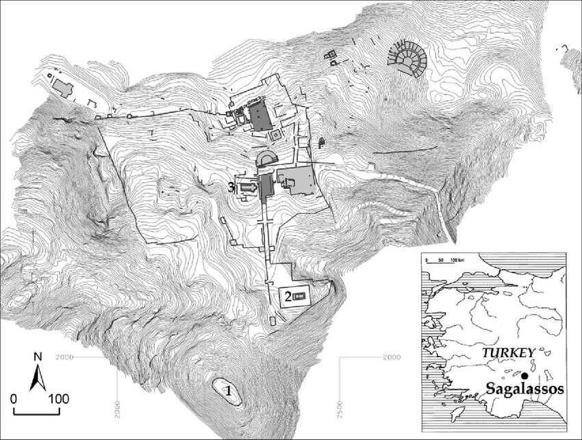Site plan of Sagalassos: (1) Alexander’s Hill; (2) Temple of Hadrian and Antoninus Pius; (3) Temple of Apollo Klarios (source)