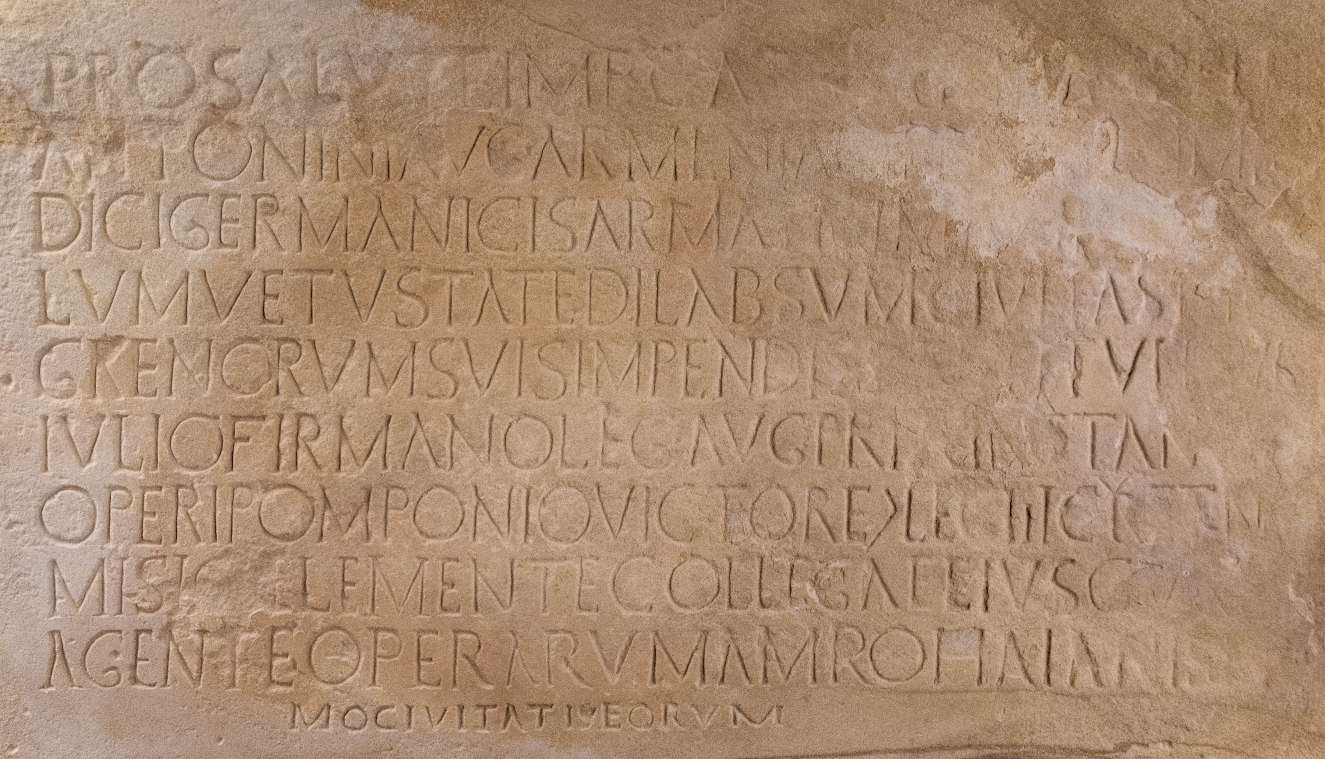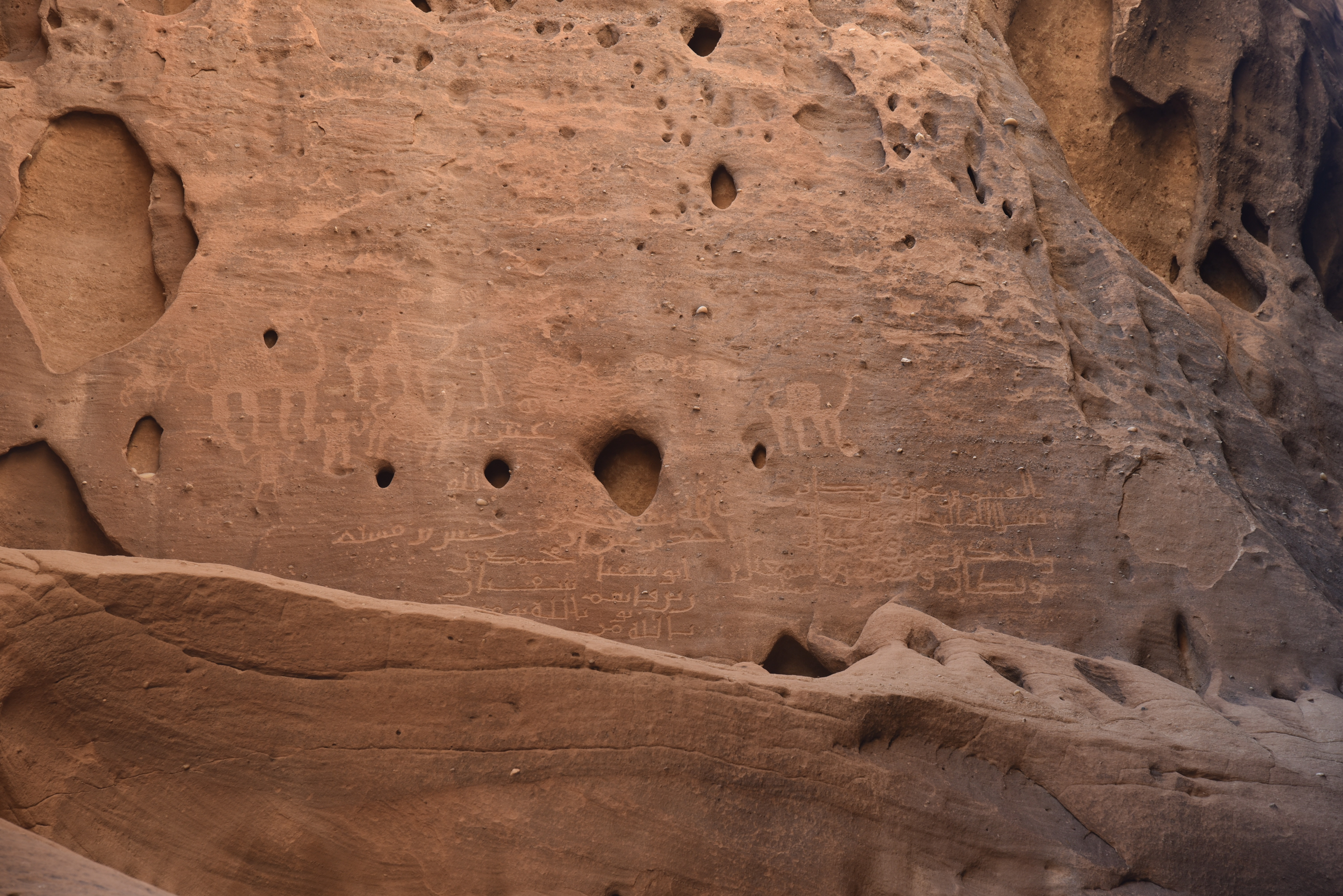 In AD 106, the Roman Empire annexed the Nabataean Kingdom, incorporating the city of Hegra into the province of Arabia Petraea. Evidence of Roman military presence in Hegra is found in the epigraphic record. A Greek inscription refers to a painter associated with the Legio III Cyrenaica, while Greek graffiti created by soldiers from the Ala Getulorum and Ala Dromedariorum can be seen on the rocks along the ancient north-south trade route that passes by Hegra. Additionally, a monumental Latin inscription, discovered in 2003 and dated to AD 175–177, mentions the restoration of a monument, likely the city wall, with the assistance of two centurions from the Legio III Cyrenaica (source).