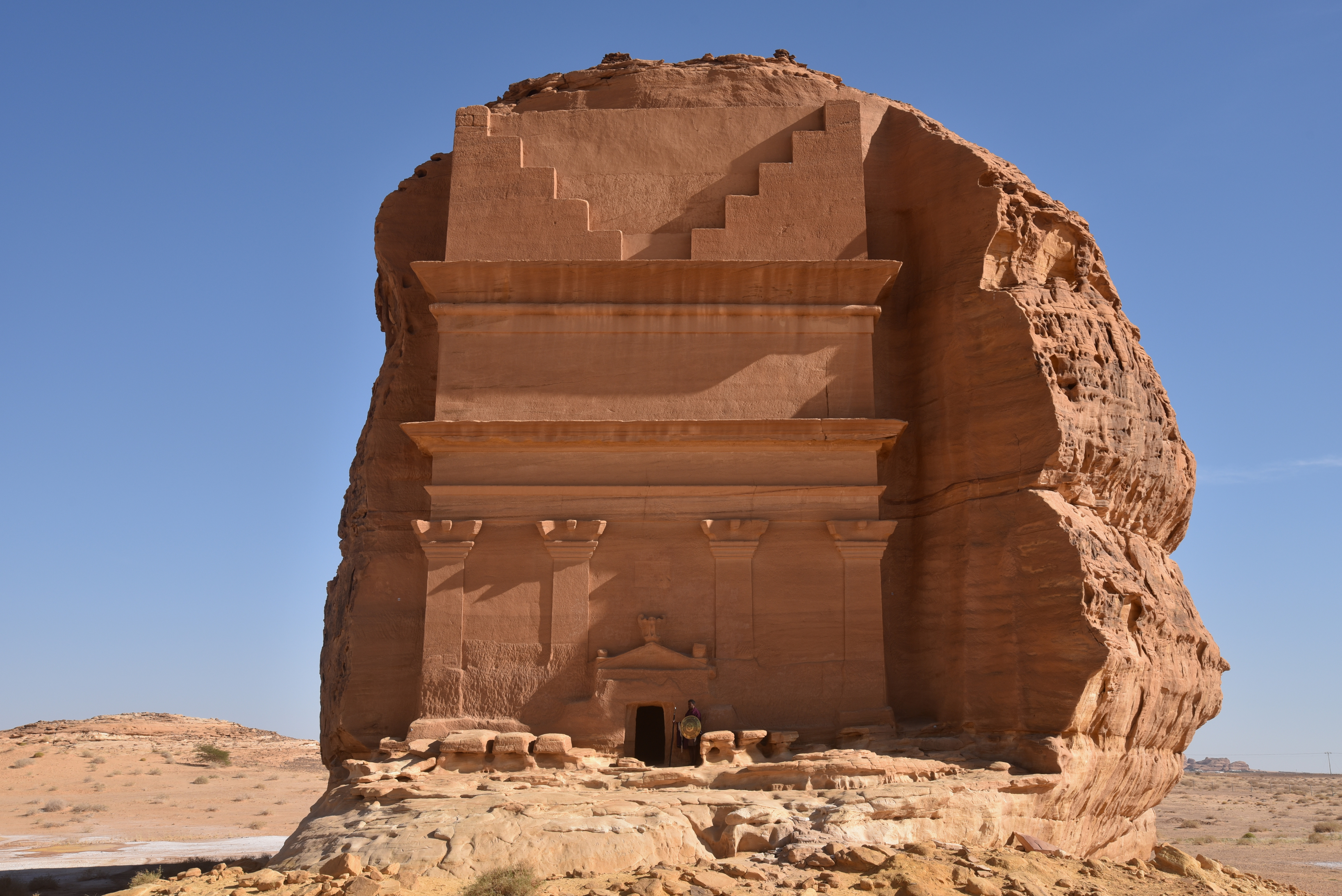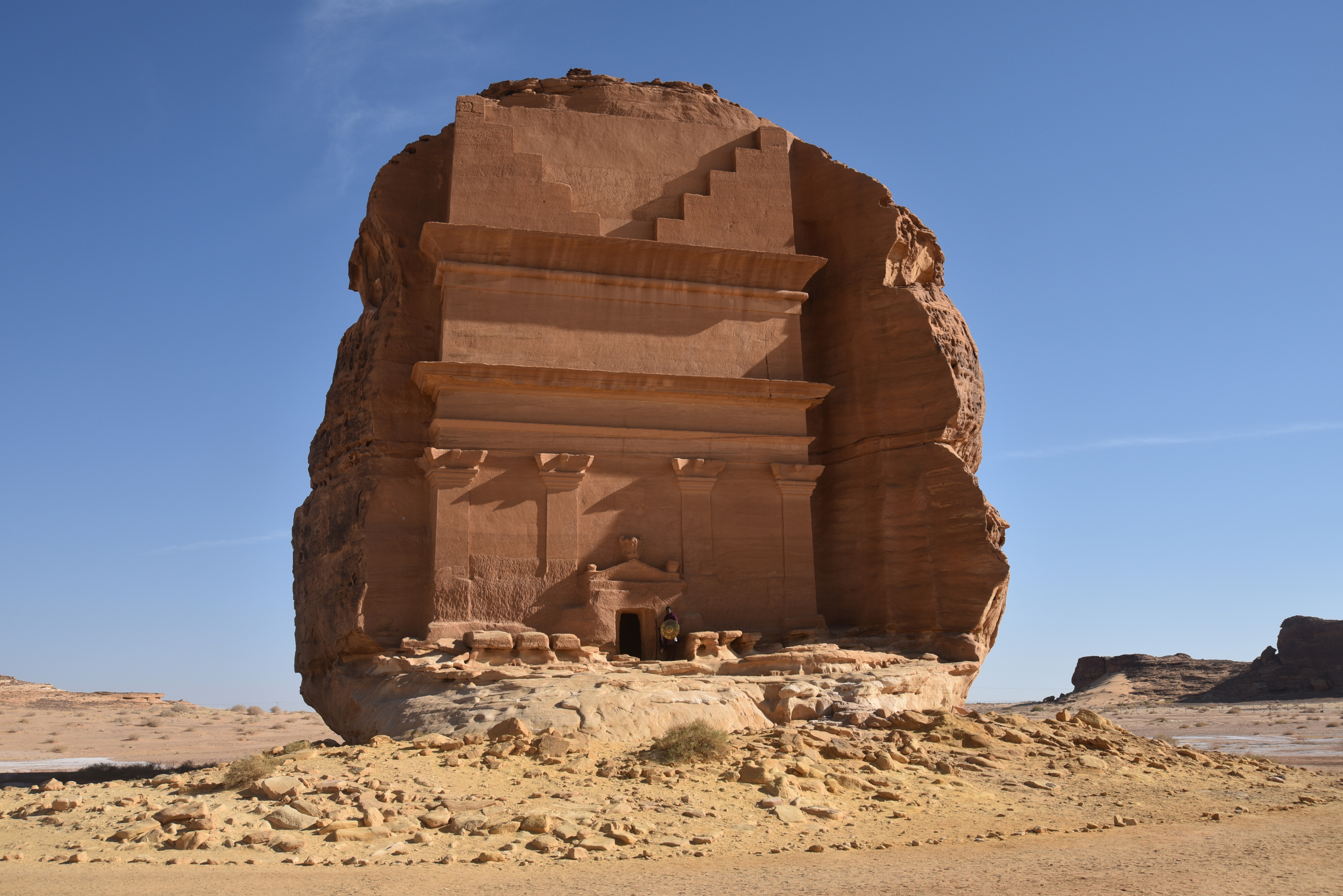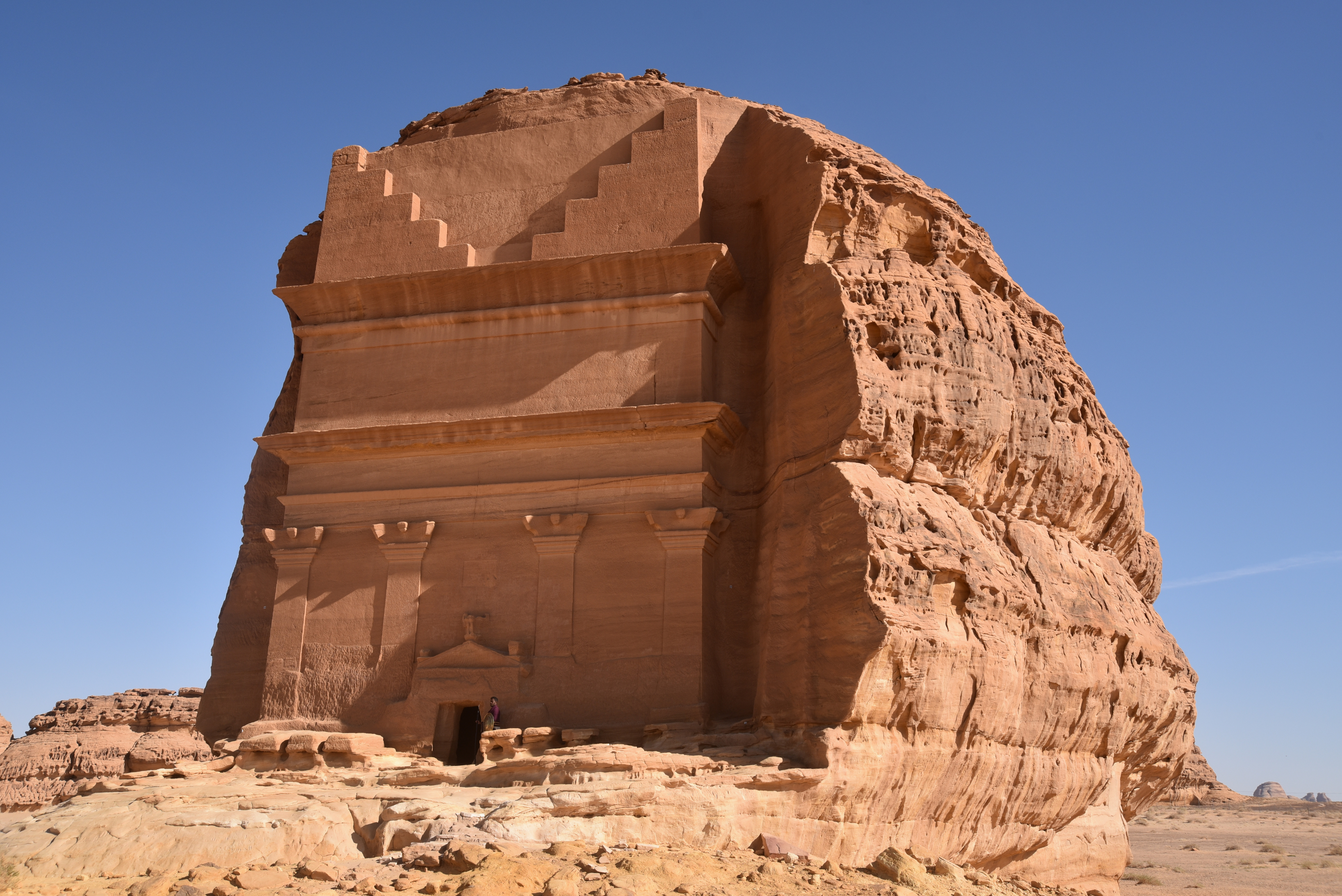 Qasr al Farid, also known as The Tomb of Lihyan Son of Kuza, is a 1st-century AD tomb carved into a single huge rock. It is the most famous and the largest tomb in Hegra. The tomb is an iconic example of Nabataean funerary architecture and stands isolated. It is carved into a massif about 23 metres high and 18 metres wide, with the access platform raised approximately 4 metres above ground level.