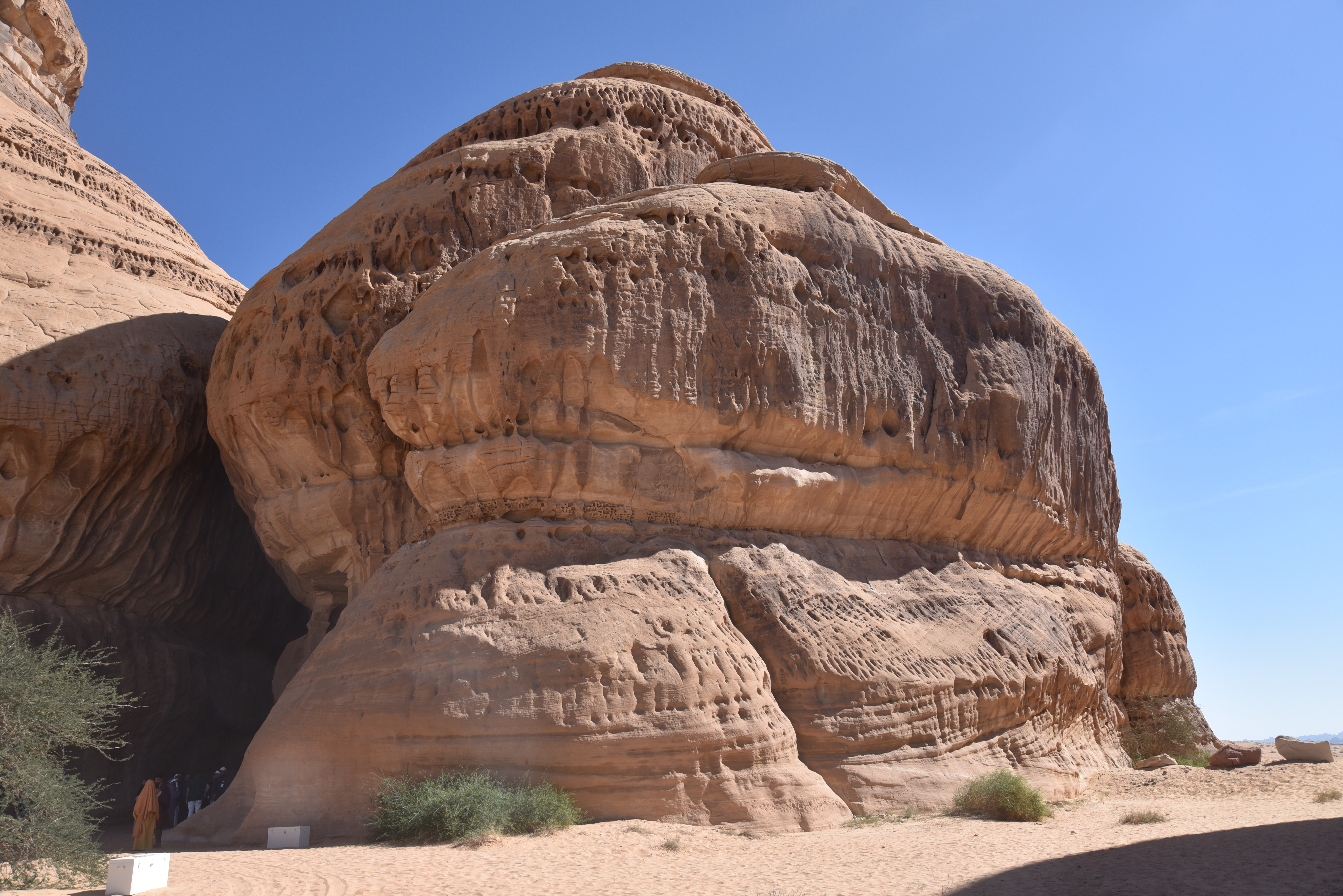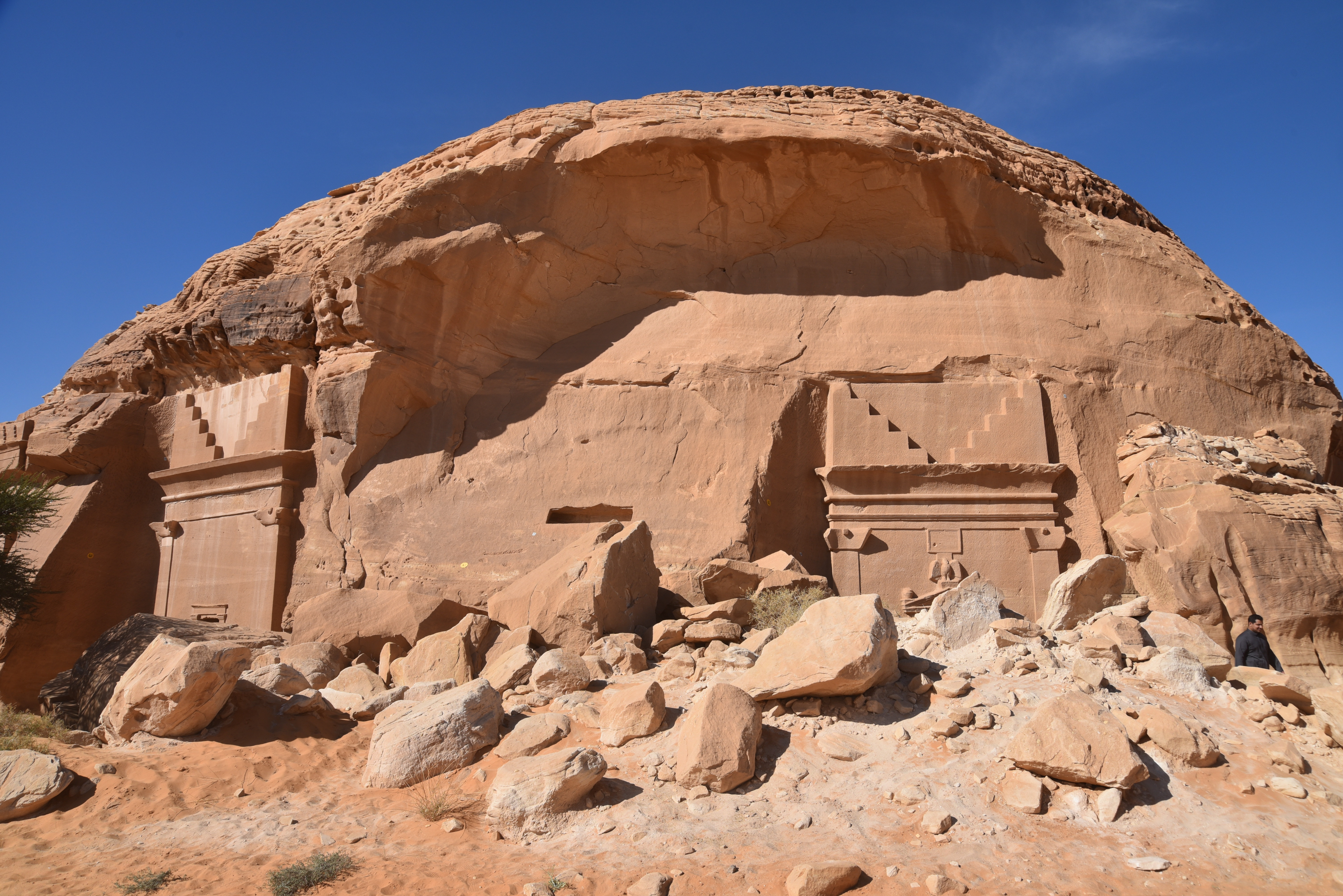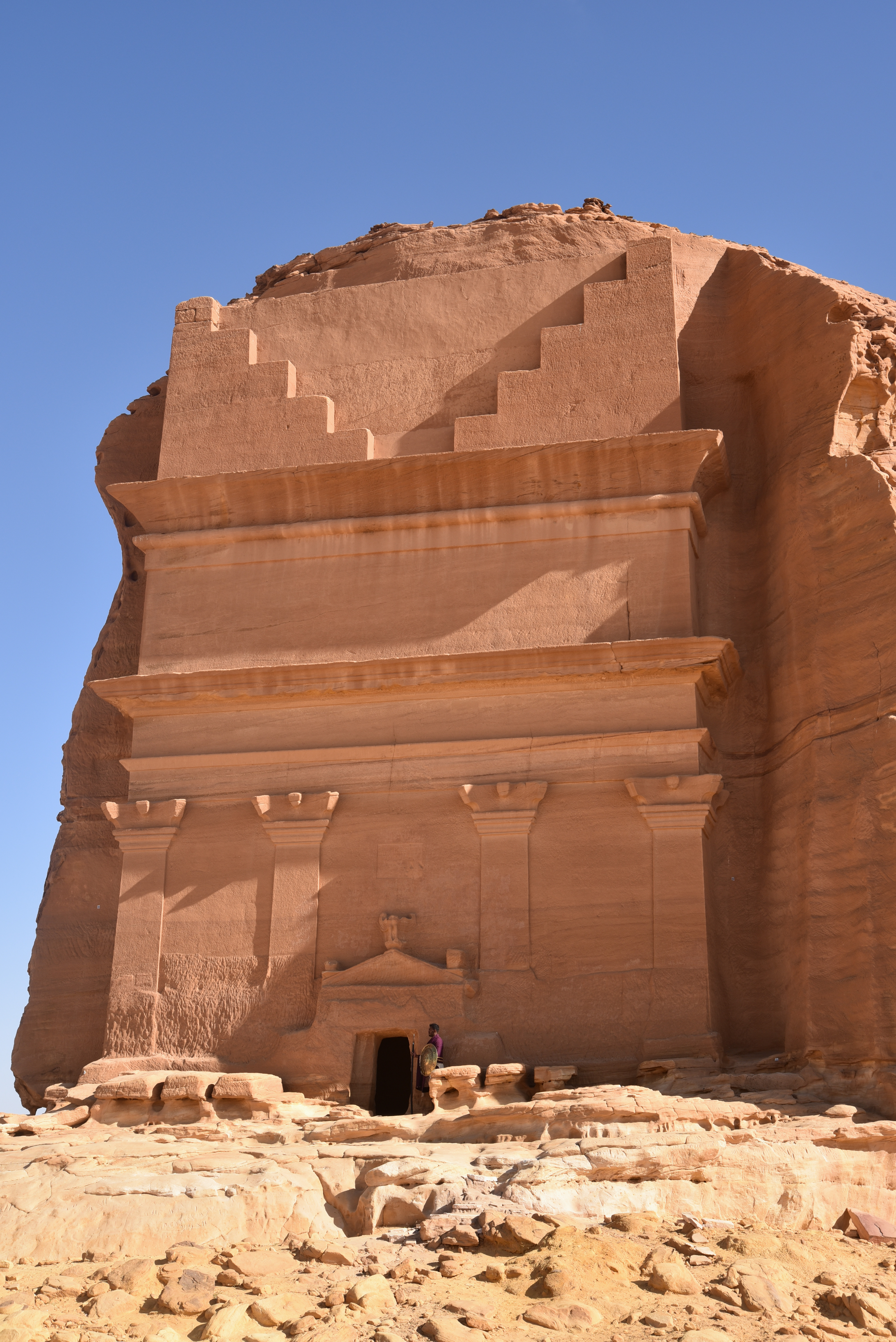 Qasr al Farid, also known as The Tomb of Lihyan Son of Kuza, is a 1st-century AD tomb carved into a single huge rock. It is the most famous and the largest tomb in Hegra. The tomb is an iconic example of Nabataean funerary architecture and stands isolated. It is carved into a massif about 23 metres high and 18 metres wide, with the access platform raised approximately 4 metres above ground level.
