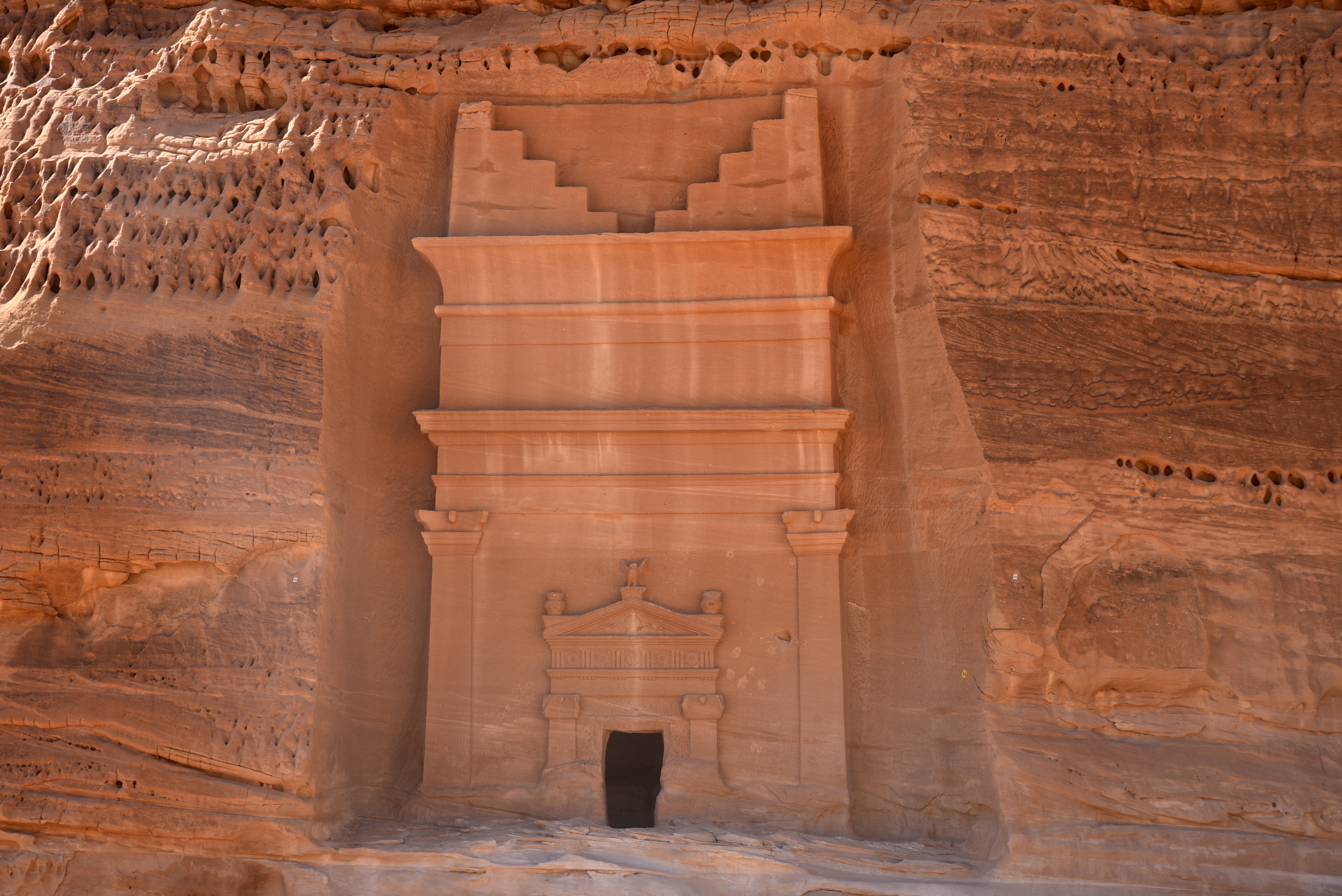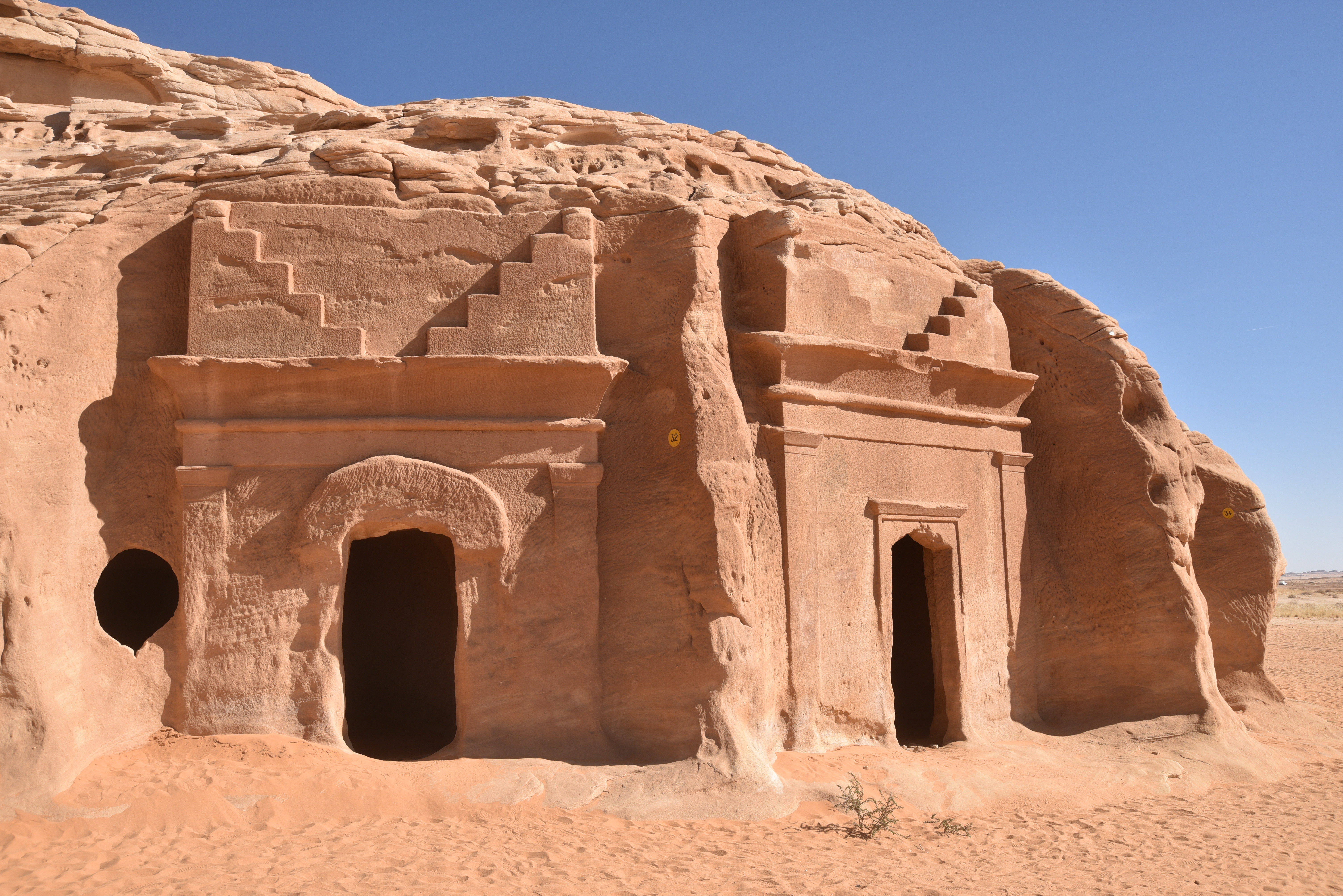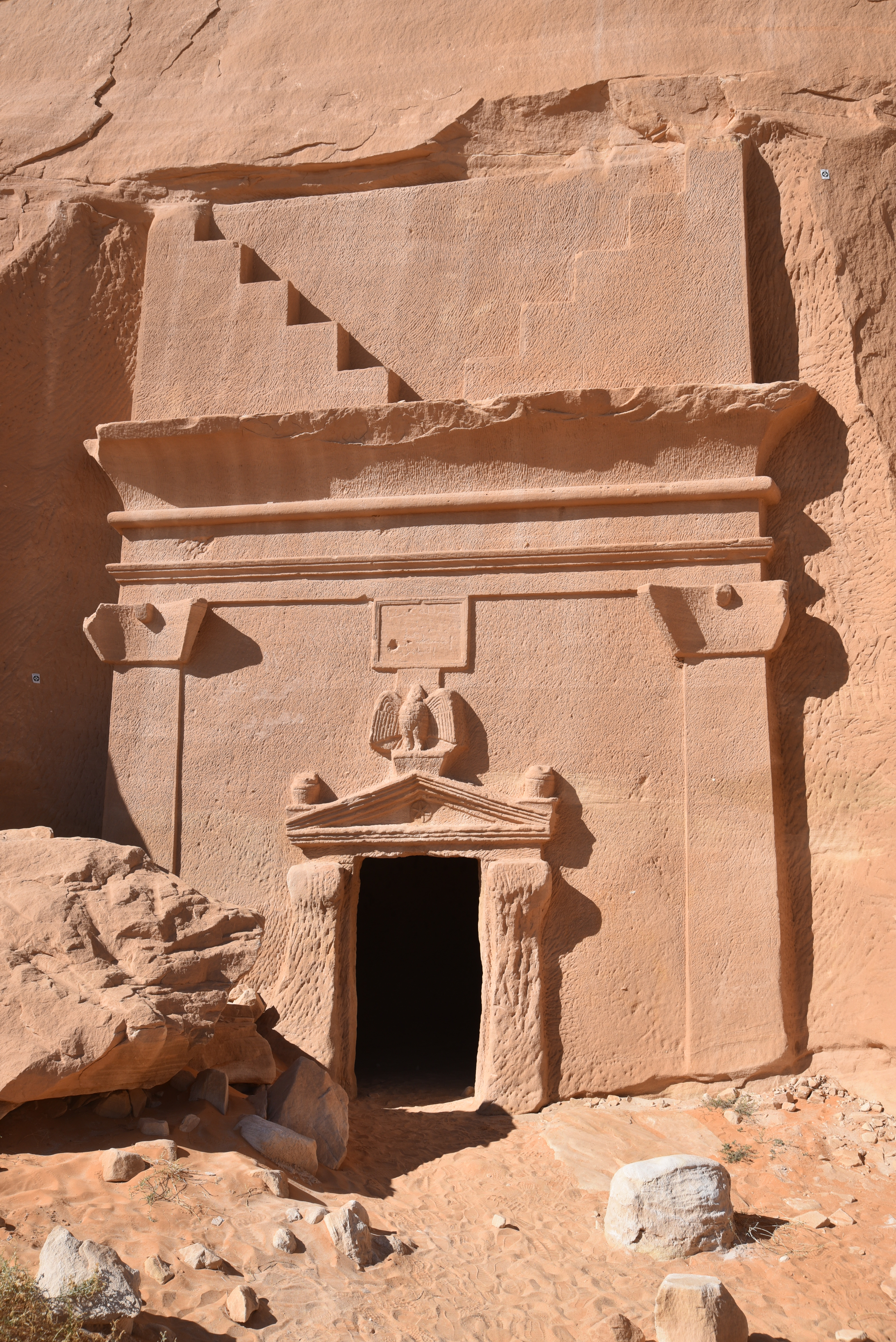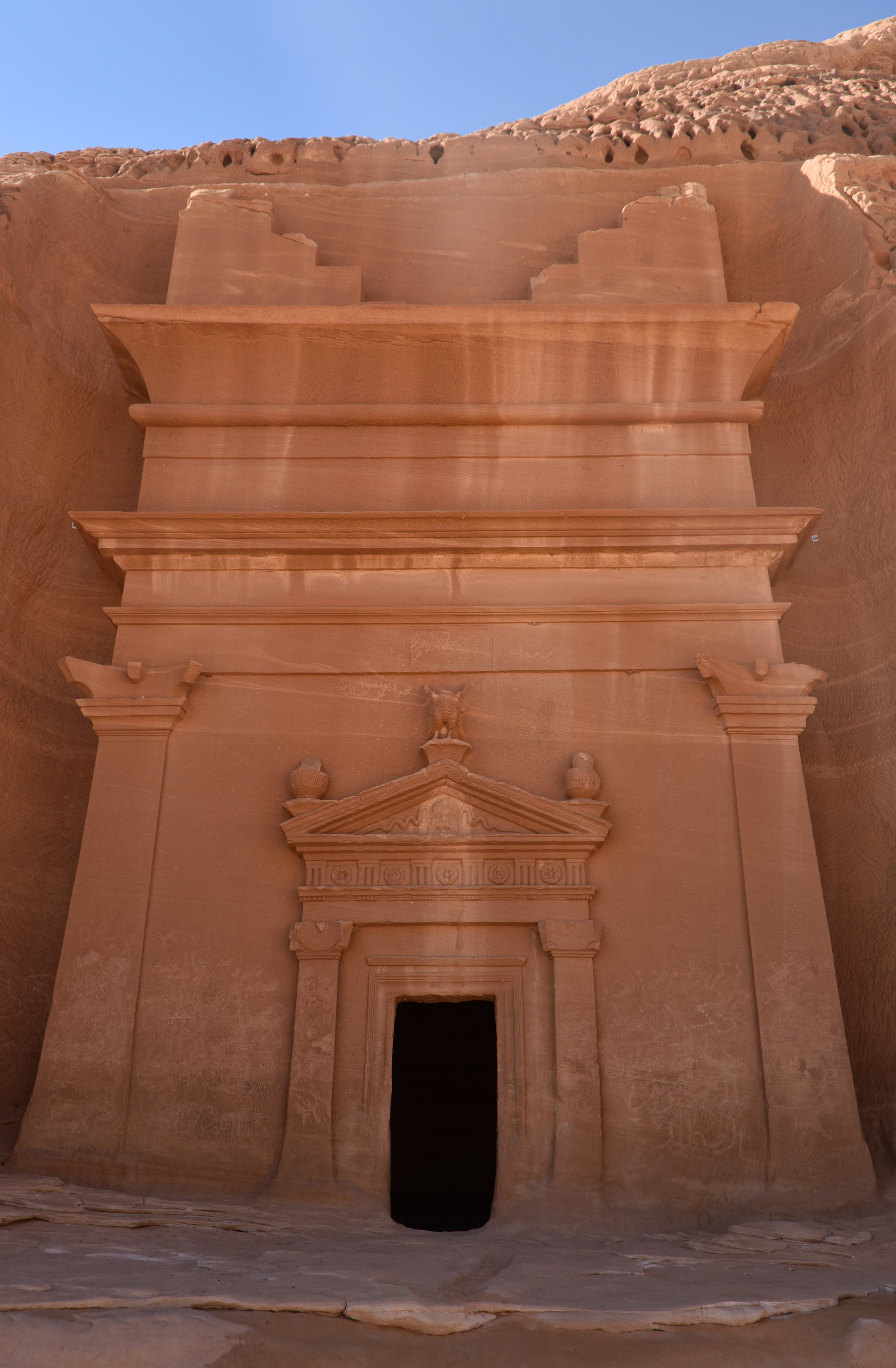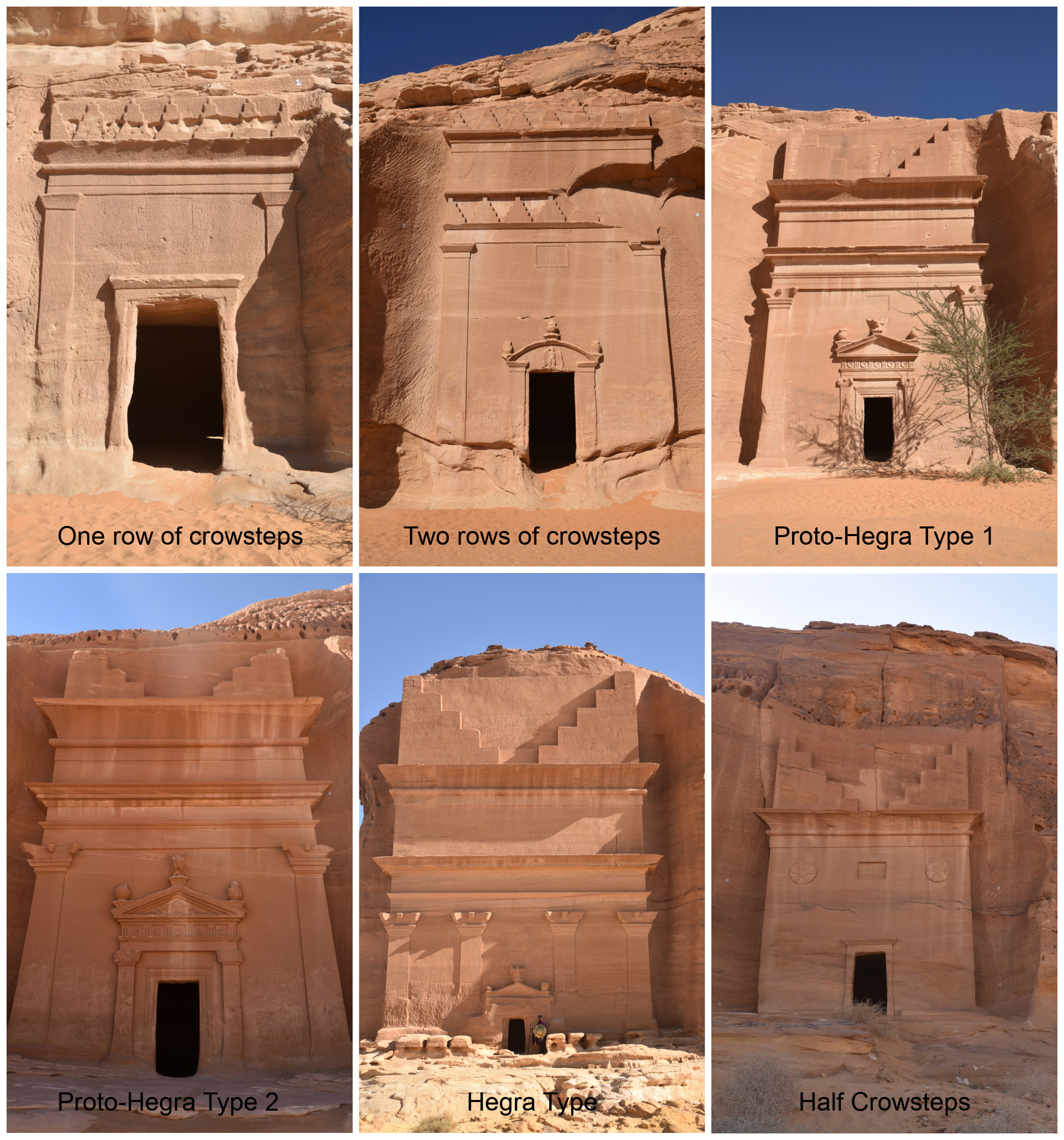 - Proto-Hegra Type 1 (approx. 24 tombs): Features pilasters, an Egyptian-style cornice (entablature), and two symmetrical half-crowsteps crowning the facade.