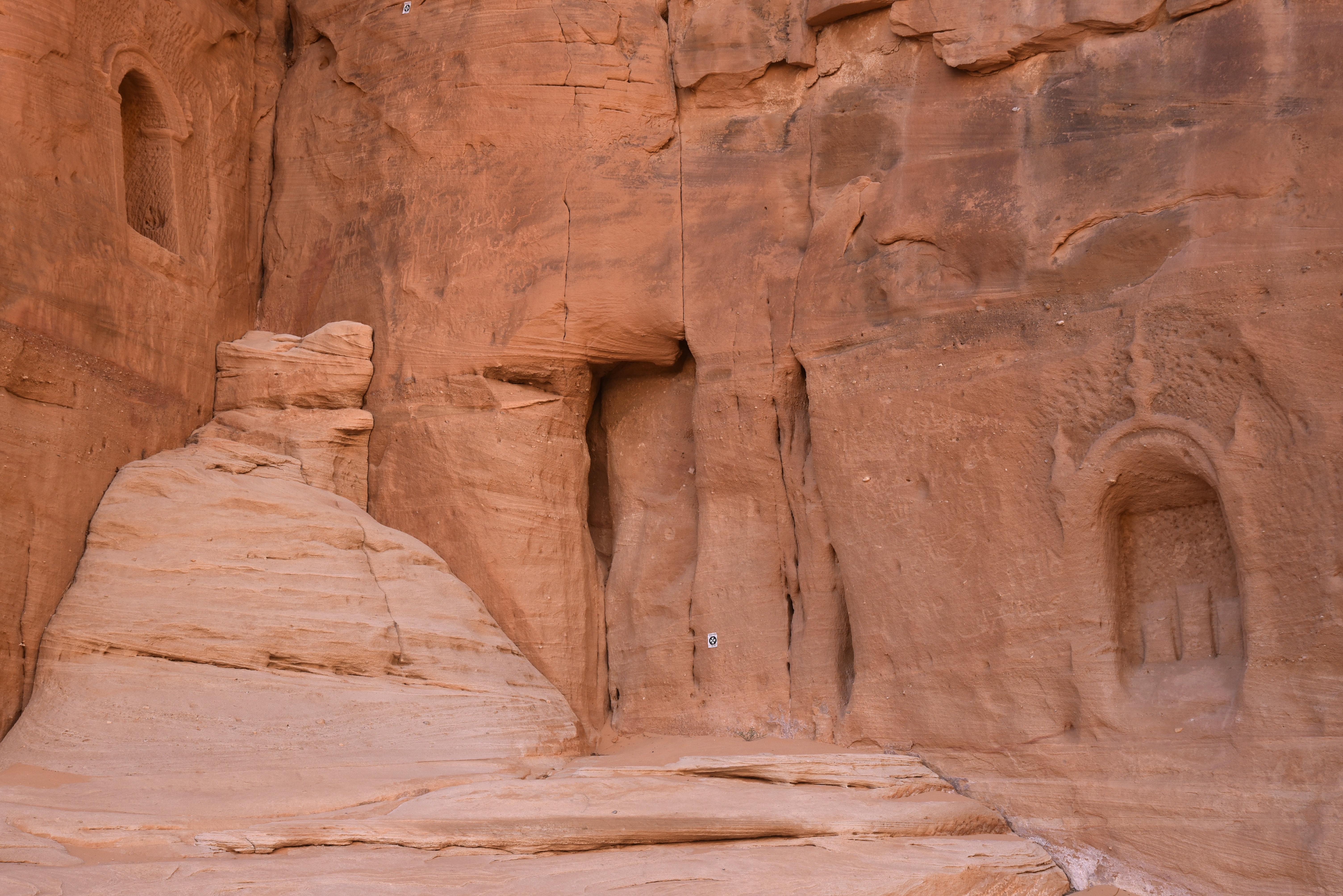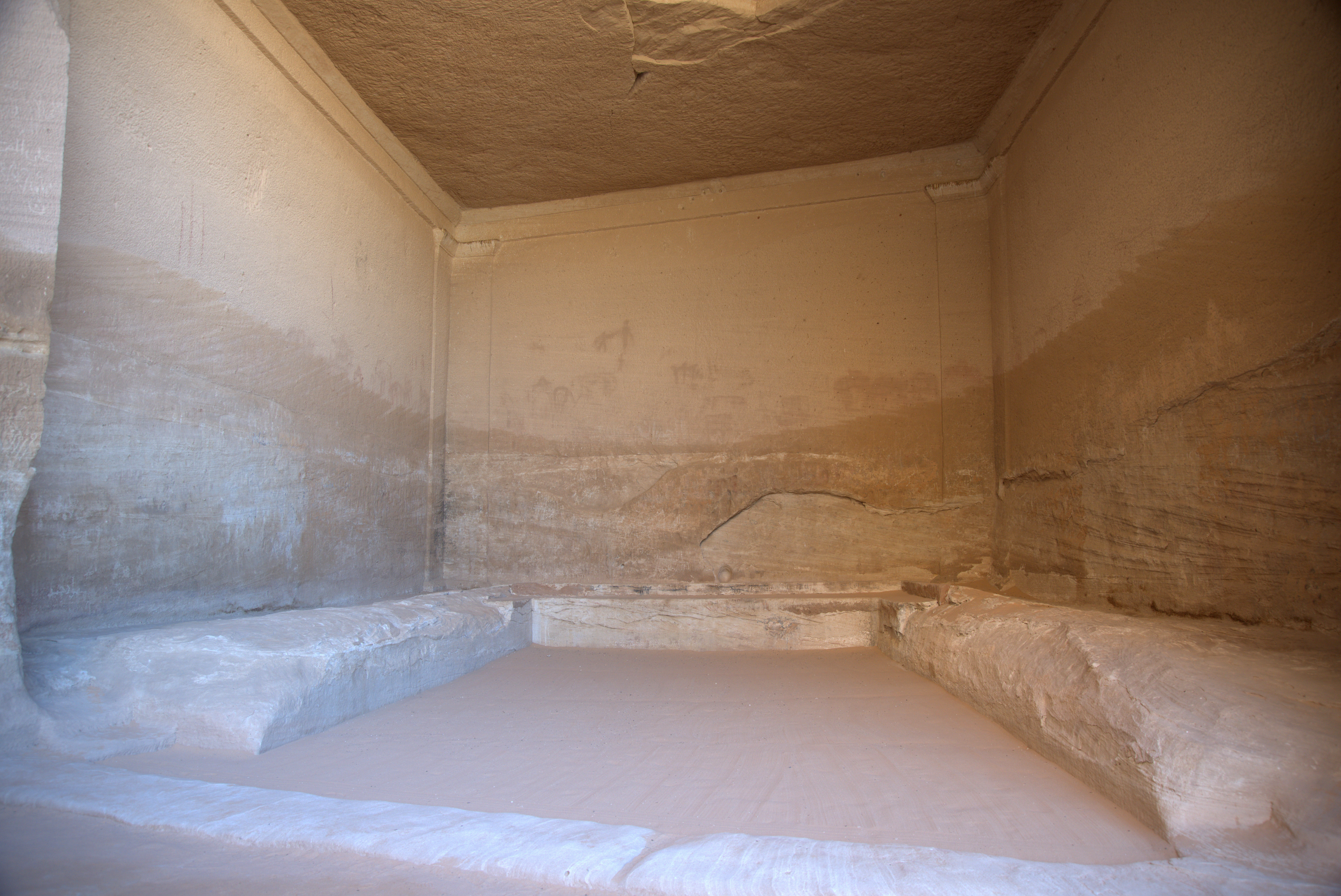 All the tombs (111 in total, 94 of which are decorated) date back from the 1st century BC to the 1st century AD, and many display carvings of eagles, mythological figures, snakes, and sphinxes. More than 30 of Hegra’s tomb façades bear inscriptions etched in the rock. They are legal texts that list the owners’ names and, sometimes, their roles in the community. They are written in the Nabataean script, a variety of Aramaic that later developed into Arabic. Some tombs serve as final resting places for high-ranking officers and their families, whose inscriptions indicate that they carried Roman military titles such as prefect and centurion into the afterlife. In addition to the tombs, chambers, shrines, niches, and other unique structures have survived.