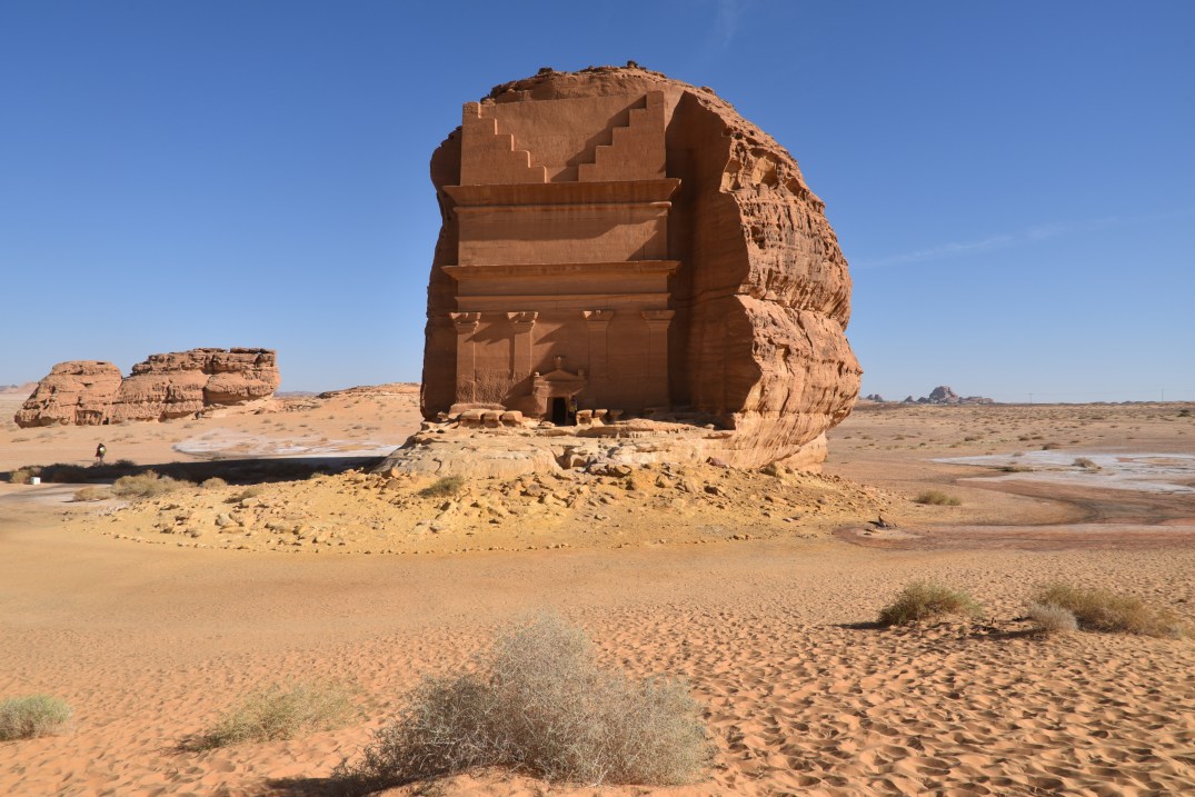 Qasr al Farid, also known as The Tomb of Lihyan Son of Kuza, is a 1st-century AD tomb carved into a single huge rock. It is the most famous and the largest tomb in Hegra. The tomb is an iconic example of Nabataean funerary architecture and stands isolated. It is carved into a massif about 23 metres high and 18 metres wide, with the access platform raised approximately 4 metres above ground level.