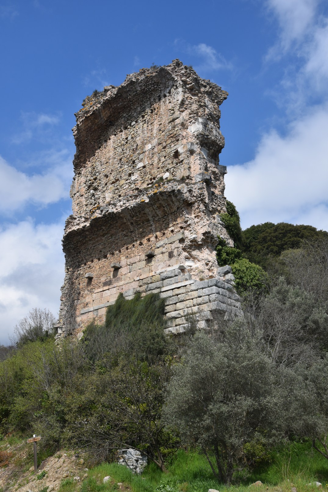 An exceptionally large amphitheatre was situated in the valley on both sides of the sloping hills beneath the Acropolis. Its elliptical shape may be traced from the few pilasters and arches rising from the thickly wooded slopes of the old cavea. As at Pergamon, a small stream flowed through the building, presumably for use in naumachiae (naval spectacular displays) and for the cleansing of the arena. The amphitheatre was oval and surrounded by two tiers of arcading. There were originally thirty-two vomitoria (entrances). The central axis measured around 140 meters. Hadrianic inscriptions found among the ruins of the amphitheatre have allowed its dating in the reign of Hadrian.