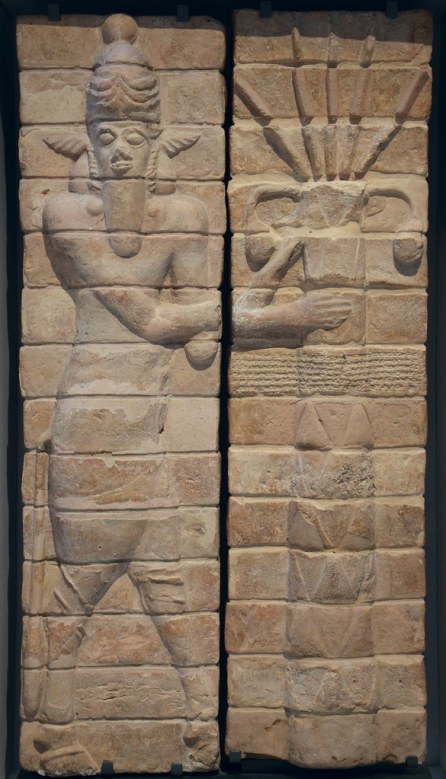 Fragments of decoration from the Temple of Inshushinak depicting a bull-man and palm tree. From Susa, around 1150 BC. Musée du Louvre, Paris.