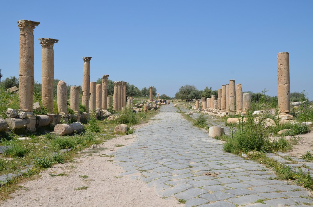 Following Pompey the Great‘s conquest in 63 BC, the city and its lands were attached to the province of Syria and became one of the ten great Roman cities of the Decapolis League. This was a significant turning point in the history of the town. Over the next two centuries, trade with the Nabateans flourished, and the city, then known as Gerasa, grew extremely wealthy thanks to local agriculture and iron-ore mining. The city was remodelled in the middle of the 1st century AD, and a complete rebuilding programme was launched. It was laid out on a north-south axis intersected by two side streets running east-west and marked by tetrapyla. An inscription on the northwest gate shows that the town walls were completed in AD 75-76, thus settingthe limits for the city’s growth. A large Temple of Zeus was built in Romano-Syrian type ca. AD 27/28 but was finished in the 160s. Nearby, the South Theatre was constructed in the 1st century AD.