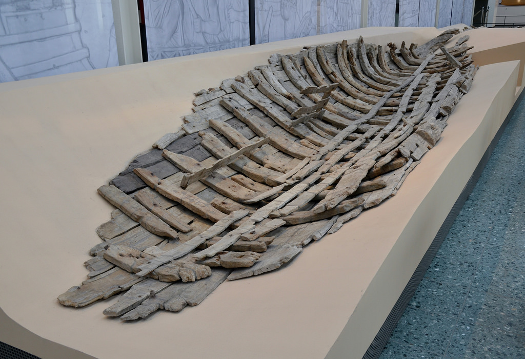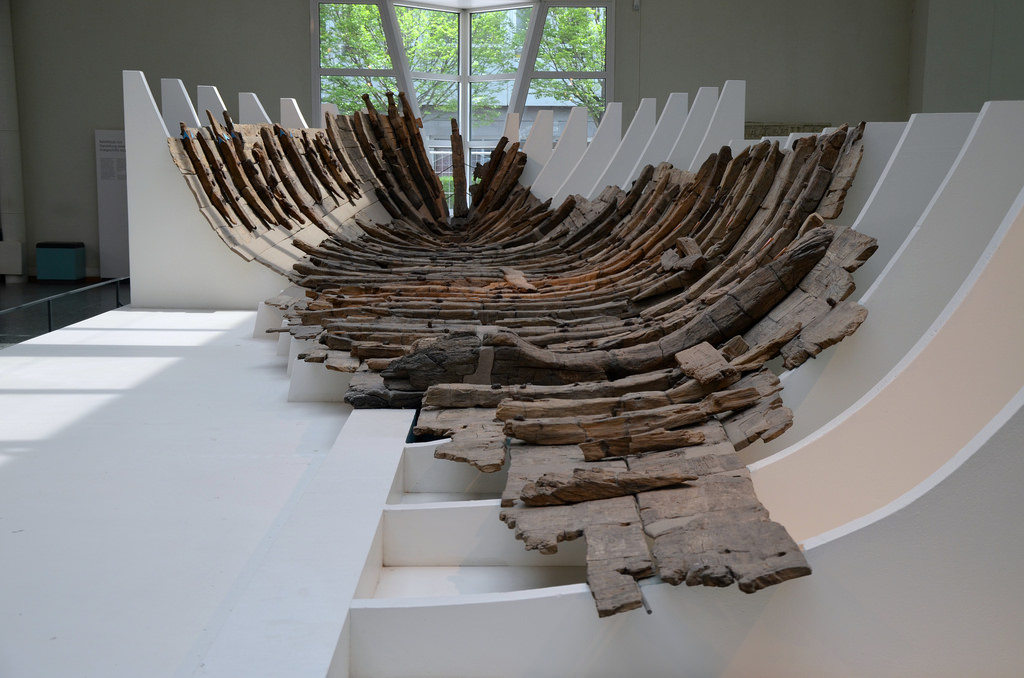 The replica of a Roman military troop transporter ship (navis lusoria), Type Mainz A (based on wreck 1 and wreck 5) dating to the 4th century AD. This vessel was 21,6 m long, 2,79 m wide and roughly 1 m high.Slim, flat-bottomed hulls with flaring sides are characteristics of the Mainz A Type vessel. They were very narrow, fast rowing boats with a row of oars on either side. She had a crew of 30 oarsmen.The remains of the Mainz Wreck 1. Dendrochronological analyses of wreck 1 date her to 385 AD. She was used until around AD 400 as a bronze coin struck in the years 388-392 under Emperor Theodosius I was found between the hull and frame 2. The preserved hull with a length of almost 8.3m consists consisting of seven rows of planks up to the gunwale on the port.The remains of the Mainz Wreck 2. Like all ships discovered in Mainz, Wreck 2 was constructed of oak. She was constructed in the beginning of the 4th century AD and represents a flat-bottomed vessel with flaring sides. It comprises the rear section and part of the midship section of an open plank boat. Her original dimensions were at least 16 me in length, approx. 3 m in width and approx. 1 m in height.The remains of the Mainz Wreck 4. Only the five uppermost port rows of planking aft survived. Its dendrochronolgical examination revealed only she was constructed at the end of the 3rd century AD. This boat was originally larger and heavier than the other three troop transporters.The remains of the Mainz Wreck 5. Originally 18 m long, only the front 9 m long section from the bows to just aft the mast-frame was able to be recovered. According to the dendrochronological analyses the oaks employed in the building were felled in AD 390.The full scale replica of a Roman military troop transporter ship (navis lusoria).