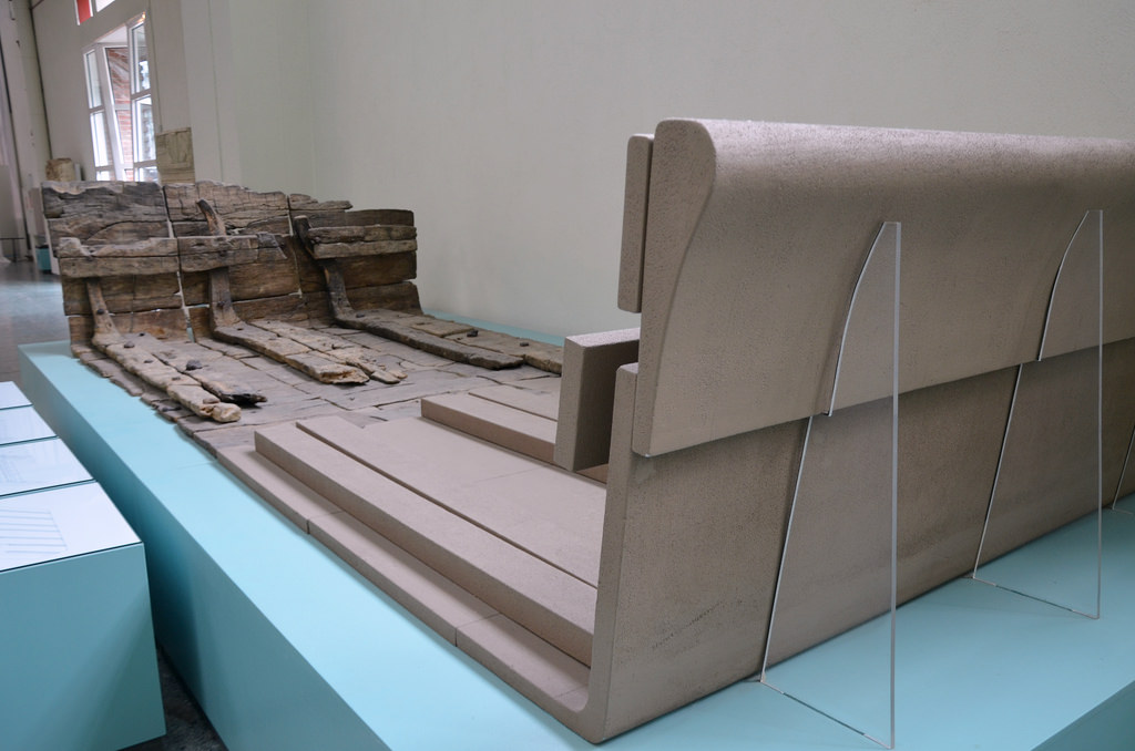 1:10 model of a flat-bottomed ship with ramp-like sloping ends of the Zwammerdam type. These ships have often been recorded north of the Alps and could measure up to 40 m long, as documented by the ships Zwammerdam 4 and Mainz 6. They were used for transporting heavy loads on rivers.The remains of the pram of the Mainz Wreck 6. During house-building in early 1982, some 500 m south of the site of the late Roman ships, the remains of two prams were discovered. Analysis of the wood revealed a felling date of AD 81. Her original dimensions were of approx. 40 m long and 5 m wide.