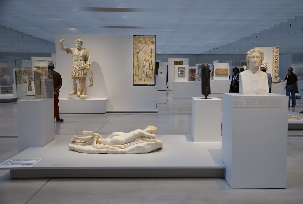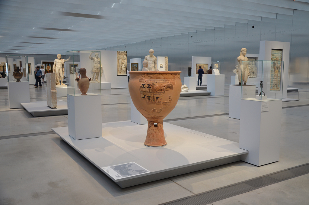 The 200 works originate from the Middle East, Egypt, Greece, Rome, the Islamic world and Europe. The Galerie du Temps is a wide open hall (125m long and 25m wide) where the objects are placed in the centre of the room in order to create a full 360° dialogue between them.