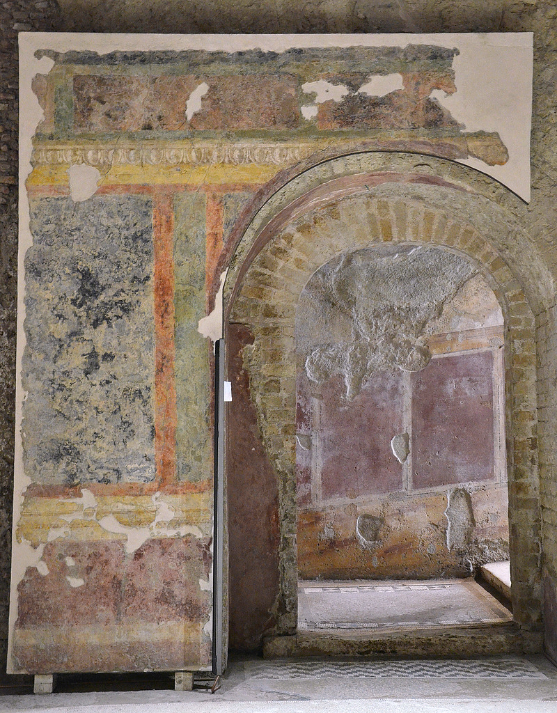 The triclinium (dining room) is remarkable for its delicate decoration. Each wall was given an elaborate design of illusionistic architecture featuring a large picture of a sacred and rural landscape in the centre.