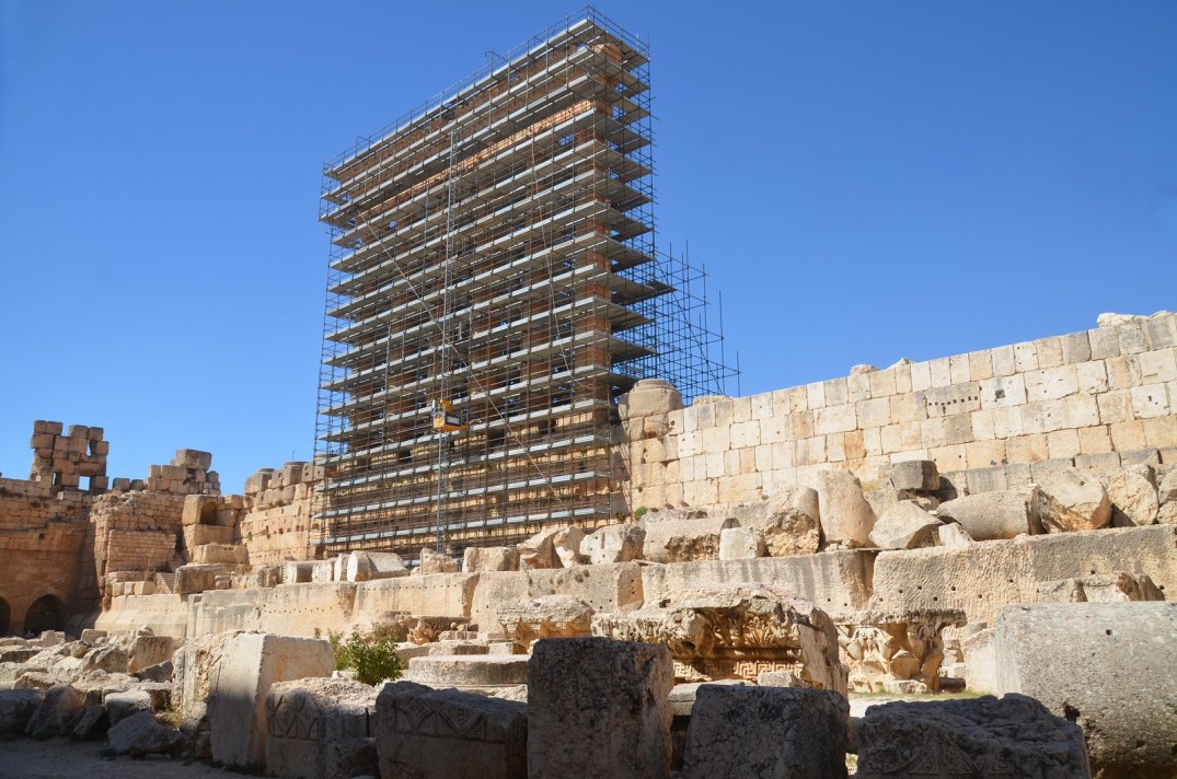 The main construction campaign in the sanctuary complex lasted over 200 years, from the mid-1st century AD to the 3rd century AD. It began with the construction of a T-shaped terrace approximately 12 m high, a propylon and a small altar in the central courtyard. The colossal Temple dedicated to Jupiter Heliopolitanus, a powerful god of agricultural fertility and the cosmos, was built in the 1st century AD during the second construction phase. Constructed on a podium 7m above the surrounding courtyard, the Temple followed a peripteral Greek design of 10 by 19 columns in the Corinthian order. However, only six of the original 54 columns remain, but they give no doubt as to the grandeur of this enormous structure. Covering an area of approximately 48 by 88 m, it was one of the largest temples dated to the Roman period.