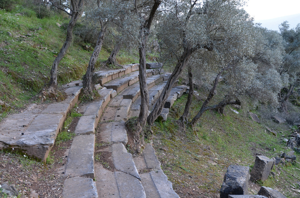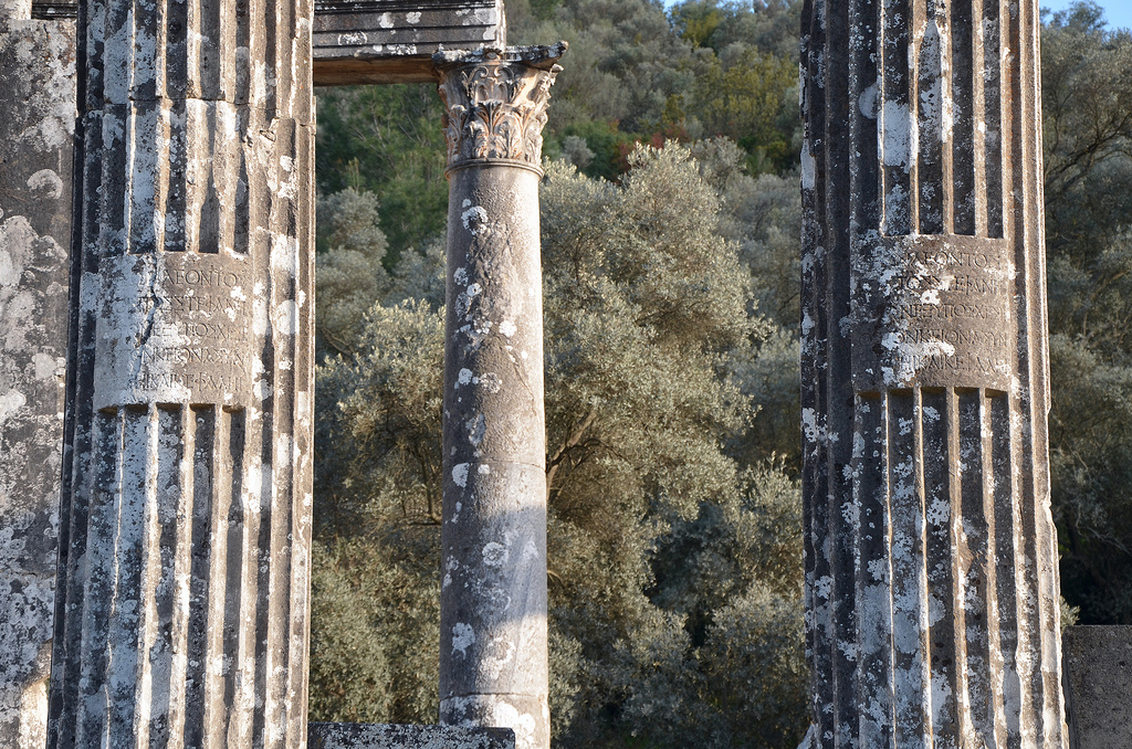 The sacred precinct (temenos) of Poseidon was entered through a monumental gateway of poros and marble to the north of the temple, the propylaea. Beyond, along the north side of the temenos, runs a stoa, some 40m long by 9m wide, divided into two aisles by an internal colonnade of six columns. A second smaller stoa occupied the west side of the precinct. The stoas served as accommodation for visitors to the sanctuary.