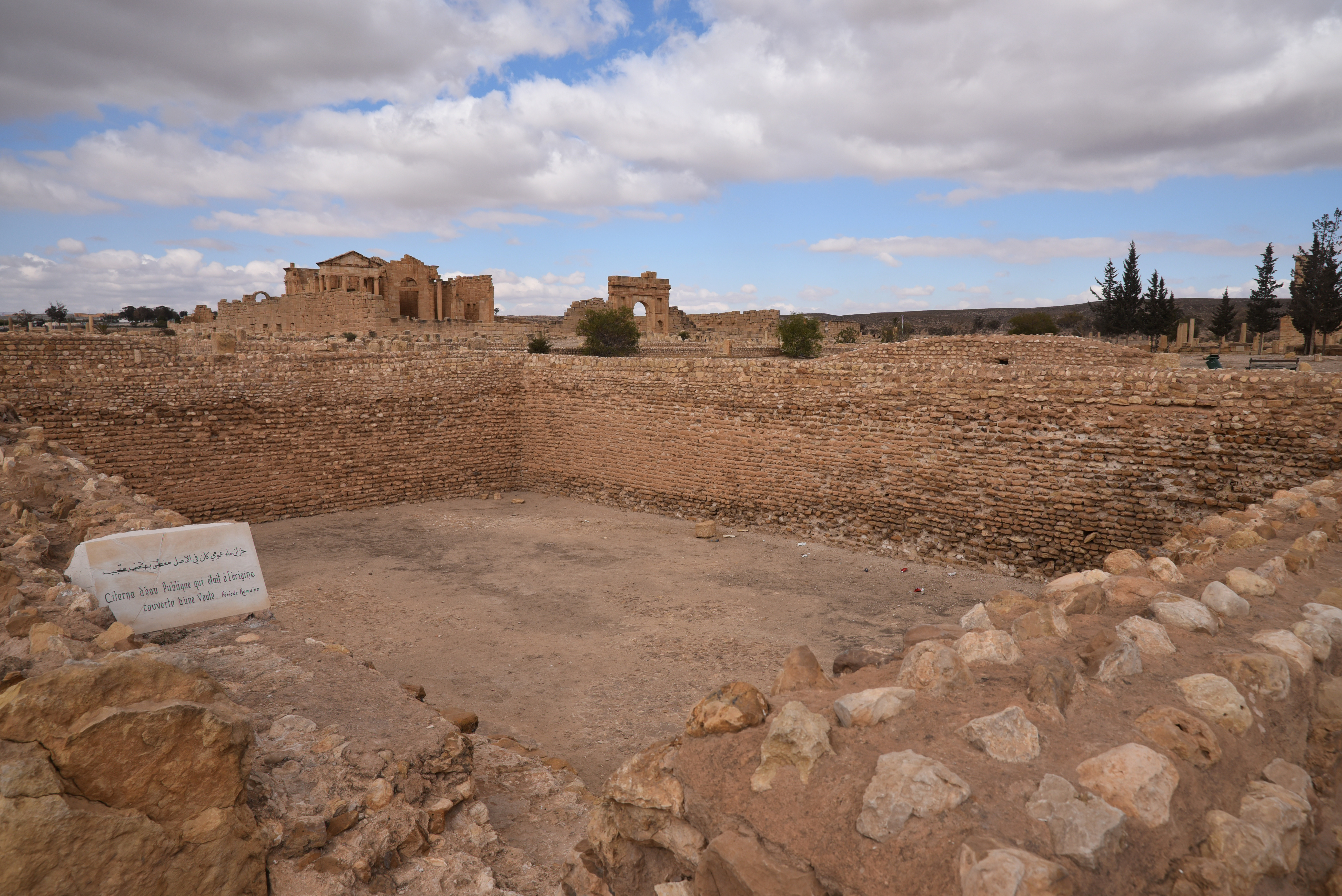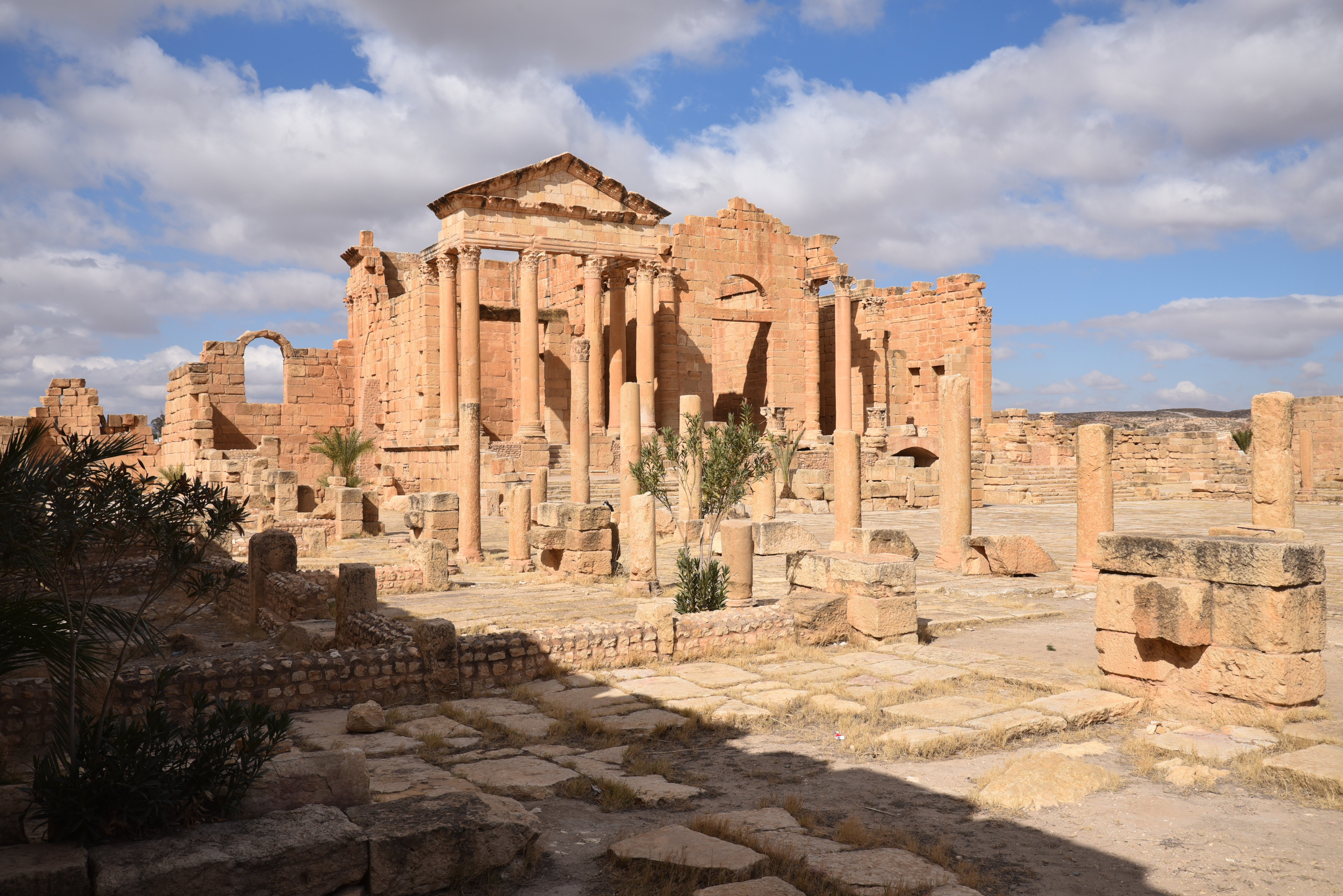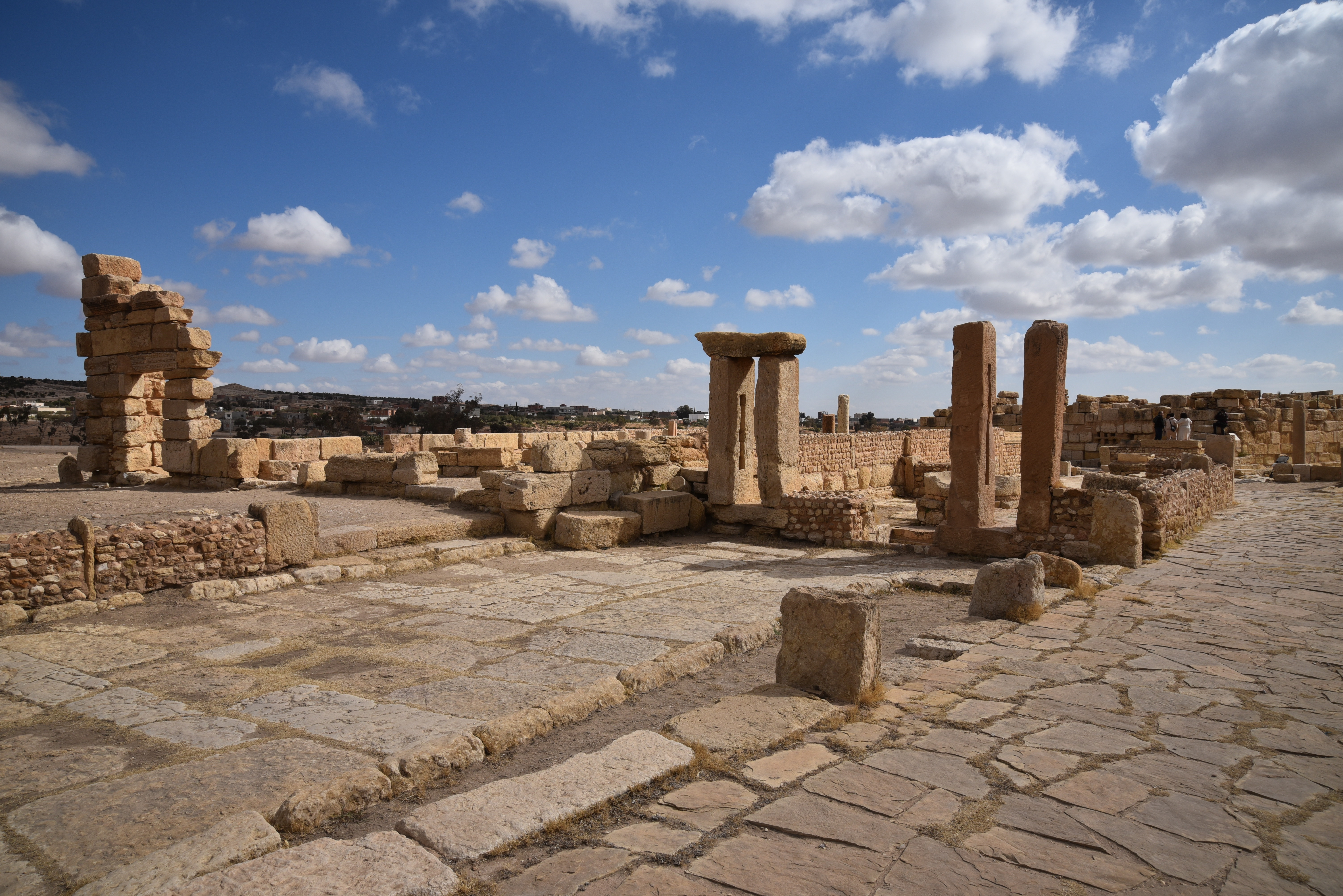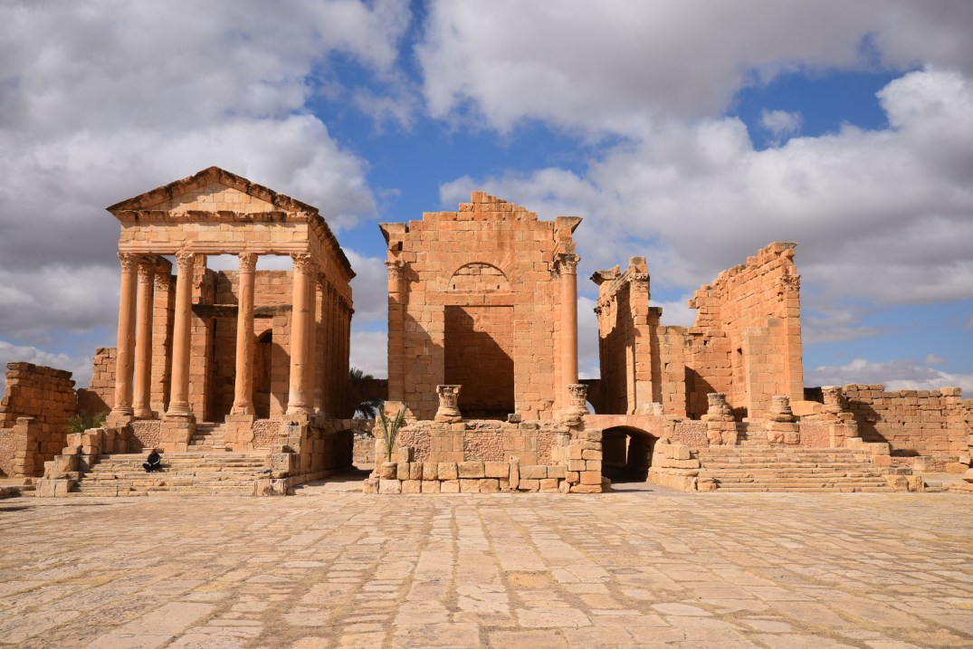 The Arch of Diocletian, built between AD 285 and 305.The Arch of Diocletian formed part of the old walls to the south of the site. It was likely built to commemorate either the Decennalia of Diocletian in AD 293 or his triumph with Maximian in AD 303-304. It is one of the best-preserved Roman triumphal arches in North Africa.The Roman Theatre, built in the 2nd century AD, had a seating capacity for over 3,500 spectators.The Roman Theatre.View of the Arch of Antoninus Pius and the Temples of the Roman Forum.The paved road leading to the Forum.The Arch of Antoninus Pius leading to the Forum and Capitolium. This gateway was built in the style of a triumphal arch and formed part of the ancient walls. It can be dated to AD 138–61 thanks to an inscription which refers to the Emperor Antonius Pius and his two adopted sons, Marcus Aurelius and Lucius Verus.At the heart of the city lies the forum, a rectangular walled plaza (72 × 60 meters) that served as the civic and religious centre. Accessed through a monumental gateway dedicated to Antoninus Pius, it is one of the best-preserved forums in the Roman world.The Forum, paved with huge stone slabs, was surrounded by porticoes on three sides and the Capitoline temples on the fourth.Dominating one end of the Forum is the Capitolium, a raised platform with three separate temples dedicated to Jupiter, Juno, and Minerva, an unusual arrangement compared to the single-temple Capitoliums of most Roman cities. Their high staircases, columned façades, and carved pediments remain strikingly intact.The central temple dedicated to Jupiter, accessible only by steps from the side, was the most opulent of the three temples, although the temple of Minerva has more elegant columns.Dedication to Venus Genetrix in the Forum. ILAfr 120 Veneri / Genetri/ci Aug(ustae) sac(rum) / C(aius) Caecili/us Maximi/nus IIvir fe/citIn the 6th century AD, the Forum was fortified by the Byzantines, who blocked the porticoes and passages between the temples.View of the Capitolium from the back.The Basilica of Servus, a Byzantine-era church built on a platform that was placed over the city’s main road, the decumanus maximus. Archaeologists believe that it was the Donatist cathedral of Sufetula.The Basilica of Vitalis, built in the 5th or early 6th century AD. It is a Byzantine church known for its well-preserved baptistery.The Basilica of Vitalis was a large structure, measuring about 50 meters long and 25 meters wide, and was accessible through four side doors.The richly decorated baptistery of the Basilica of Vitalis features a cross, florets, and a laurel garland.A basin near the Basilica of Vitalis decorated with a mosaic with Christian symbols.
