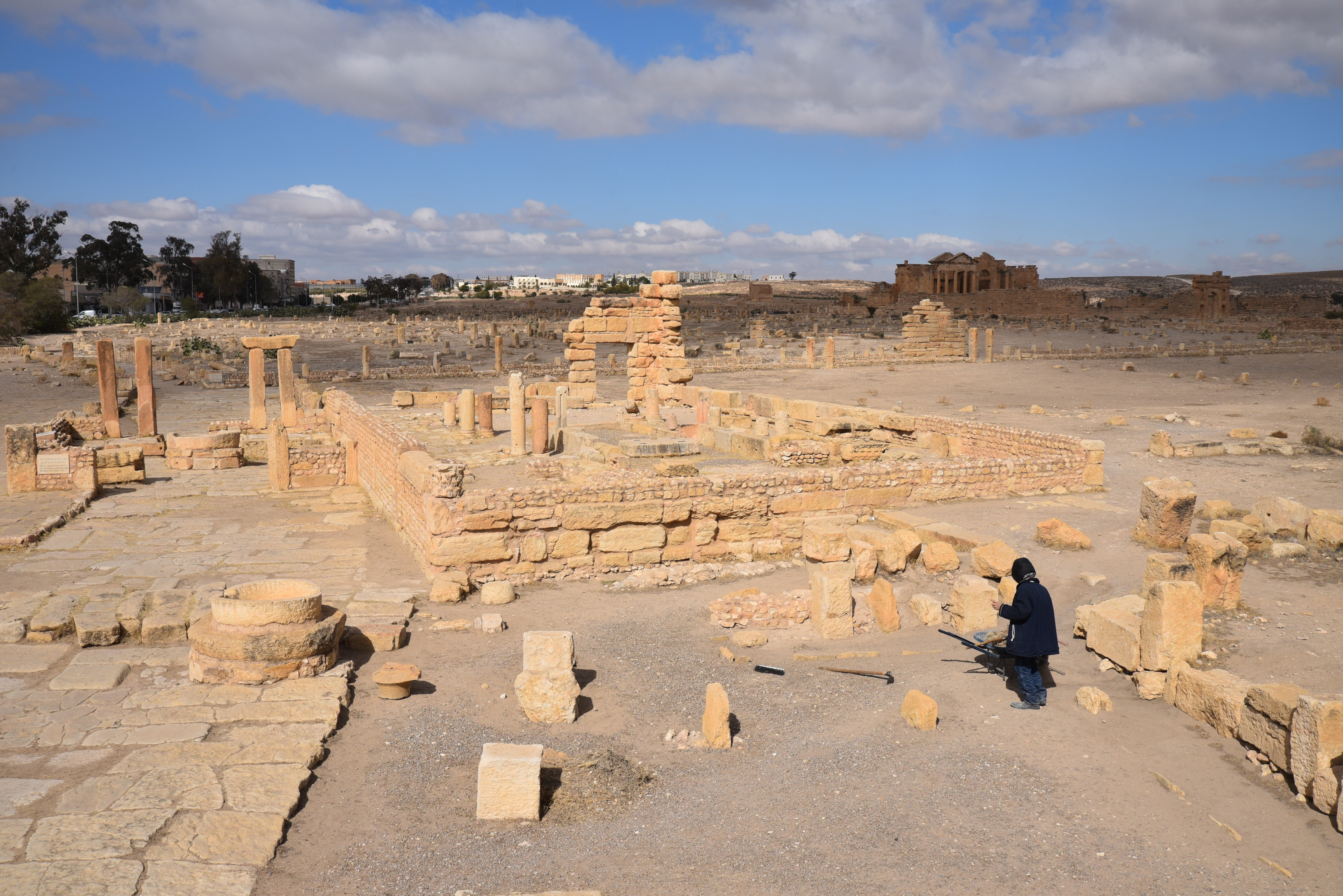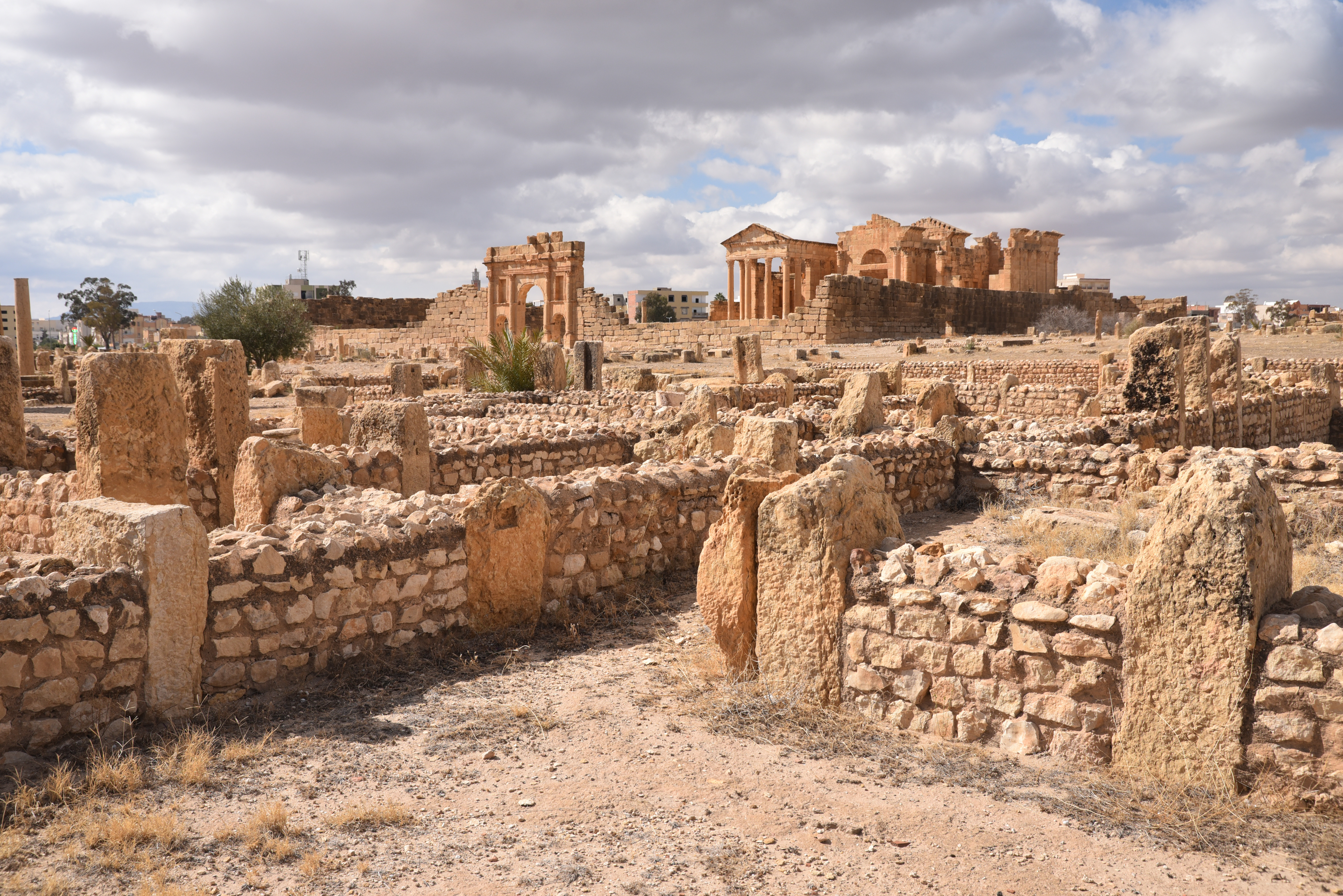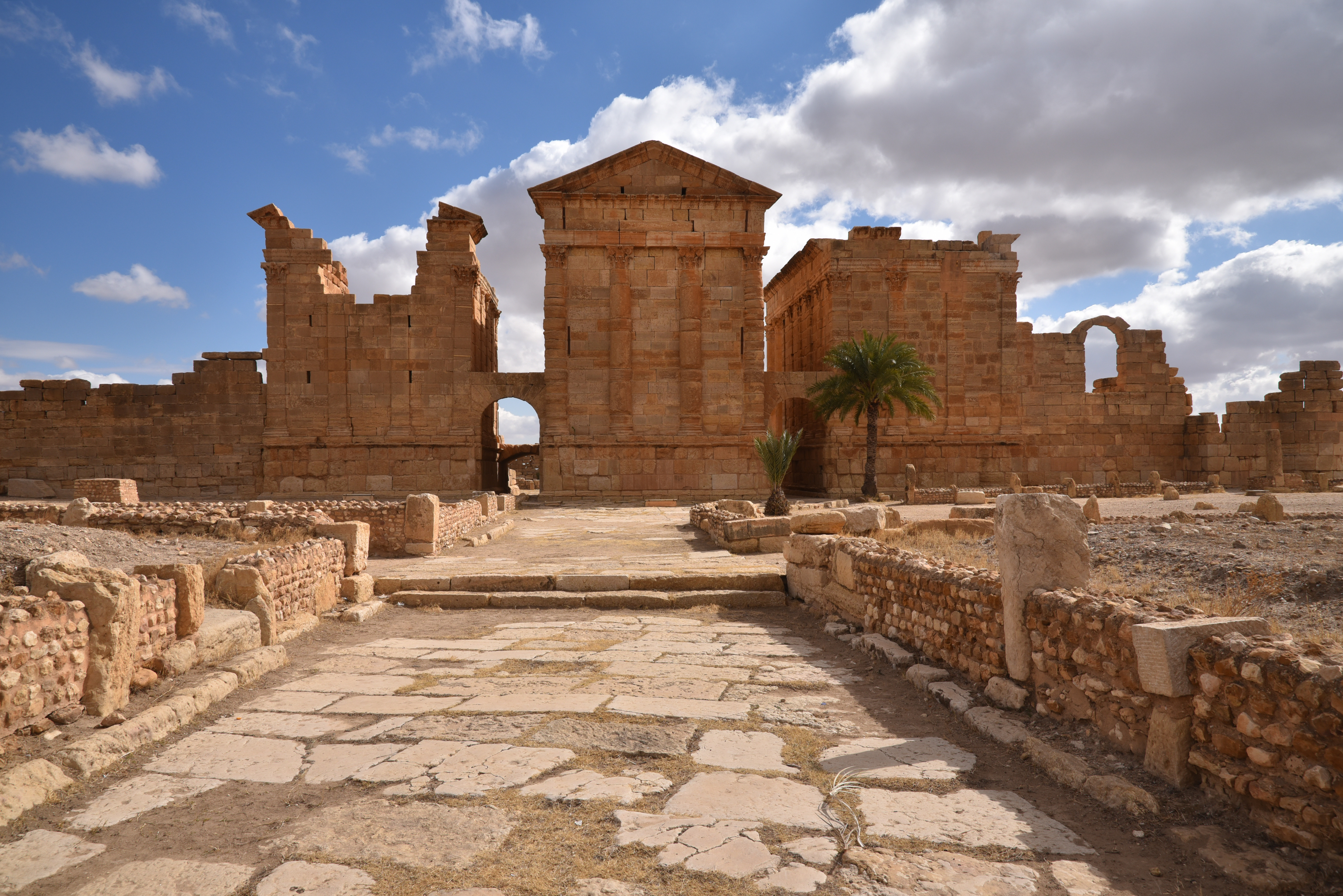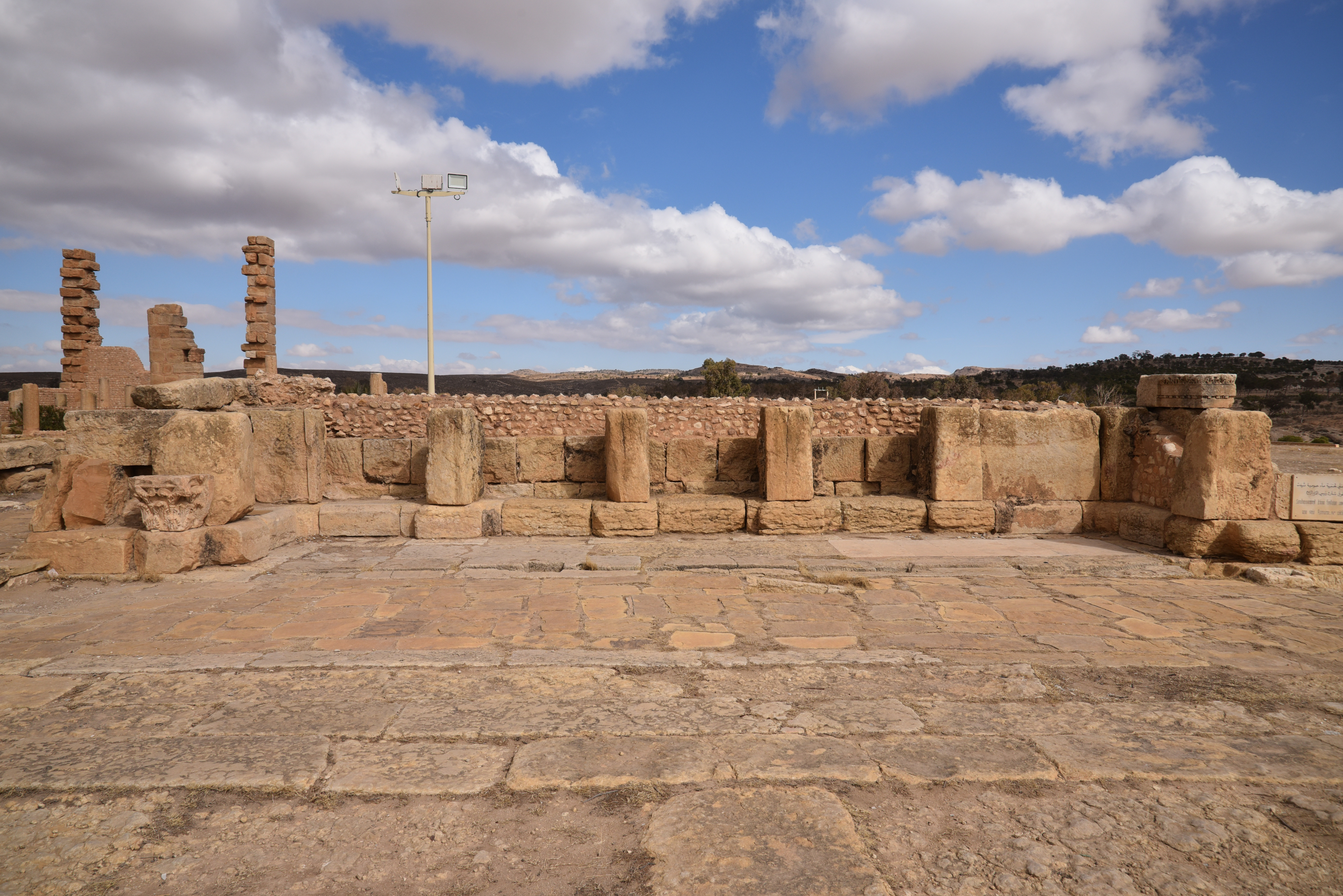 The Arch of Diocletian, built between AD 285 and 305.The Arch of Diocletian formed part of the old walls to the south of the site. It was likely built to commemorate either the Decennalia of Diocletian in AD 293 or his triumph with Maximian in AD 303-304. It is one of the best-preserved Roman triumphal arches in North Africa.The Roman Theatre, built in the 2nd century AD, had a seating capacity for over 3,500 spectators.The Roman Theatre.View of the Arch of Antoninus Pius and the Temples of the Roman Forum.The paved road leading to the Forum.The Arch of Antoninus Pius leading to the Forum and Capitolium. This gateway was built in the style of a triumphal arch and formed part of the ancient walls. It can be dated to AD 138–61 thanks to an inscription which refers to the Emperor Antonius Pius and his two adopted sons, Marcus Aurelius and Lucius Verus.At the heart of the city lies the forum, a rectangular walled plaza (72 × 60 meters) that served as the civic and religious centre. Accessed through a monumental gateway dedicated to Antoninus Pius, it is one of the best-preserved forums in the Roman world.The Forum, paved with huge stone slabs, was surrounded by porticoes on three sides and the Capitoline temples on the fourth.Dominating one end of the Forum is the Capitolium, a raised platform with three separate temples dedicated to Jupiter, Juno, and Minerva, an unusual arrangement compared to the single-temple Capitoliums of most Roman cities. Their high staircases, columned façades, and carved pediments remain strikingly intact.The central temple dedicated to Jupiter, accessible only by steps from the side, was the most opulent of the three temples, although the temple of Minerva has more elegant columns.Dedication to Venus Genetrix in the Forum. ILAfr 120 Veneri / Genetri/ci Aug(ustae) sac(rum) / C(aius) Caecili/us Maximi/nus IIvir fe/citIn the 6th century AD, the Forum was fortified by the Byzantines, who blocked the porticoes and passages between the temples.View of the Capitolium from the back.The Basilica of Servus, a Byzantine-era church built on a platform that was placed over the city’s main road, the decumanus maximus. Archaeologists believe that it was the Donatist cathedral of Sufetula.The Basilica of Vitalis, built in the 5th or early 6th century AD. It is a Byzantine church known for its well-preserved baptistery.The Basilica of Vitalis was a large structure, measuring about 50 meters long and 25 meters wide, and was accessible through four side doors.The richly decorated baptistery of the Basilica of Vitalis features a cross, florets, and a laurel garland.A basin near the Basilica of Vitalis decorated with a mosaic with Christian symbols.